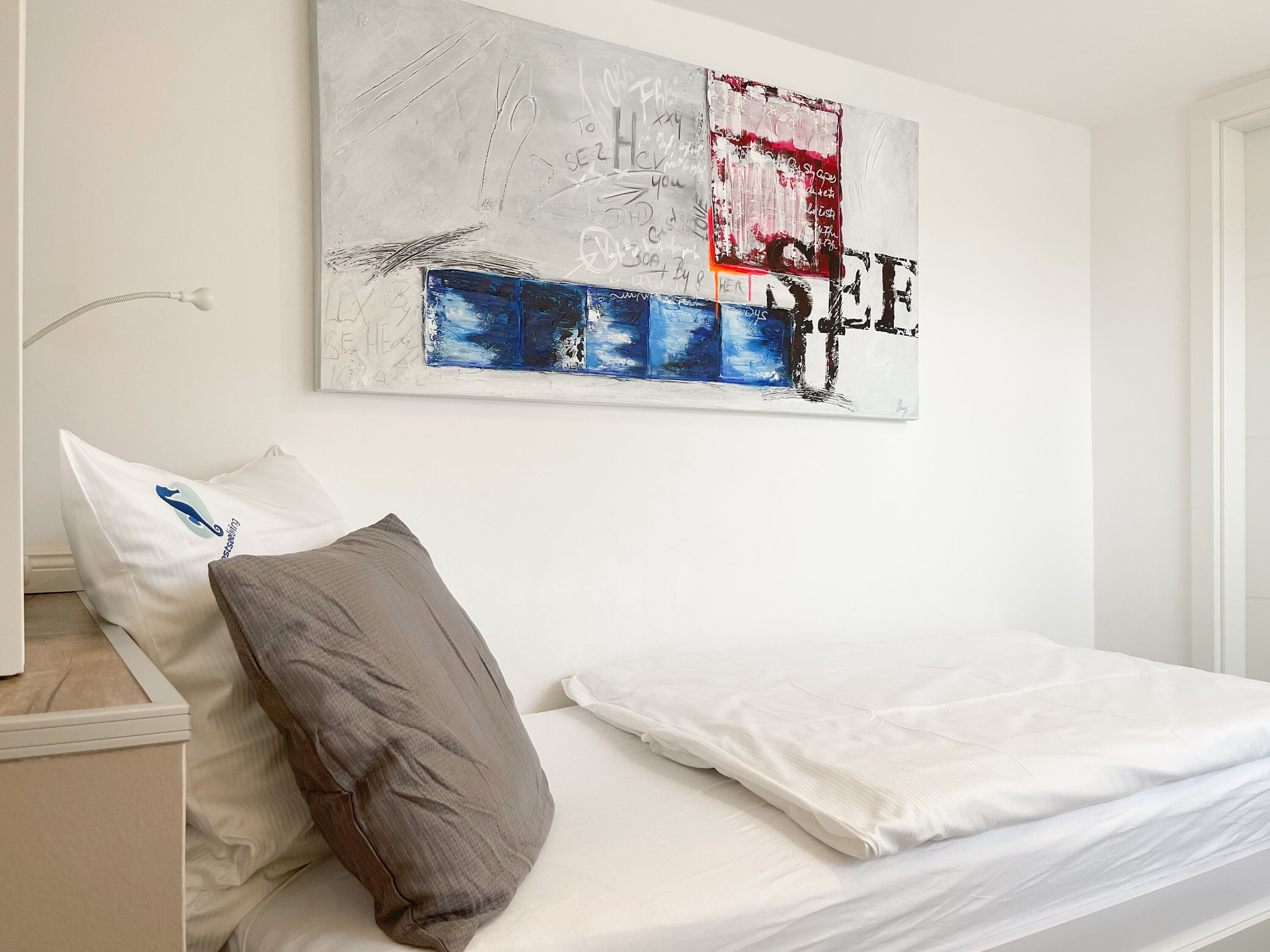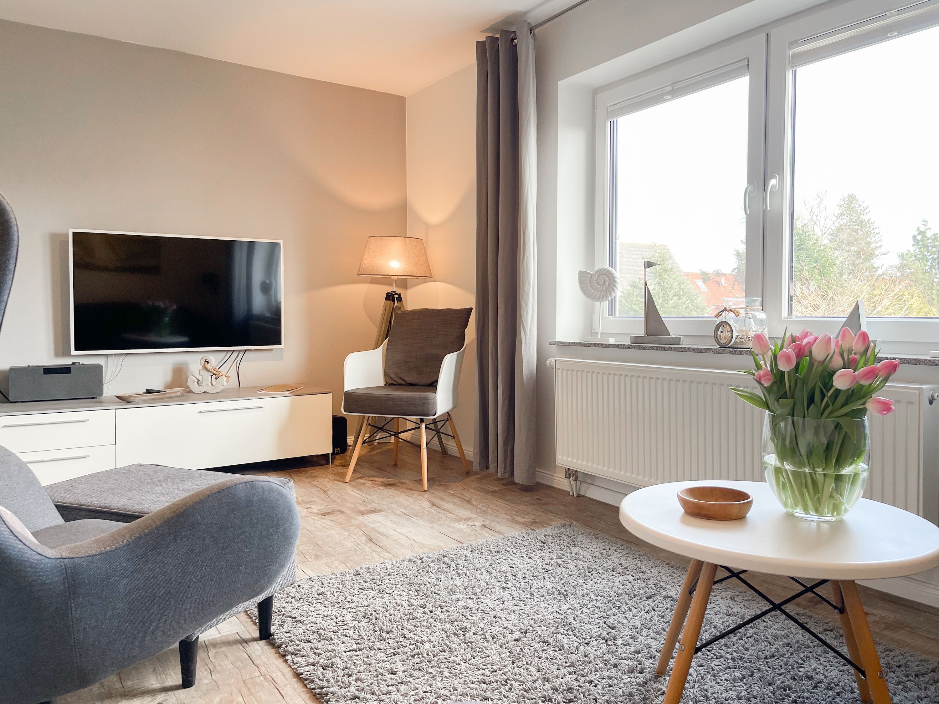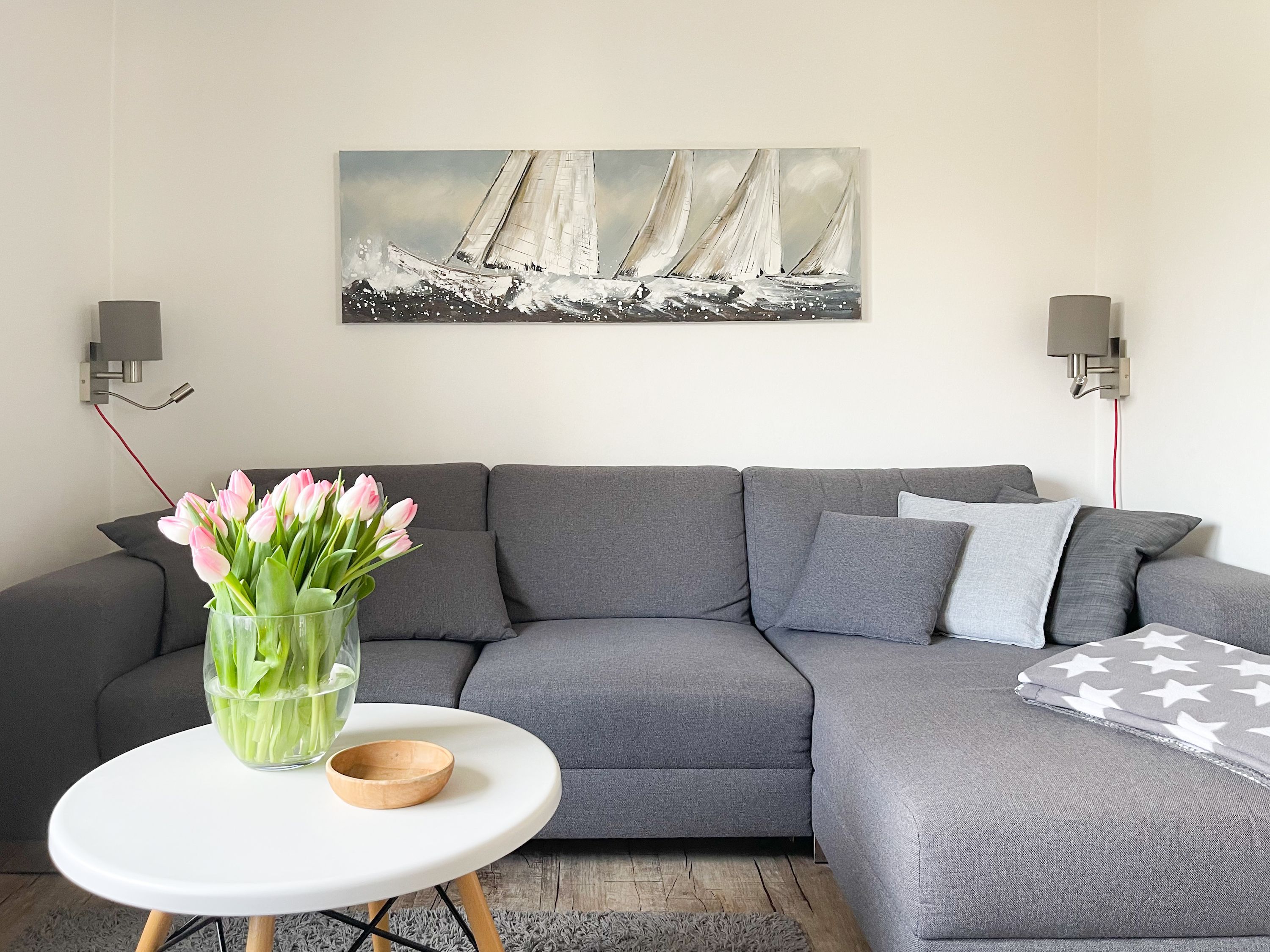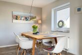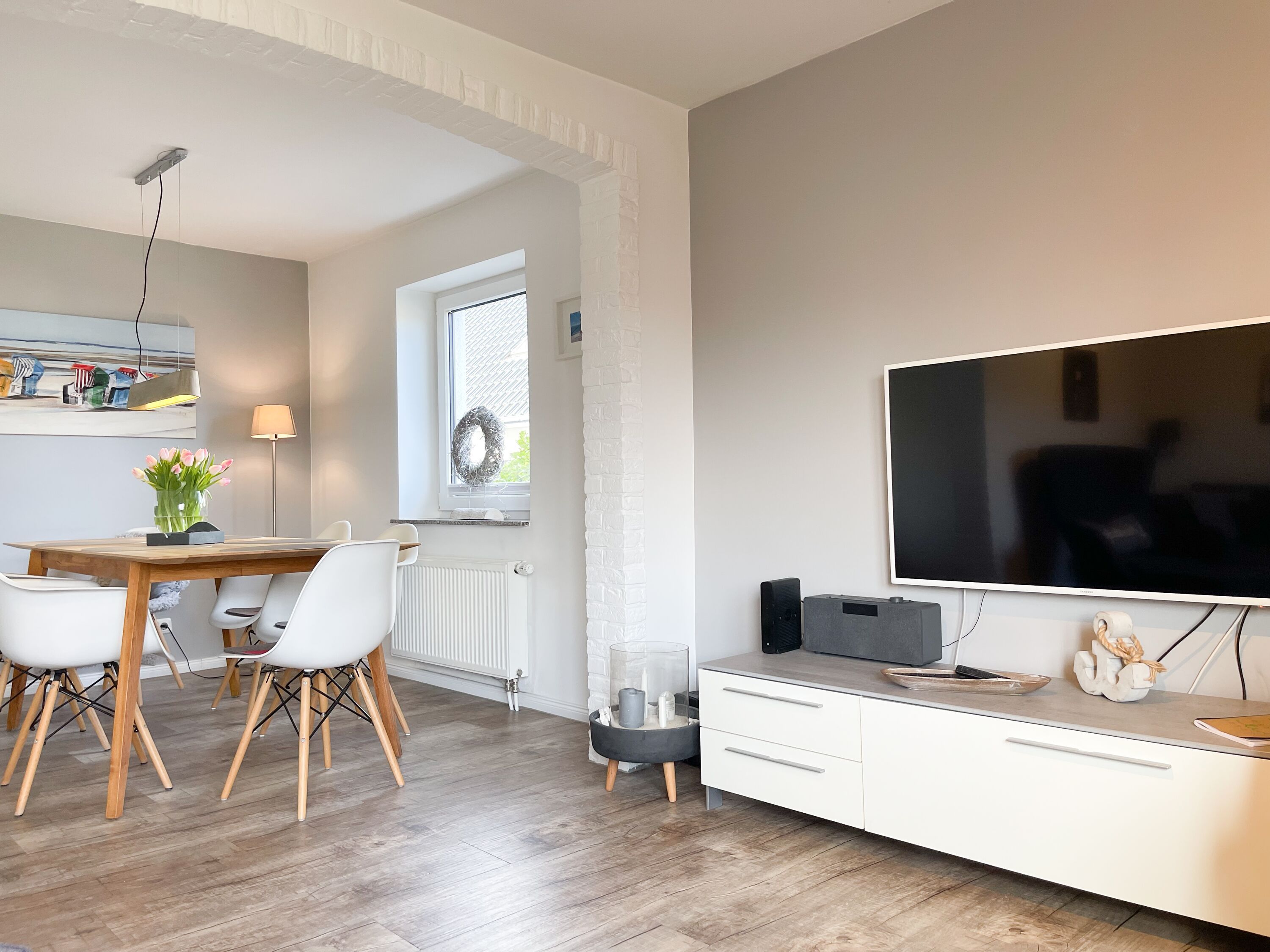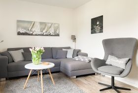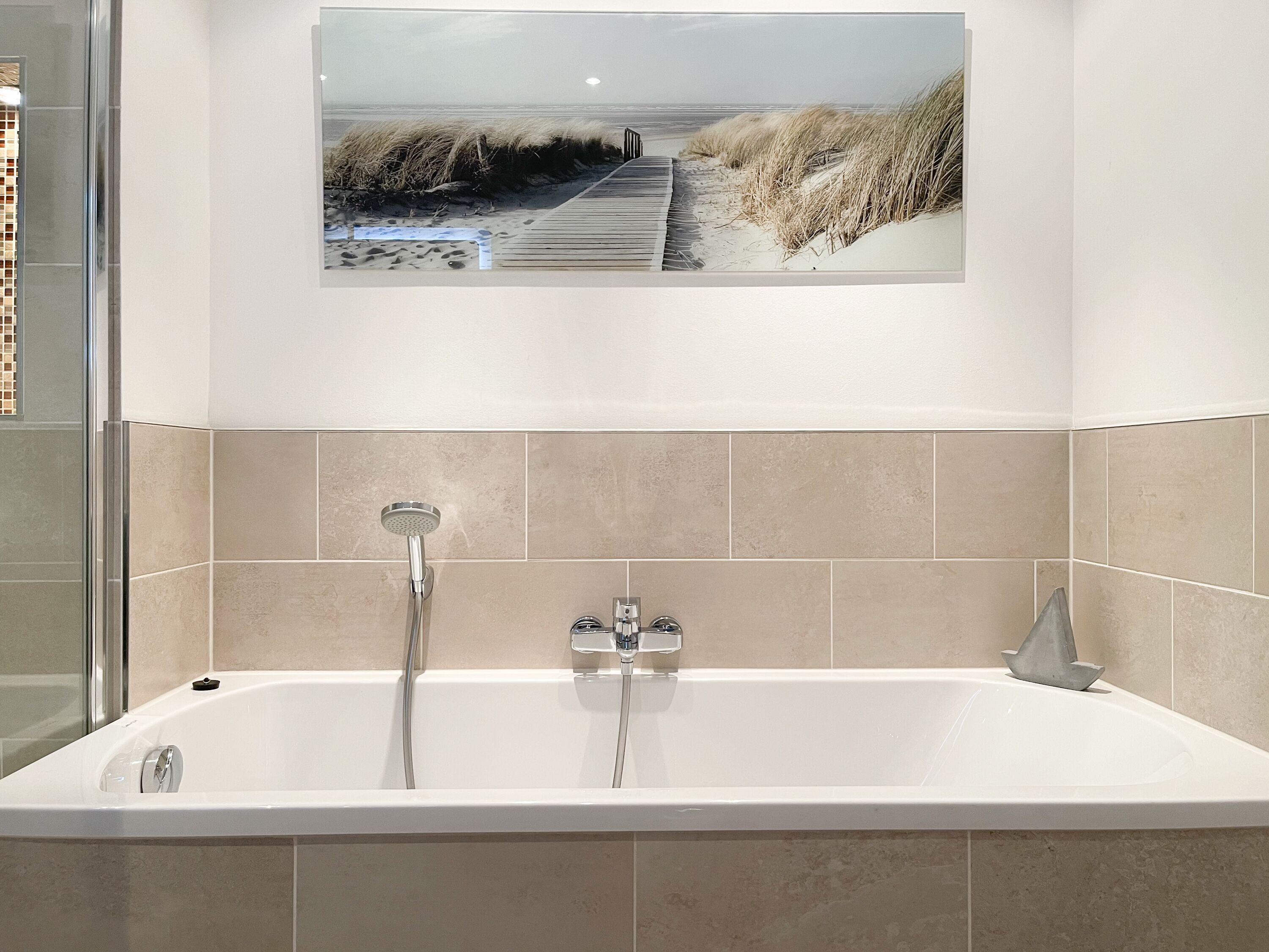 Mittelpunkt des Hauses bildet ein großzügig angelegter, heller Wohnbereich, hochwertig und geschmackvoll eingerichtet (TV, Hifi Anlage, WLAN) mit einem angrenzenden Essbereich, der ausreichend Platz für 6 Personen bietet. Die abgeschlossene Küche ist bestens ausgestattet. Der Bartresen mit zwei Barhockern ist als kleiner Frühstücksbereich oder Treffpunkt für gemeinsames Kochen gedacht. Ein hochwertiges Bad mit Dusche und Badewanne ist ebenfalls im Erdgeschoss untergebracht. Im Obergeschoss befindet sich ein Schlafzimmer mit zwei Einzelbetten (80x200) und ein modernes Duschbad en-suite sowie ein äußerst großzügiges Schlafzimmer mit einem Doppelbett (180x200), TV und Einbauschrank. Ein weiteres kleines Schlafzimmer ist mit einem Einzelbett, Sessel und Kommode eingerichtet.