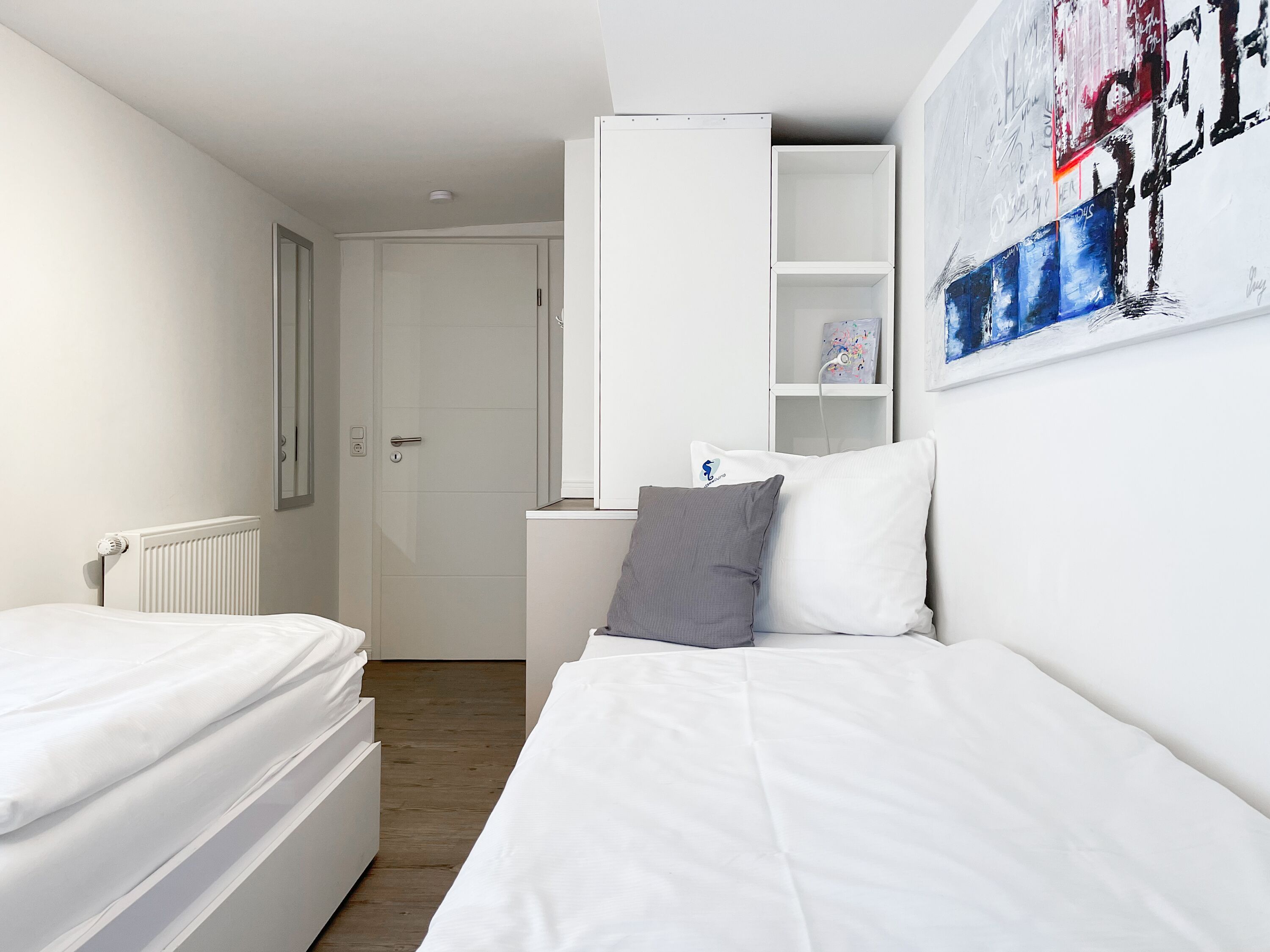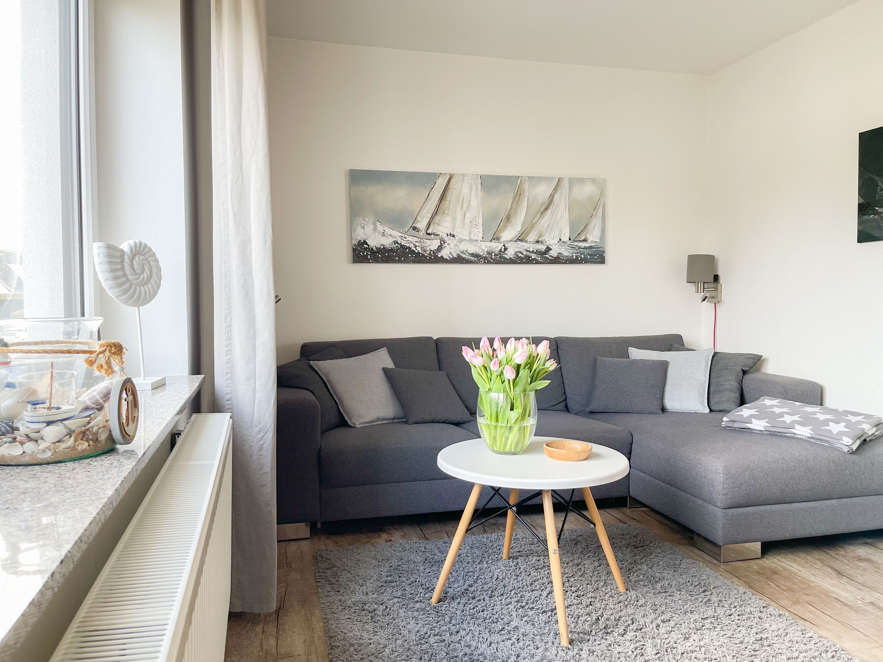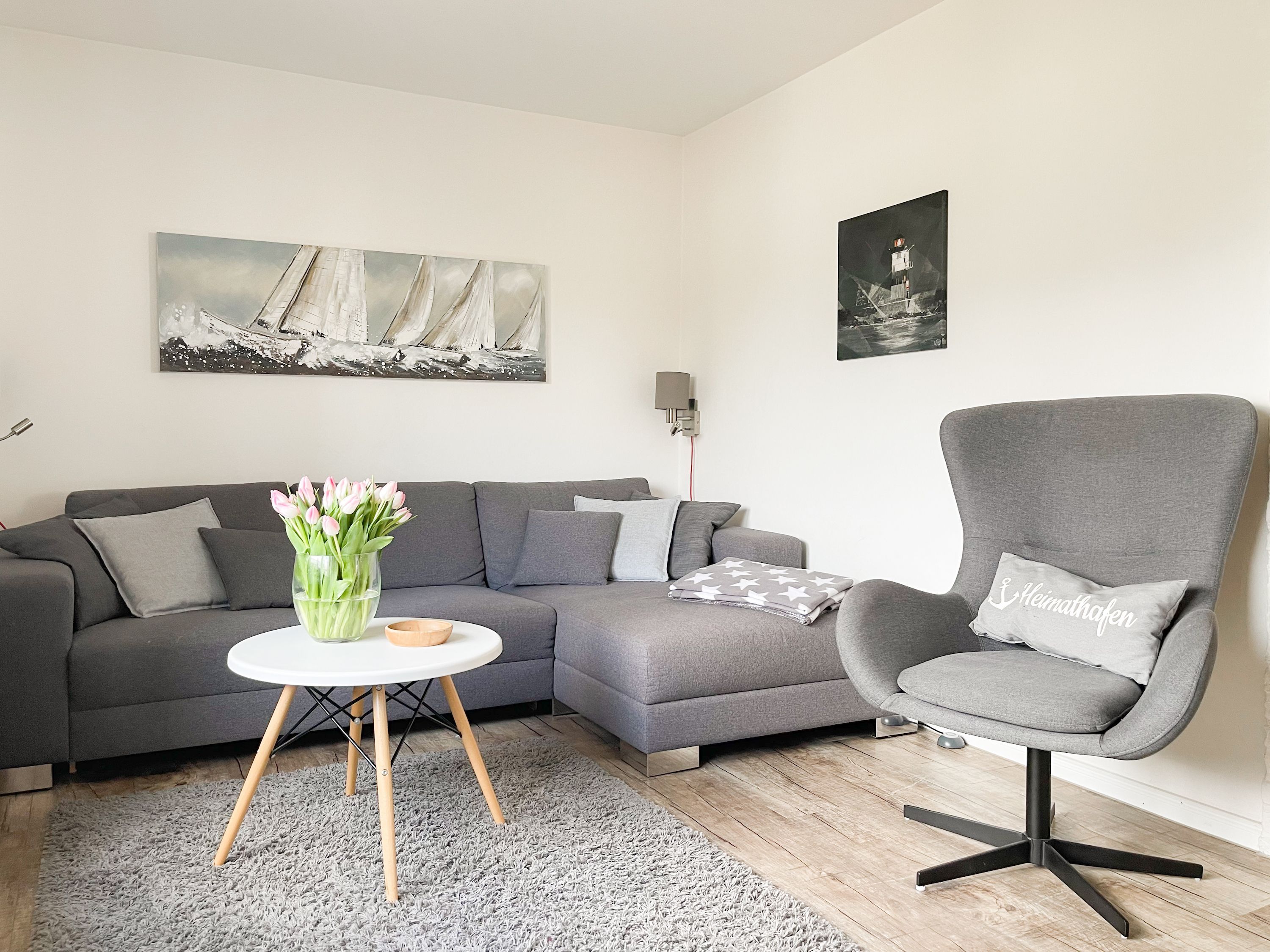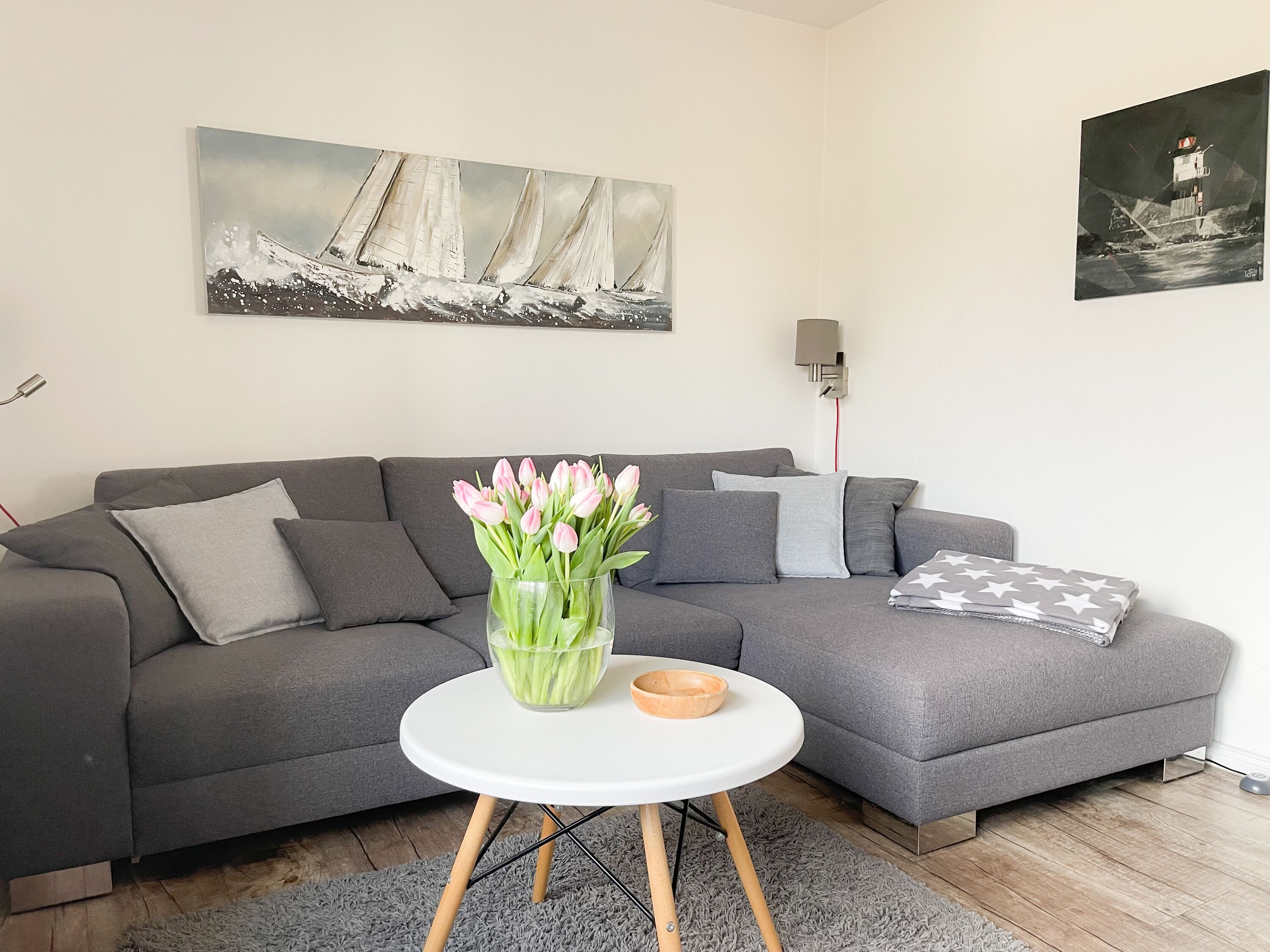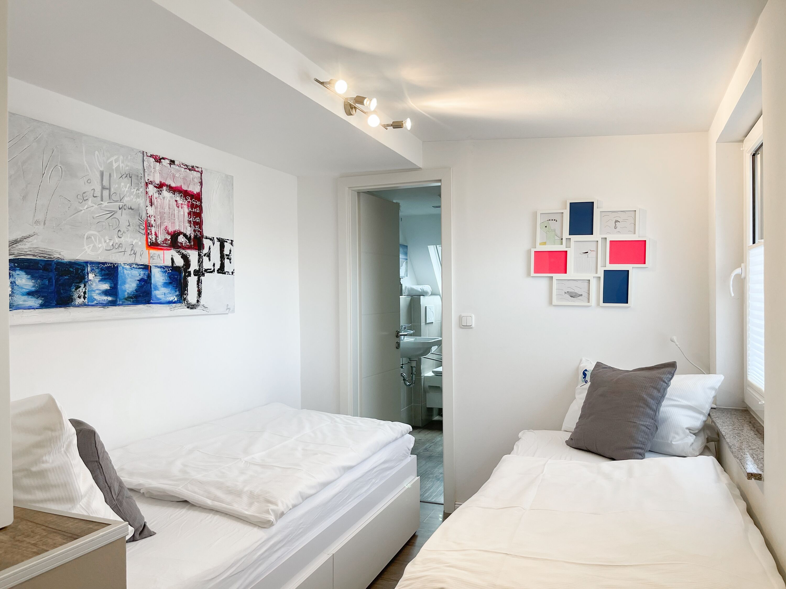 Mittelpunkt des Hauses bildet ein großzügig angelegter, heller Wohnbereich, hochwertig und geschmackvoll eingerichtet (TV, Hifi Anlage, WLAN) mit einem angrenzenden Essbereich, der ausreichend Platz für 6 Personen bietet. Die abgeschlossene Küche ist bestens ausgestattet. Der Bartresen mit zwei Barhockern ist als kleiner Frühstücksbereich oder Treffpunkt für gemeinsames Kochen gedacht. Ein hochwertiges Bad mit Dusche und Badewanne ist ebenfalls im Erdgeschoss untergebracht. Im Obergeschoss befindet sich ein Schlafzimmer mit zwei Einzelbetten (80x200) und ein modernes Duschbad en-suite sowie ein äußerst großzügiges Schlafzimmer mit einem Doppelbett (180x200), TV und Einbauschrank. Ein weiteres kleines Schlafzimmer ist mit einem Einzelbett, Sessel und Kommode eingerichtet.