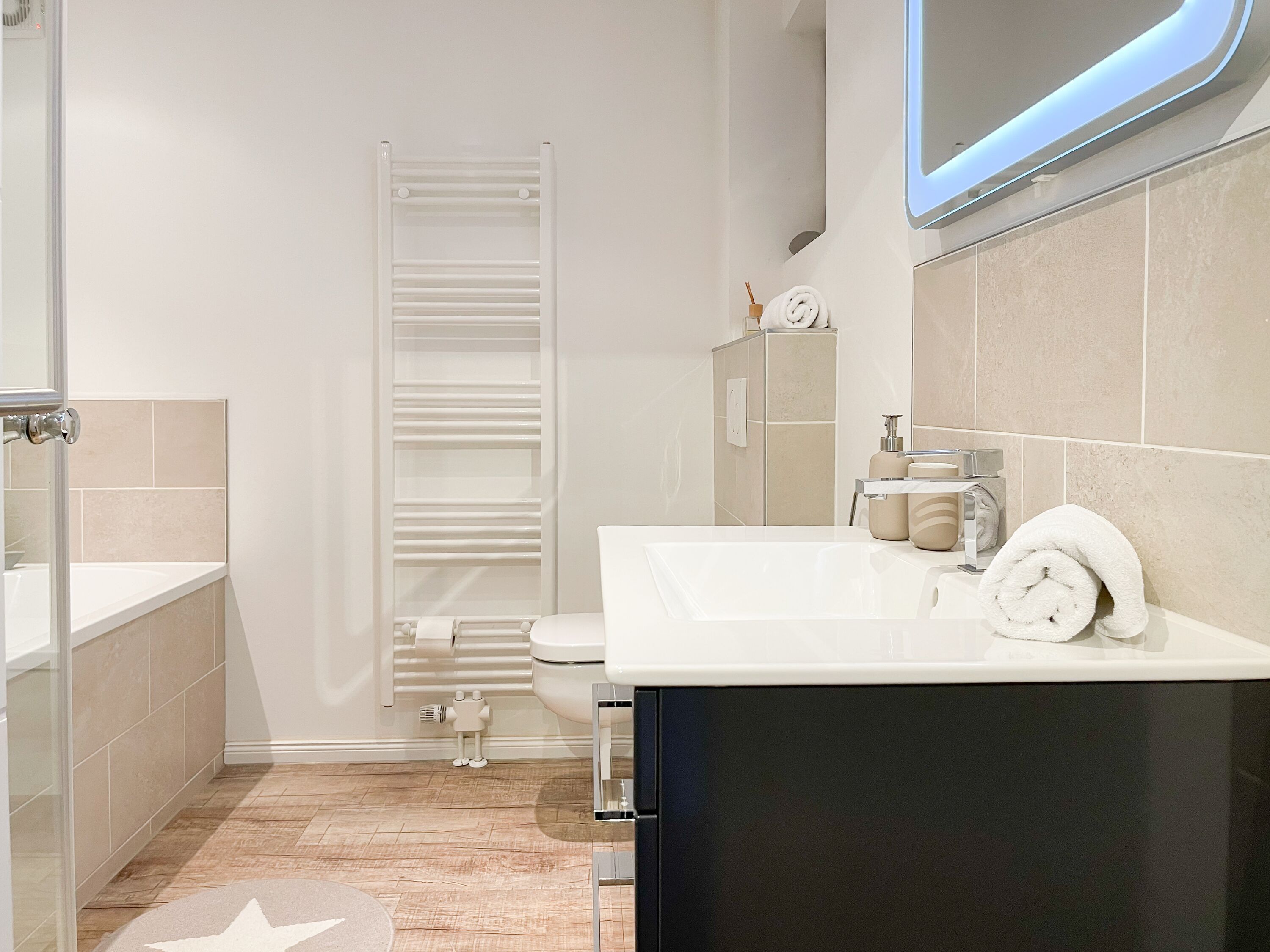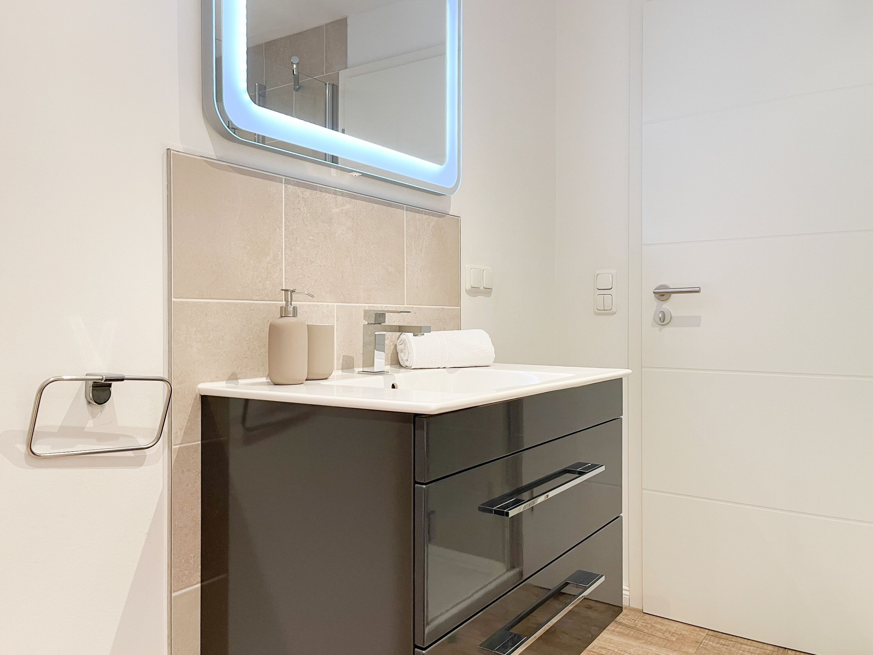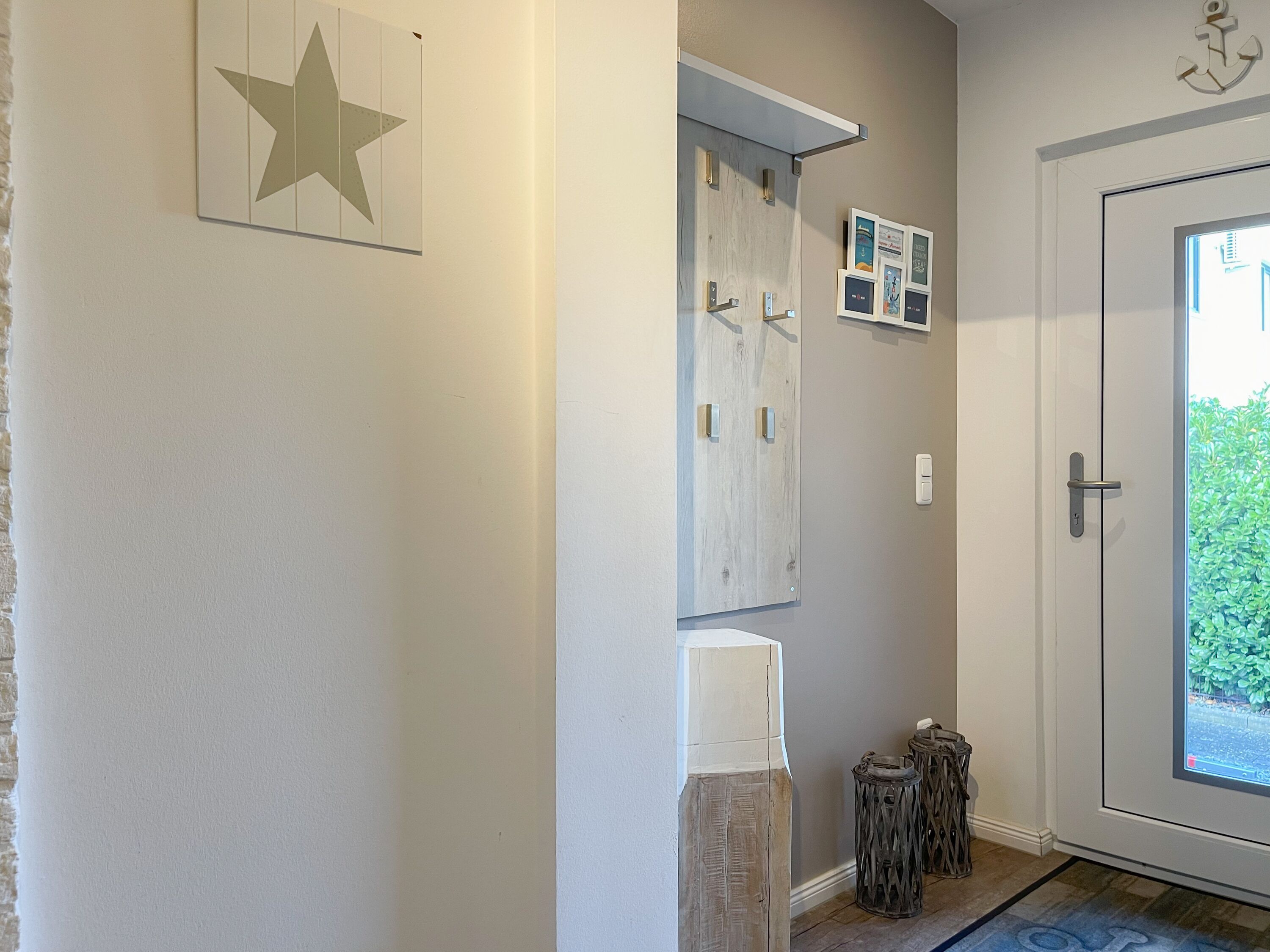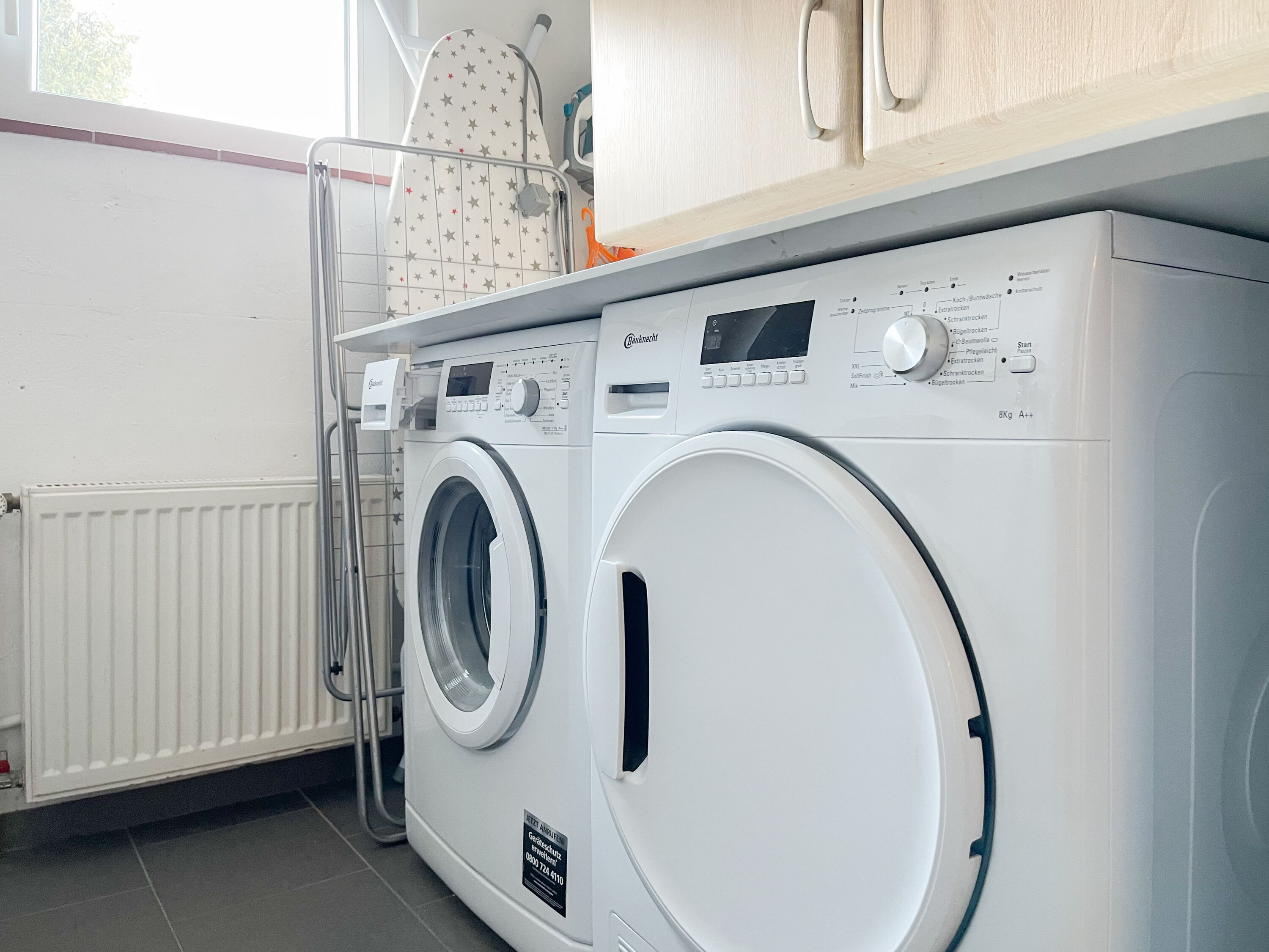 Waschmaschine und Trockner sind im Erdgeschoss untergebracht. Dort gibt es auch einem Abstellraum für Fahrräder. Pkw Stellplätze befinden sich auf dem Grundstück.