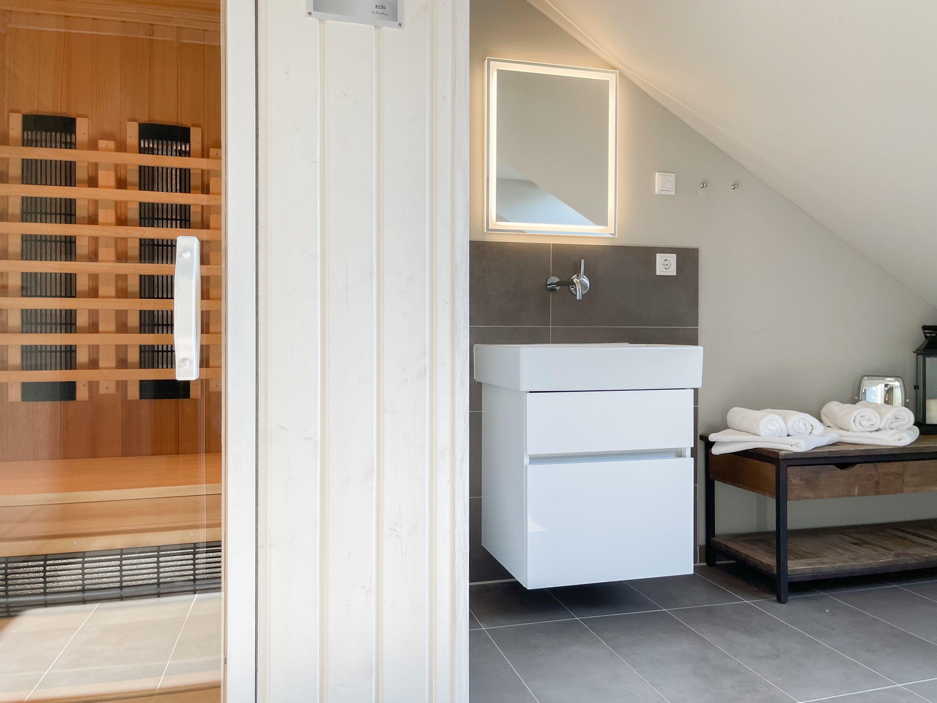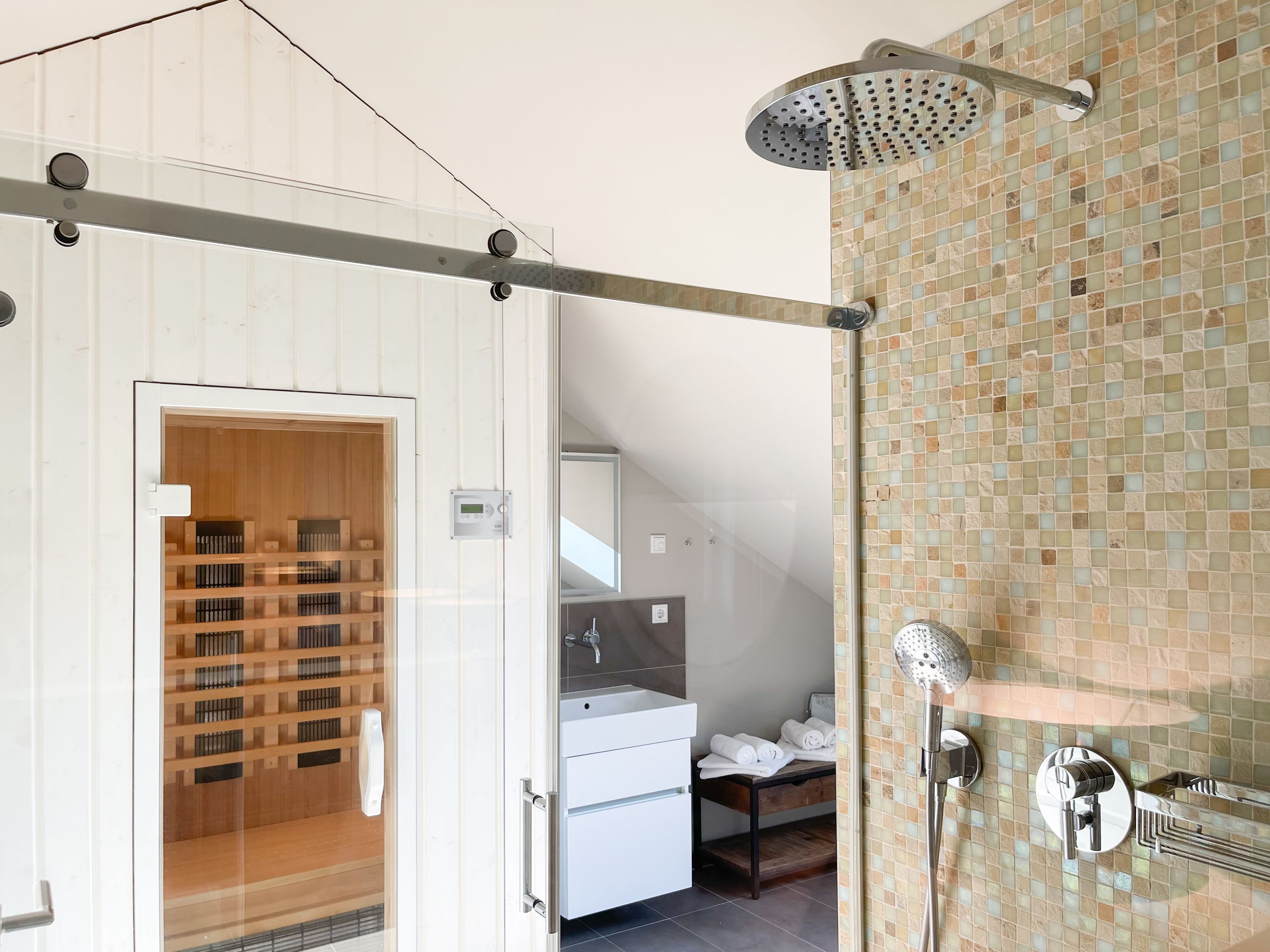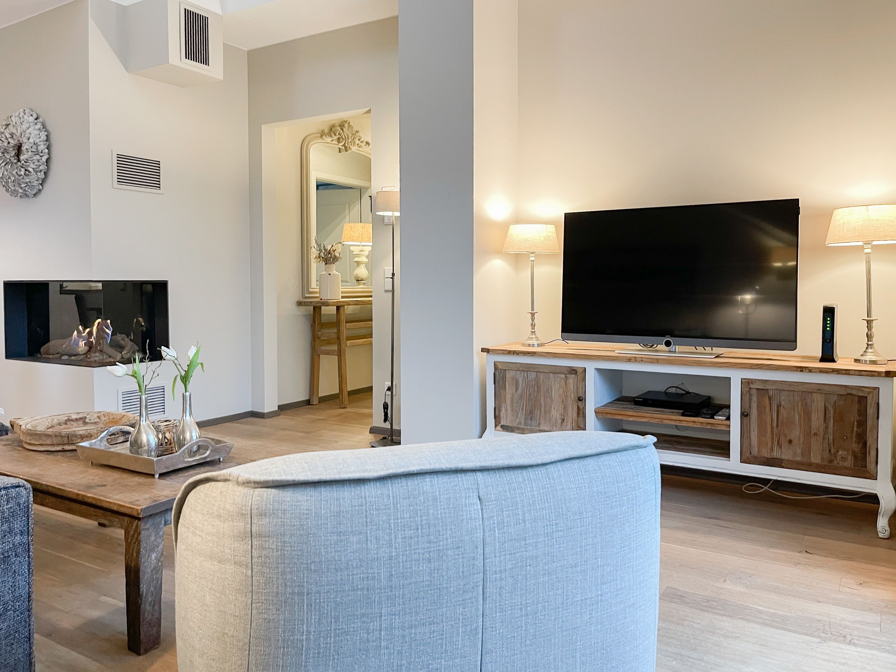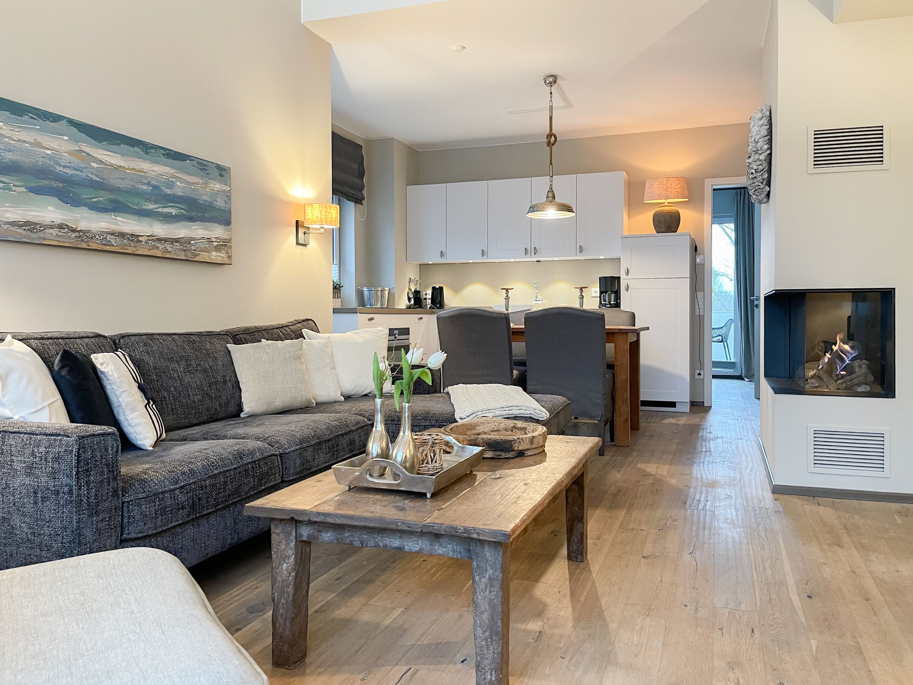 Das Penthouse präsentiert sich als traumhaftes Loft über 2 Ebenen. Die hochwertige, äußerst geschmackvolle Einrichtung vermittelt ein wunderbares Wohngefühl. Für erholsame Urlaubstage sorgen zwei großzügige Dachterrassen und die Infrarot Wärmekabine, besonders hilfreich gegen Verspannungen und zur Entschlackung. Auf der unteren Ebene ist der gemütliche Wohnbereich mit vorgelagerter Sonnenterrasse, der anschließende Essbereich und die offene, bestens ausgestattete Wohnküche mit integrierter Waschmaschine untergebracht. Den Mittelpunkt bildet der Kamin, der von zwei Seiten einsehbar ist. Auf dieser Wohnebene befindet sich ebenfalls ein Schlafzimmer, ausgestattet mit einem Boxspringbett und zusätzlichem TV. Highlight ist die vorgelagerte zweite Dachterrasse, um die ersten Sonnenstrahlen bei einem Morgenkaffee zu genießen. Ein hochwertiges Tageslichtbad mit kombinierter Badewanne/Dusche und ein separates Gäste WC stehen zur Verfügung. Auf der oberen Ebene befindet sich das zweite, abgeschlossene Schlafzimmer, das ebenfalls  mit einem Doppelbett und zusätzlichem TV ausgestattet ist und ein modernes, helles Duschbad mit integrierter Infrarot Wärmekabine.