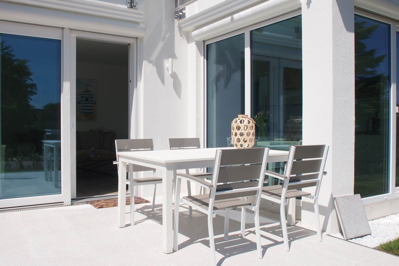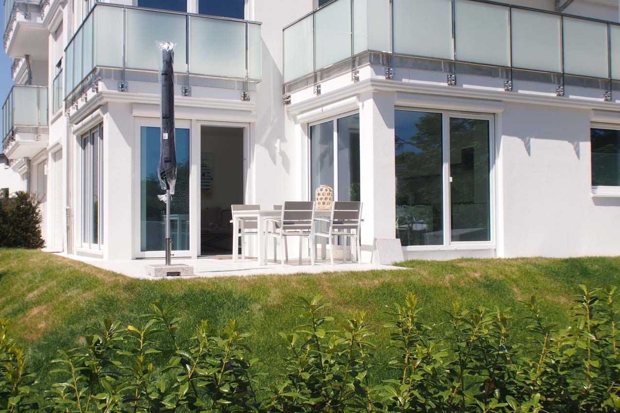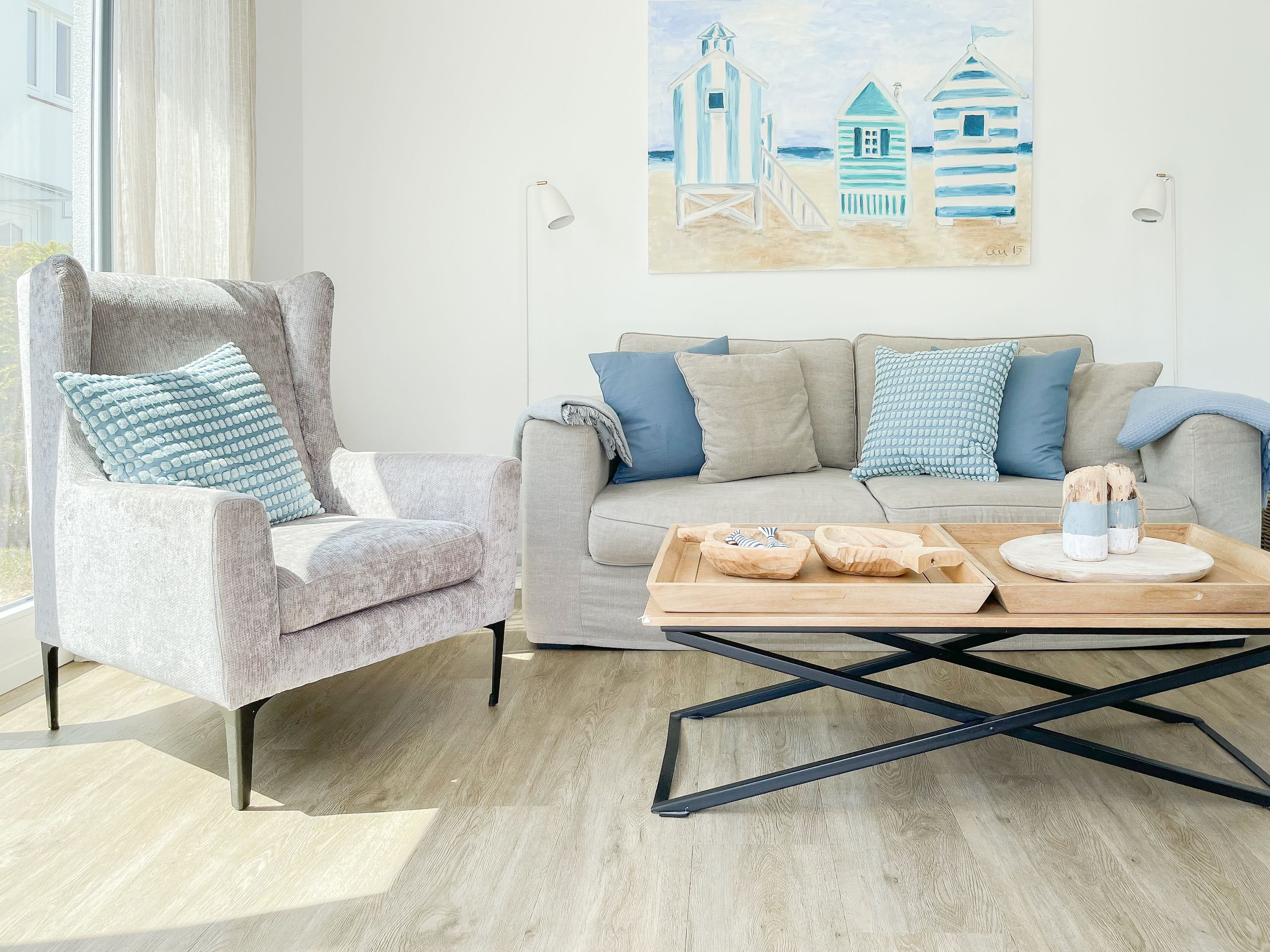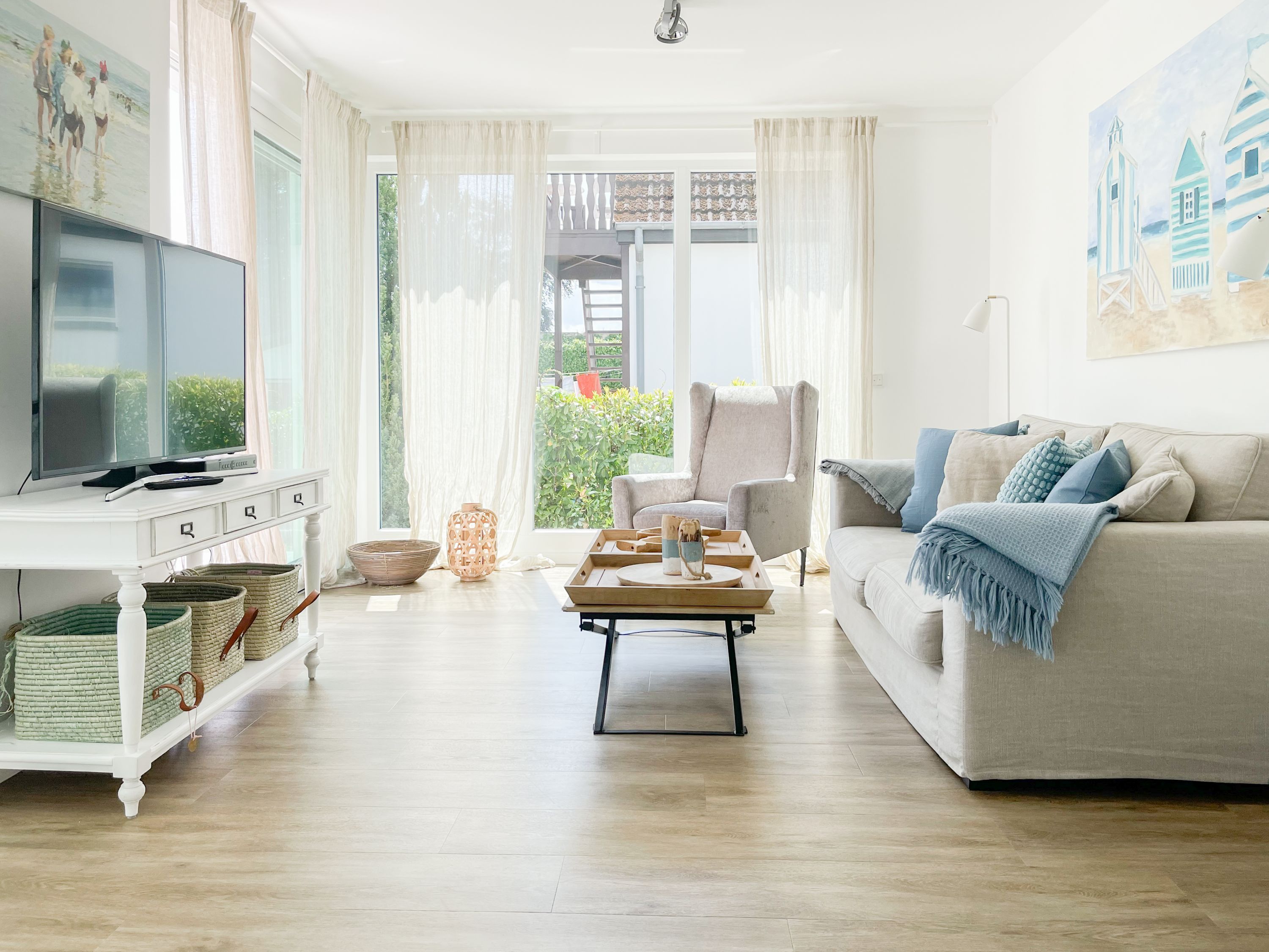Die Ferienwohnung ist hochwertig ausgestattet und geschmackvoll eingerichtet. Bodentiefe Fensterflächen sorgen für einen lichtdurchfluteten Wohnbereich mit einem gemütlichen Sofa, Sessel und TV. Die vorgelagerte Sonnenterrasse ist ein wunderbarer Platz, um entspannte Urlaubstage zu genießen. Die offene Einbauküche mit angrenzendem Essbereich ist bestens mit allen technischen Geräten ausgestattet, um höchsten Ansprüchen zu genügen. Es stehen zwei separate Schlafzimmer zur Verfügung, die beide mit Boxspringbetten (180x200 und 160x200), Kleiderschrank und TV ausgestattet sind. Das hochwertige Duschbad mit integrierter Waschmaschine und integriertem Trockner ist großzügig angelegt und bietet reichlich Tageslicht. Die gesamte Wohnung ist mit elektrischen Außenjalousien versehen und verfügt über eine Fußbodenheizung für ein angenehmes Raumklima.
