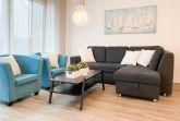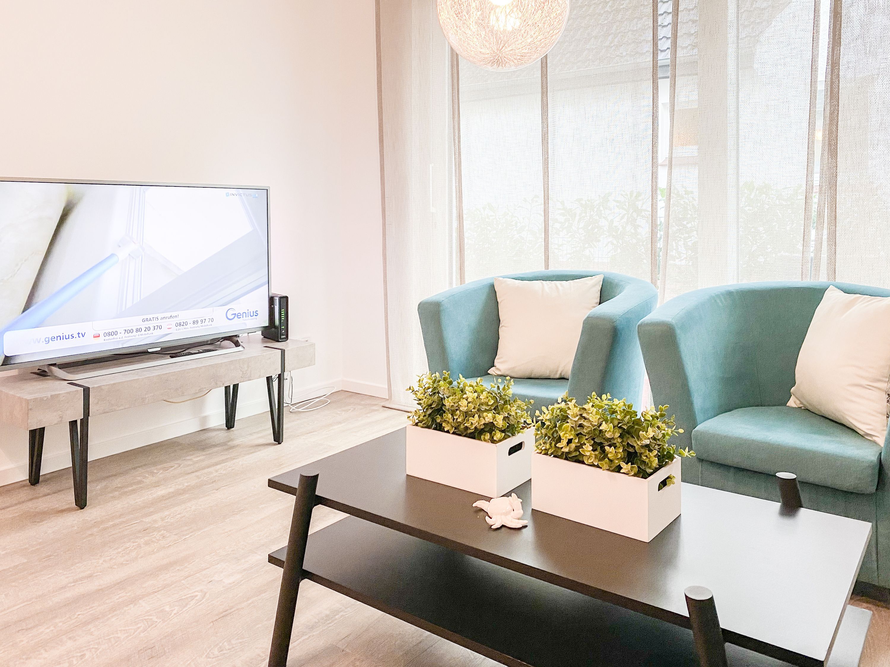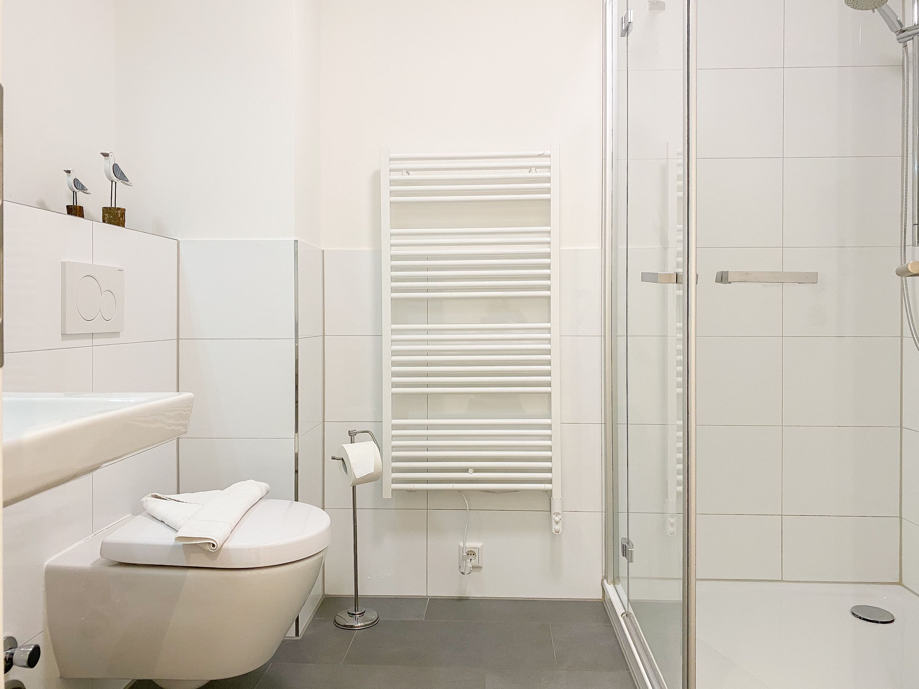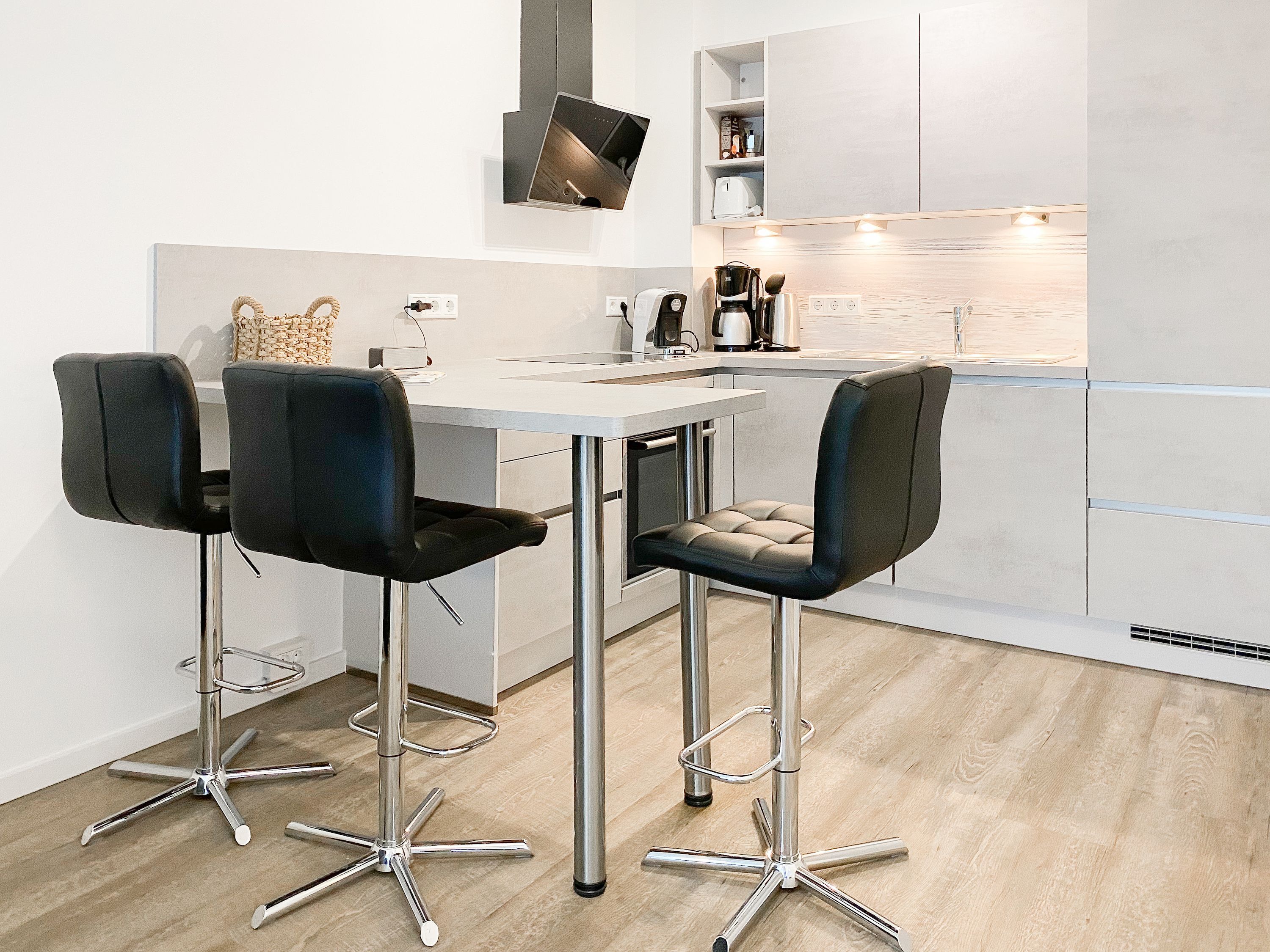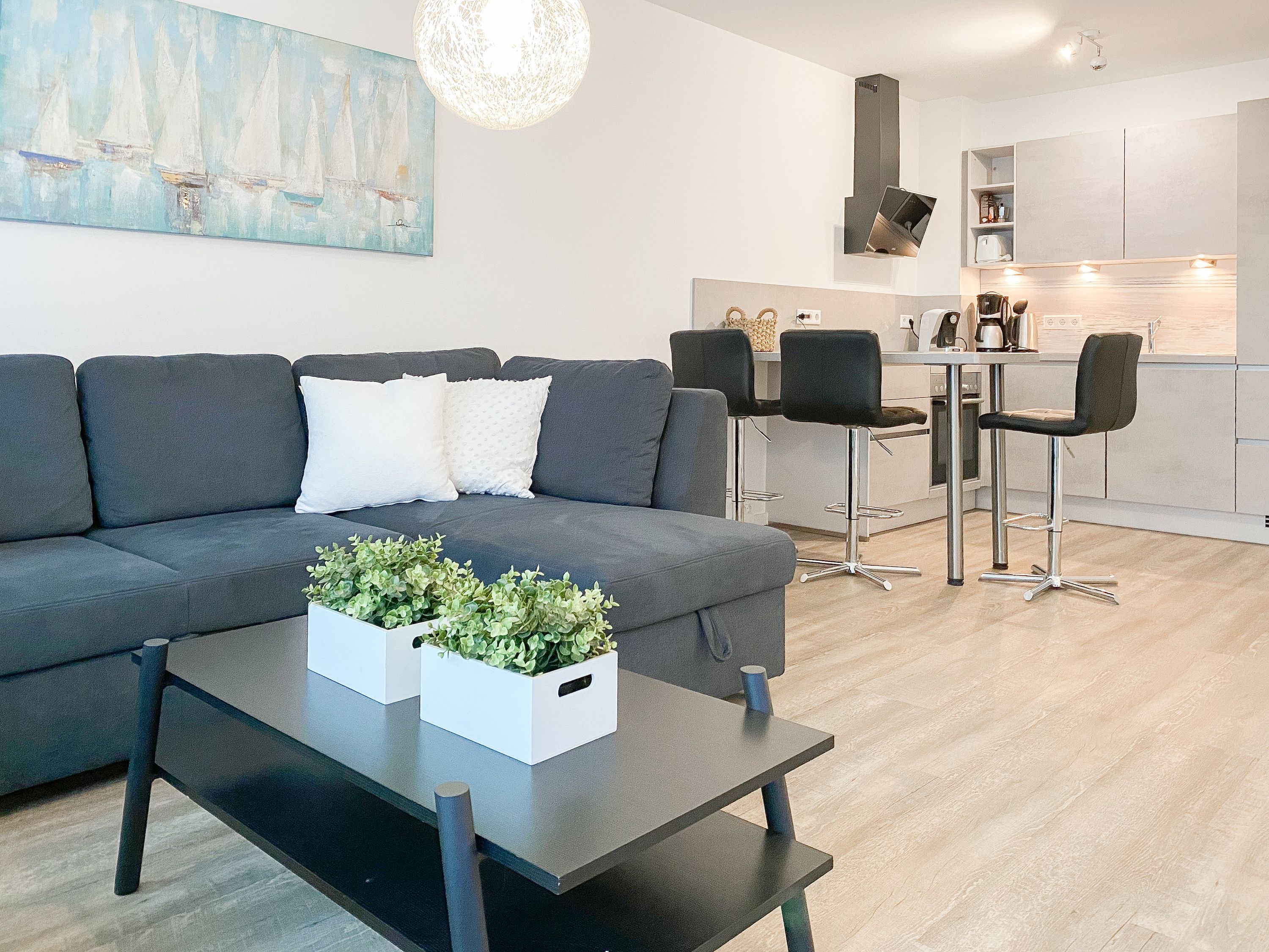 Die Ferienwohnung Lütte Krabbe bietet ausreichend Platz für 2-3 Personen. Große, bodentiefe Fensterelemente sorgen für einen hellen, freundlichen Wohnbereich, der mit einem Sofa mit Schlaffunktion, zwei Sesseln und TV ausgestattet ist. Auf der Sonnenterrasse in Südausrichtung, die sich über die gesamte Breite der Wohnung erstreckt, lässt es sich mit reichlich Sonnenschein vom Frühstück bis zum Abend herrlich entspannen. Die offene Küche mit integriertem Essbereich verfügt über alle technischen Geräte wie Backofen, Ceranfeld und Geschirrspüler sowie alle notwendigen Küchenutensilien. Das separate Schlafzimmer ist mit einem Doppelbett (180x200) und ausgestattet verfügt ebenfalls über einen Terrassenzugang.  Alle Räume sind mit elektrischen Außenjalousien versehen und lassen sich vollständig verdunkeln. Das moderne Duschbad verfügt über Fußbodenheizung und einen Handtuchwärmer. WLAN steht selbstverständlich zur kostenlosen Nutzung zur Verfügung.