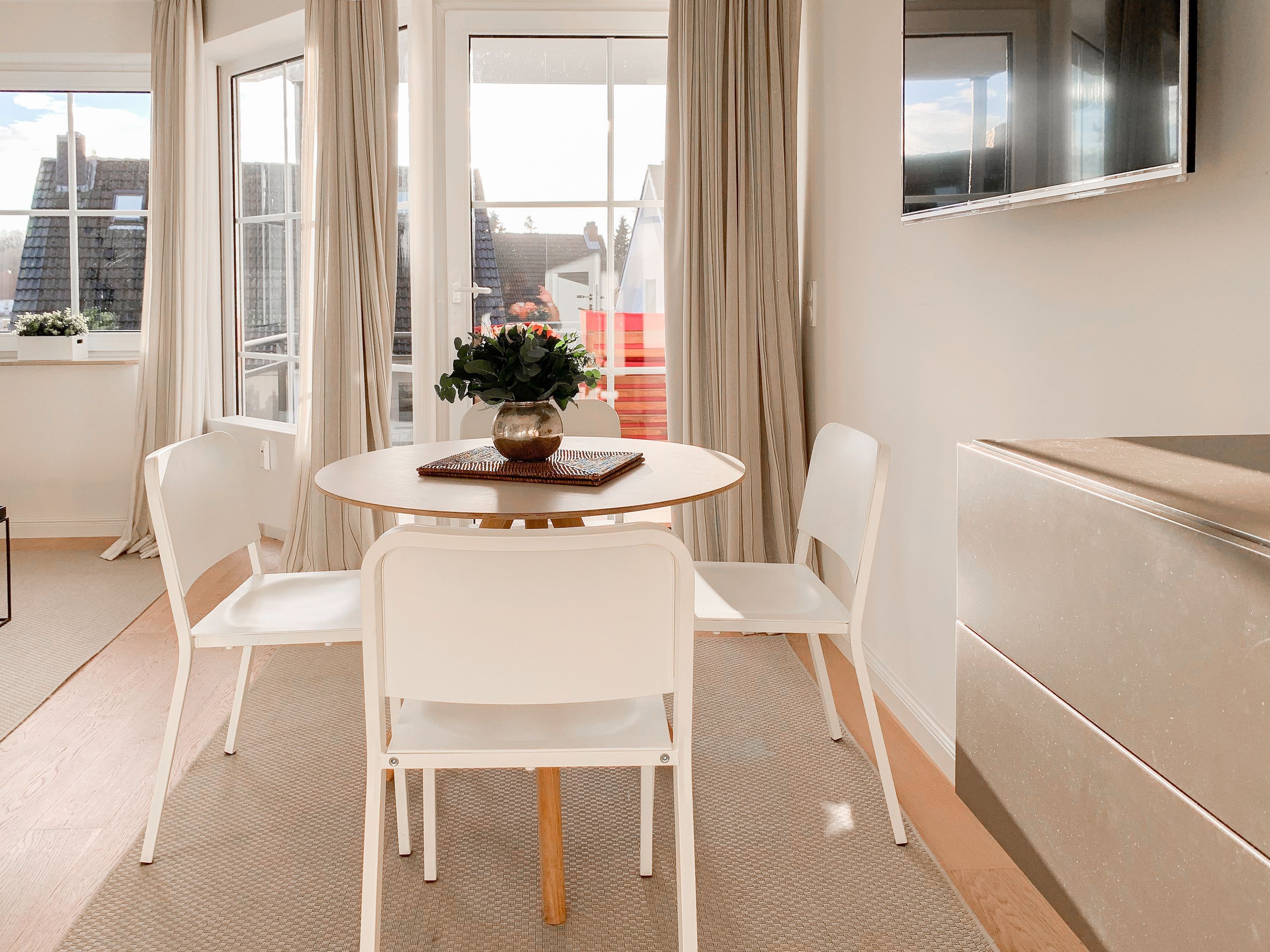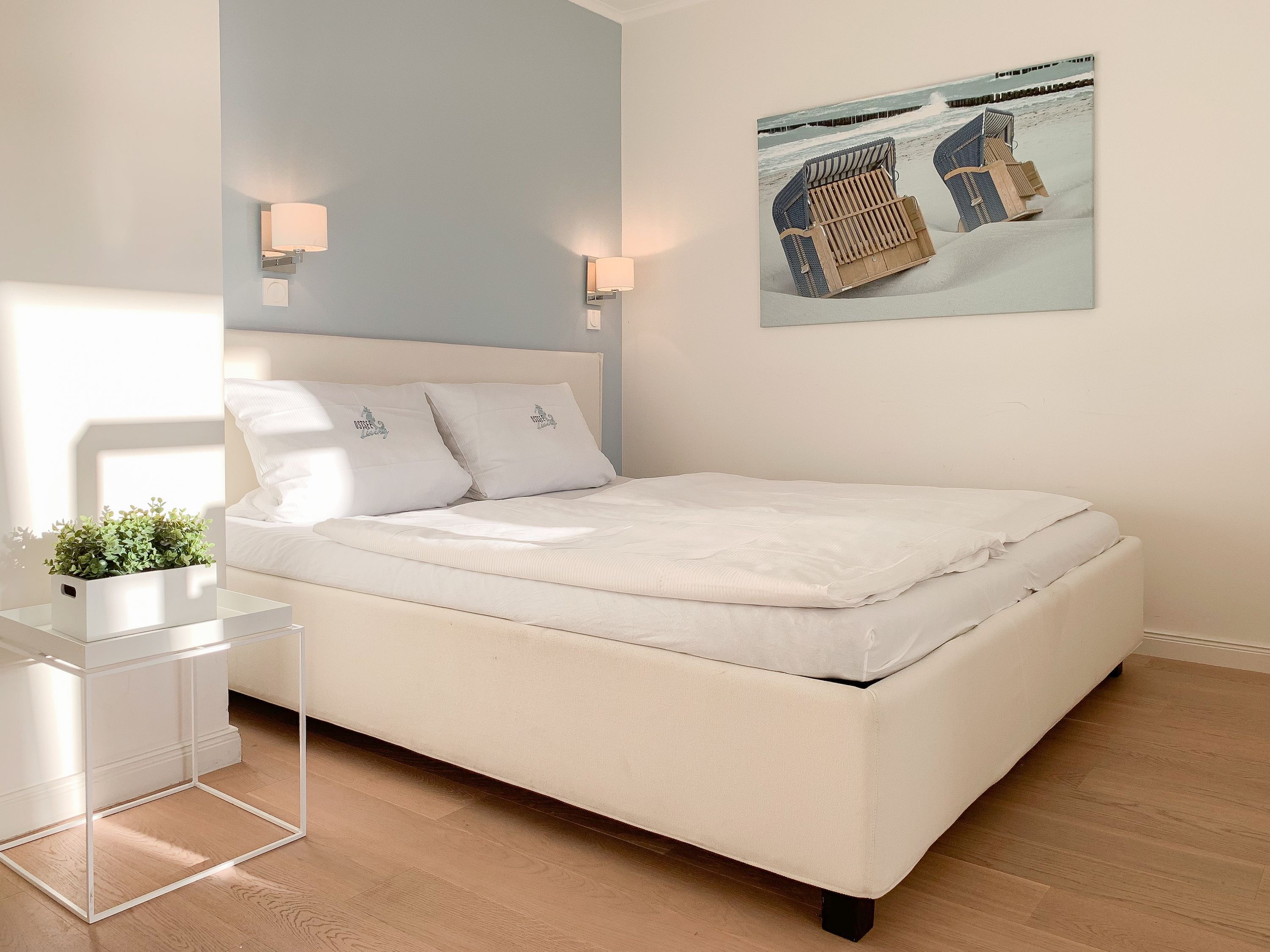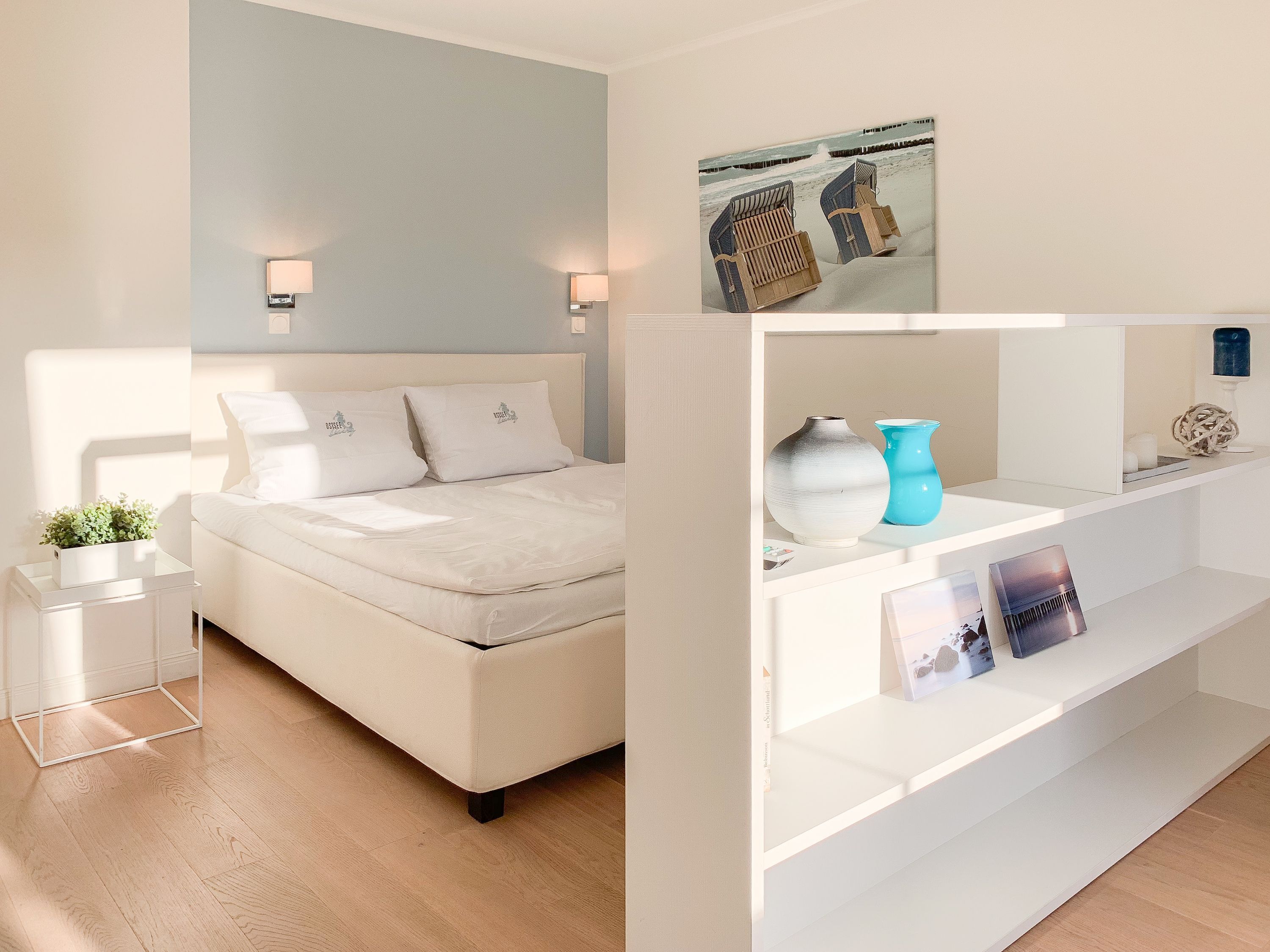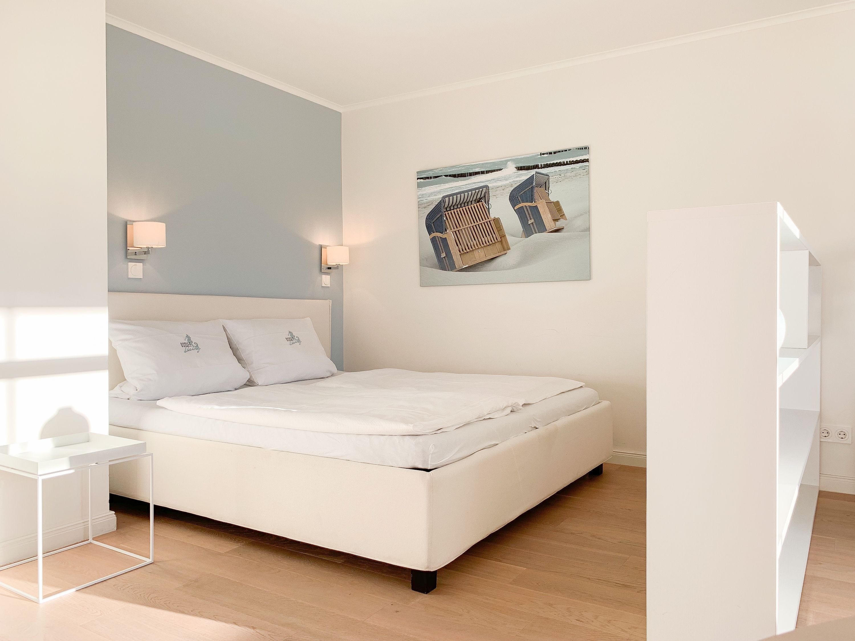 Bodentiefe Fensterelemente, Echtholzparkett und die hochwertige Einrichtung schaffen eine helle und freundliche Wohnatmosphäre. Die 42 qm wurden optimal genutzt und bieten ausreichend Platz für 2-3 Personen. Es steht ein geschmackvoll eingerichteter, großzügiger Wohn-/Schlafbereich mit einem hochwertigen Sofa mit Schlaffunktion, TV und ein Essbereich für 4 Personen zur Verfügung. Das Doppelbett (160x200) ist optisch durch einen Raumteiler vom Wohnbereich getrennt, die Fenster sind mit Verdunkelungsvorhängen versehen. Die moderne Küchenzeile ist im Flurbereich integriert. Das hochwertige Bad verfügt über eine Dusche, Waschtisch, WC, Handtuchwärmer und Fön. Kostenloser Internetzugang über WLAN steht selbstverständlich zur Verfügung.