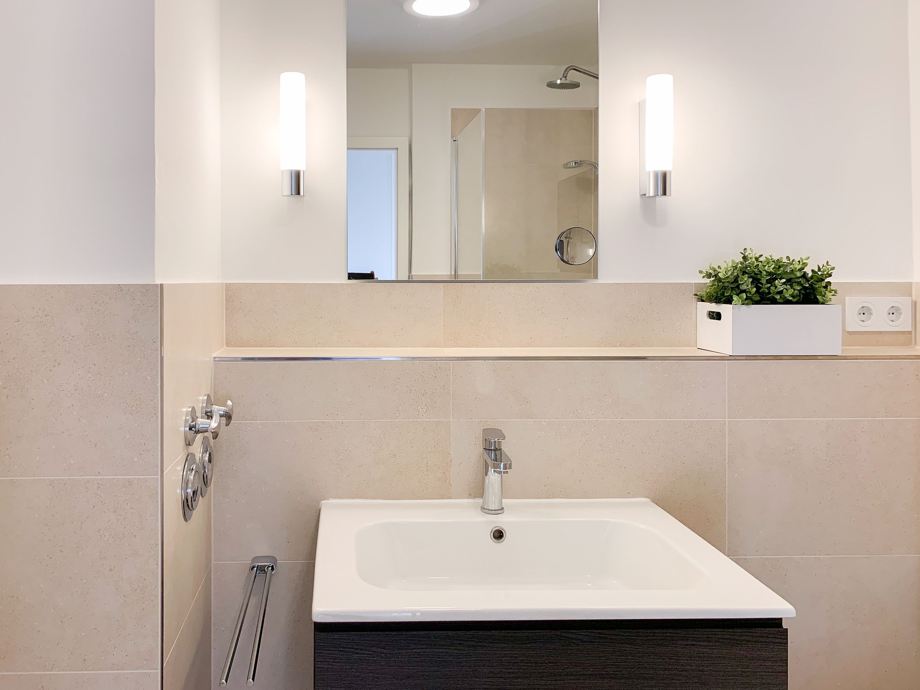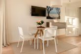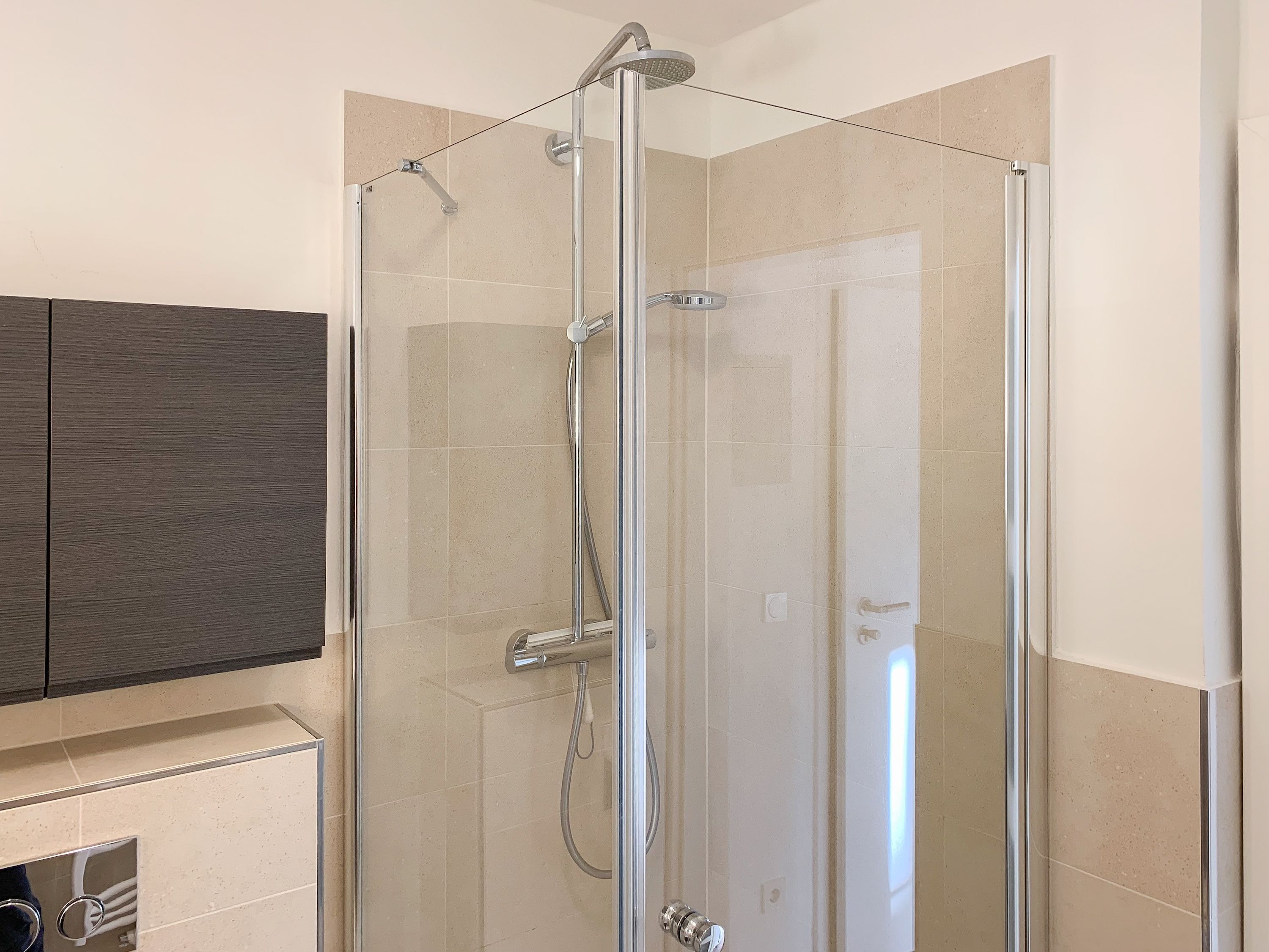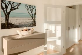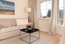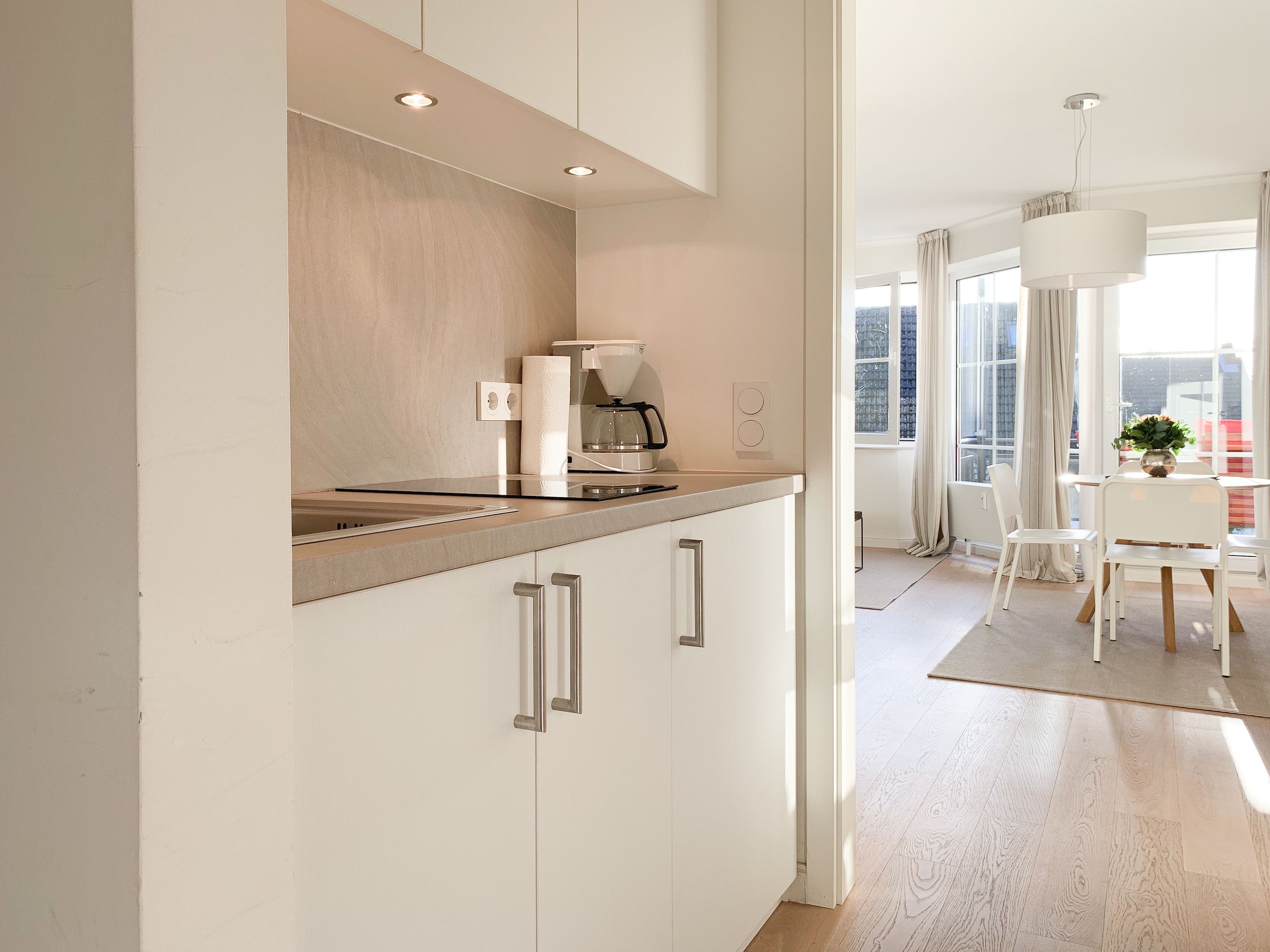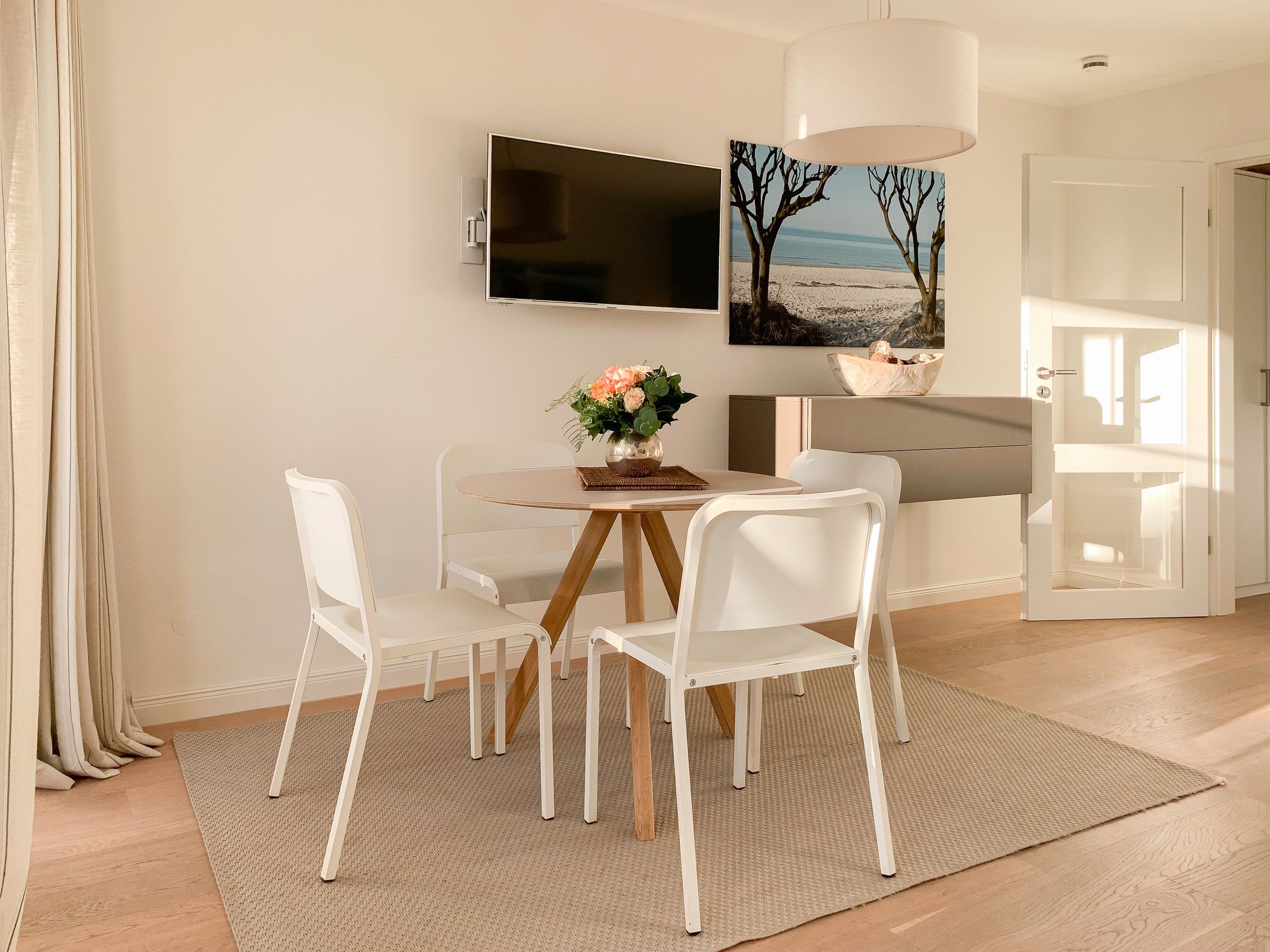 Bodentiefe Fensterelemente, Echtholzparkett und die hochwertige Einrichtung schaffen eine helle und freundliche Wohnatmosphäre. Die 42 qm wurden optimal genutzt und bieten ausreichend Platz für 2-3 Personen. Es steht ein geschmackvoll eingerichteter, großzügiger Wohn-/Schlafbereich mit einem hochwertigen Sofa mit Schlaffunktion, TV und ein Essbereich für 4 Personen zur Verfügung. Das Doppelbett (160x200) ist optisch durch einen Raumteiler vom Wohnbereich getrennt, die Fenster sind mit Verdunkelungsvorhängen versehen. Die moderne Küchenzeile ist im Flurbereich integriert. Das hochwertige Bad verfügt über eine Dusche, Waschtisch, WC, Handtuchwärmer und Fön. Kostenloser Internetzugang über WLAN steht selbstverständlich zur Verfügung.