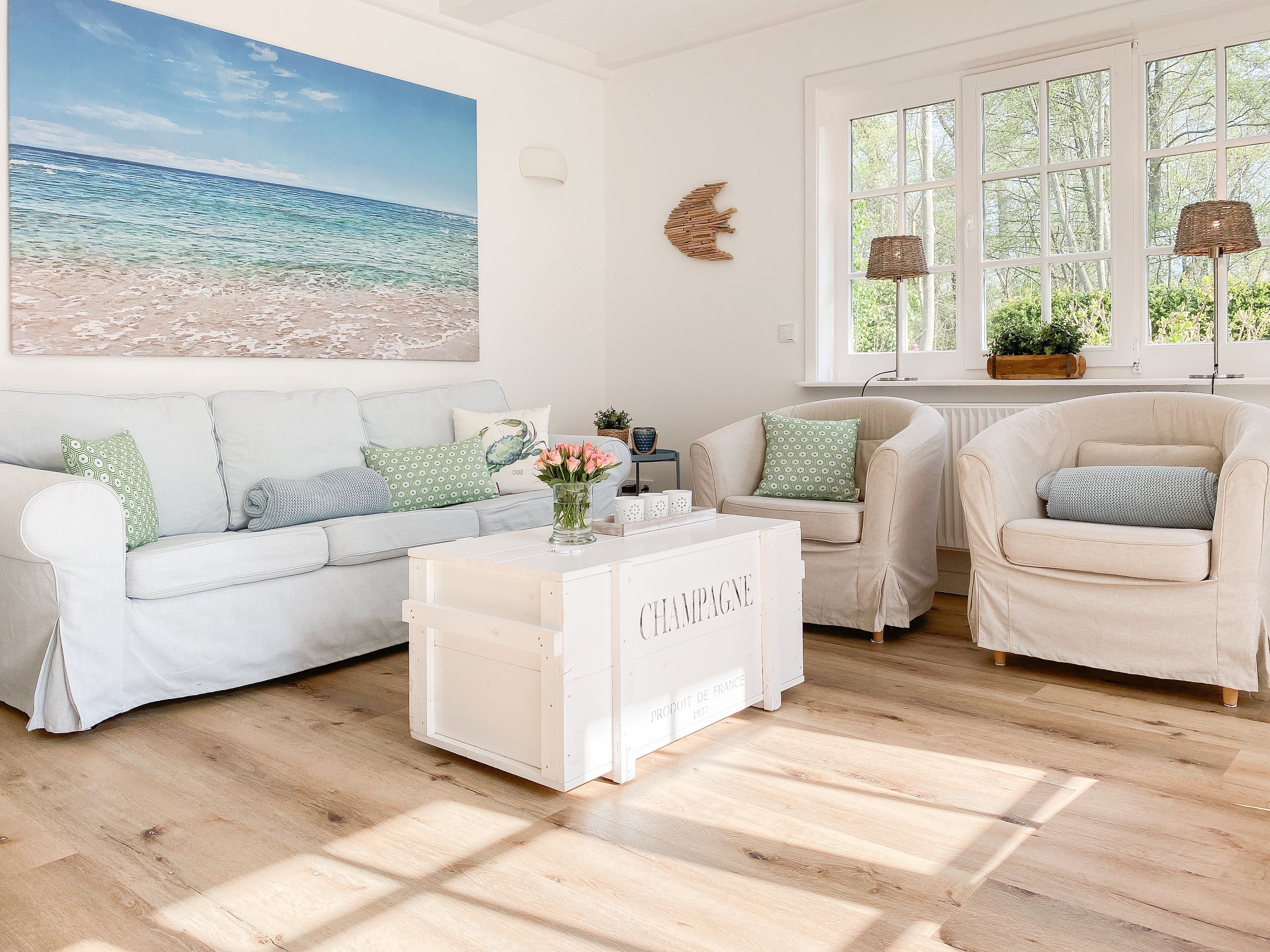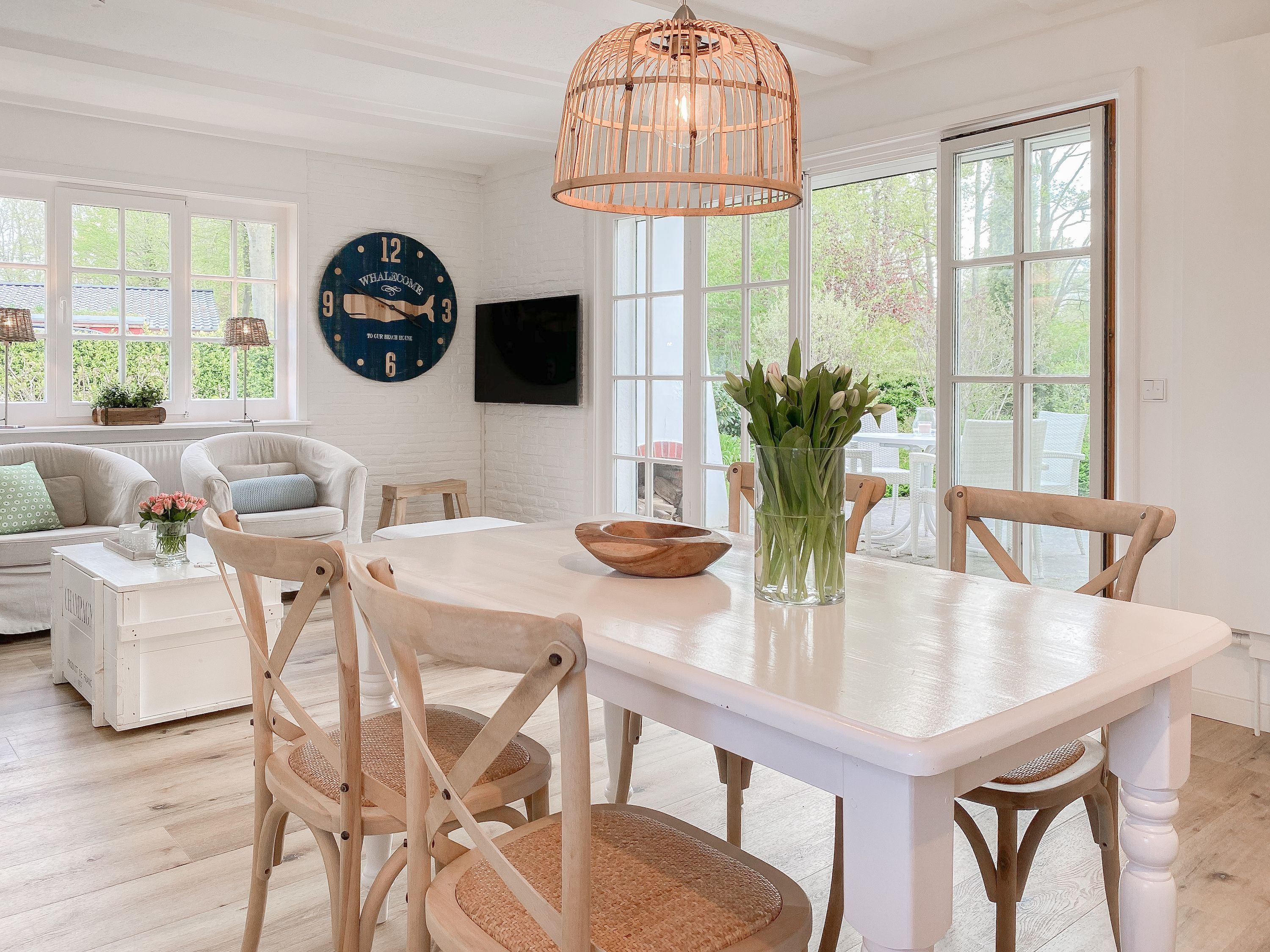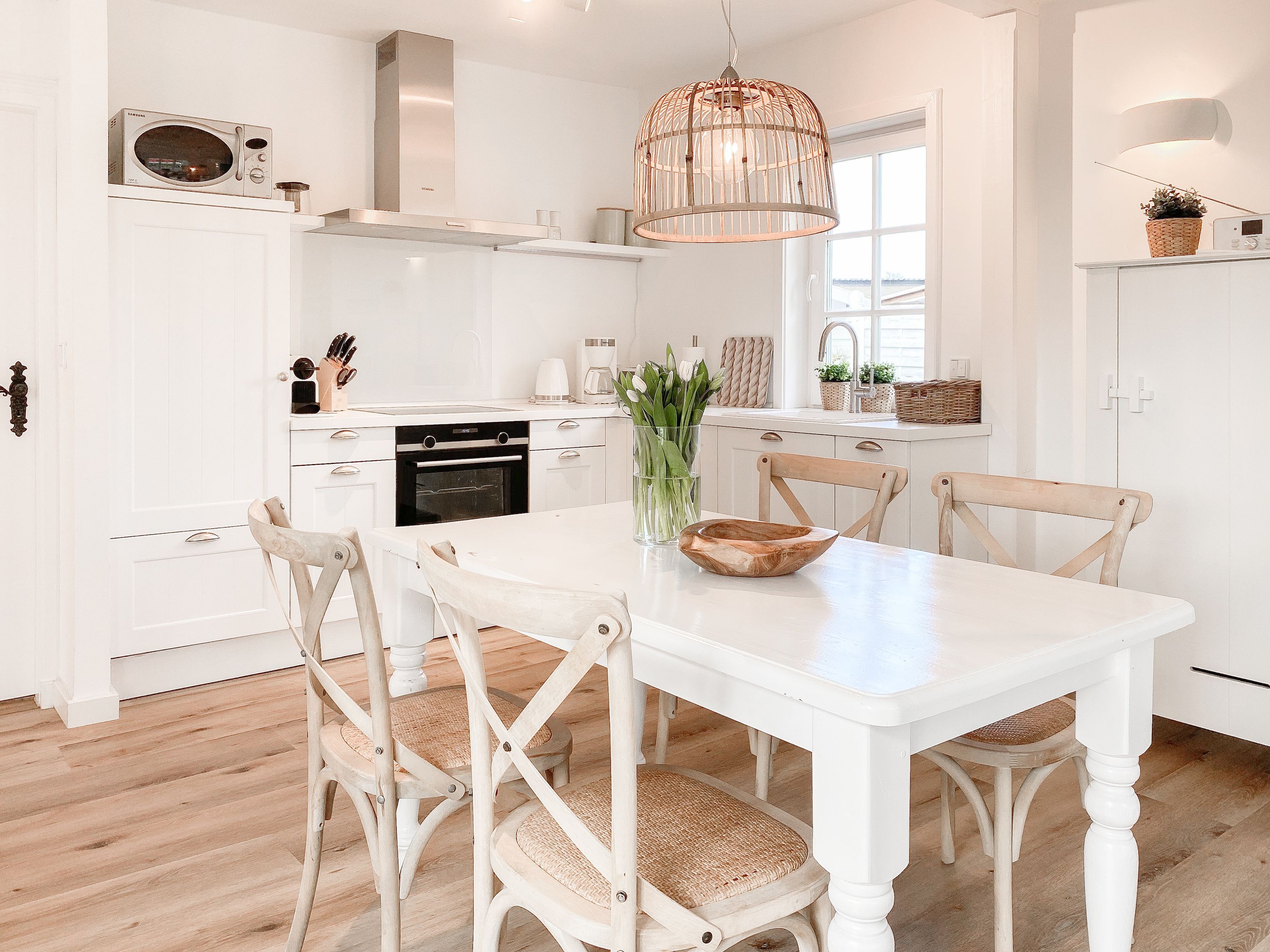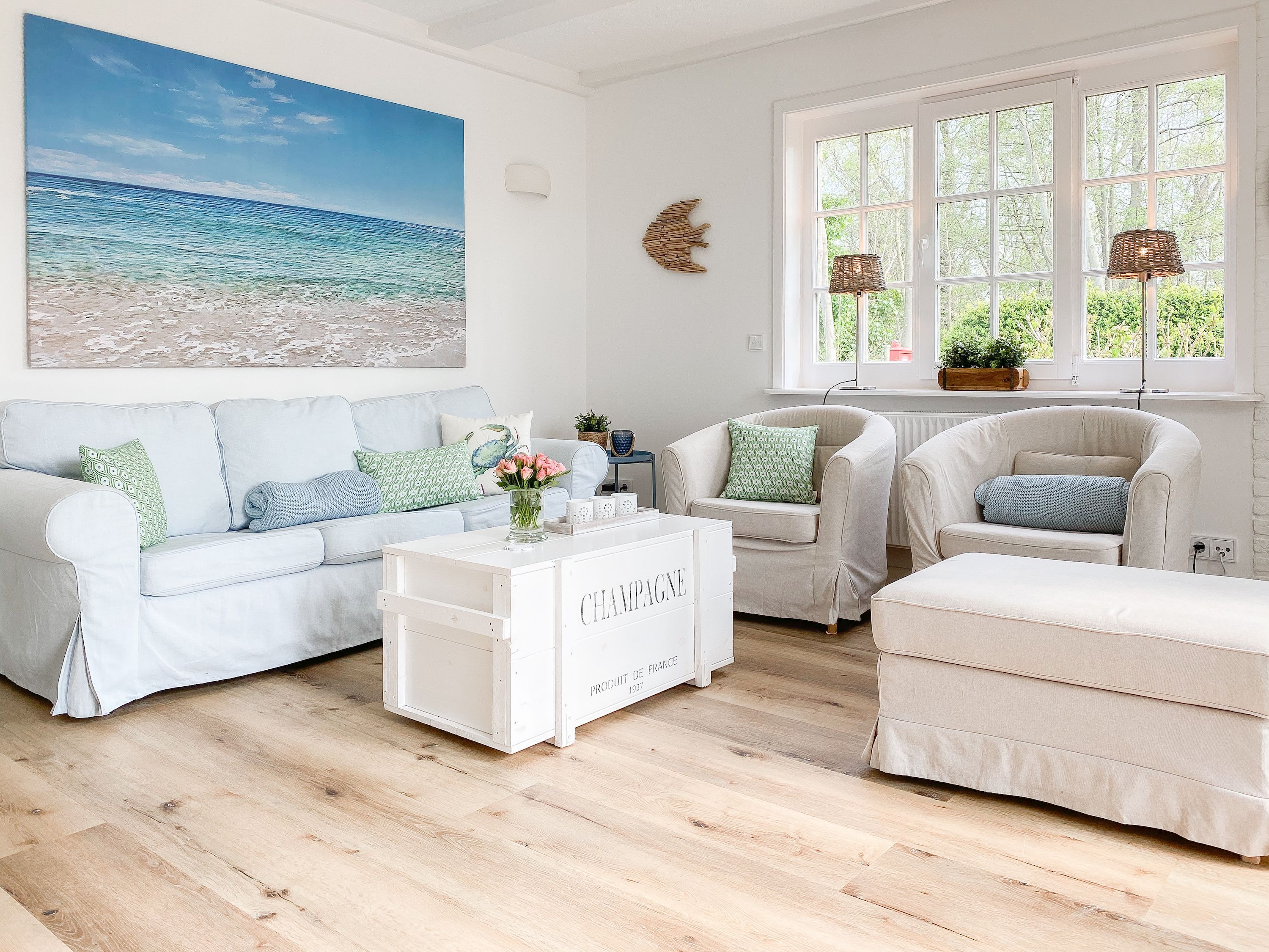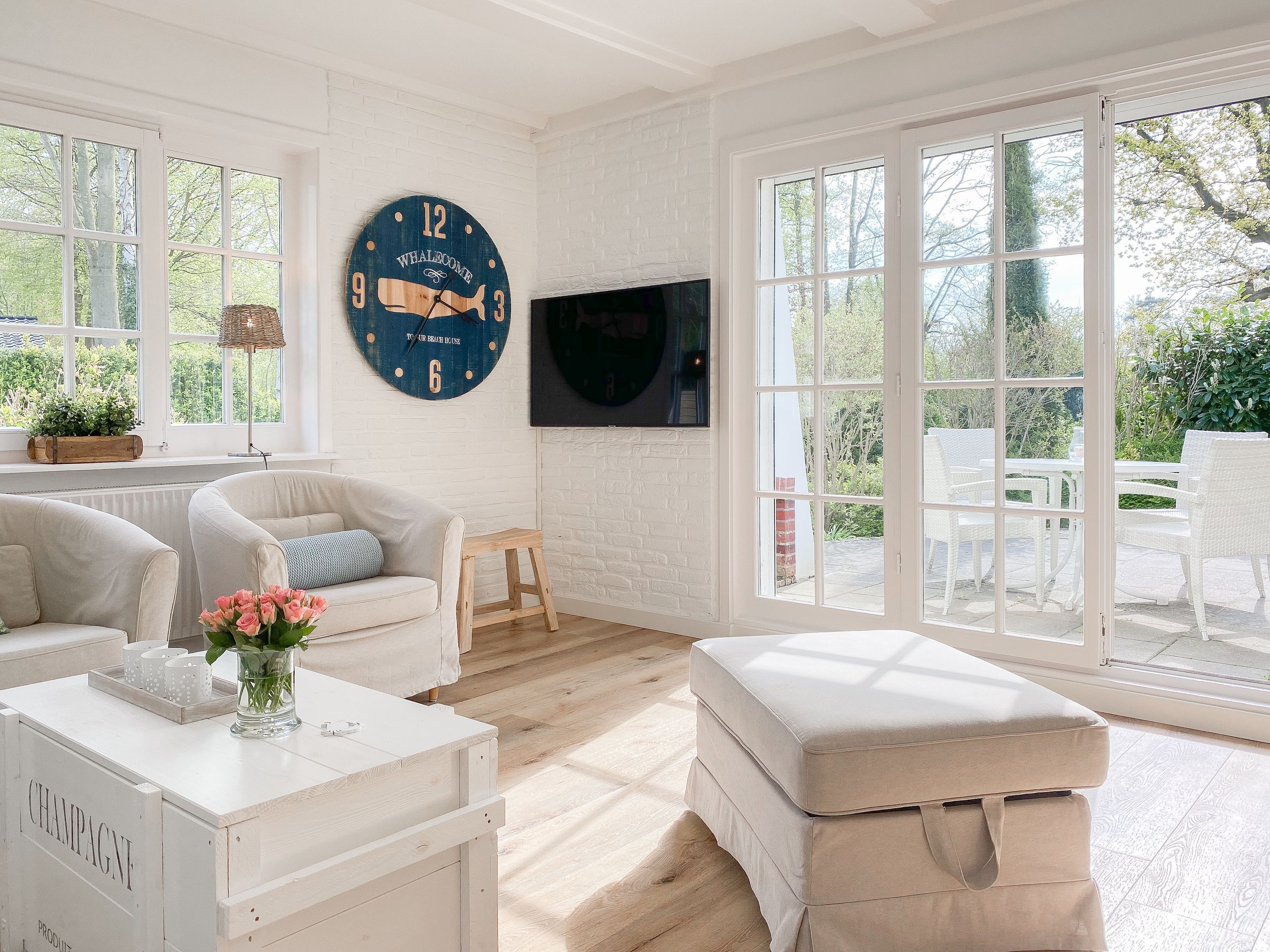 Strandflair pur! Das vollständig renovierte und hochwertig ausgestattete Cottage bietet jeglichen Komfort für 4 Personen, um einen entspannten Urlaub zu verleben! Die stilvolle Einrichtung mit Liebe zum Detail, helle Räumlichkeiten und zeitgemäßes Ambiente wie TV, Bluetooth Lautsprecher, Internetradio und WLAN sorgen für eine Atmosphäre zum Wohlfühlen. Es gibt einen gemütlichen Wohnbereich mit schönem Blick in den eingewachsenen Garten. Die vorgelagerte Sonnenterrasse ist teilweise überdacht und zum Südwesten ausgerichtet. Ein Außenkamin für gemütliche Urlaubsabende, Markise, Sonnenliegen und Gartenmöbel stehen zur Verfügung. Der Essbereich bietet ausreichend Platz für 4 Personen und die offene, hochwertige Einbauküche ist bestens ausgestattet. Es stehen zwei separate Schlafzimmer mit Boxspringbetten (180x200 und 160x200) sowie zwei Duschbäder zur Verfügung. Sämtliche Fenster sind mit elektrischen Außenjalousien versehen. Eine Waschmaschine ist im Bad untergebracht.