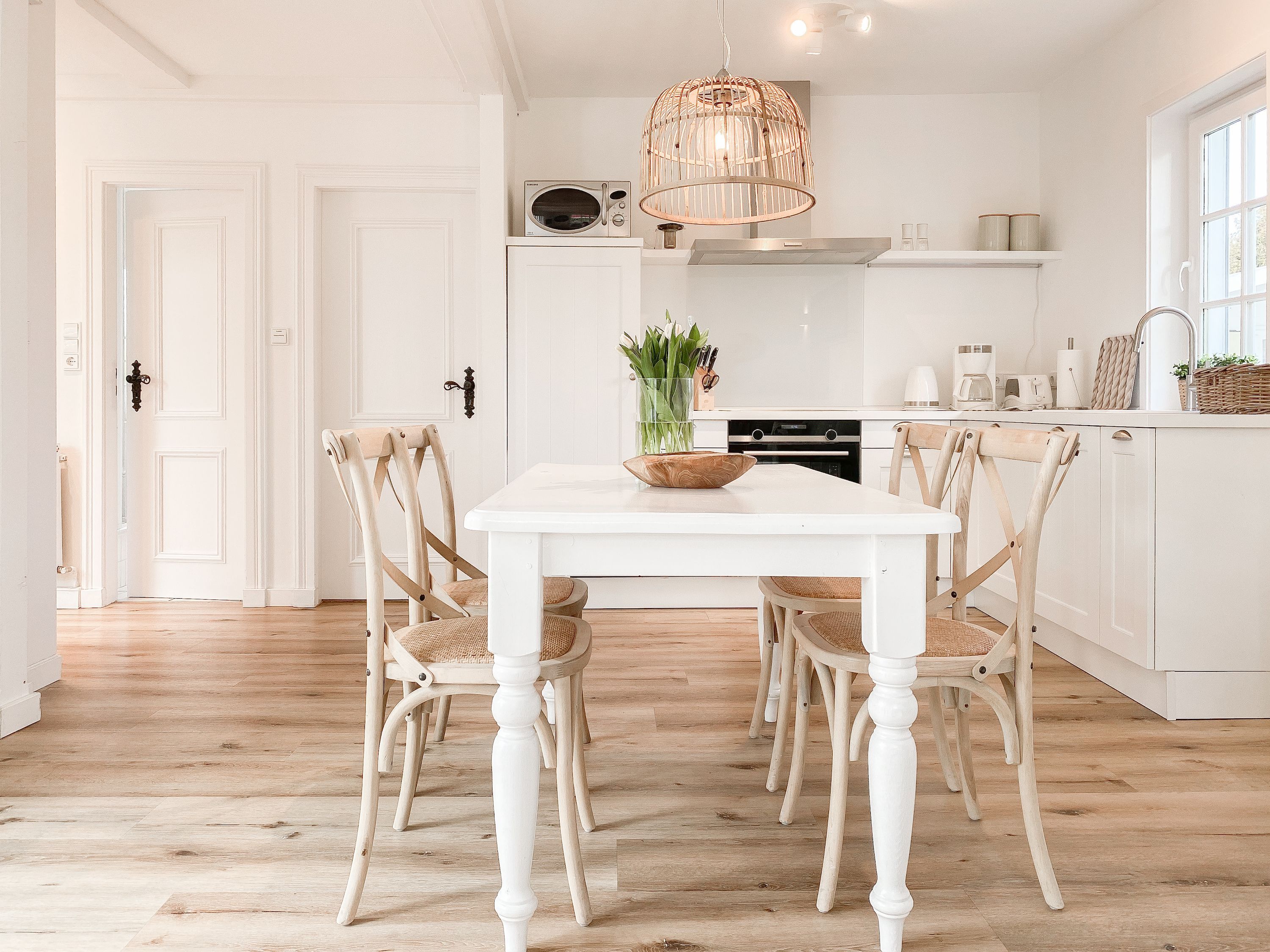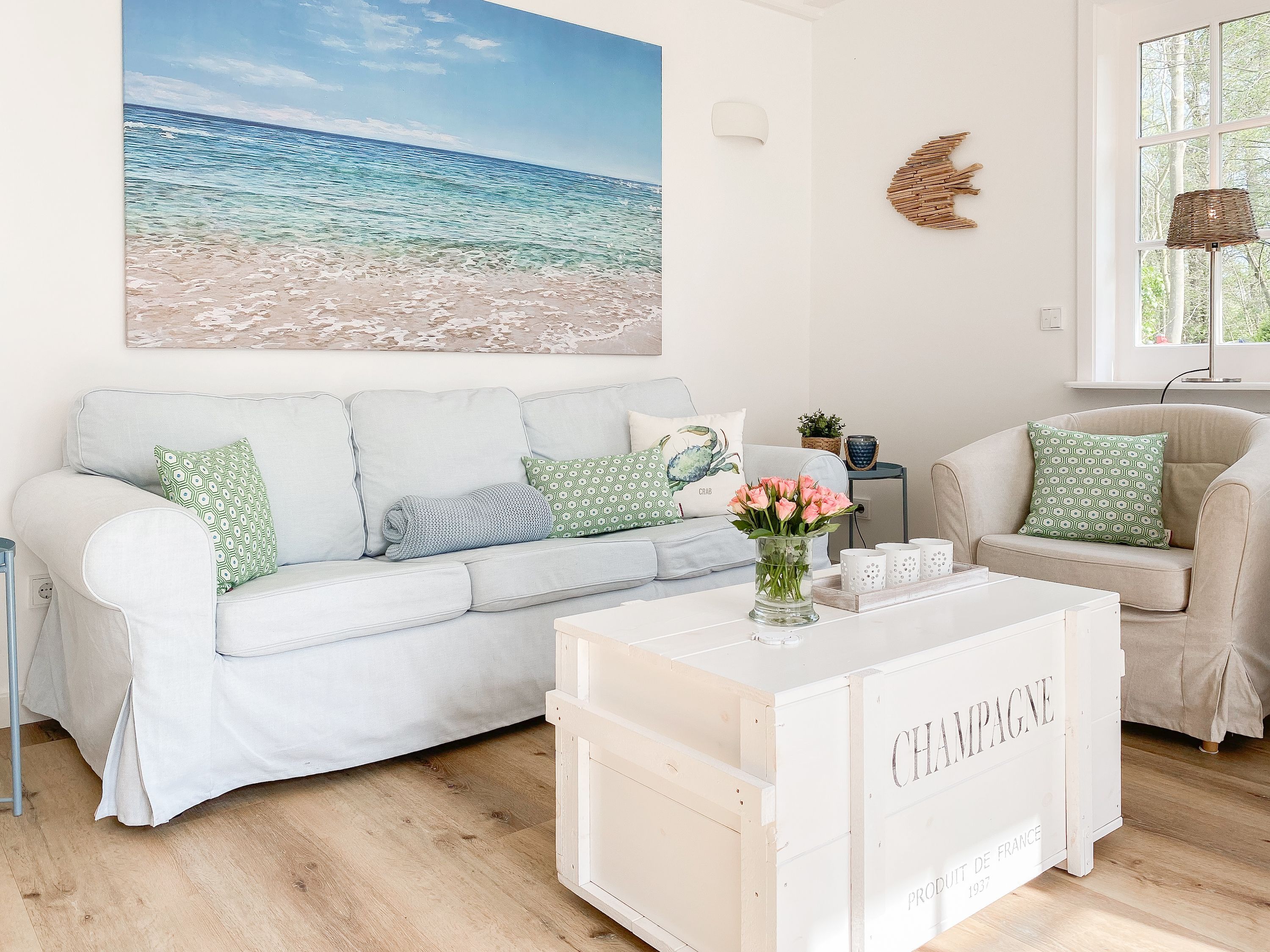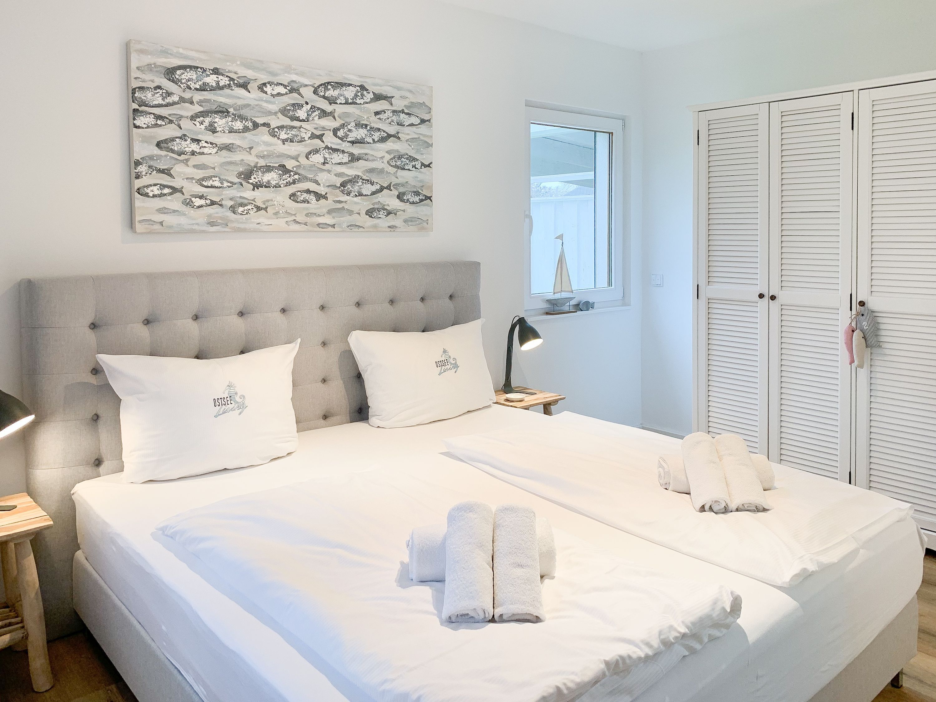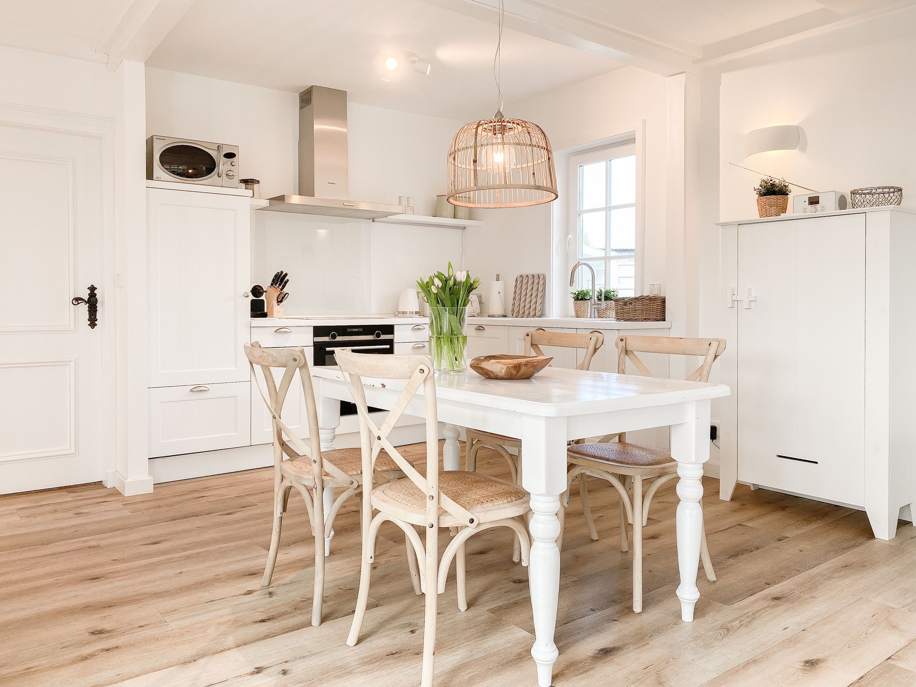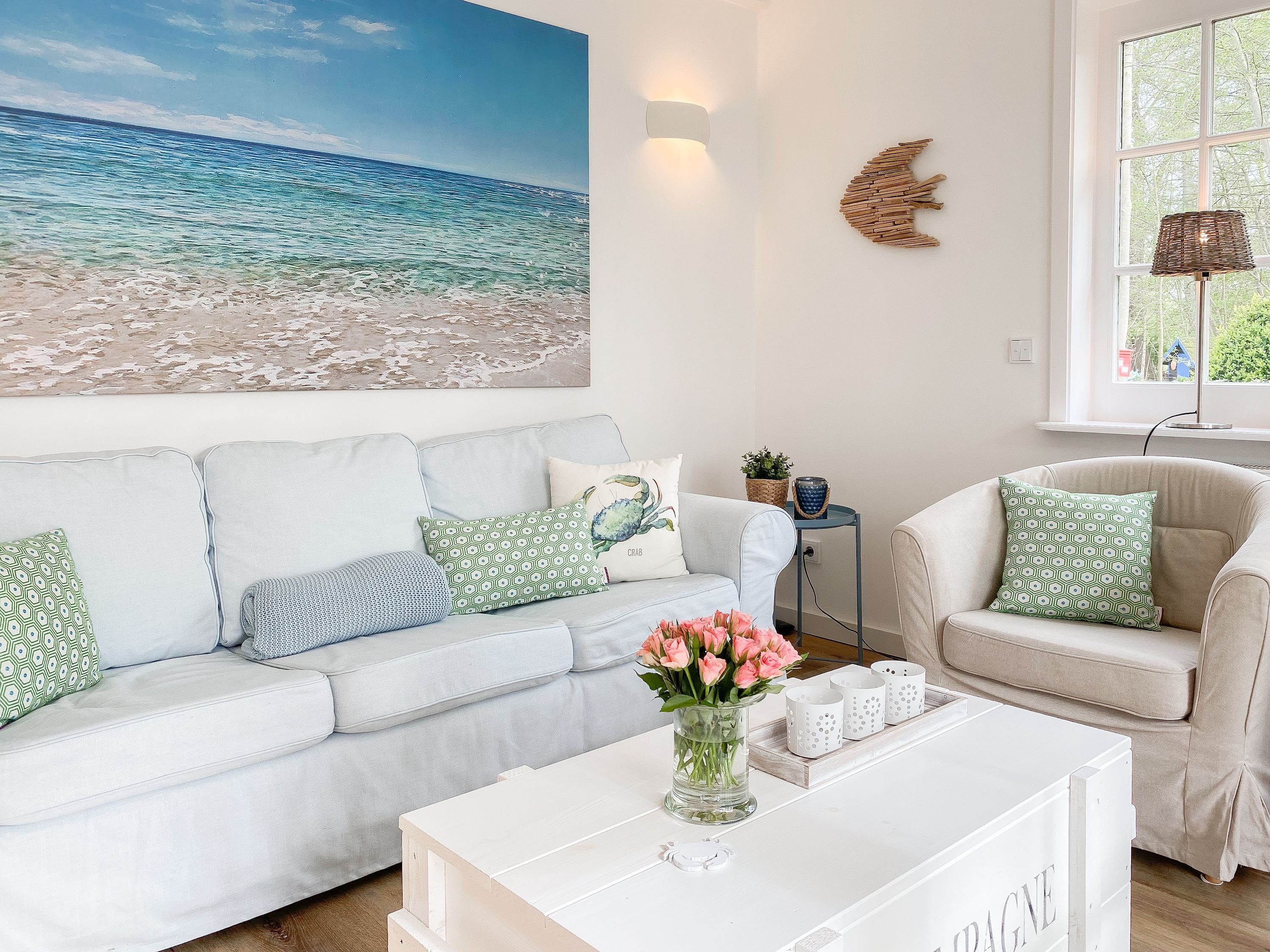 Strandflair pur! Das vollständig renovierte und hochwertig ausgestattete Cottage bietet jeglichen Komfort für 4 Personen, um einen entspannten Urlaub zu verleben! Die stilvolle Einrichtung mit Liebe zum Detail, helle Räumlichkeiten und zeitgemäßes Ambiente wie TV, Bluetooth Lautsprecher, Internetradio und WLAN sorgen für eine Atmosphäre zum Wohlfühlen. Es gibt einen gemütlichen Wohnbereich mit schönem Blick in den eingewachsenen Garten. Die vorgelagerte Sonnenterrasse ist teilweise überdacht und zum Südwesten ausgerichtet. Ein Außenkamin für gemütliche Urlaubsabende, Markise, Sonnenliegen und Gartenmöbel stehen zur Verfügung. Der Essbereich bietet ausreichend Platz für 4 Personen und die offene, hochwertige Einbauküche ist bestens ausgestattet. Es stehen zwei separate Schlafzimmer mit Boxspringbetten (180x200 und 160x200) sowie zwei Duschbäder zur Verfügung. Sämtliche Fenster sind mit elektrischen Außenjalousien versehen. Eine Waschmaschine ist im Bad untergebracht.