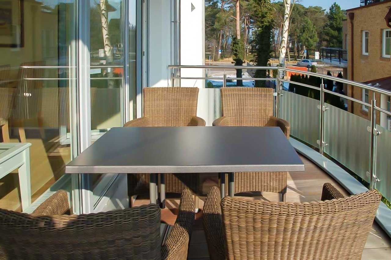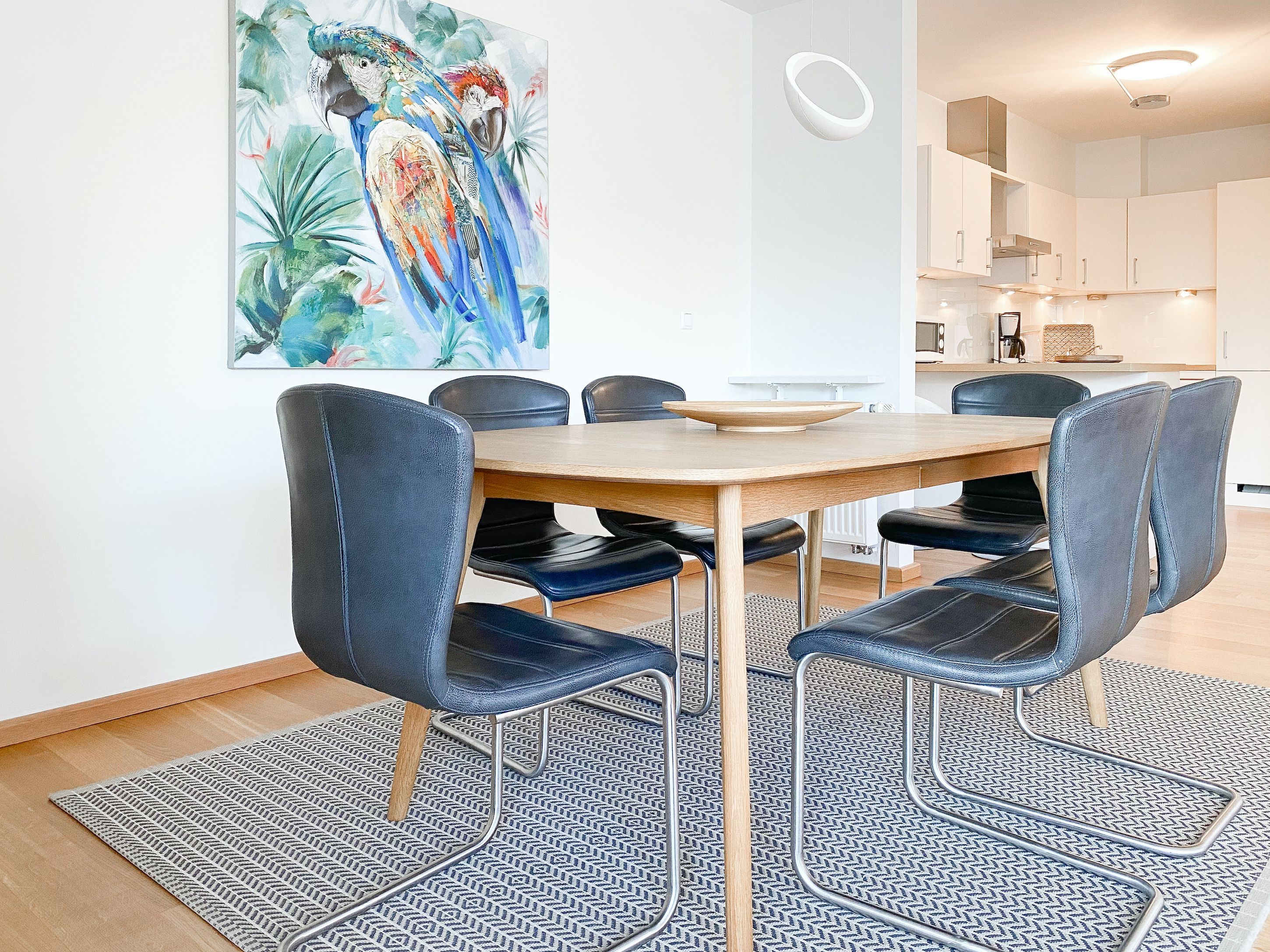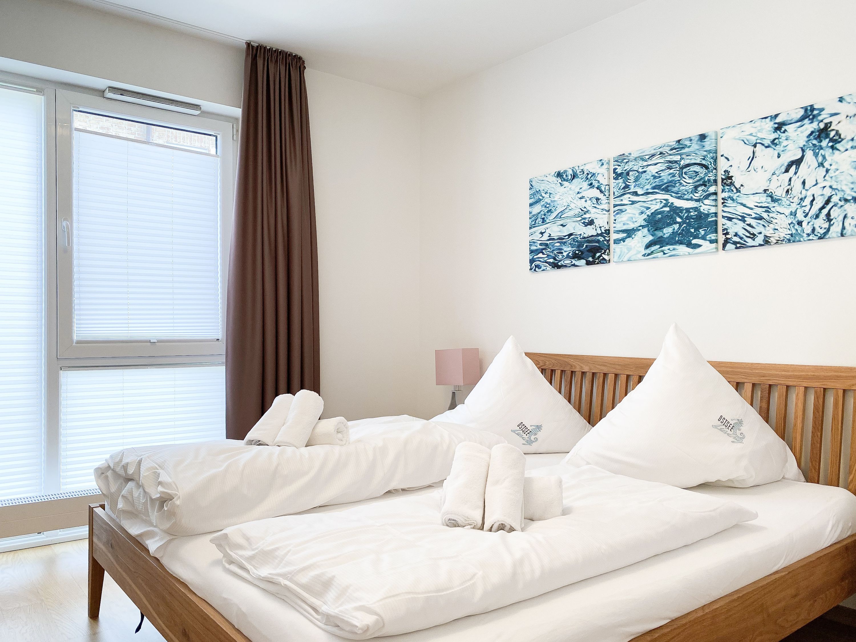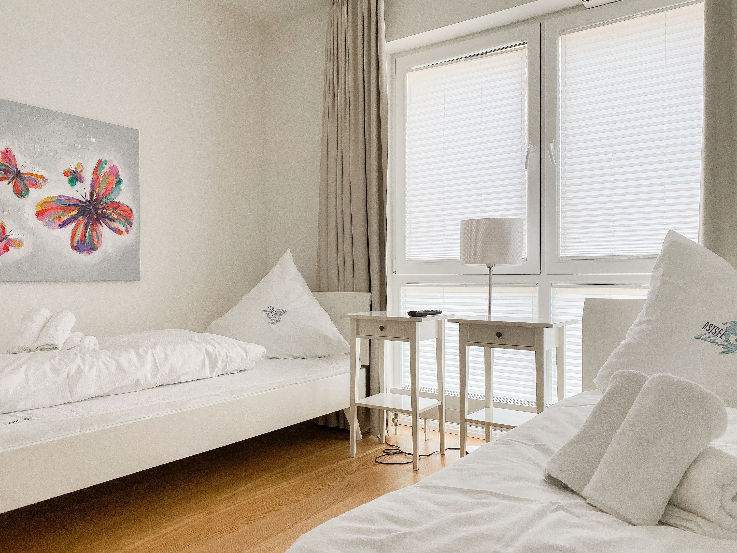 Die 92 qm große Wohnung befindet sich im ersten Obergeschoss und verfügt über zwei separate Schlafzimmer - ausgestattet mit Doppelbett (180x200) und zwei Einzelbetten (80x200) mit TV - ein komfortables Duschbad mit Fußbodenheizung sowie ein separates Gäste WC. Es gibt einen geschmackvollen Wohnbereich mit TV, Radio und WLAN, einen großzügigen Essbereich und eine offene Einbauküche, bestens ausgestattet mit Mikrowelle, Backofen und Spülmaschine. Der großzügige, überdachte Südbalkon bietet in östlicher Richtung einen schönen Blick auf den gegenüberliegenden Park und die Ostsee. Die großen Fensterelemente und das verwendete Echtholzparkett in diesem Objekt sorgen für eine helle, freundliche Wohnatmosphäre. Ankommen und Wohlfühlen!