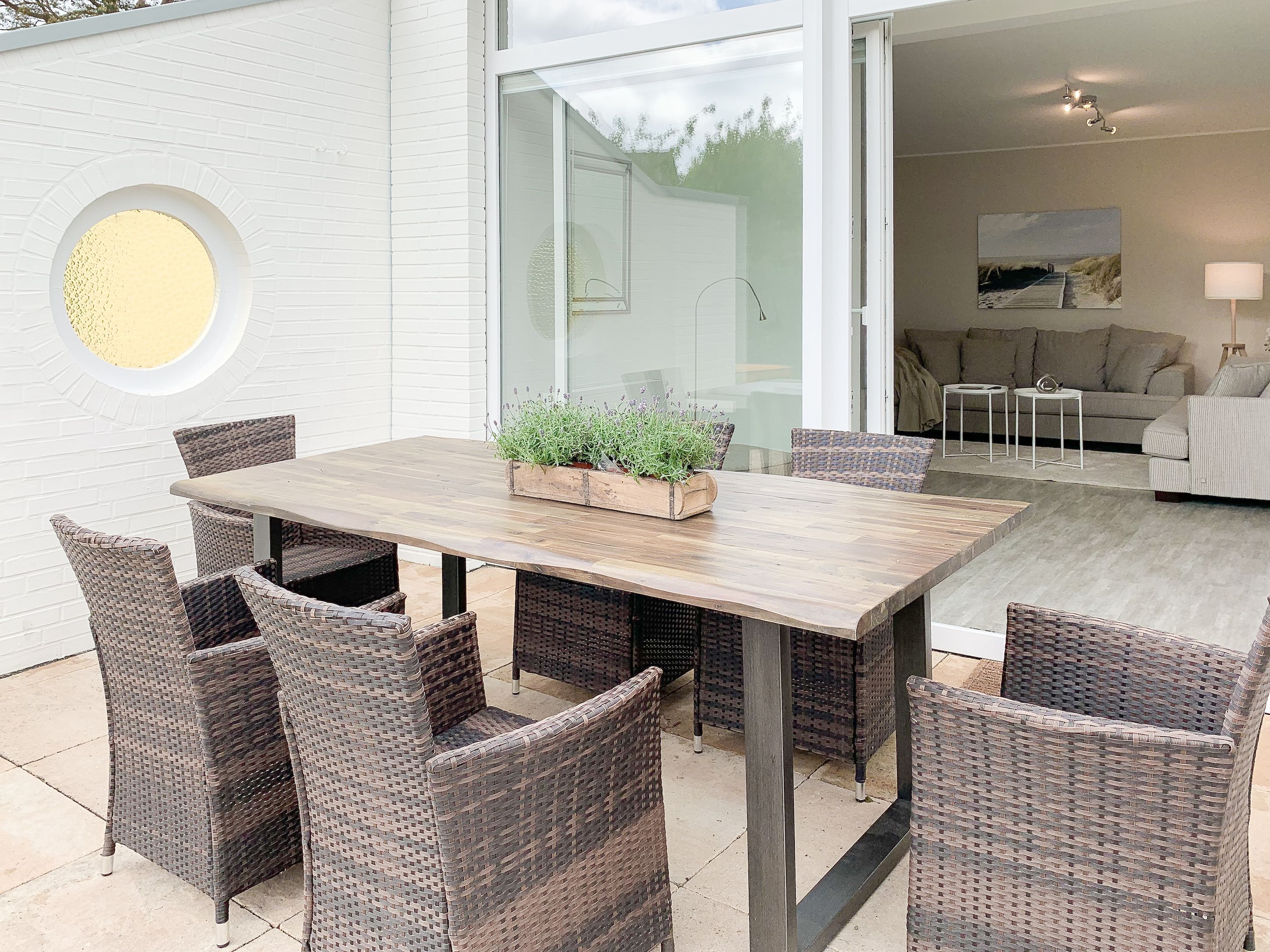 Das Ferienhaus bietet auf 100 qm jeglichen Komfort für 6 Personen, um einen schönen Urlaub zu verleben. Mittelpunkt des Hauses ist der großzügige Wohn- Essbereich mit bodentiefen Fensterelementen und schönem Blick in den weitläufigen Garten. Helle Räumlichkeiten und zeitgemäßes Ambiente wie TV, Bluetooth Lautsprecher, Radio und WLAN sorgen für eine Atmosphäre zum Wohlfühlen. Die vorgelagerte Sonnenterrasse ist zum Südwesten ausgerichtet und bietet reichlich Platz für gemütliches Zusammensein. Eine elektrische Markise, Sonnenliegen und Gartenmöbel sind vorhanden. Es gibt zwei Schlafzimmer mit Doppelbetten, eines davon mit zusätzlichem TV und ein weiteres mit Etagenbett. Alle Fenster sind mit Außenjalousien versehen. Zwei moderne Duschbäder und eine kleine, separate Küche, die funktionell und gut ausgestattet ist, stehen zur Verfügung.