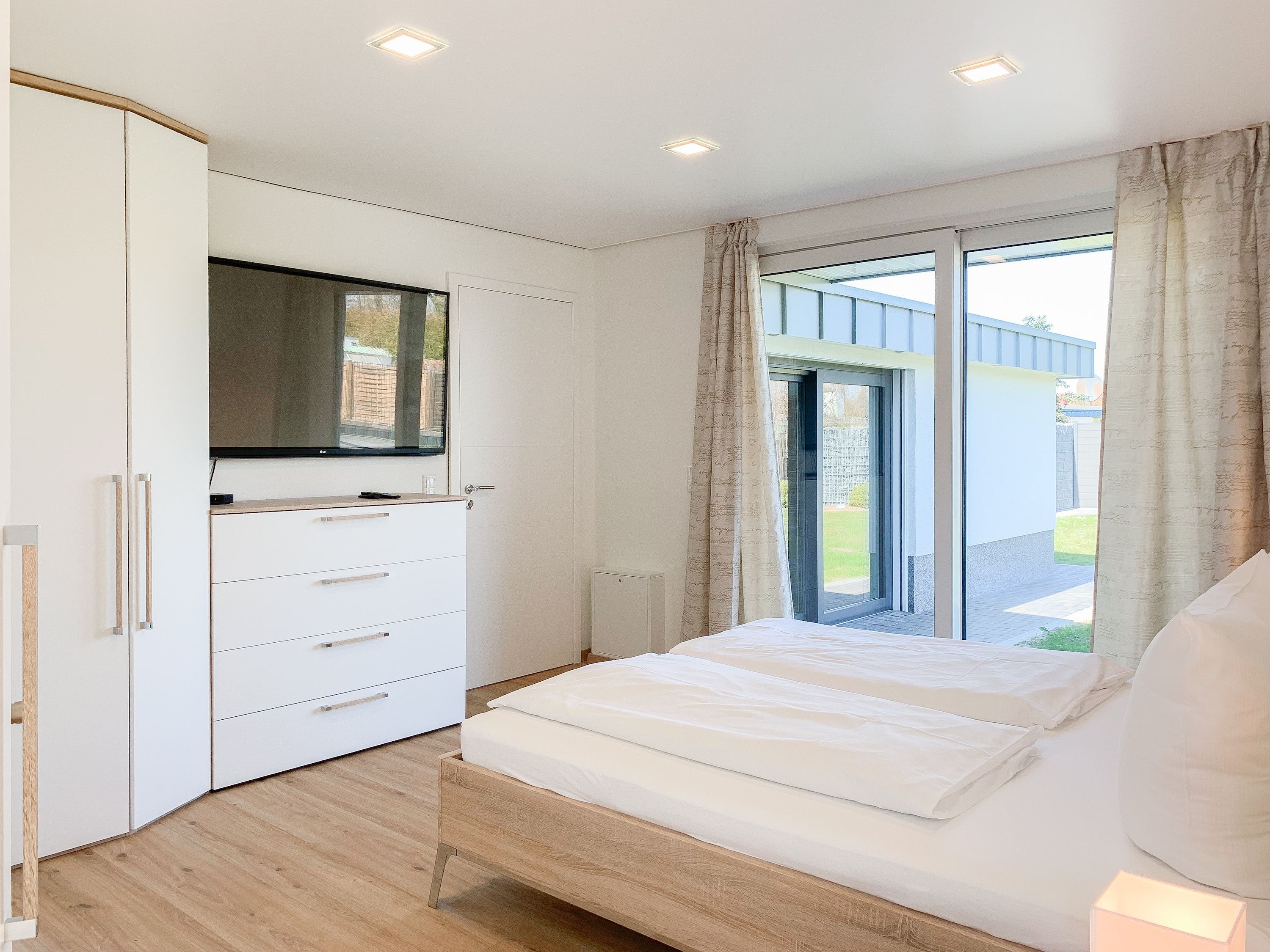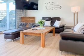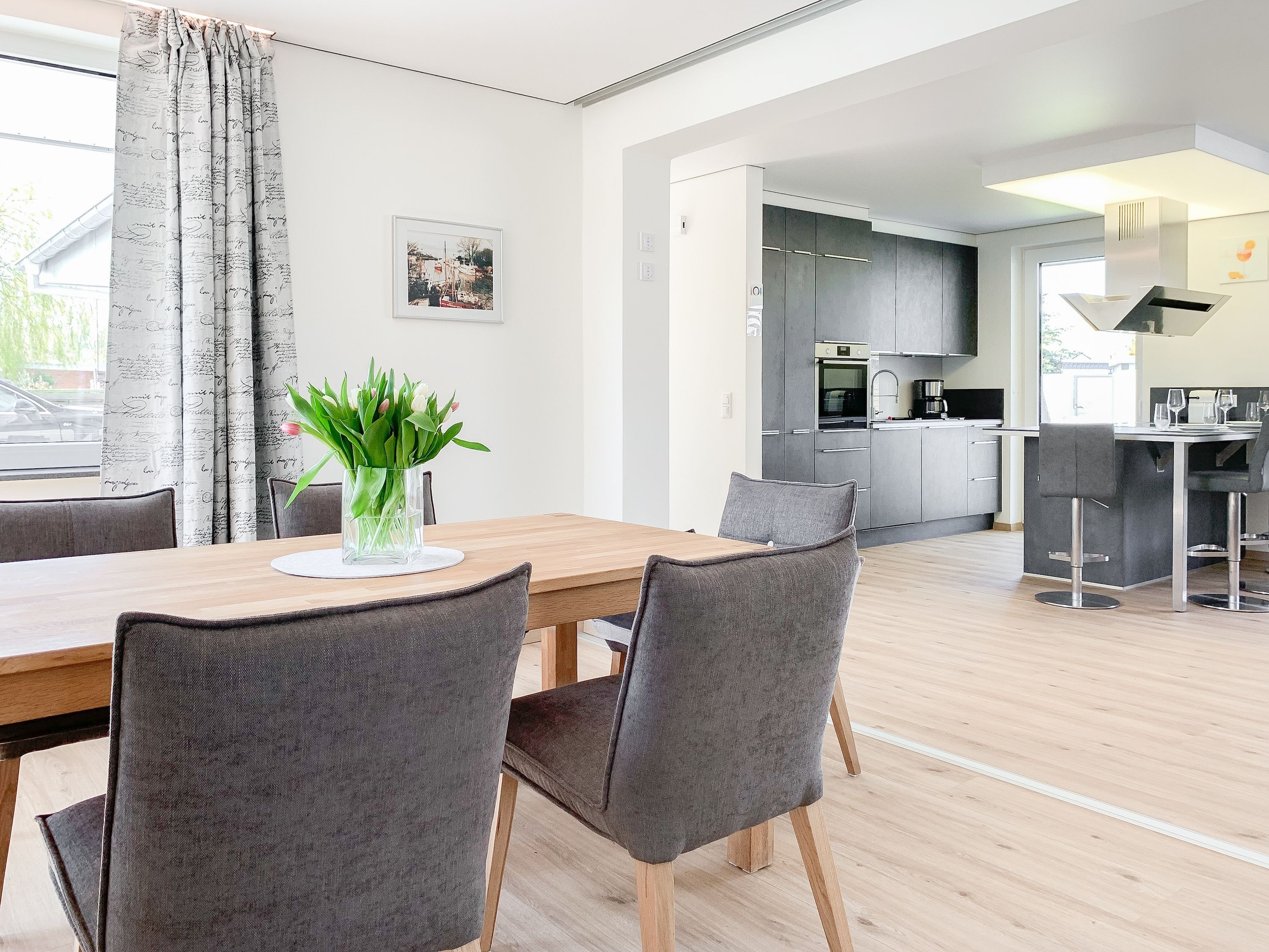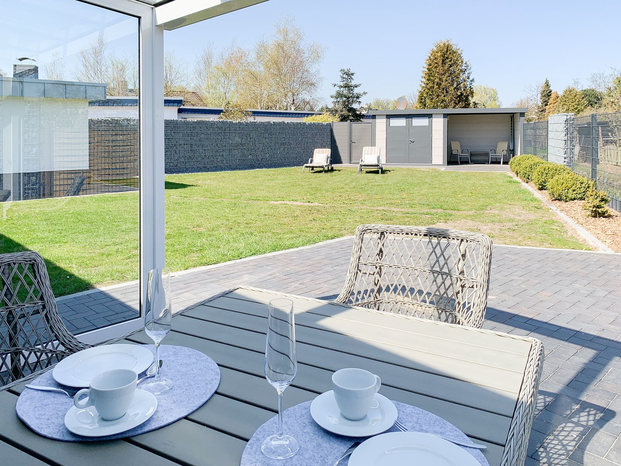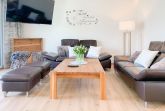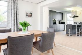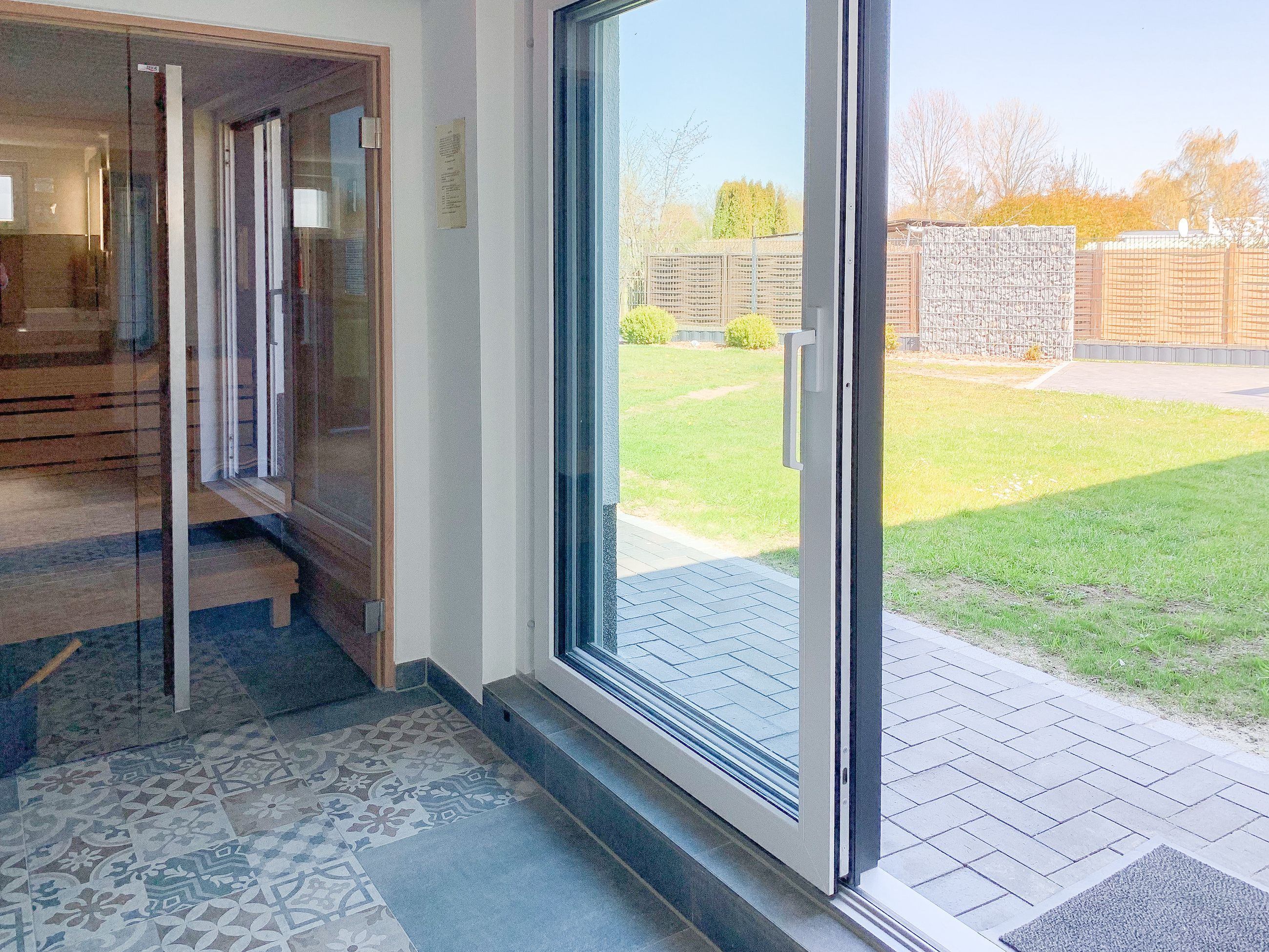 Das Ferienhaus Wolke 7 bietet auf 130 qm zeitgemäßen Luxus auf einer Ebene. Die hochwertige Ausstattung, das großzügige, umzäunte Gartengrundstück und der traumhafte Wellnessbereich mit großer Sauna und Gartenzugang, machen das Haus zu etwas Besonderem. Es gibt zwei geräumige Schlafzimmer mit Doppelbetten, TV, Gartenzugang und zwei Duschbädern ensuite. In einem der Bäder ist der Saunabereich integriert. Es stehen zwei Zustellbetten und ein weiteres Bad mit Badewanne und integriertem Waschtrockner zur Verfügung. Mittelpunkt des Hauses bildet die top ausgestattete, großzügig angelegte Küche mit Kochinsel, Barbereich und direktem Gartenzugang. Der anschließende Wohnbereich mit vorgelagerter Terrasse und offenem Wintergarten ist ebenfalls äußerst geräumig und mit einem XXL TV und einer Bluetooth Anlage ausgestattet. WLAN steht selbstverständlich zur kostenlosen Nutzung zur Verfügung. Der Essbereich bietet ausreichend Platz für 6 Personen und läßt sich mittels zweier Schiebetüren vom Wohnbereich trennen und bietet somit eine weitere Möglichkeit zur Unterbringung der Zustellbetten.