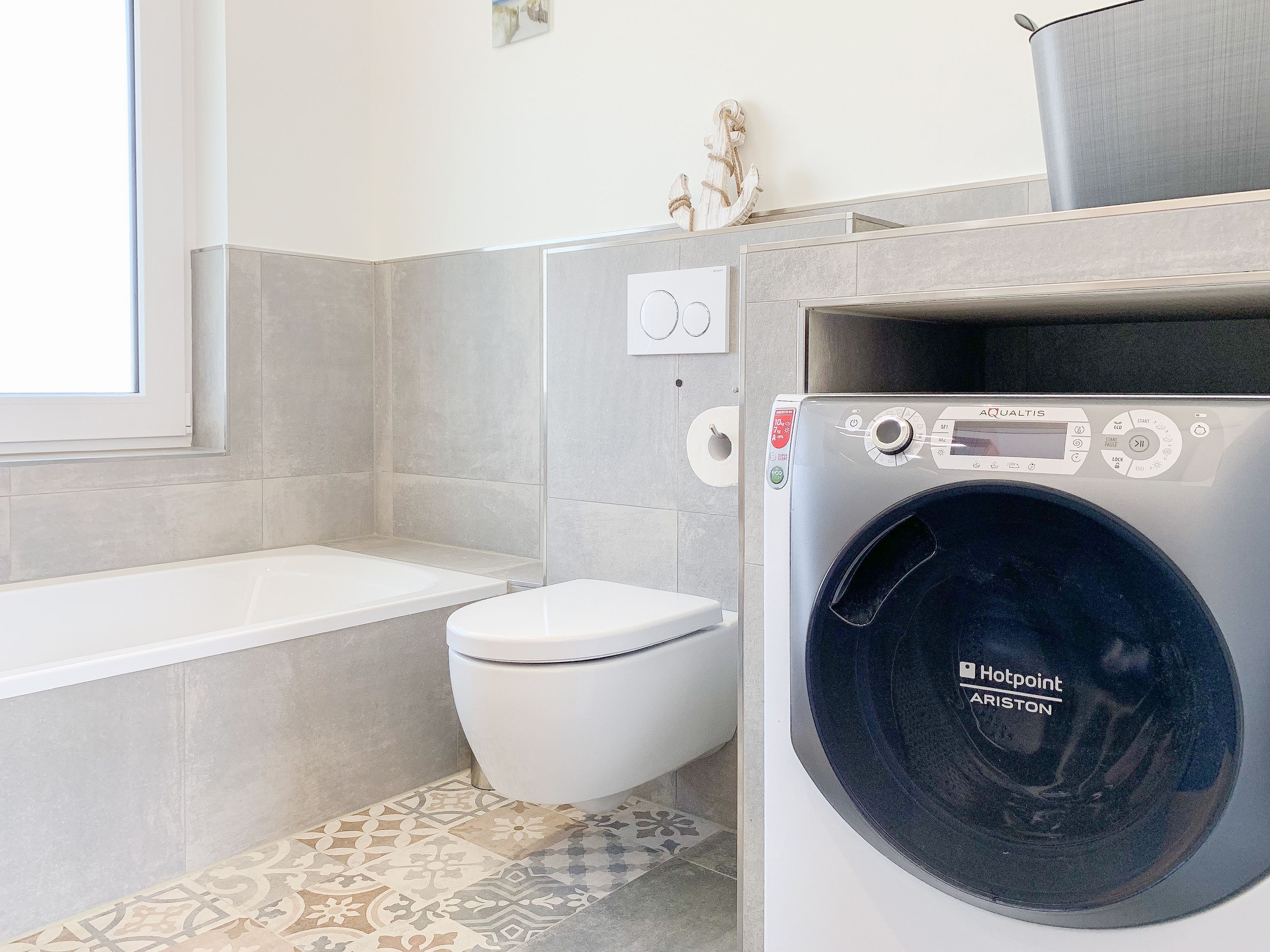 Der weitläufige Außenbereich ist mit Gartenmöbeln und Sonnenliegen ausgestattet. Fahrräder können sicher und trocken auf dem Grundstück abgestellt werden. Zwei Parkplätze sind vorhanden.
