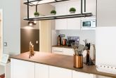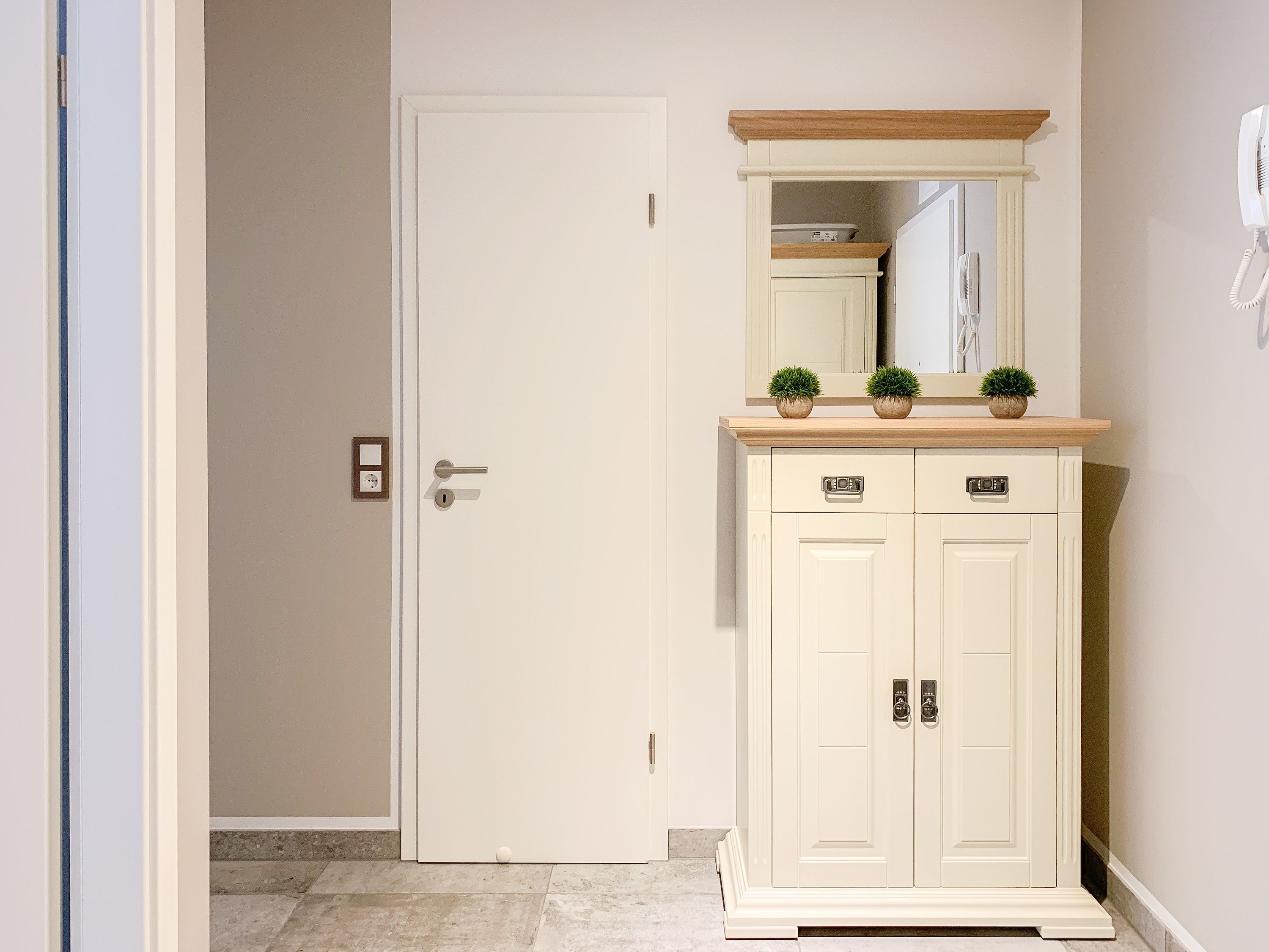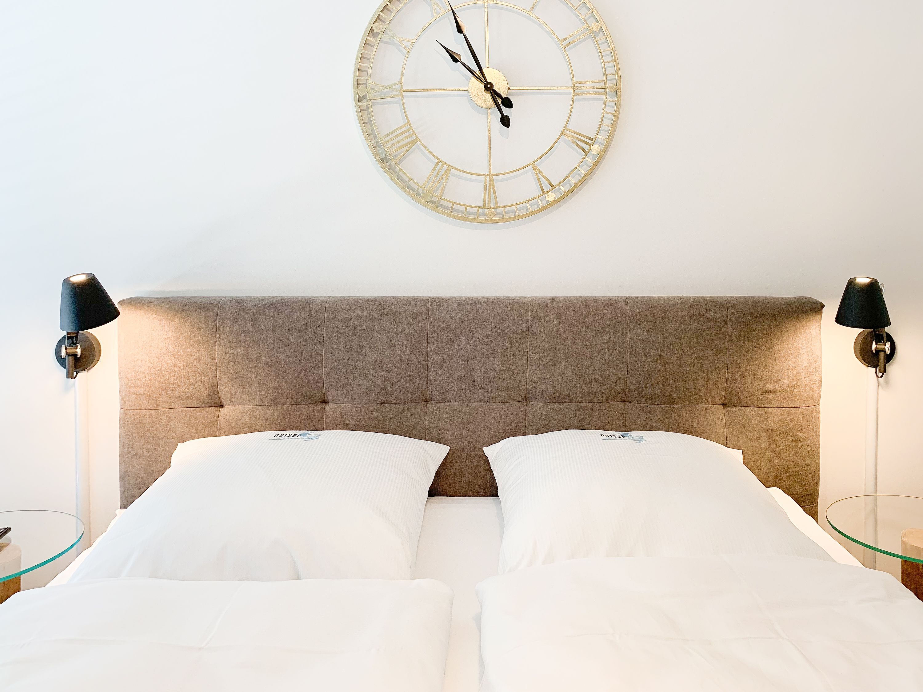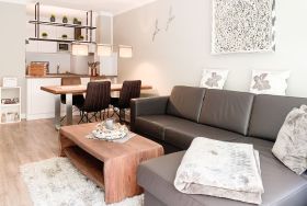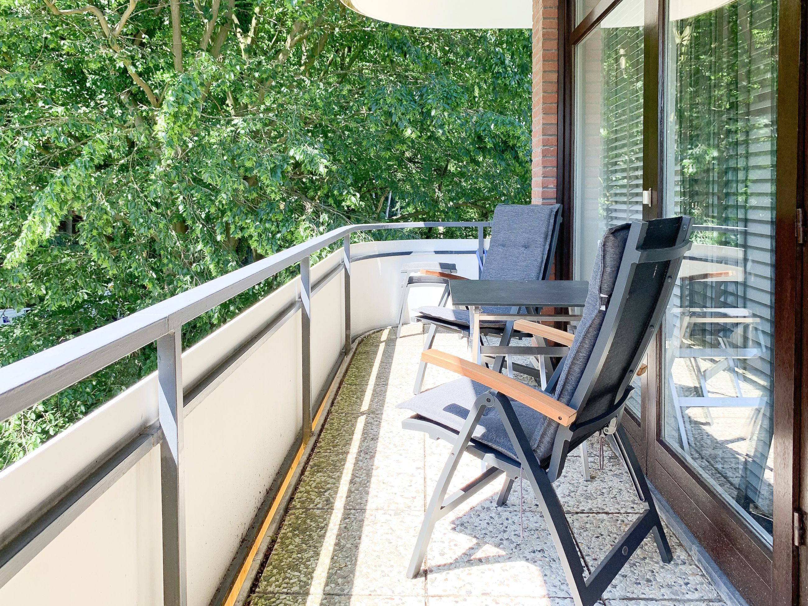 Die äußerst hochwertige Einrichtung mit Liebe zum Detail und die moderne, bestens ausgestattete Einbauküche schaffen ein zeitgemäßes Wohnambiente. Der großzügig angelegte Südbalkon erstreckt sich über die gesamte Breite der Wohnung und ist neben Gartenmöbeln und Sonnenliege auch mit einem Strandkorb ausgestattet. Ein idealer Rückzugsort zu jeder Tageszeit. Der Wohnbereich ist mit einem komfortablen Schlafsofa, WLAN und TV ausgestattet, der integrierte Essbereich bietet ausreichend Platz für 4 Personen. Das Schlafzimmer ist mit einem hochwertigen Boxspringbett (180x200), einem weiteren TV und Innenjalousien zur Abdunkelung ausgestattet. In dem modernen, neuen Duschbad mit Doppelwaschbecken und bodentiefer Dusche ist eine Waschmaschine untergebracht.