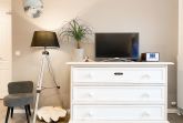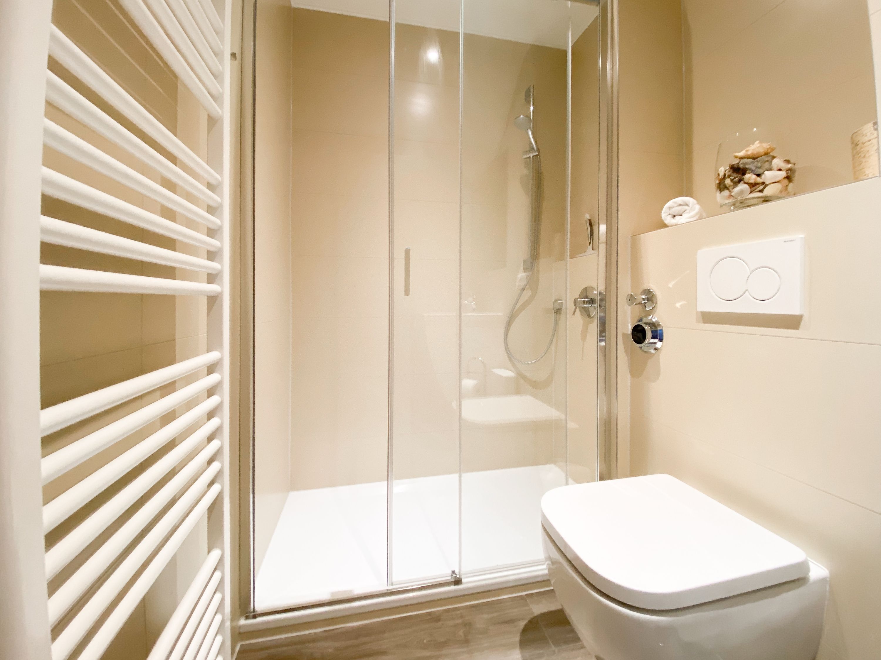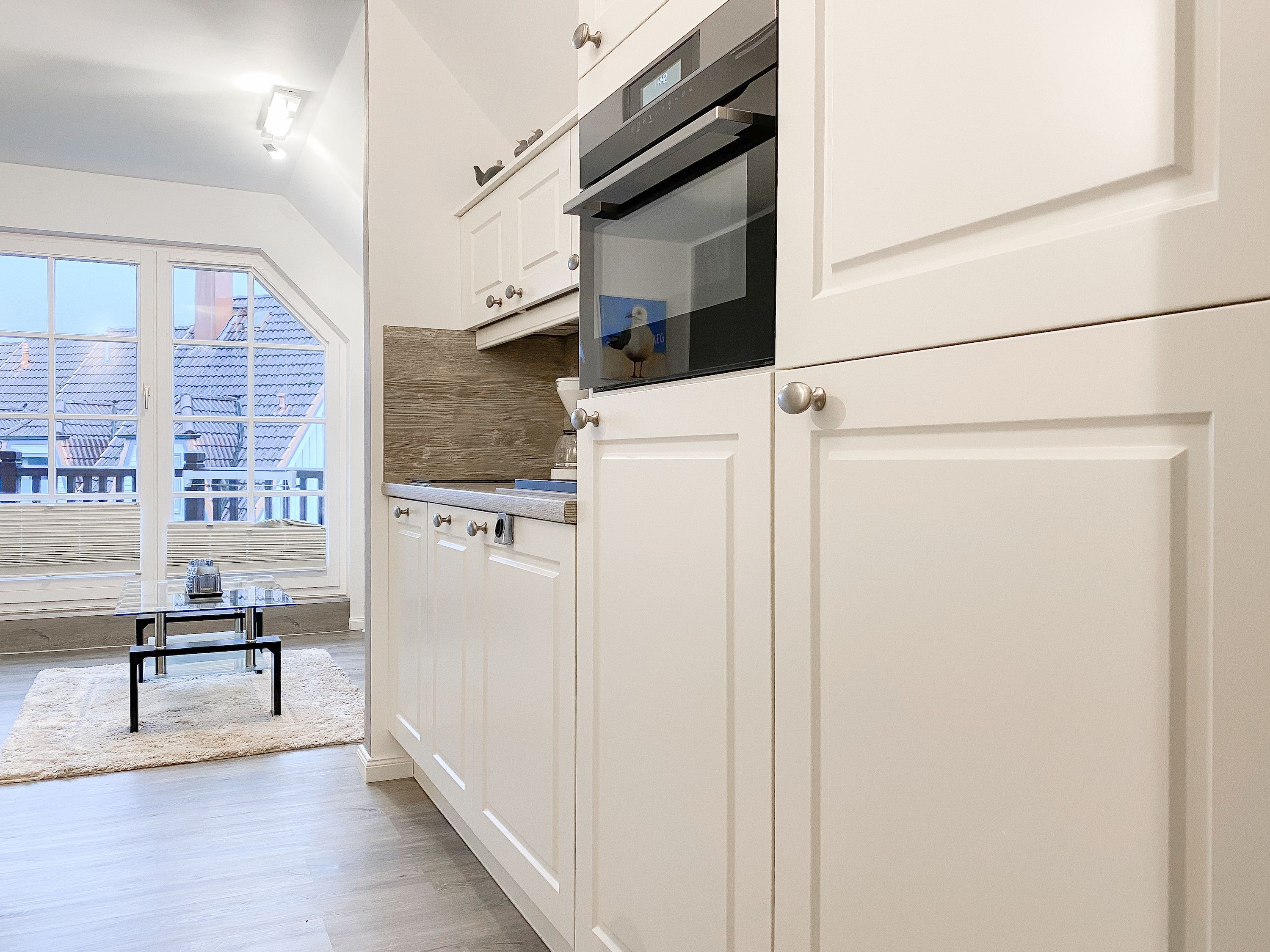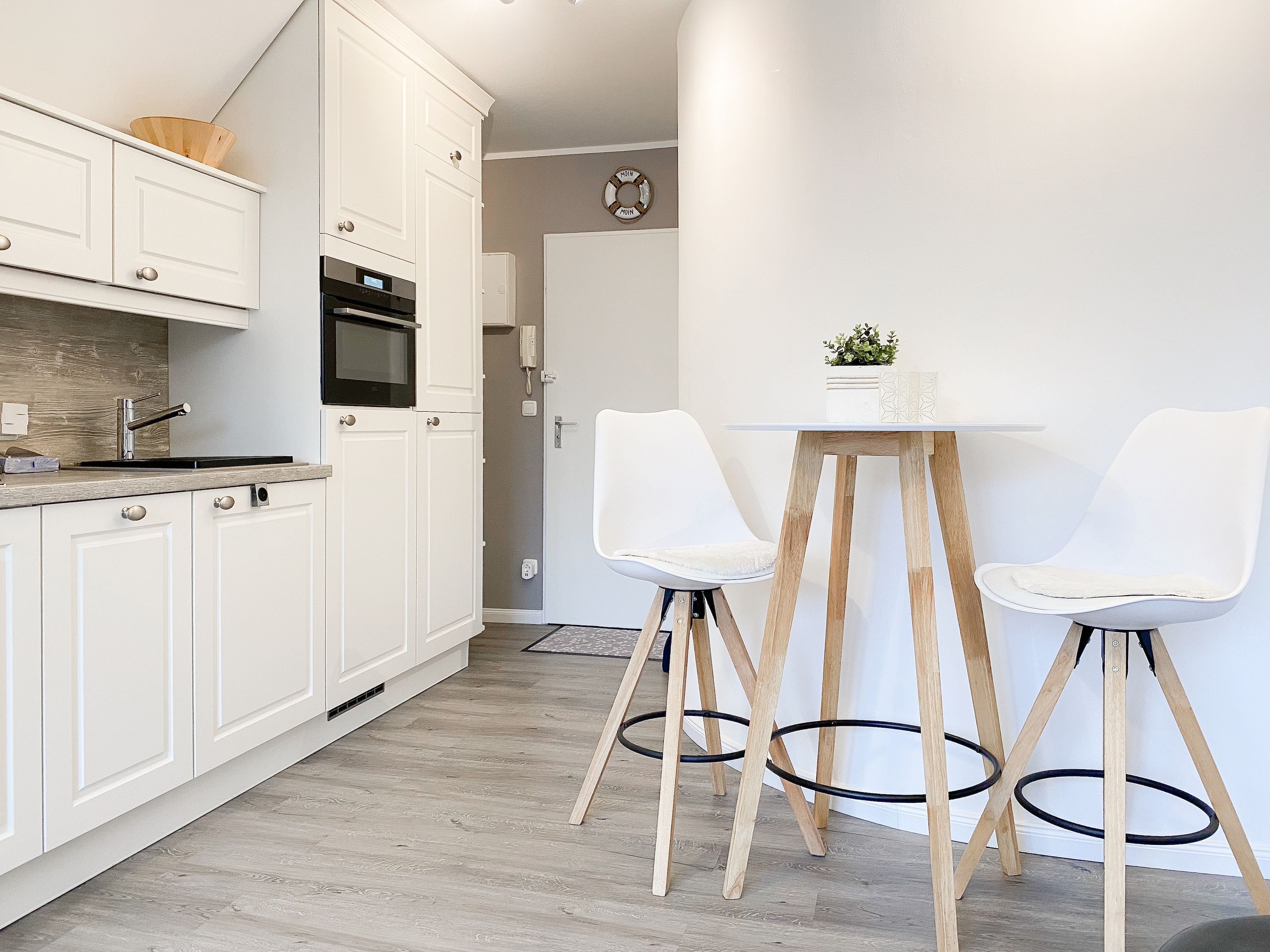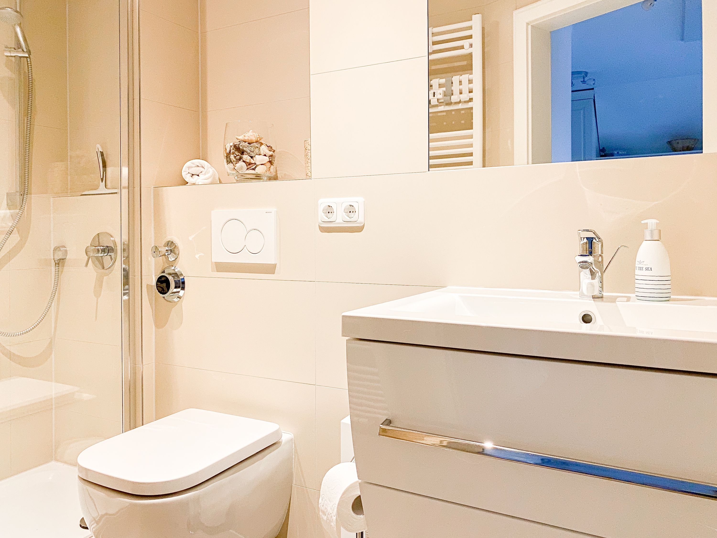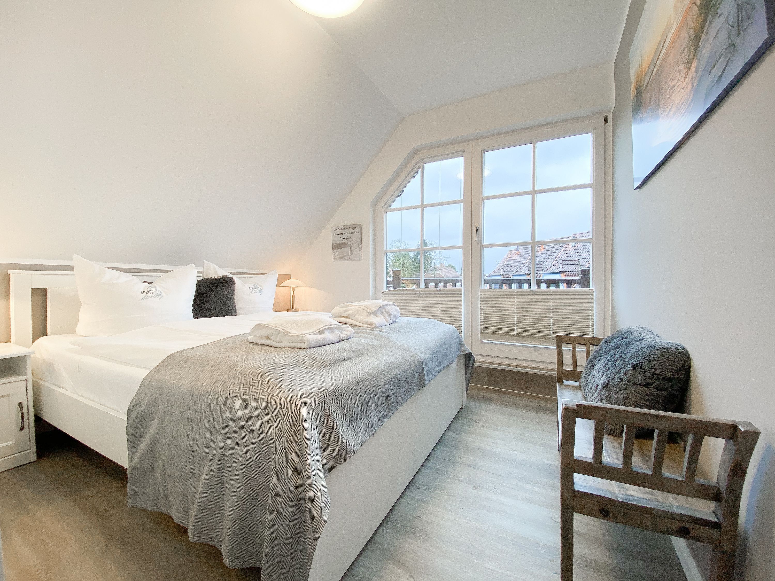 Die aufwendig renovierte und hochwertig ausgestattete Ferienwohnung bietet einen offenen Wohn- Essbereich mit Zugang zum möblierten Balkon. Hier können Sie bereits die ersten Sonnenstrahlen des Tages bei einer Tasse Kaffee genießen. Große Fensterelemente lassen viel Tageslicht in die Räume und liebevoll ausgesuchte Dekorationselemente sorgen für eine maritime Wohnatmosphäre. Die integrierte, neue Einbauküche ist hochwertig und bestens ausgerüstet. Das separate Schlafzimmer verfügt ebenfalls über einen Balkonzugang und ist mit einem Doppelbett, einem Kleiderschrank und Verdunkelungsplissees ausgestattet. Hier können Sie nach einem ereignisreichen Urlaubstag perfekt zur Ruhe kommen und ausgeruht in den neuen Tag starten. Das neue, moderne Bad verfügt über eine bodentiefe Dusche und einen Handtuchwärmer. TV, Radio und WLAN stehen selbstverständlich zur Verfügung, ebenso ein fester PKW Stellplatz direkt vor dem Haus. Fahrräder können trocken im Keller abgestellt werden.