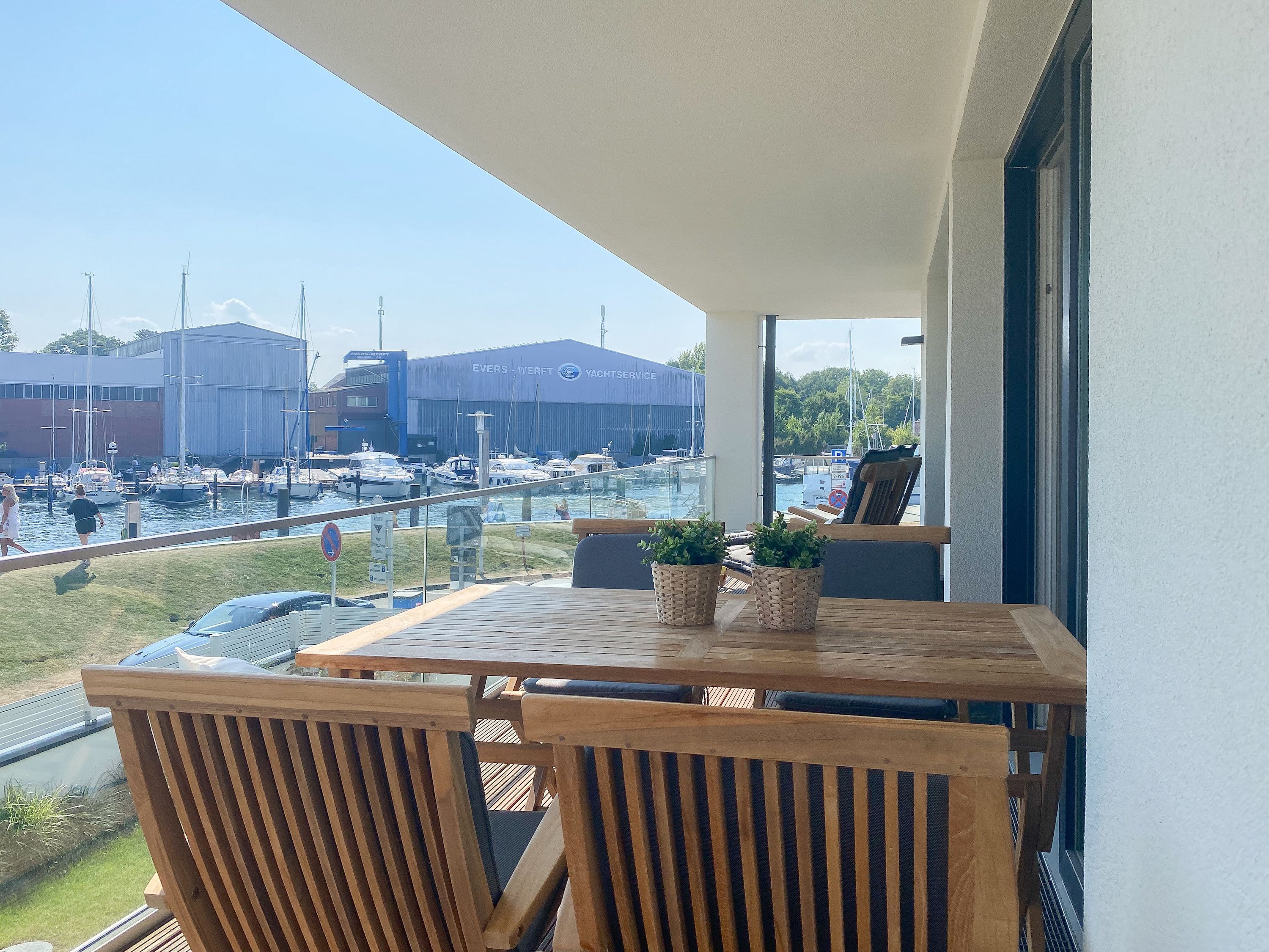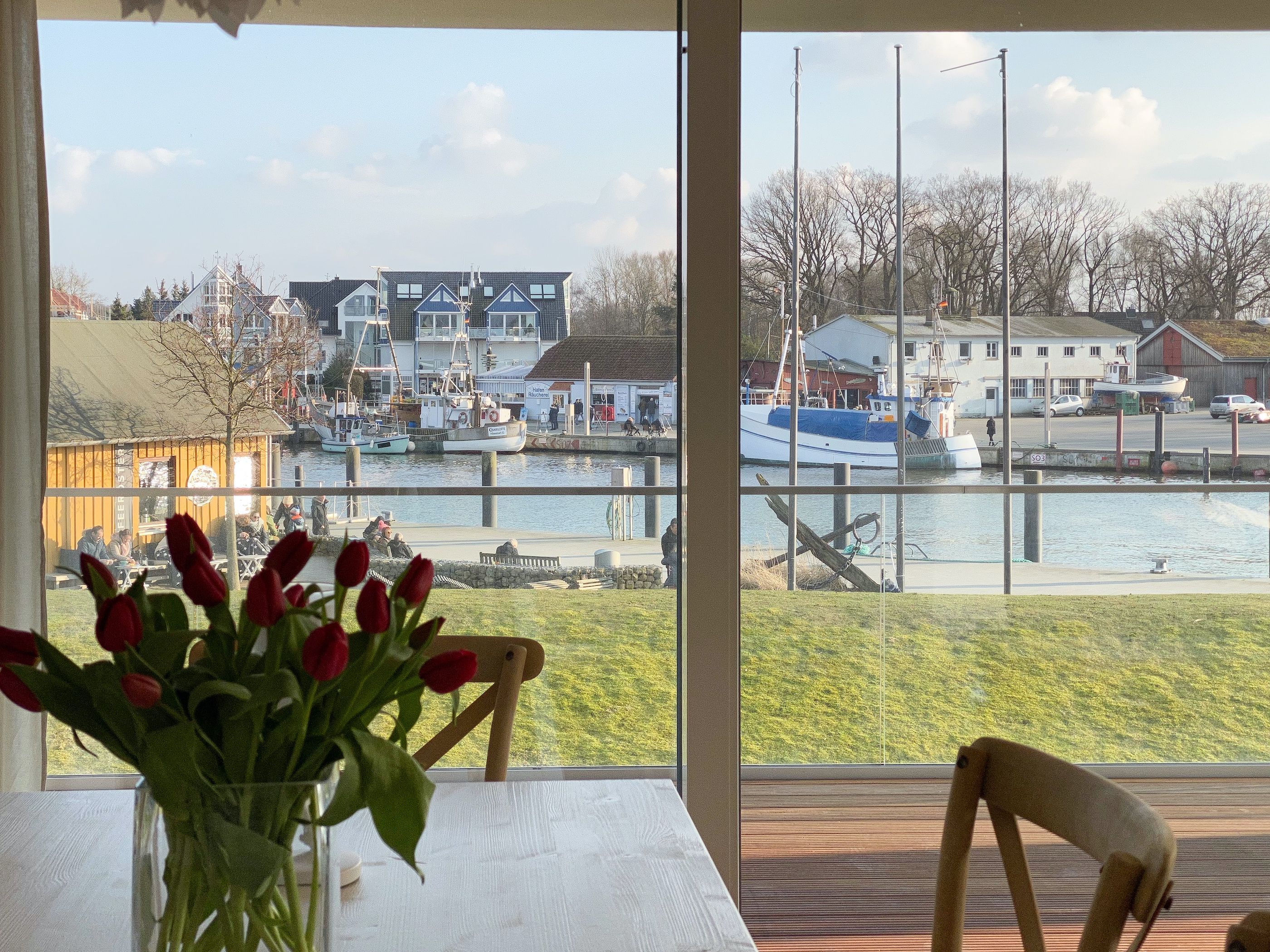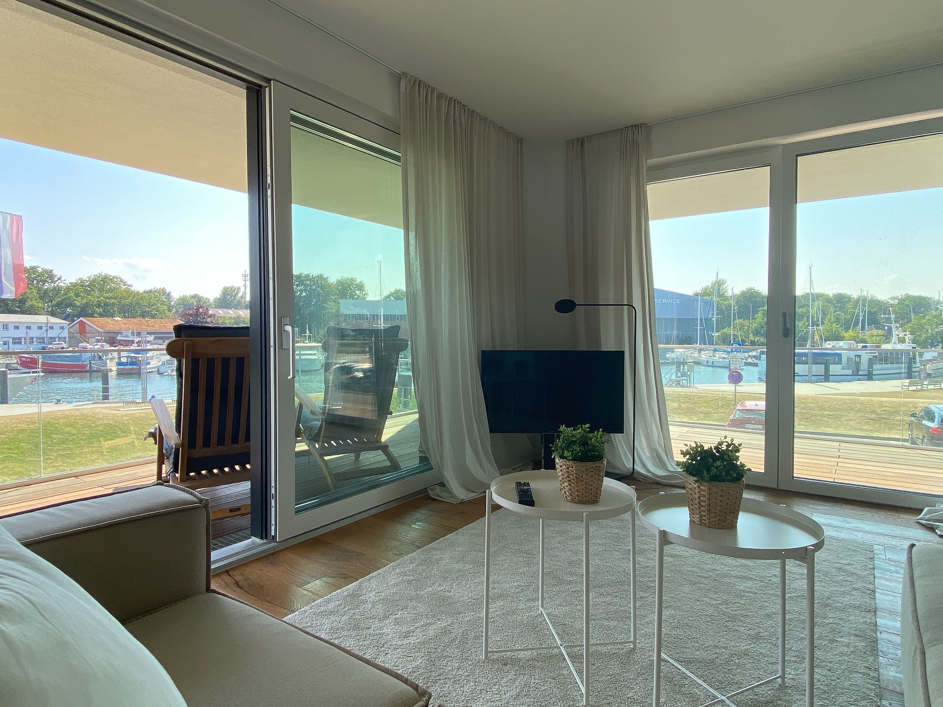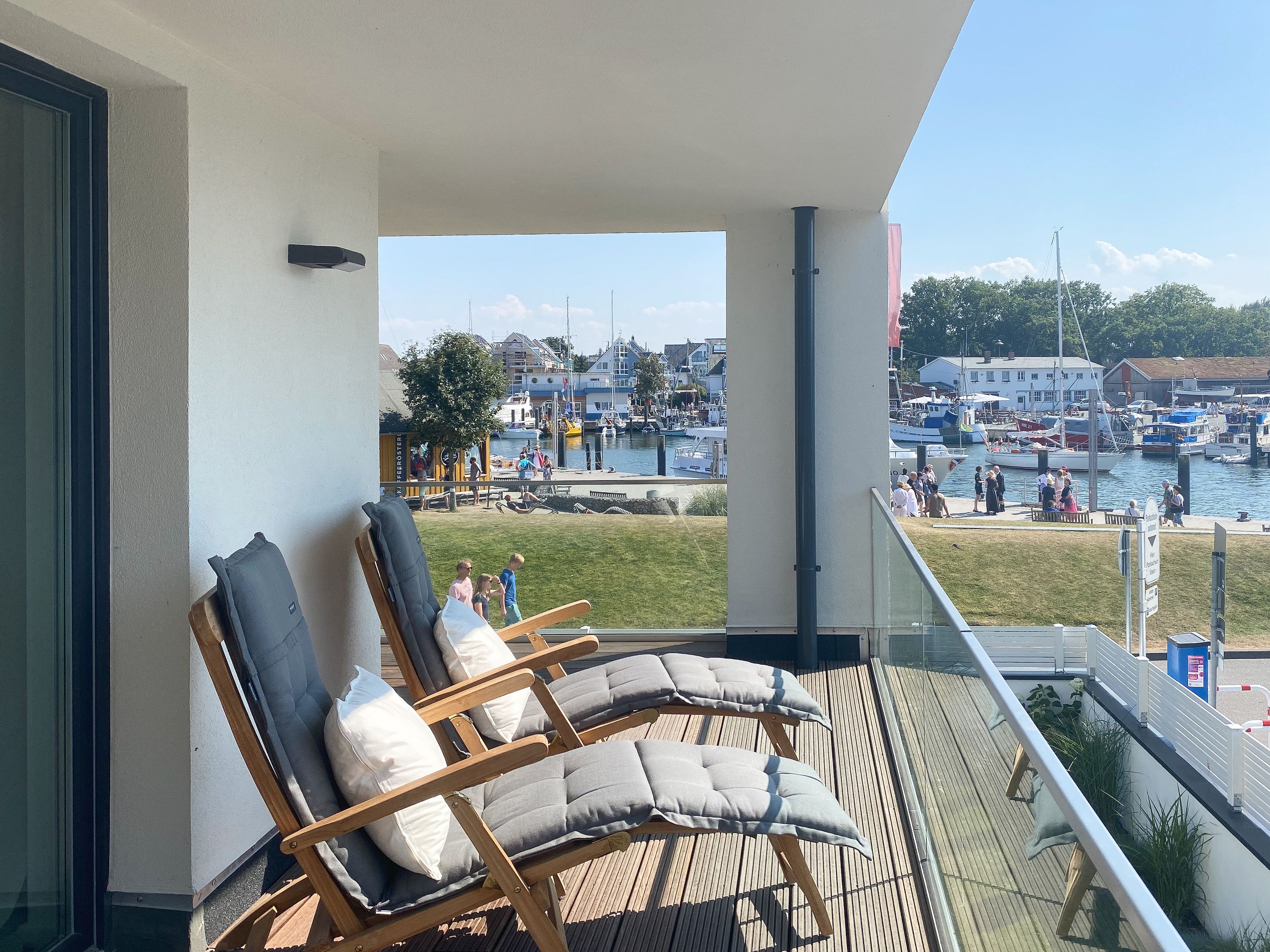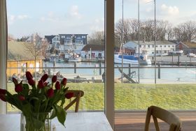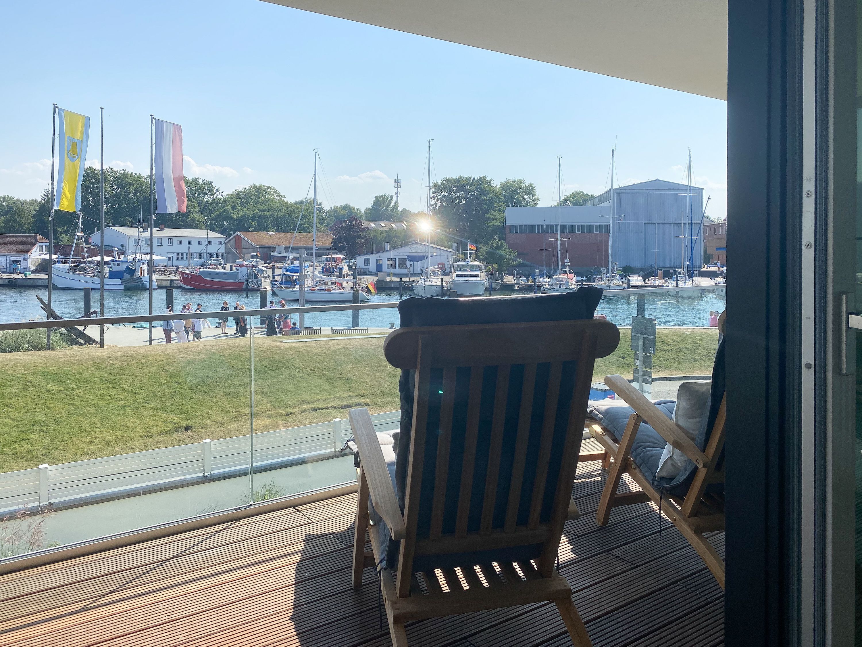 Diese einzigartige Ferienwohnung liegt im 1. Obergeschoss eines modernen Neubaus mit nur 3 Wohneinheiten und bietet auf 100 qm Wohnfläche mit 2 Schlafzimmern und 2 separaten Bädern jeglichen Komfort für 4 Personen. Das Herzstück der Wohnung bildet der stilvoll eingerichtete Wohn- und Essbereich mit riesigen Fensterelementen und einem phantastischen Ausblick auf die Ostsee und die ein- und ausfahrenden Schiffe vom Fischkutter bis zur Motoryacht. Echtholzböden und Fußbodenheizung sorgen für ein angenehmes Raumklima. Der großzügig angelegte Sonnenbalkon ist überdacht und sowohl zum Süden als auch zum Westen ausgerichtet. Genießen Sie die Sonne von früh bis spät, die einzigartige Hafenatmosphäre und beeindruckende Sonnenuntergänge bei einem Glas Wein.