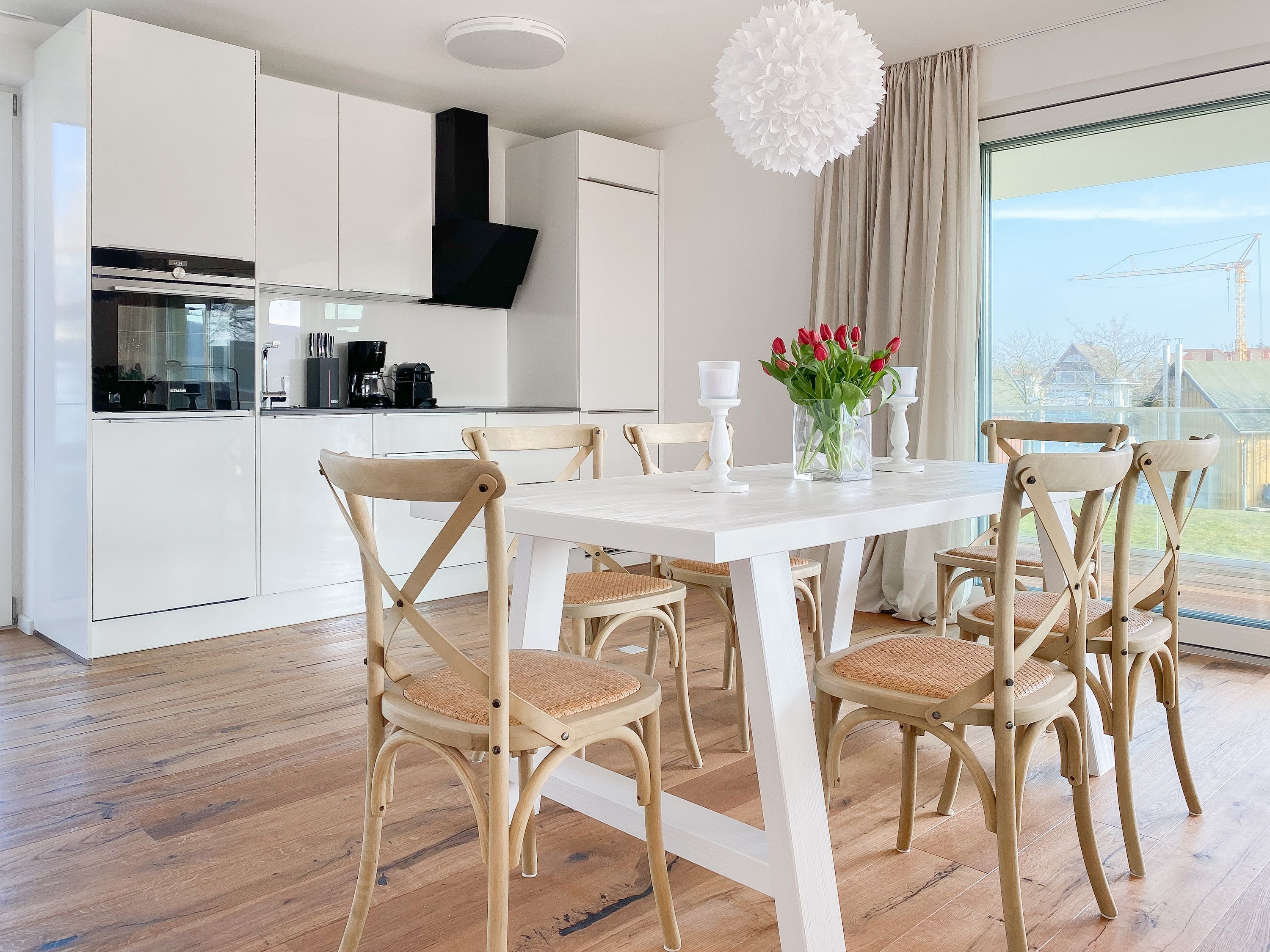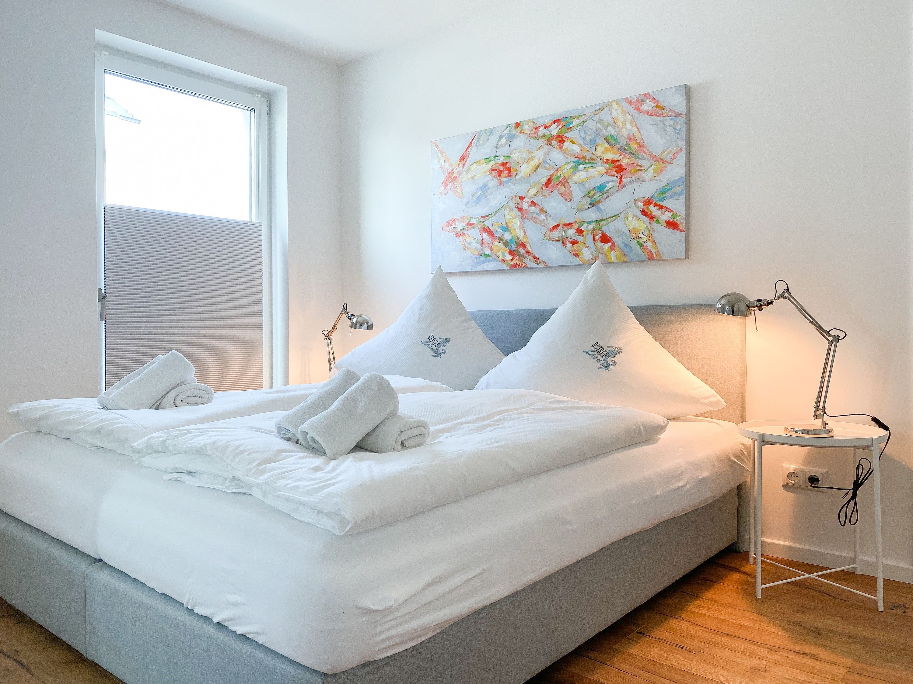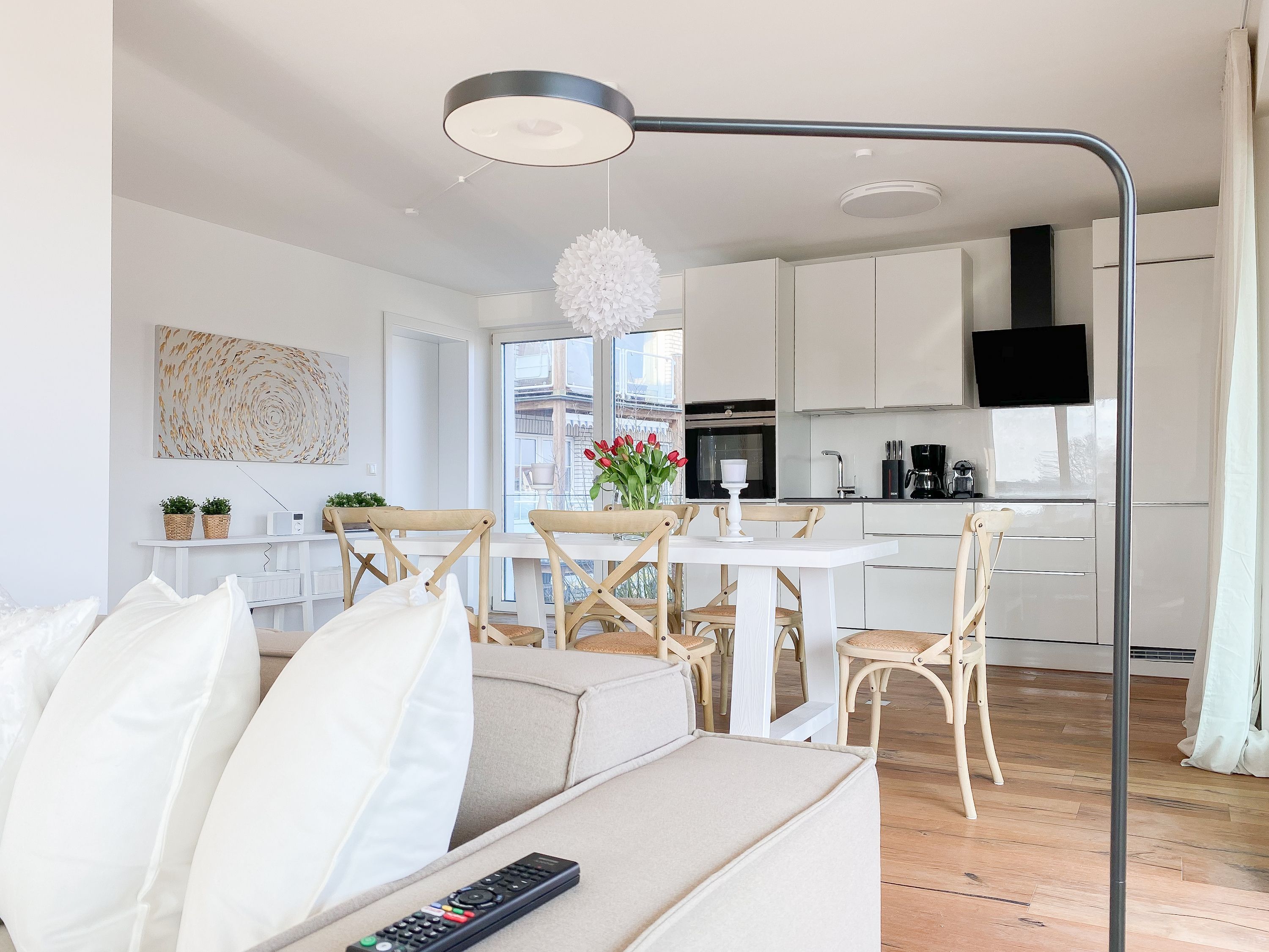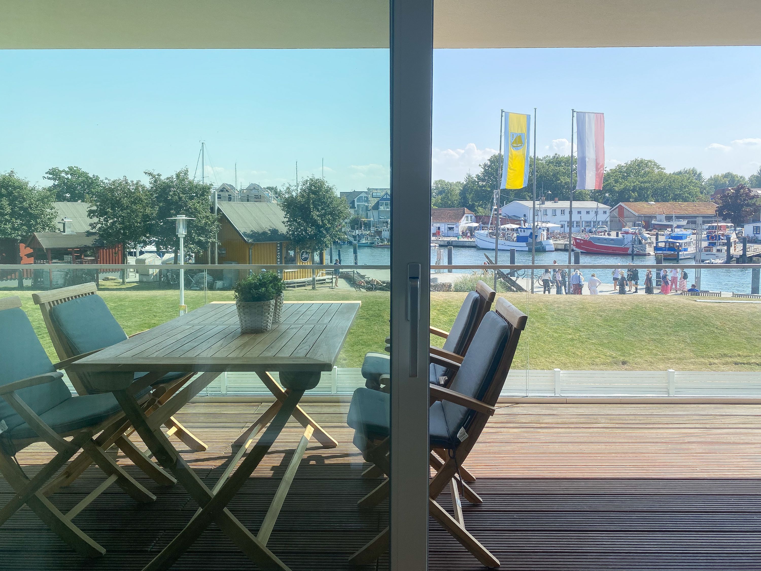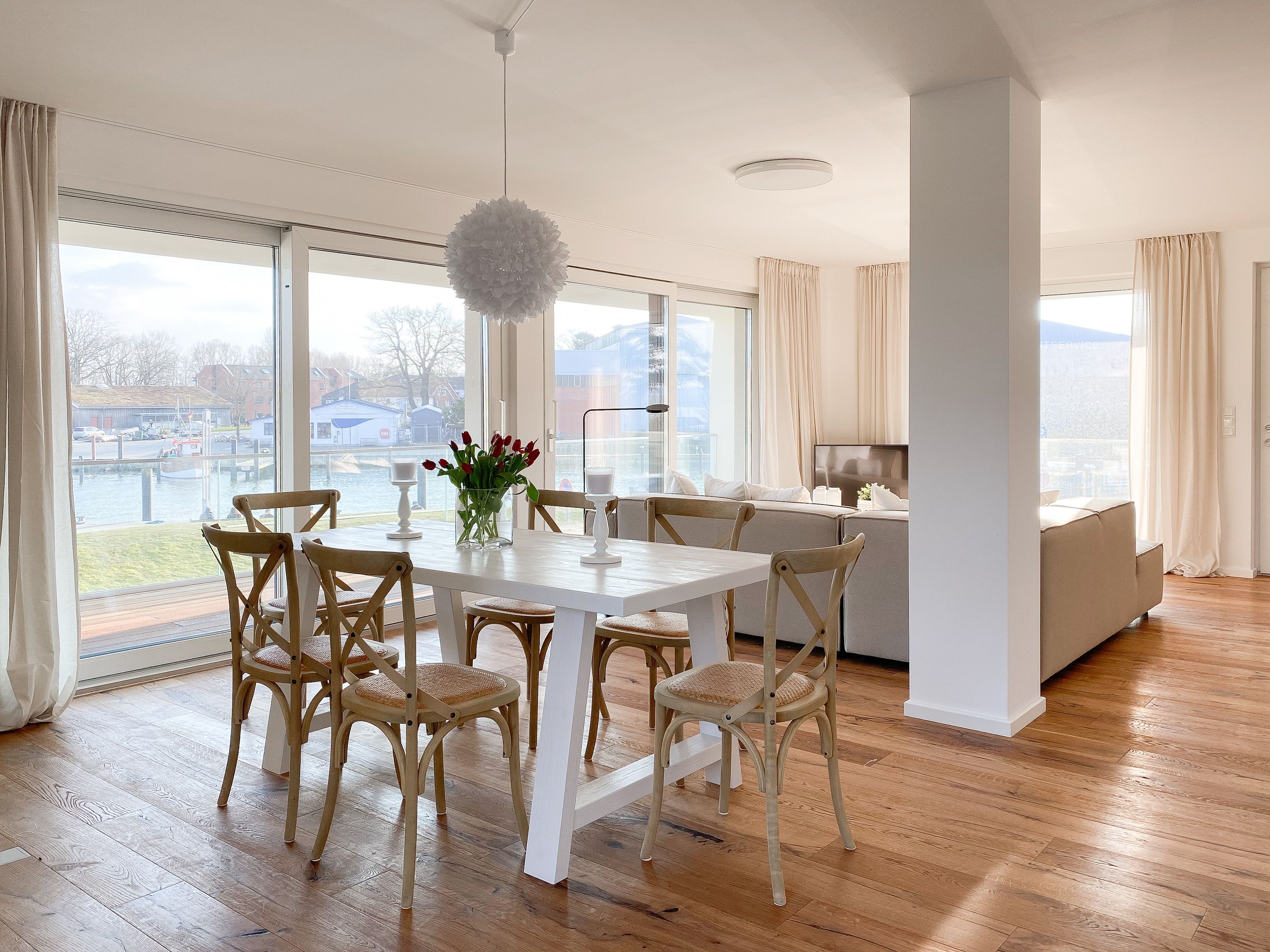 Diese einzigartige Ferienwohnung liegt im 1. Obergeschoss eines modernen Neubaus mit nur 3 Wohneinheiten und bietet auf 100 qm Wohnfläche mit 2 Schlafzimmern und 2 separaten Bädern jeglichen Komfort für 4 Personen. Das Herzstück der Wohnung bildet der stilvoll eingerichtete Wohn- und Essbereich mit riesigen Fensterelementen und einem phantastischen Ausblick auf die Ostsee und die ein- und ausfahrenden Schiffe vom Fischkutter bis zur Motoryacht. Echtholzböden und Fußbodenheizung sorgen für ein angenehmes Raumklima. Der großzügig angelegte Sonnenbalkon ist überdacht und sowohl zum Süden als auch zum Westen ausgerichtet. Genießen Sie die Sonne von früh bis spät, die einzigartige Hafenatmosphäre und beeindruckende Sonnenuntergänge bei einem Glas Wein.