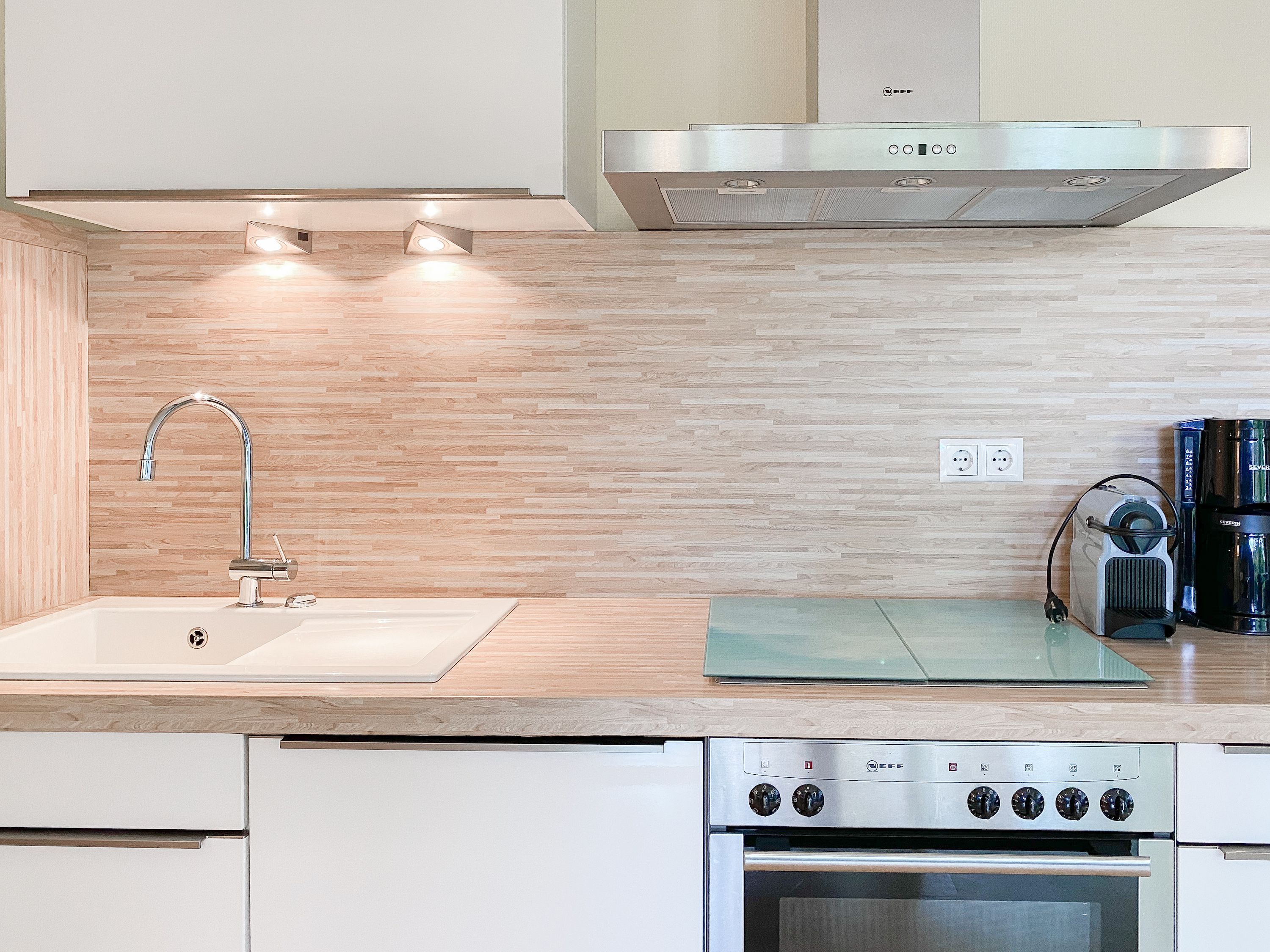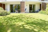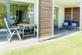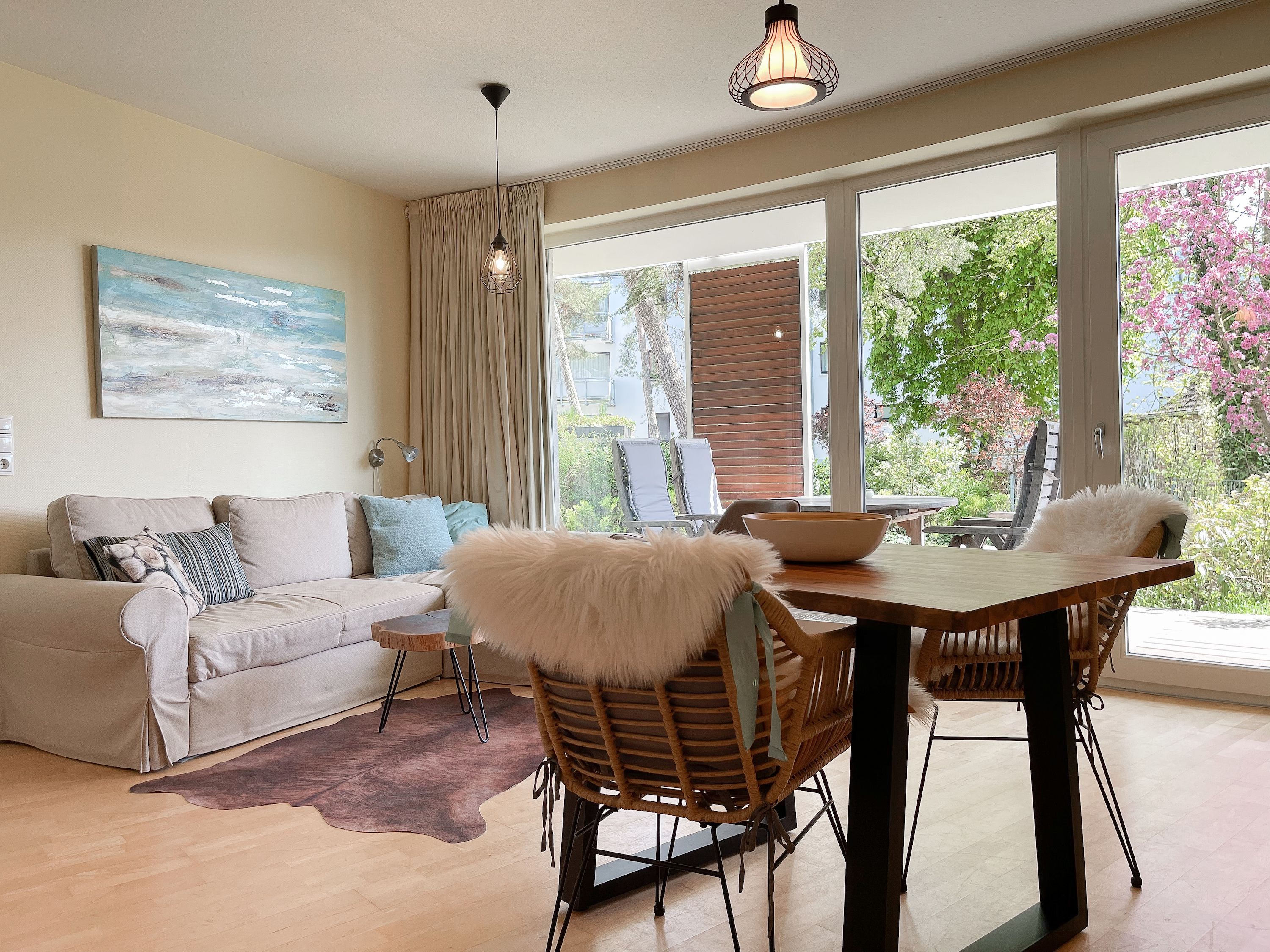 Bodentiefe Fensterflächen sorgen für helle Räumlichkeiten und die geschmackvolle Einrichtung in warmen Farben schafft eine angenehme Wohnatmosphäre. Die überdachte XXL Sonnenterrasse, die sich über die gesamte Breite der Wohnung erstreckt und mit hochwertigen Gartenmöbeln sowie Sonnenliegen ausgestattet ist,  macht diese Wohnung zu etwas Besonderem. Die angrenzende Rasenfläche kann ebenfalls genutzt werden. Im Wohnbereich erwartet Sie ein hochwertiges Sofa mit Schlaffunktion, TV, Radio und WLAN sowie ein Schreibtisch zur Erledigung wichtiger Korrespondenz. Der integrierte Essbereich ist für 3 Personen eingerichtet und die offene Einbauküche ist mit Backofen, Mikrowelle und Geschirrspüler bestens ausgestattet.  Das Schlafzimmer verfügt über ein Doppelbett (180x200), einen geräumigen Schrank und TV.  Alle Fenster sind mit Verdunkelungsvorhängen versehen. Das moderne Duschbad ist großzügig angelegt.