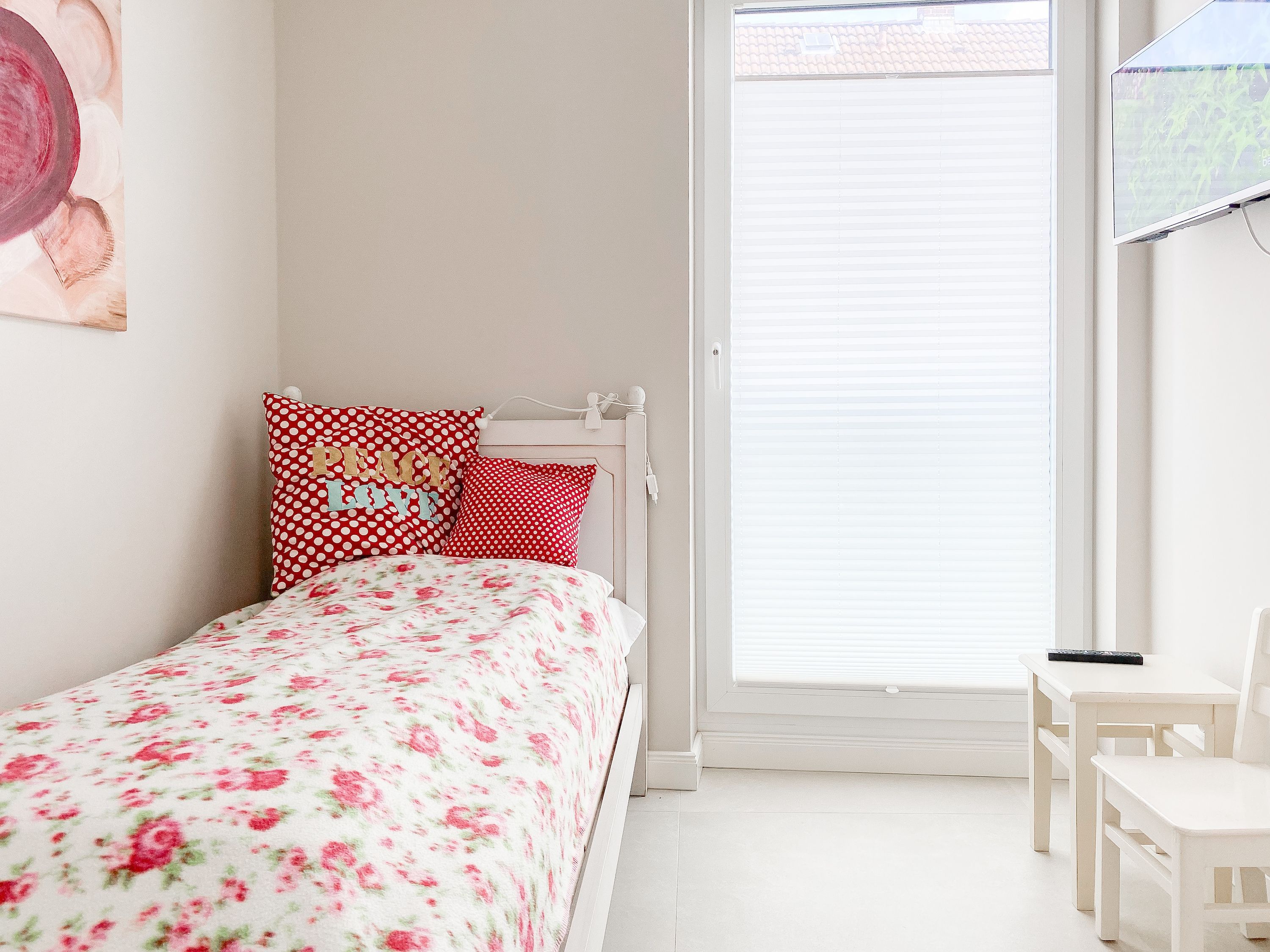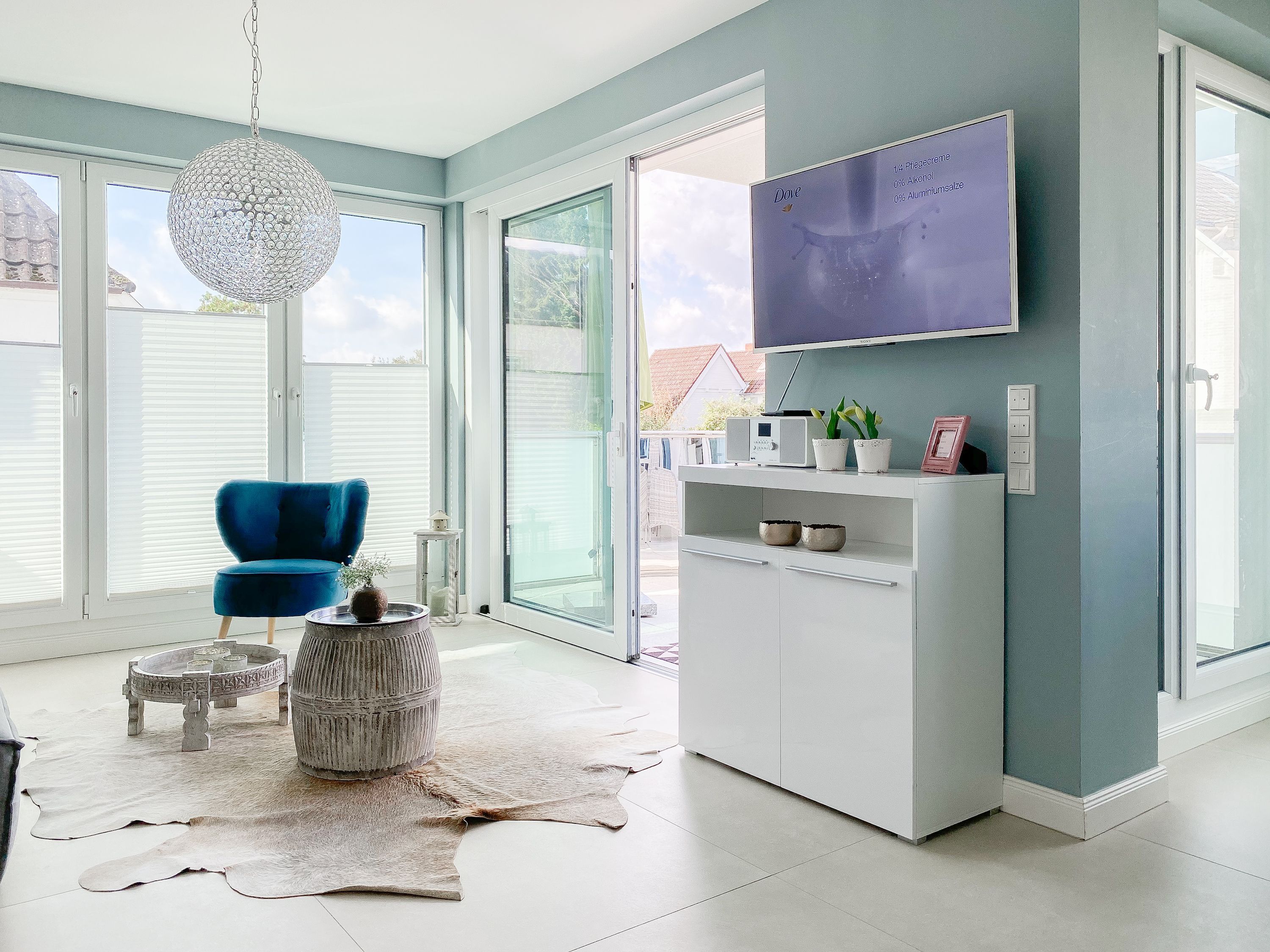 Ankommen und wohl fühlen in dieser hochwertig ausgestatteten und stilvoll eingerichteten Wohnung mit bodentiefen Fensterflächen, die für helle und sonnige Räumlichkeiten sorgen. Der Wohnbereich ist mit einem gemütlichen Sofa, TV und WLAN ausgestattet und der Essbereich bietet reichlich Platz für 4 Personen. Auf dem vorgelagerten Balkon in Westausrichtung, möbliert mit hochwertigen Gartenmöbeln, läßt sich die Sonne bis in die Abendstunden genießen. Die offene, moderne Einbauküche ist bestens ausgestattet. Es gibt 2 Schlafzimmer (1 Doppelbett und 1 Einzelbett), die beide über einen zusätzlichen TV und ausreichend Stauraum für Ihre Urlaubsgarderobe verfügen. Alle Fenster sind mit elektrischen Außenjalousien versehen. Das moderne Bad verfügt neben Dusche und Waschtisch mit viel Ablagefläche auch über eine integrierte Waschmaschine.