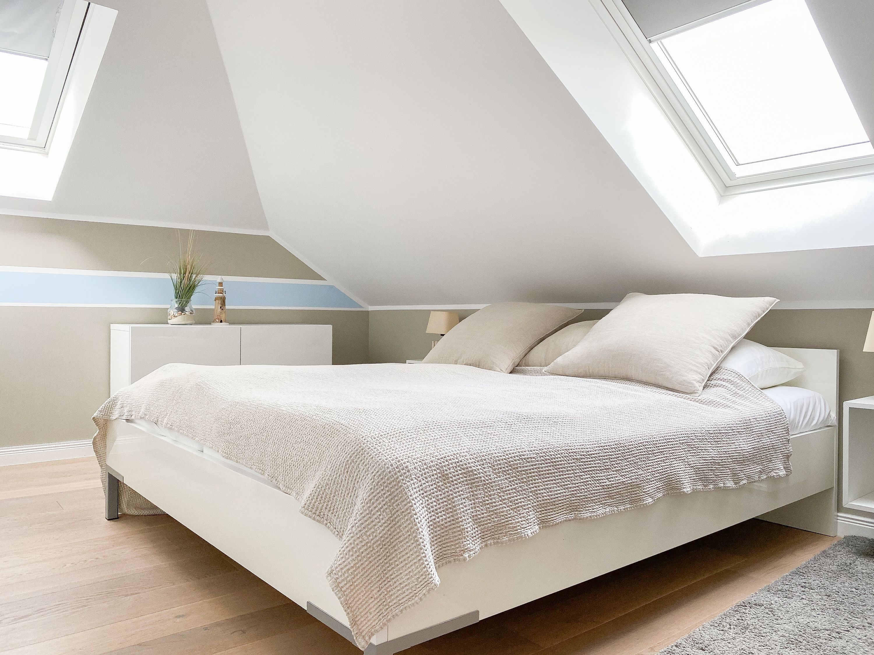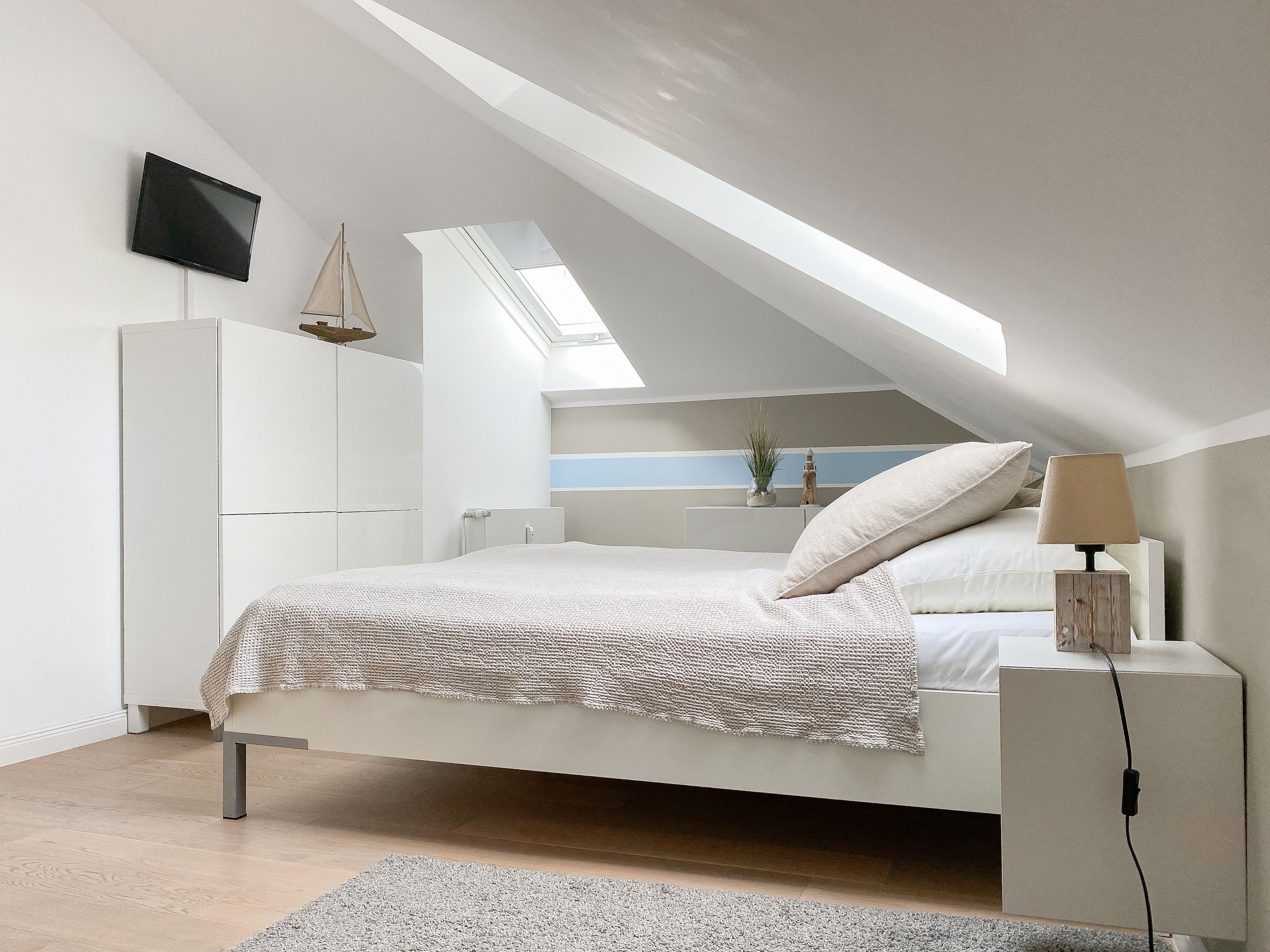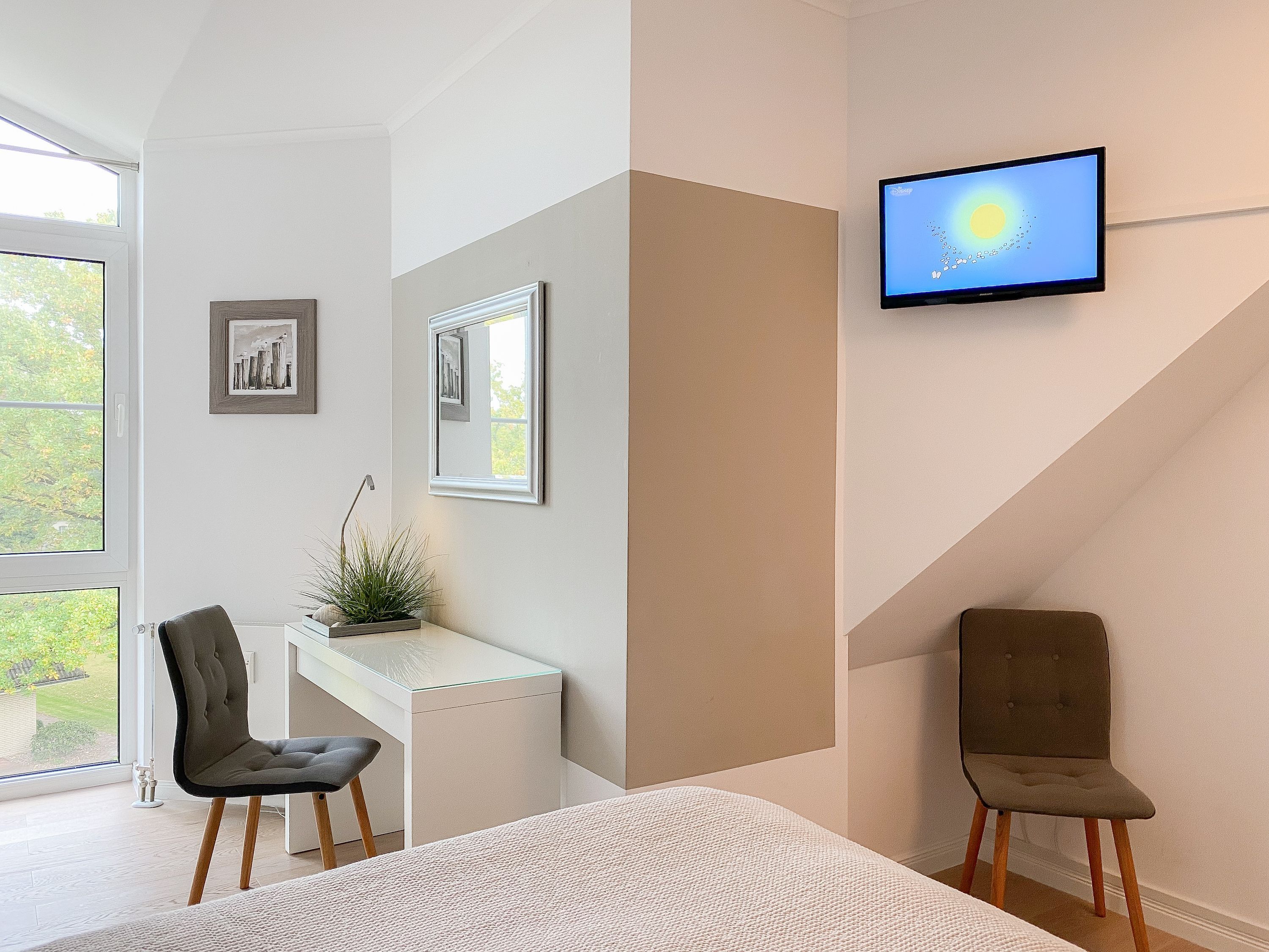 In der obersten Etage in der 4. Etage eines kernsanierten Hauses erstreckt sich die Wohnung über 2 Ebenen und bietet mit 2 separaten Schlafzimmern ausreichend Platz für 4 Personen. Echtholzböden und die geschmackvolle Einrichtung sorgen für eine Atmosphäre zum Wohlfühlen. Auf der unteren Ebene befindet sich ein gemütlicher Wohnbereich mit TV und Stereoanlage sowie ein Essbereich für 4 Personen und eine individuelle Küchenzeile mit Spülmaschine, Mikrowelle mit Grillfunktion und 2 Platten Cerankochfeld. Der vorgelagerte Sonnenbalkon ist mit einer elektrischen Markise ausgestattet. Ebenfalls auf dieser Ebene befinden sich ein modernes Duschbad und ein Schlafzimmer, ausgestattet mit einem Boxspringbett (160x200), TV und Verdunkelungsvorhängen. Das zweite Schlafzimmer erreichen Sie über eine Treppe vom Flurbereich. Es verfügt über ein Doppelbett (180x200), TV und Verdunkelungsrollos. Vom Dachfenster hat man einen schönen Blick auf die Ostsee. WLAN steht selbstverständlich zur kostenlosen Nutzung zur Verfügung.