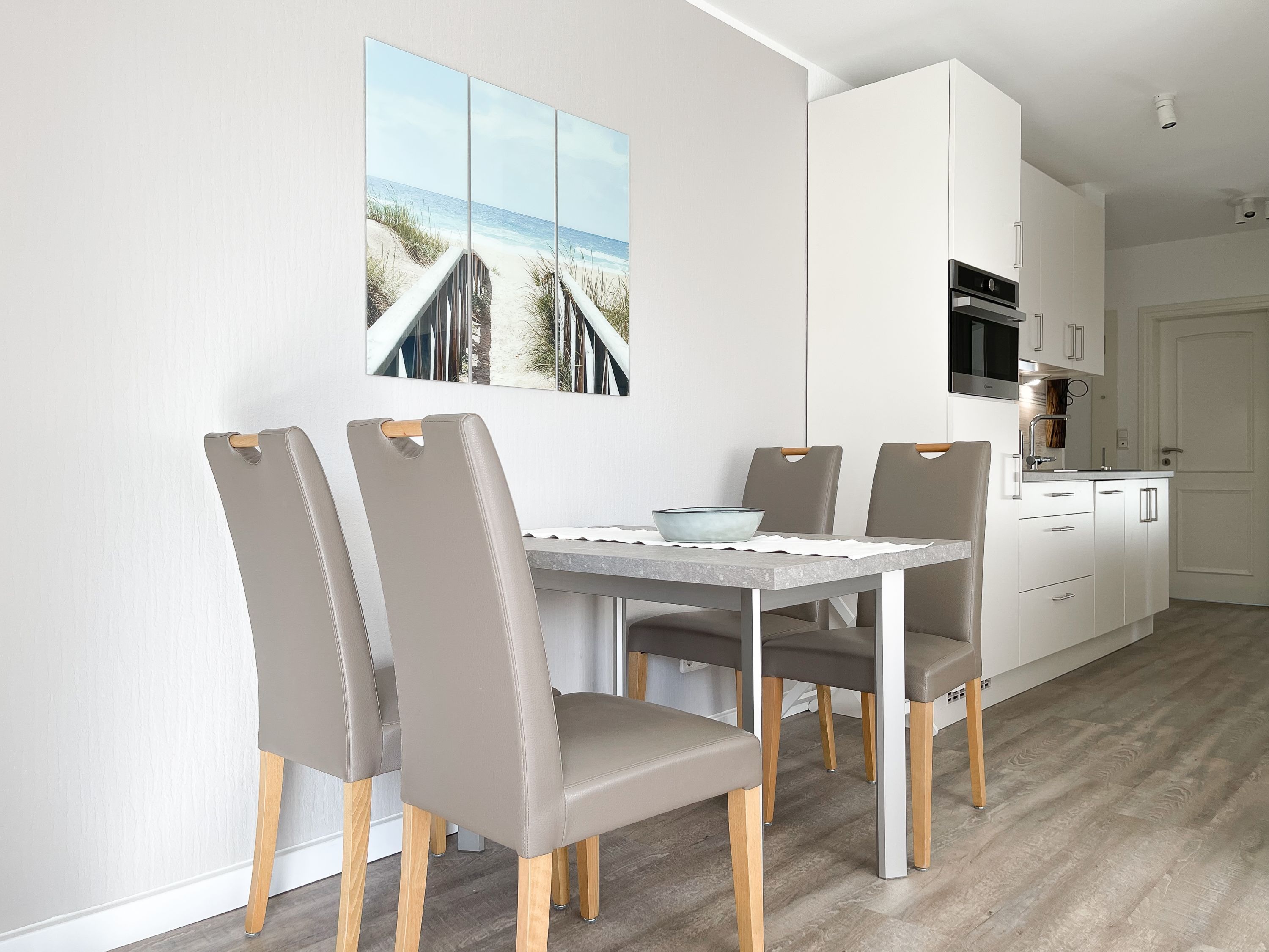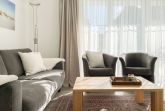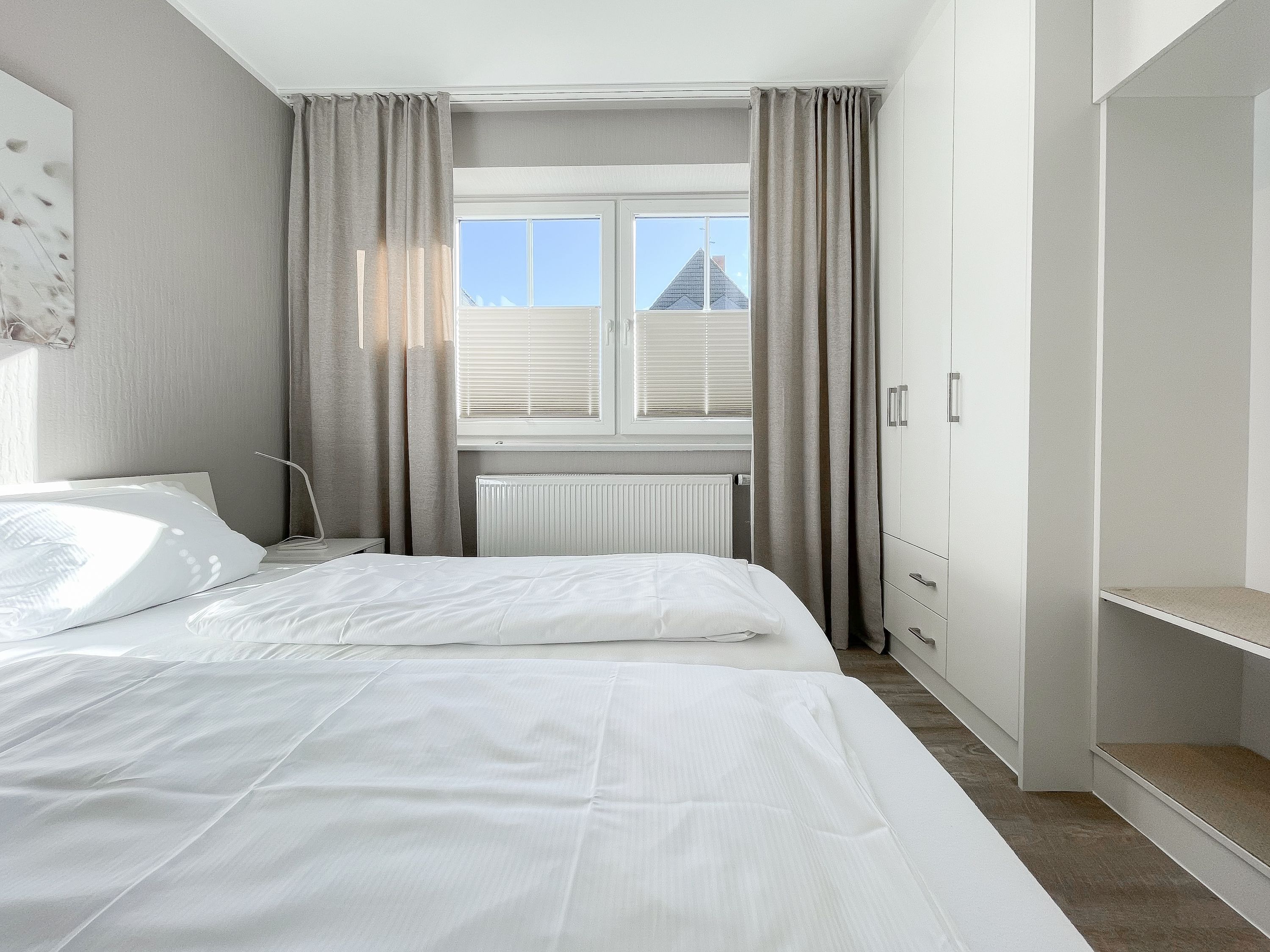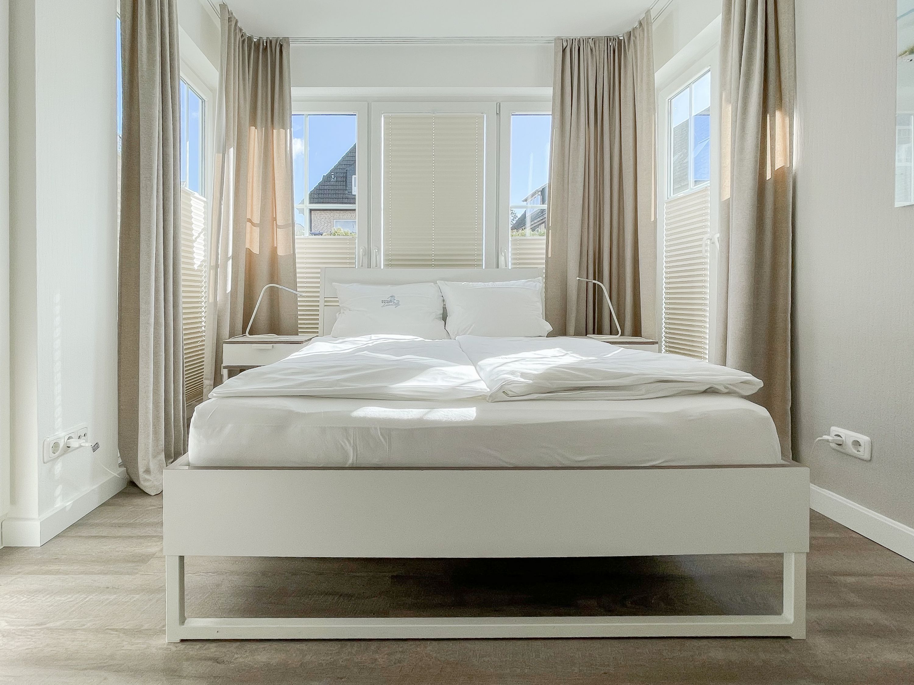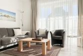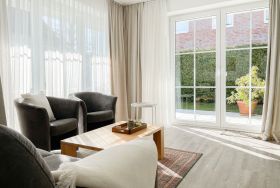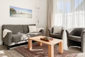 Es erwartet Sie eine gepflegte Ferienwohnung mit zwei separaten Schlafzimmern, die mit Doppelbetten (180x200 und 140x200) und Verdunkelungsvorhängen ausgestattet sind und ein helles Duschbad mit Fenster und Handtuchwärmer. Das Wohnzimmer ist komfortabel mit einer Couchgarnitur und einer integrierten Essecke für 4 Personen eingerichtet. TV, Hifi Anlage und kostenloses WLAN stehen zur Verfügung. Die offene Einbauküche ist gut ausgestattet. Dank großer Fensterflächen sind die Räumlichkeiten hell und freundlich. Als idealer Rückzugsort während eines entspannten Urlaubs eignet sich die großzügige, umlaufende Sonnenterrasse in Südausrichtung. Das Haus verfügt selbstverständlich über einen Aufzug. Zur Wohnung gehört ein Stellplatz auf dem Grundstück. Ein Fahrradständer ist vorhanden.