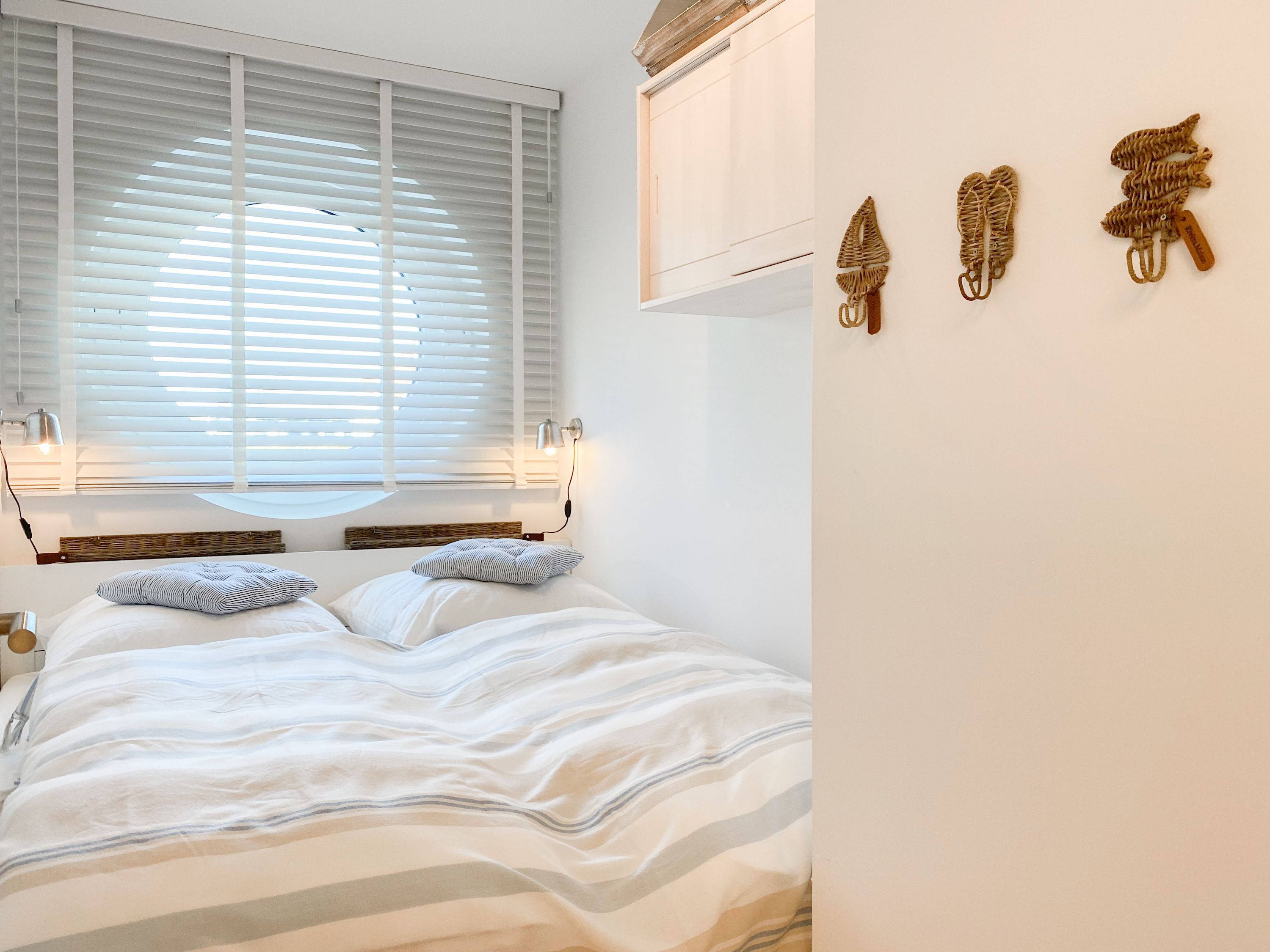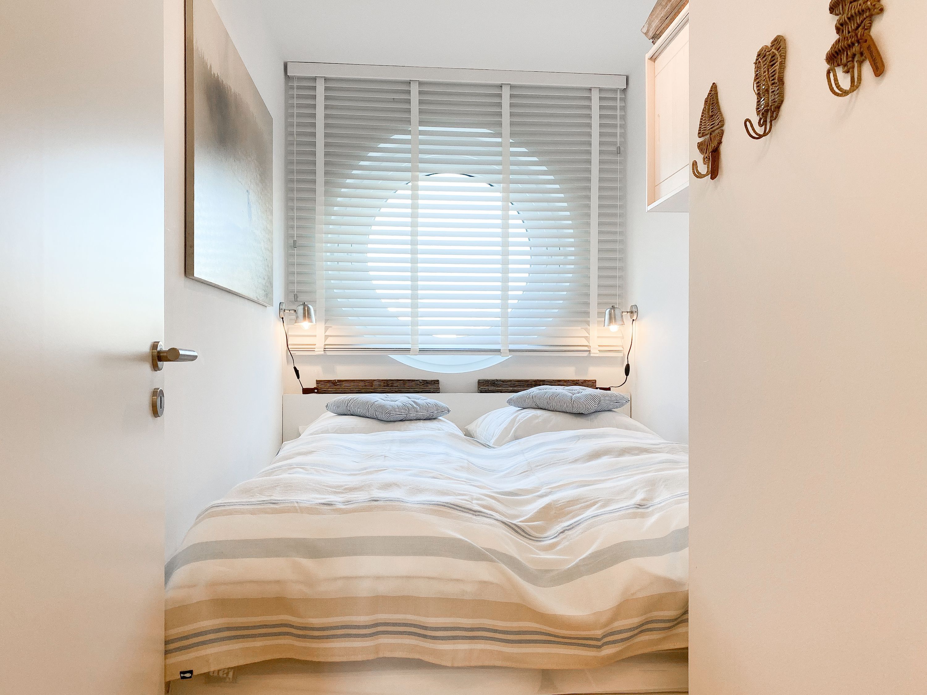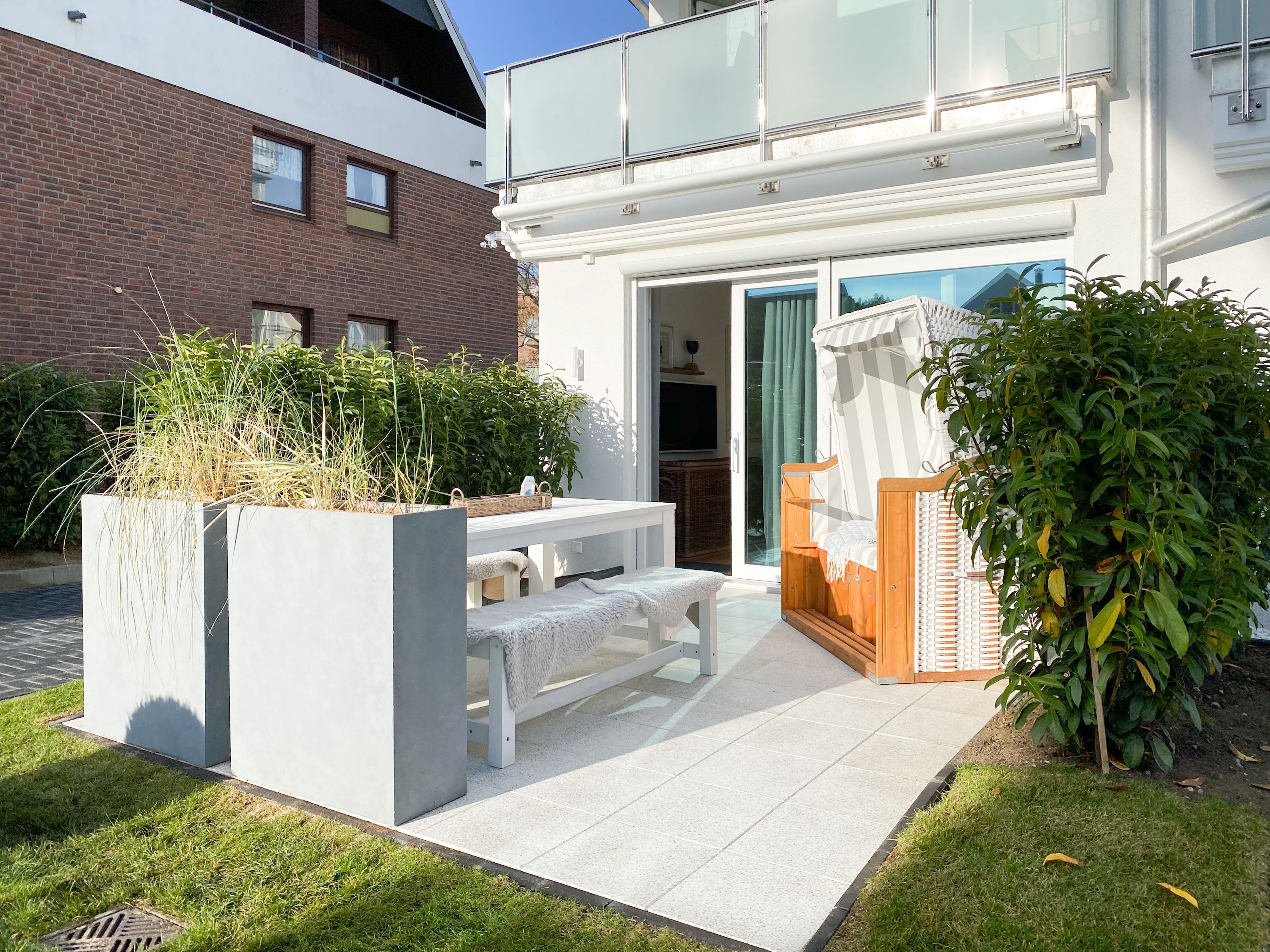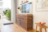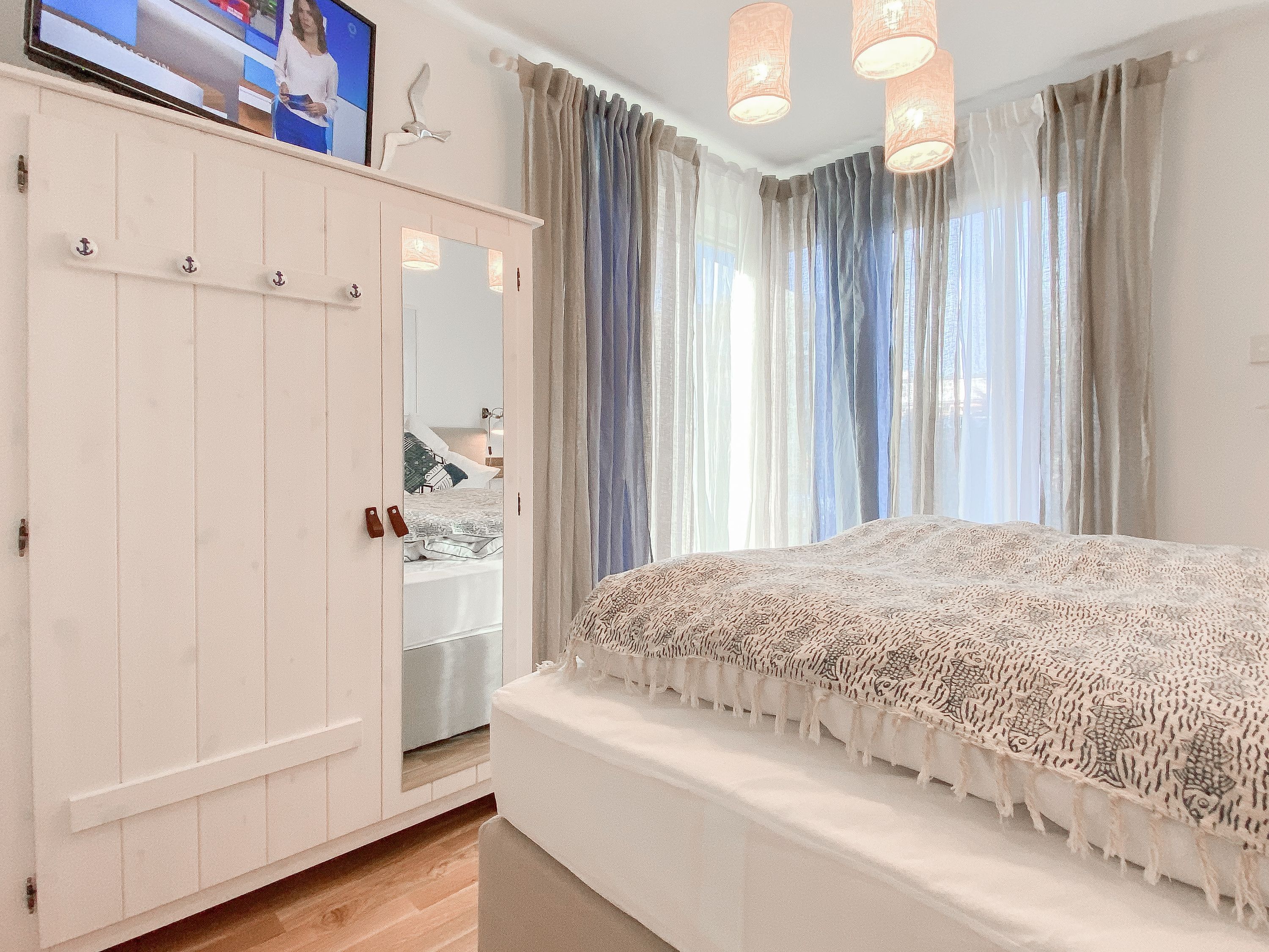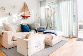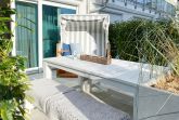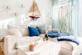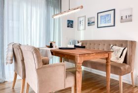 Das Kajütchen ist mit 2 separaten Schlafzimmern bestens für 3-4 Personen geeignet, um einen entspannten Ostseeurlaub zu verleben. Die hochwertige Inneneinrichtung mit vielen liebevollen Details im Beachstyle laden zum Wohlfühlen in Strandnähe ein. Es erwartet Sie ein lichtdurchfluteter Wohnbereich mit einem Kuschelsofa, TV, Radio und WLAN, ein gemütlicher Essbereich für 4 Personen und eine moderne Designküche in bester Ausstattung. Der Strandkorb und die Essgruppe auf der Sonnenterrasse garantieren entspannte Stunden an der frischen Seeluft. Eine elektrische Markise sorgt für entsprechende Beschattung. Das Hauptschlafzimmer ist mit einem komfortablen Boxspringbett (180x200), einem Kleiderschrank und TV ausgestattet. Das kleine Schlafzimmer verfügt über ein Doppelbett (160x200) mit zusätzlichem Stauraum im Fußteil; bitte beachten Sie, dass das Bett nur über das Fußende zu erreichen ist. Das Bullaugenfenster ist mit Verdunkelungslamellen versehen. Alle weiteren bodentiefen Fensterflächen sind mit elektrischen Außenjalousien ausgestattet. Das Duschbad ist hochwertig und modern. Ein Bullauge und ein Handtuchwärmer sorgen für zusätzlichen Komfort.