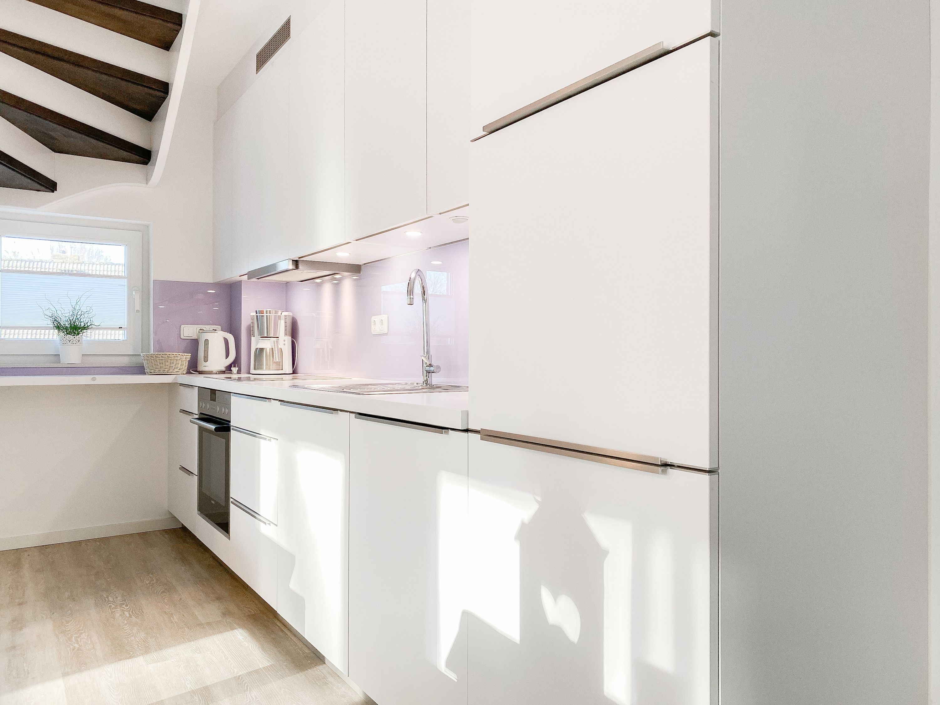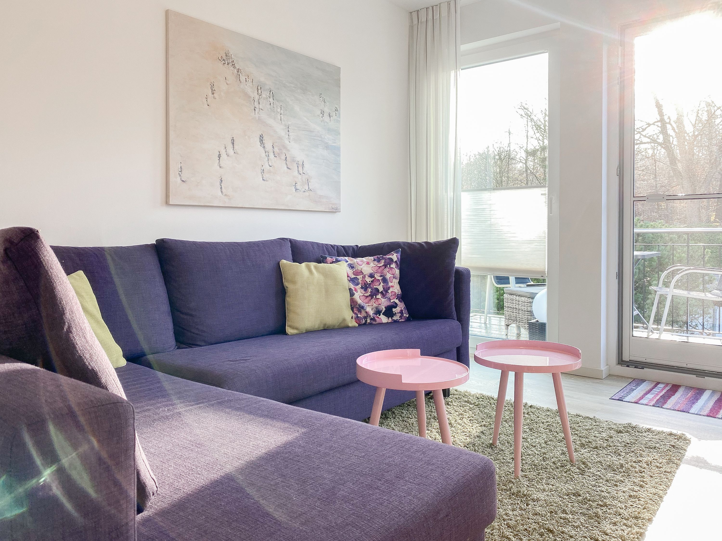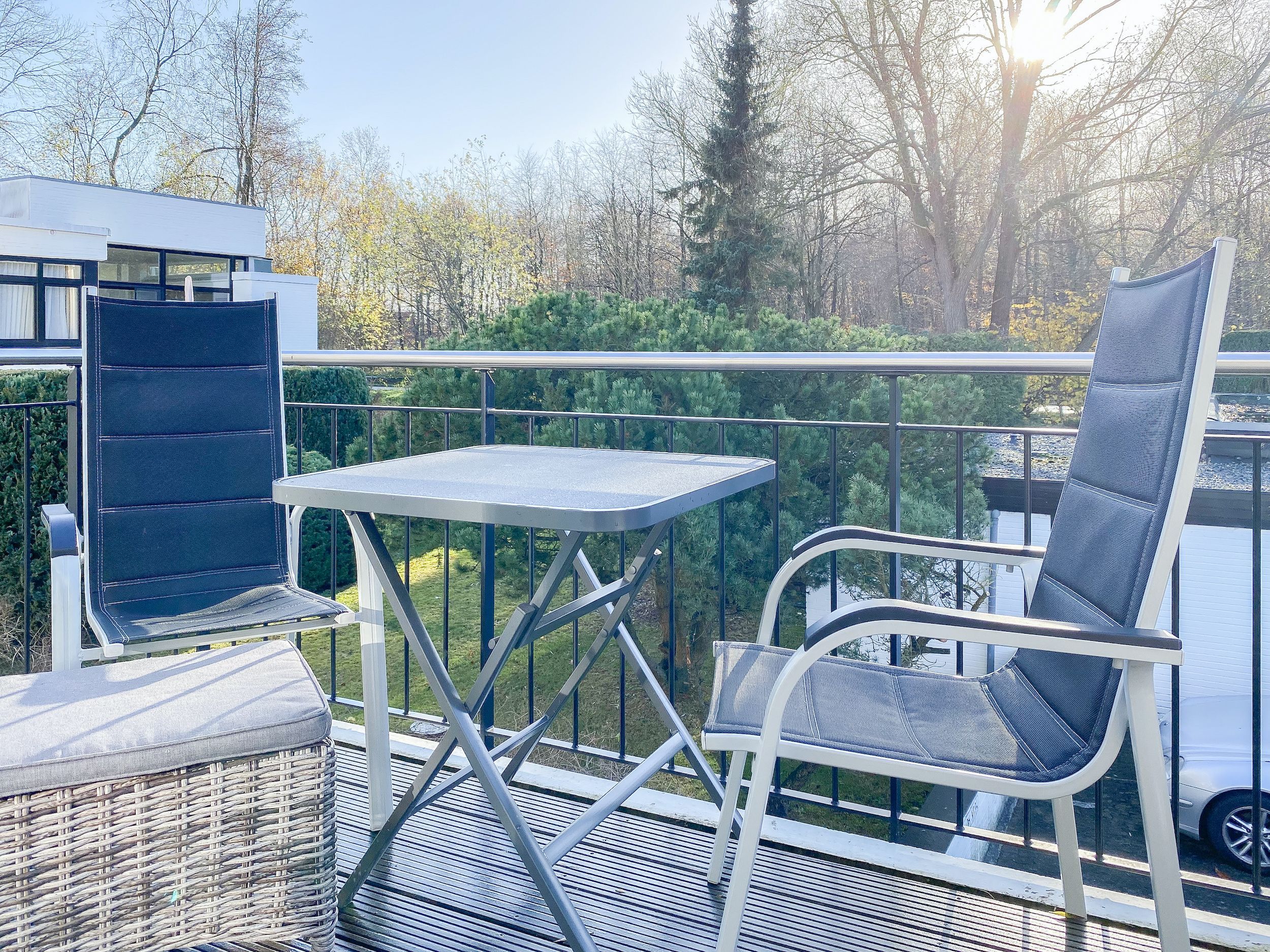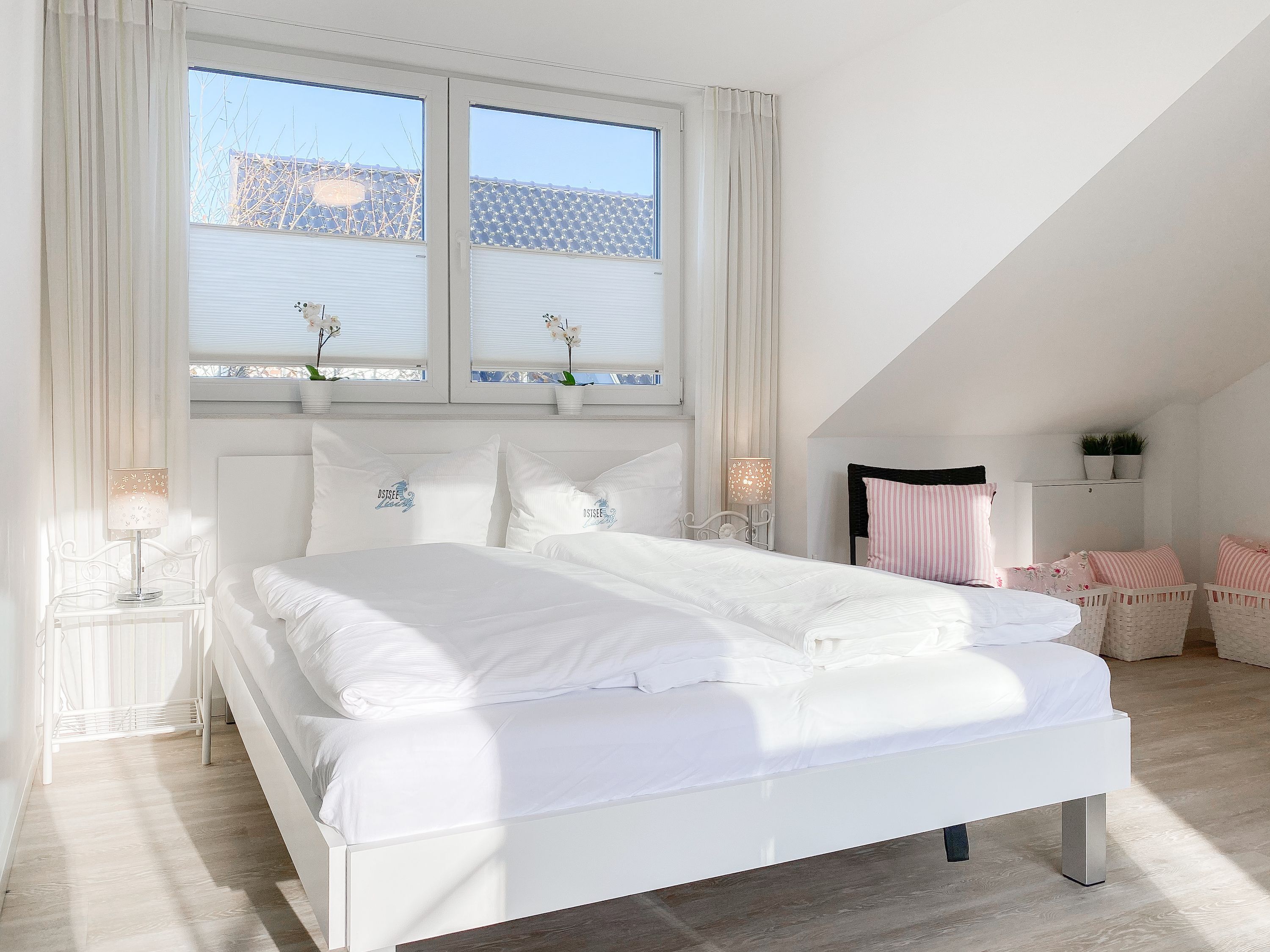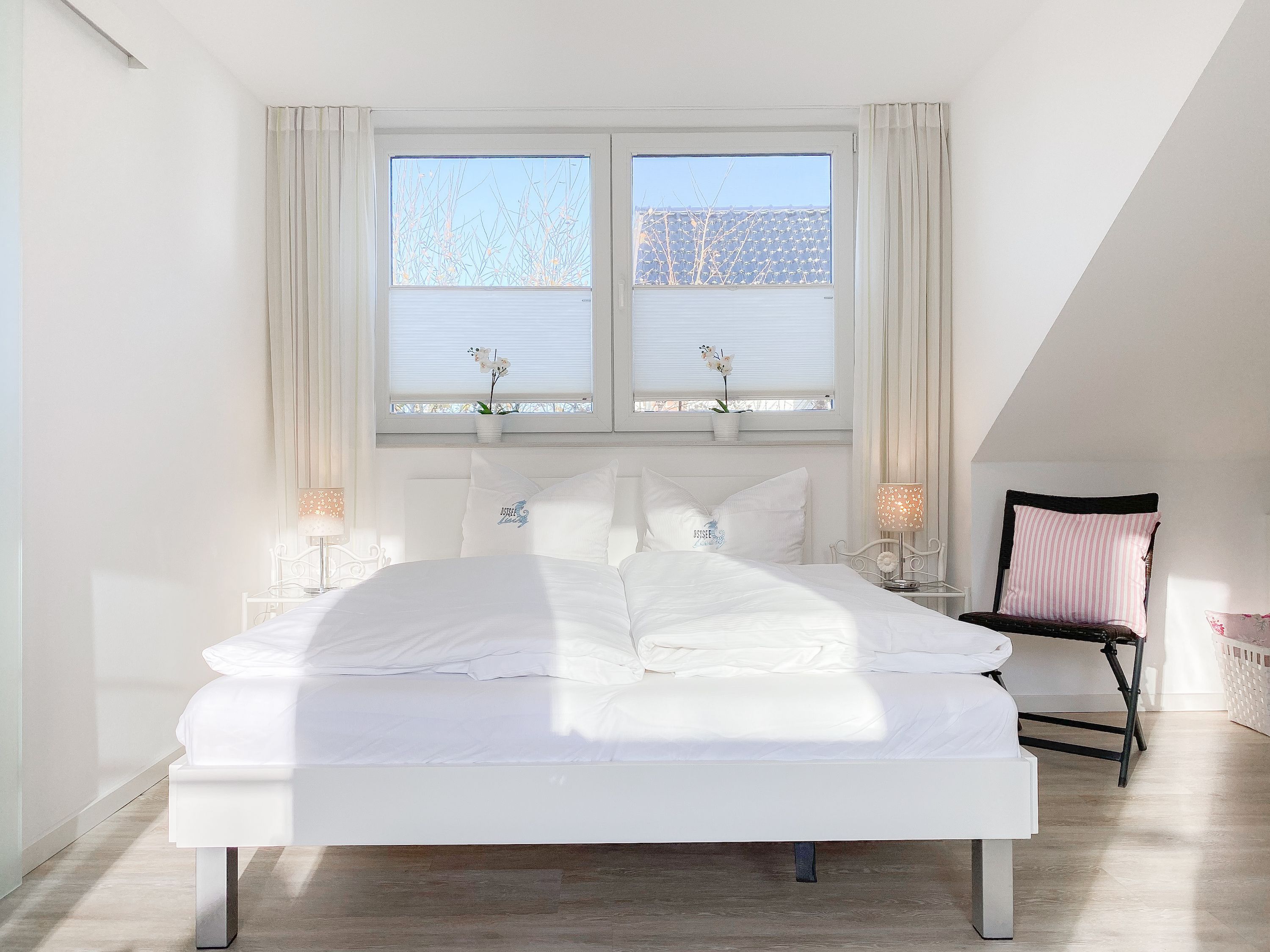 Die lichtdurchflutete Maisonette mit zwei separaten Schlafzimmern, zwei Bädern und zwei Balkonen erstreckt sich über zwei Wohnebenen. Fröhliche Farben und ein jugendlich- modernes Innendesign sorgen für gute Laune. In der unteren Etage erwartet Sie ein offener Wohn-Essbereich, an den sich eine voll ausgestattete moderne Küche anschließt. Der möblierte Balkon in Südwest Lage lädt zu Mahlzeiten an der frischen Seeluft ein. Hier können Sie gemütlich die Sonnenstunden am Nachmittag und späten Abend genießen. Das Schlafzimmer ist mit einem hochwertigen und großen Doppelbett (200 x 200) ausgestattet und verspricht erholsame Stunden nach einem ereignisreichen Urlaubstag. Gegenüber befindet sich ein Tageslichtbad mit komfortabler Walk In Dusche. Über eine Holztreppe gelangen Sie zur oberen Wohnebene. Das zweite Schlafzimmer ist ebenfalls mit einem Doppelbett (160 x 200) eingerichtet und verfügt über einen Sitzbereich mit TV. Ein modernes, großzügiges Bad mit Badewanne schließt sich direkt an das Schlafzimmer an und bietet Ihnen entsprechende Privatsphäre. Das Highlight ist der eigene Zugang zur hochwertig möblierten Dachterrasse, ausgestattet mit bequemen Rattansesseln, die in eine Liegeposition verstellbar sind. In jedem Raum ist ein Fenster mit einem Fliegengitter ausgestattet, sodass mückenfreies Lüften gewährleistet ist. Auf Wunsch können alle Wohnräume mit elektrischen Außenjalousien verdunkelt werden. Eine zusätzliche, zentrale Steuerung befindet sich im Eingangsbereich. Die Temperatur der Fußbodenheizung lässt sich für jeden Raum separat regulieren. Zwei TV, ein Radio und kostenloses WLAN gehören zum Entertainment-Paket. Ein Fahrstuhl ist selbstverständlich vorhanden.