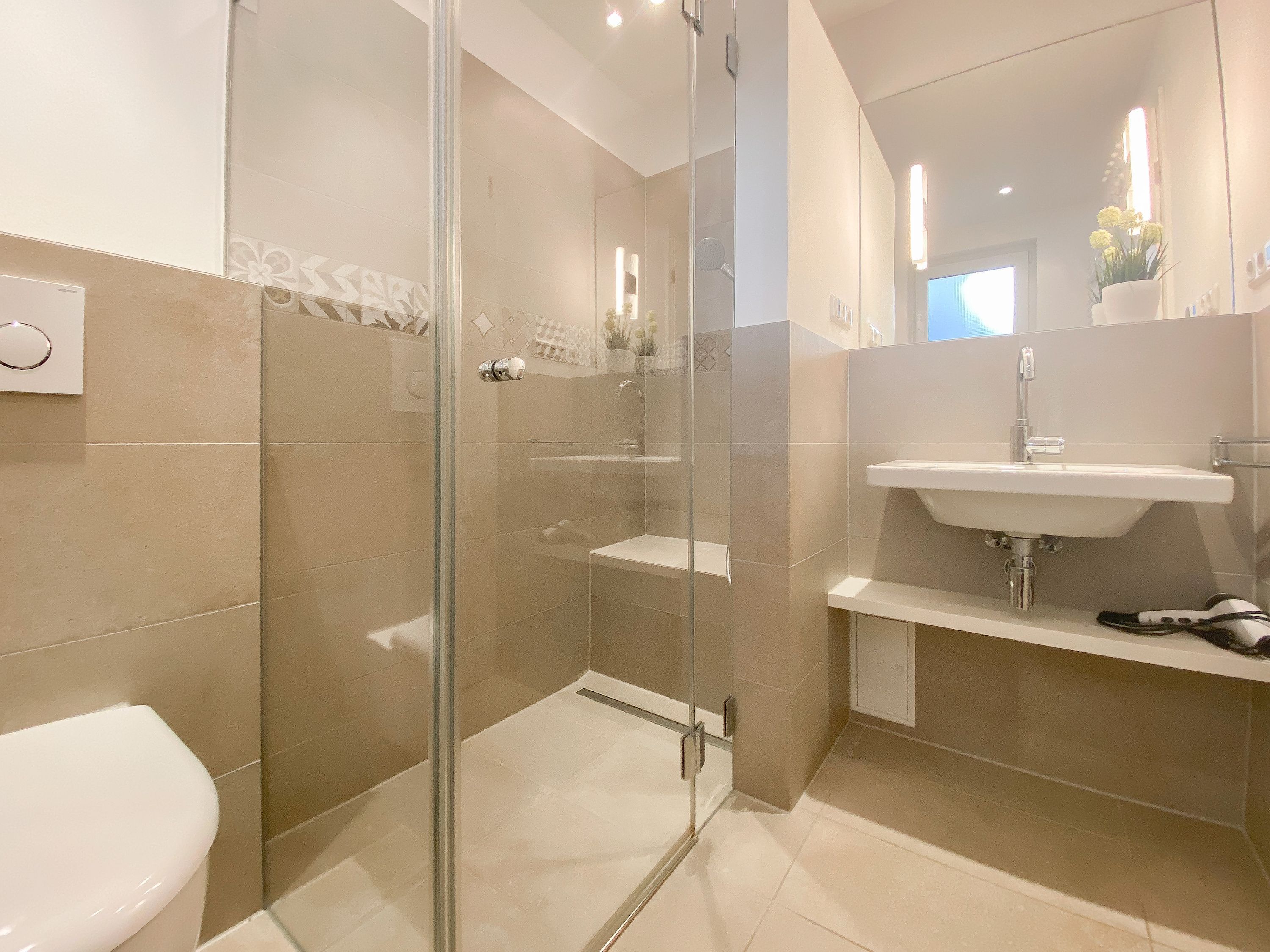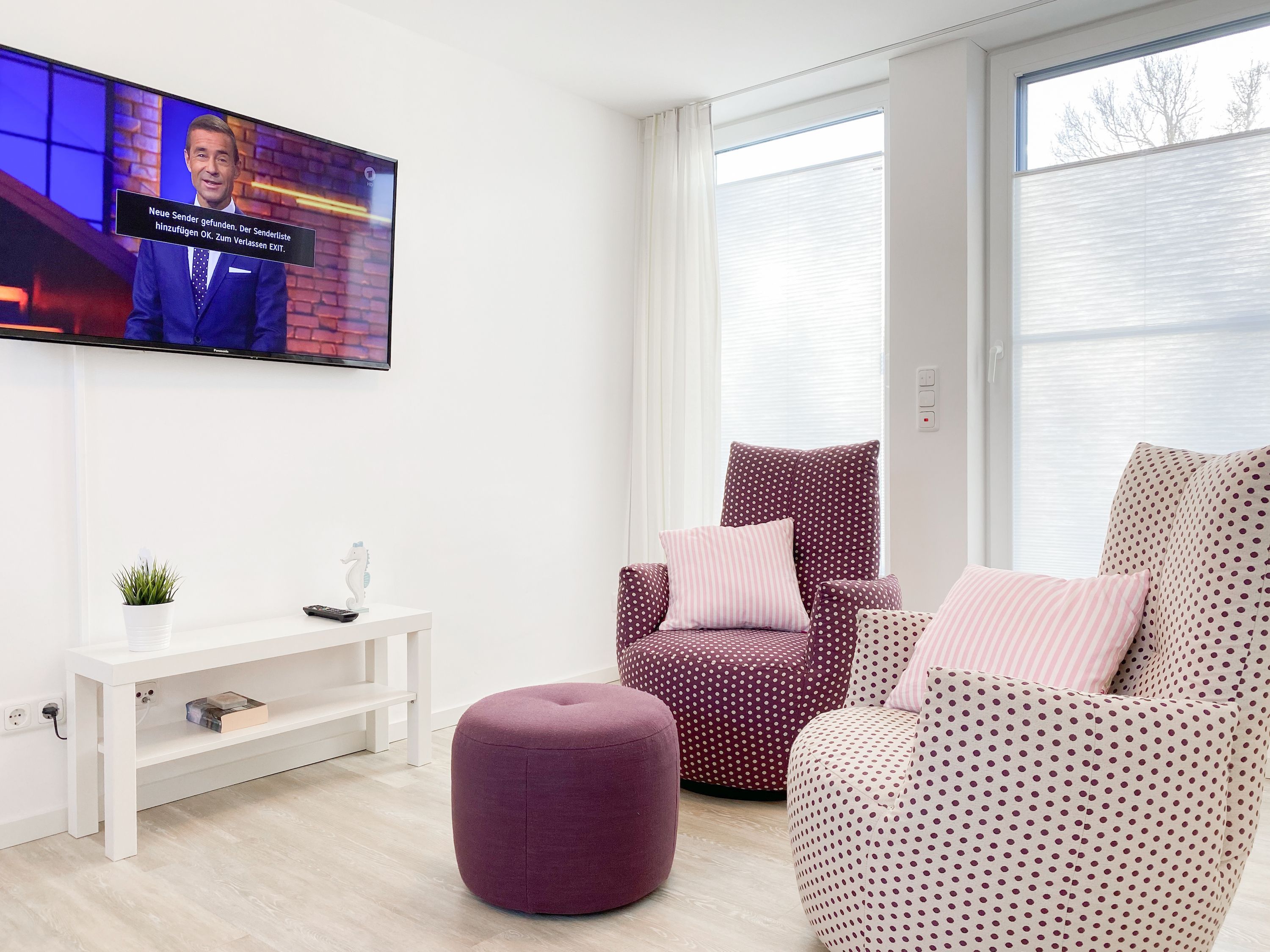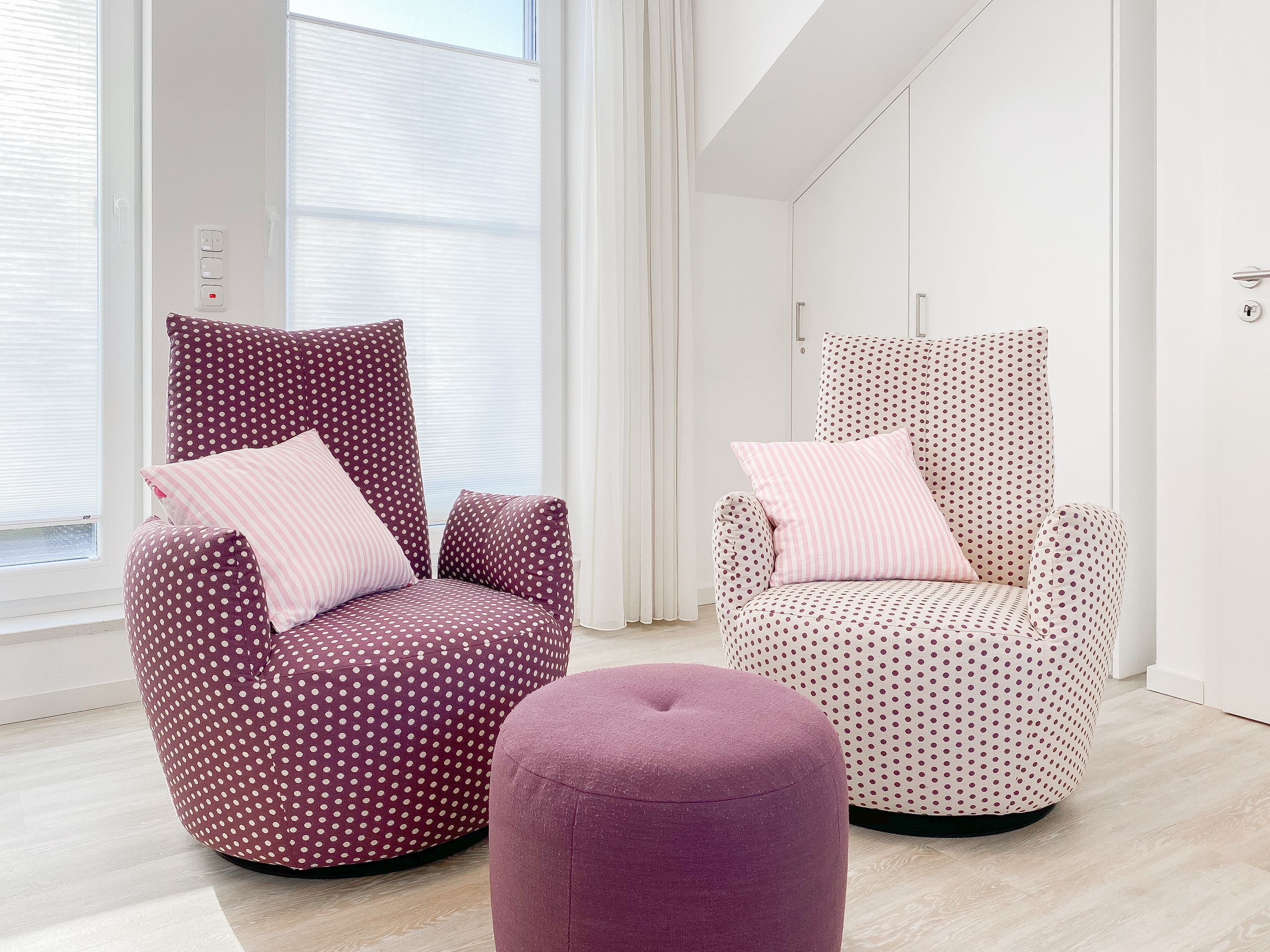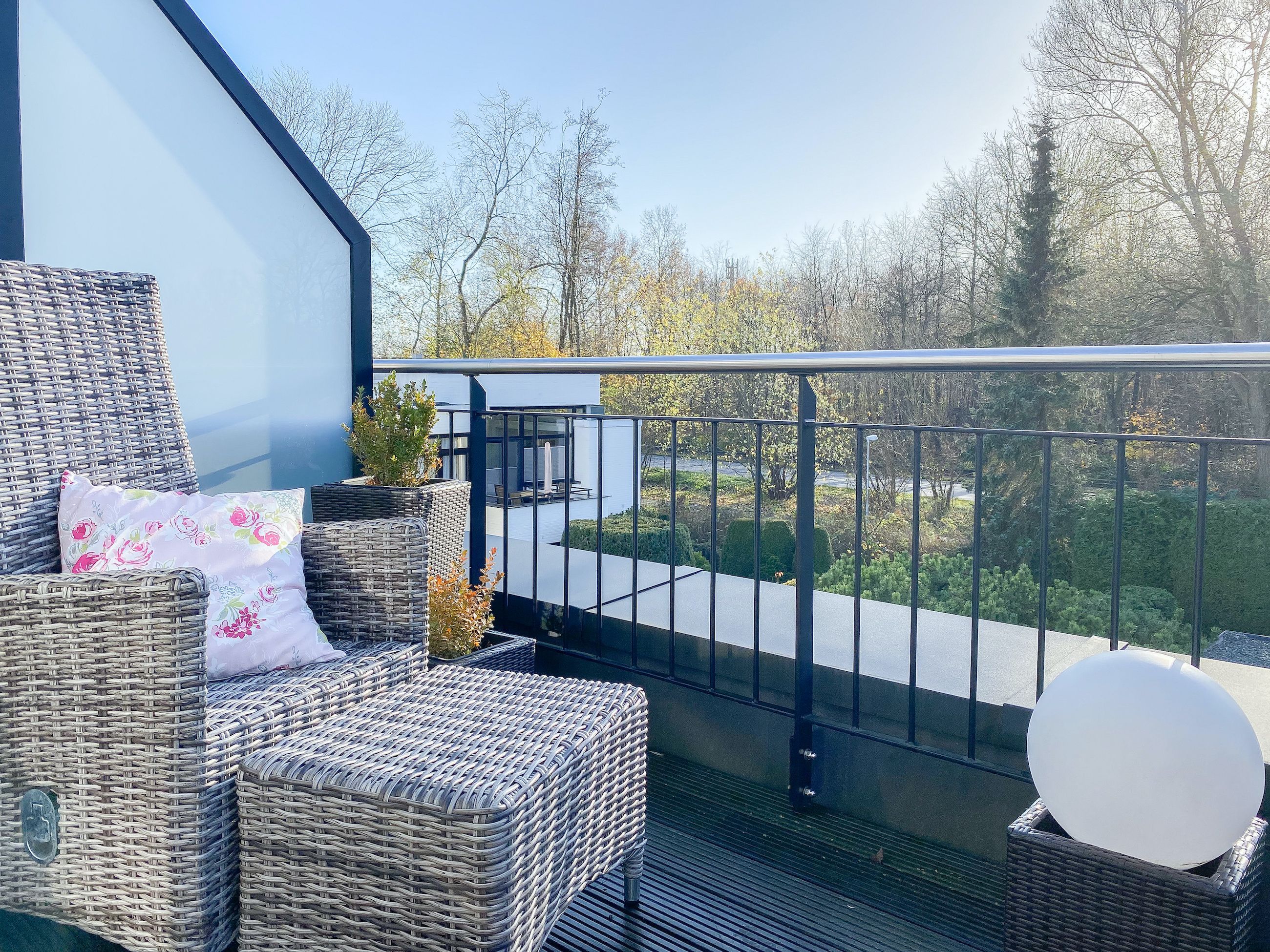 Die lichtdurchflutete Maisonette mit zwei separaten Schlafzimmern, zwei Bädern und zwei Balkonen erstreckt sich über zwei Wohnebenen. Fröhliche Farben und ein jugendlich- modernes Innendesign sorgen für gute Laune. In der unteren Etage erwartet Sie ein offener Wohn-Essbereich, an den sich eine voll ausgestattete moderne Küche anschließt. Der möblierte Balkon in Südwest Lage lädt zu Mahlzeiten an der frischen Seeluft ein. Hier können Sie gemütlich die Sonnenstunden am Nachmittag und späten Abend genießen. Das Schlafzimmer ist mit einem hochwertigen und großen Doppelbett (200 x 200) ausgestattet und verspricht erholsame Stunden nach einem ereignisreichen Urlaubstag. Gegenüber befindet sich ein Tageslichtbad mit komfortabler Walk In Dusche. Über eine Holztreppe gelangen Sie zur oberen Wohnebene. Das zweite Schlafzimmer ist ebenfalls mit einem Doppelbett (160 x 200) eingerichtet und verfügt über einen Sitzbereich mit TV. Ein modernes, großzügiges Bad mit Badewanne schließt sich direkt an das Schlafzimmer an und bietet Ihnen entsprechende Privatsphäre. Das Highlight ist der eigene Zugang zur hochwertig möblierten Dachterrasse, ausgestattet mit bequemen Rattansesseln, die in eine Liegeposition verstellbar sind. In jedem Raum ist ein Fenster mit einem Fliegengitter ausgestattet, sodass mückenfreies Lüften gewährleistet ist. Auf Wunsch können alle Wohnräume mit elektrischen Außenjalousien verdunkelt werden. Eine zusätzliche, zentrale Steuerung befindet sich im Eingangsbereich. Die Temperatur der Fußbodenheizung lässt sich für jeden Raum separat regulieren. Zwei TV, ein Radio und kostenloses WLAN gehören zum Entertainment-Paket. Ein Fahrstuhl ist selbstverständlich vorhanden.