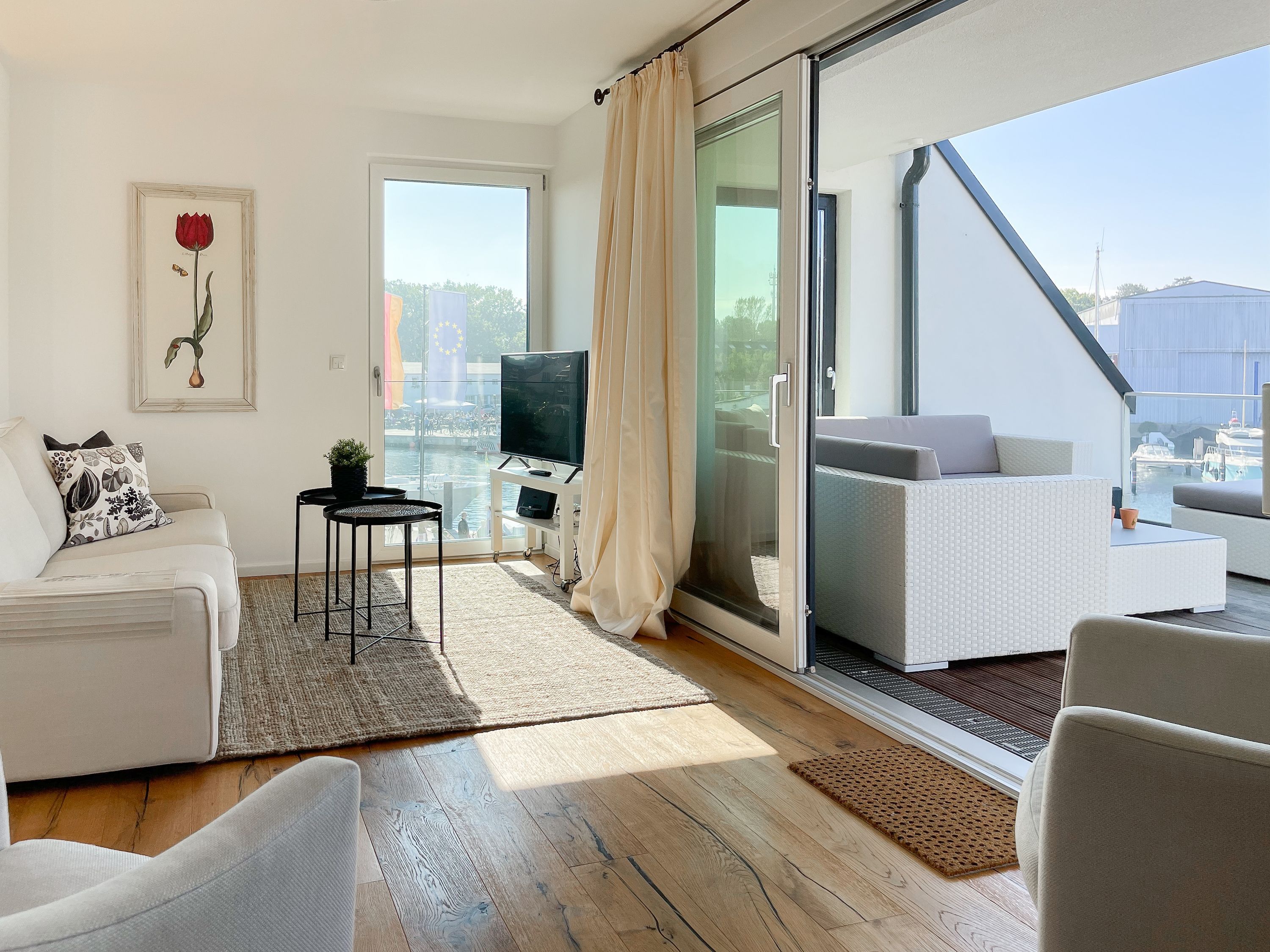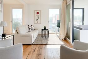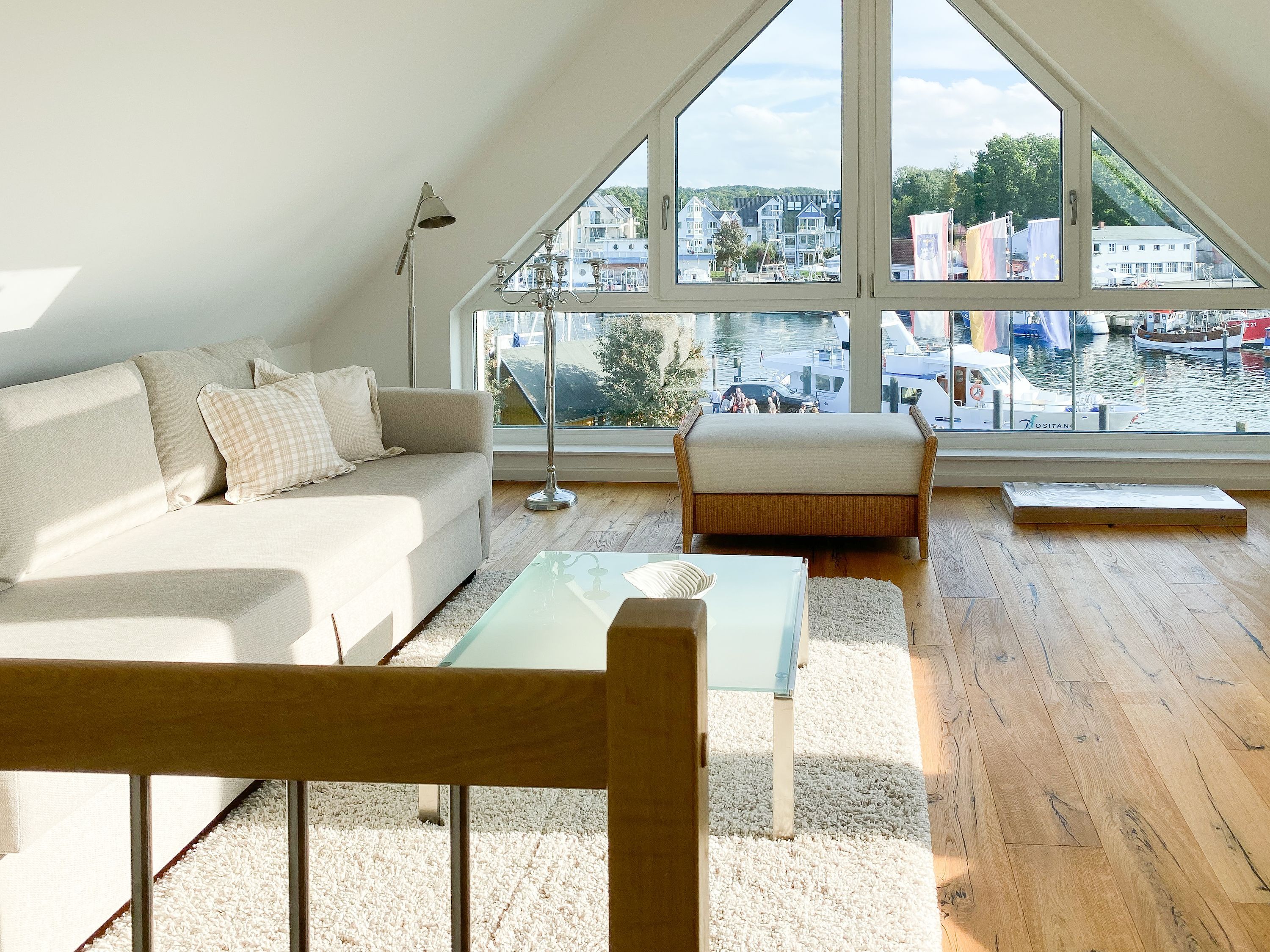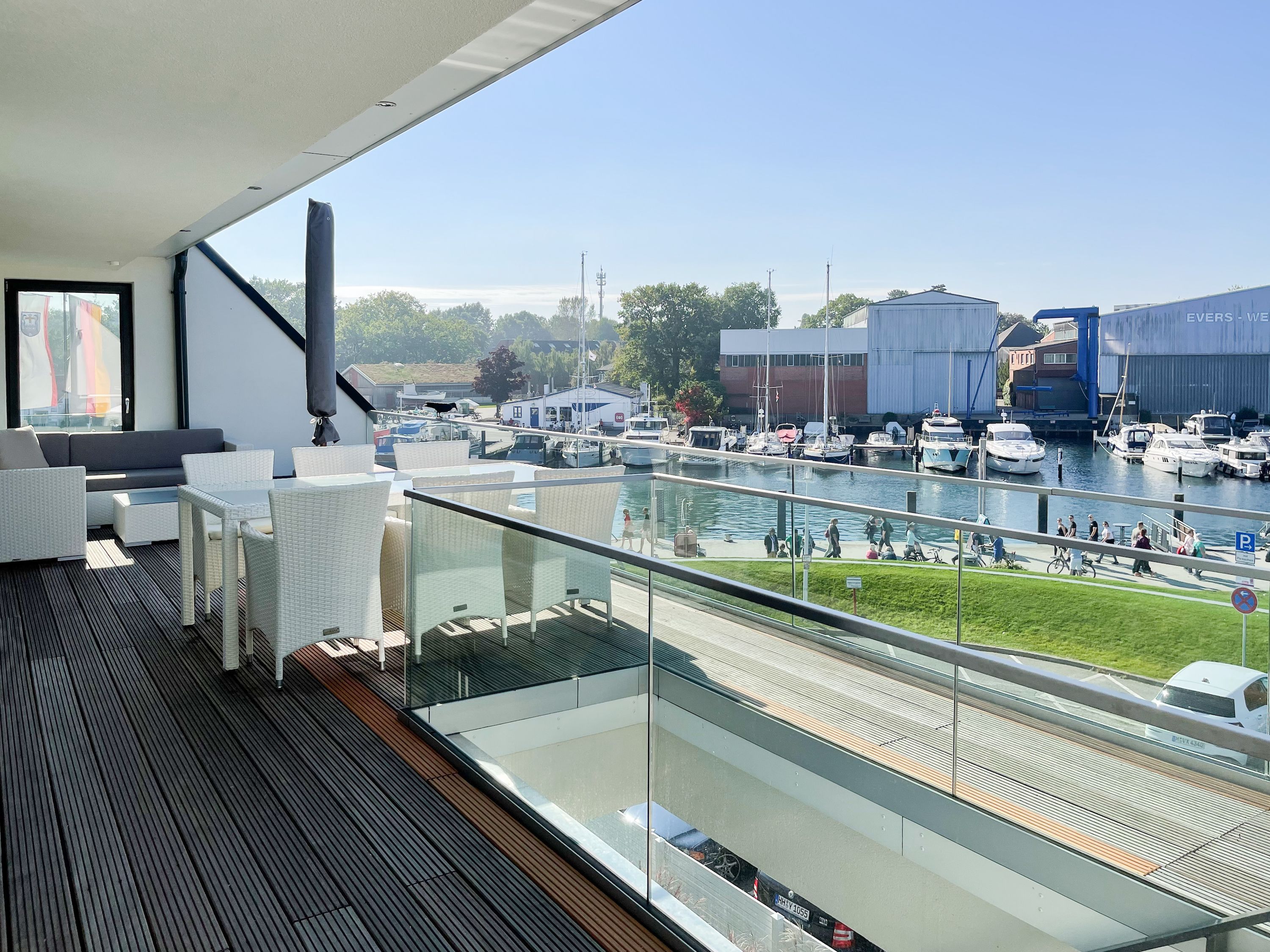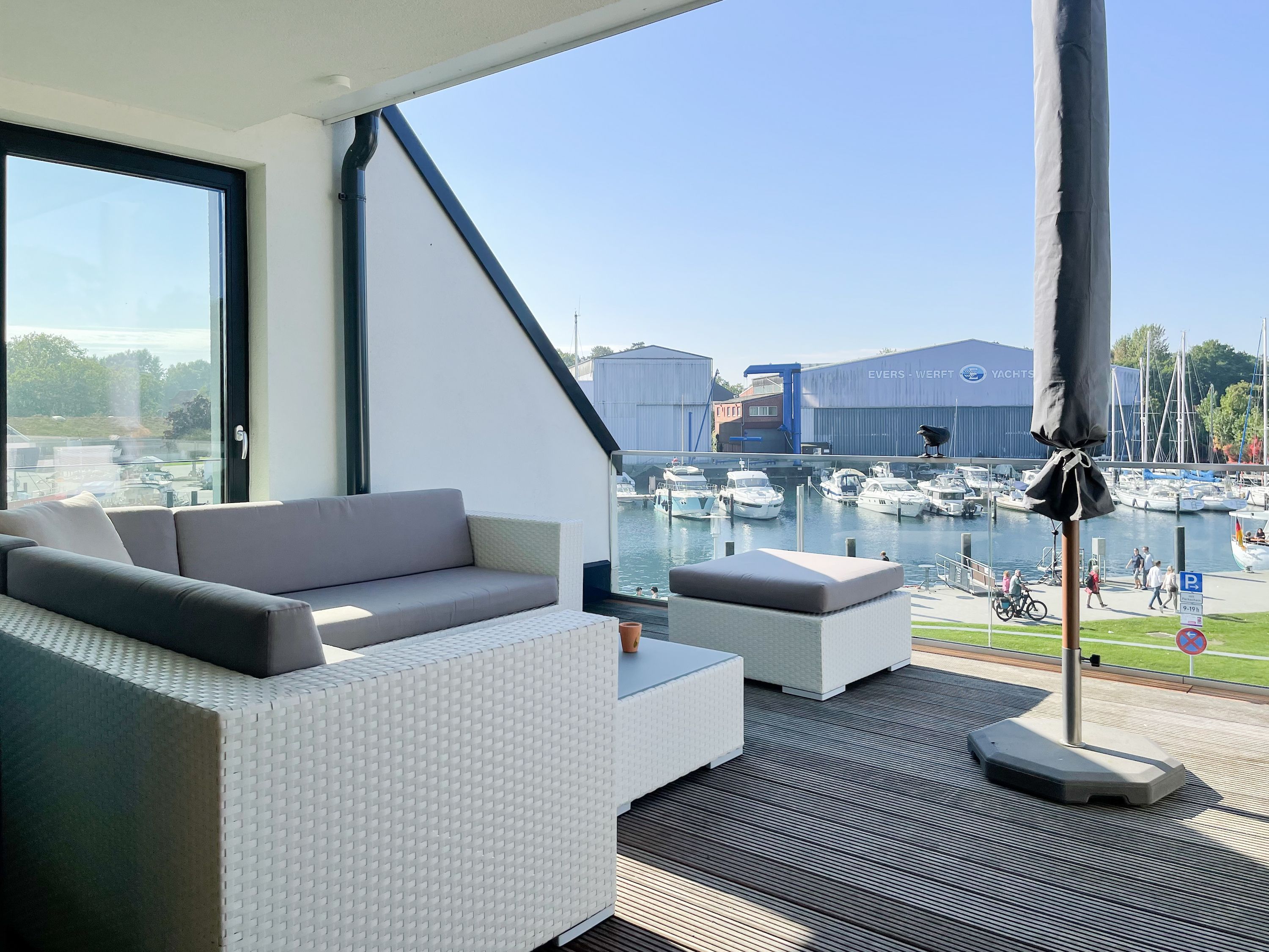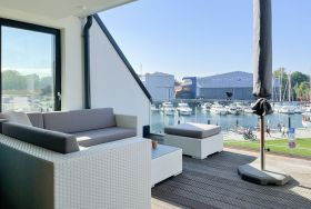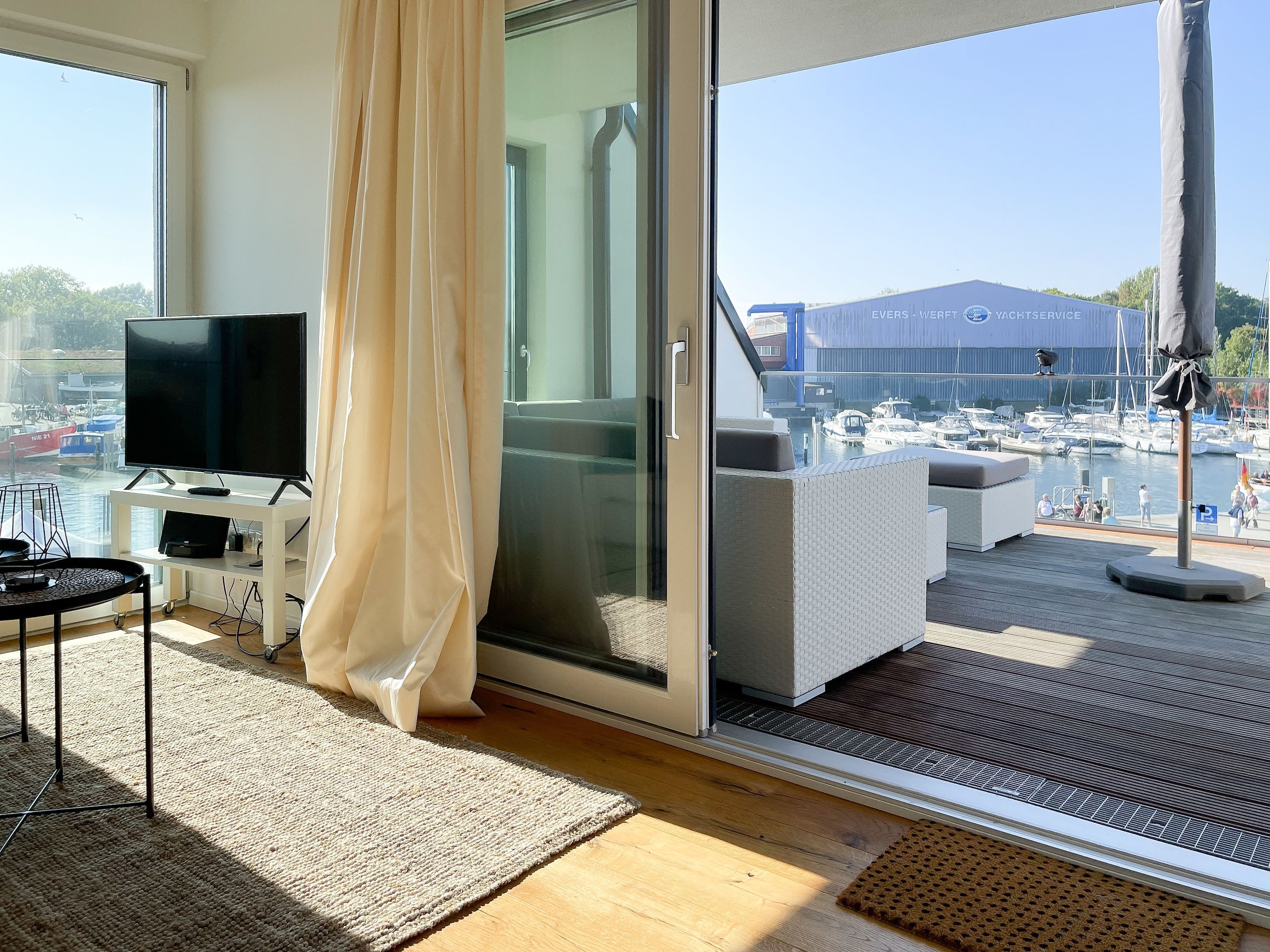 Das einzigartige Penthouse erstreckt sich über 2 Ebenen und liegt im 2. Obergeschoss eines modernen Neubaus mit nur 3 Wohneinheiten. Auf 130 qm Wohnfläche mit 2 Schlafzimmern, 2 separaten Bädern und 2 Wohnbereichen können 4 Personen einen entspannten Urlaub verleben. Auf der unteren Wohnebene erwartet Sie ein Schlafzimmer mit Doppelbett, Verdunkelungsplissees und Ostseeblick, ein Duschbad sowie ein offener Wohn- Essbereich, TV und eine integrierte moderne Einbauküche. Bodentiefe Fensterelemente bieten einem phantastischen Ausblick auf die Ostsee und die ein- und ausfahrenden Schiffe vom Fischkutter bis zur Motoryacht. Echtholzböden und Fußbodenheizung sorgen für ein angenehmes Raumklima. Die sehr großzügig angelegte Dachterrasse vor dem Wohnbereich ist mit einer Gartenlounge und einem Essbereich ausgestattet. Genießen Sie viele Sonnenstunden, die einzigartige Hafenatmosphäre und beeindruckende Sonnenuntergänge bei einem Glas Wein. Vor dem Essbereich befindet sich eine weitere Dachterrasse mit Bistrotisch und 2 Stühlen, um die ersten Sonnenstrahlen mit Ostseeblick bei einem Morgenkaffee zu genießen. Die zweite Wohnebene ist über eine schmale recht steile Raumspartreppe zu erreichen. Hier erwartet Sie ein weiterer Wohnbereich mit traumhaftem Blick auf den Hafen und das zweite Schlafzimmer mit TV, Ostseeblick und Verdunkelungsplissees, ebenfalls mit Doppelbett (160x200) sowie ein weiteres Duschbad.