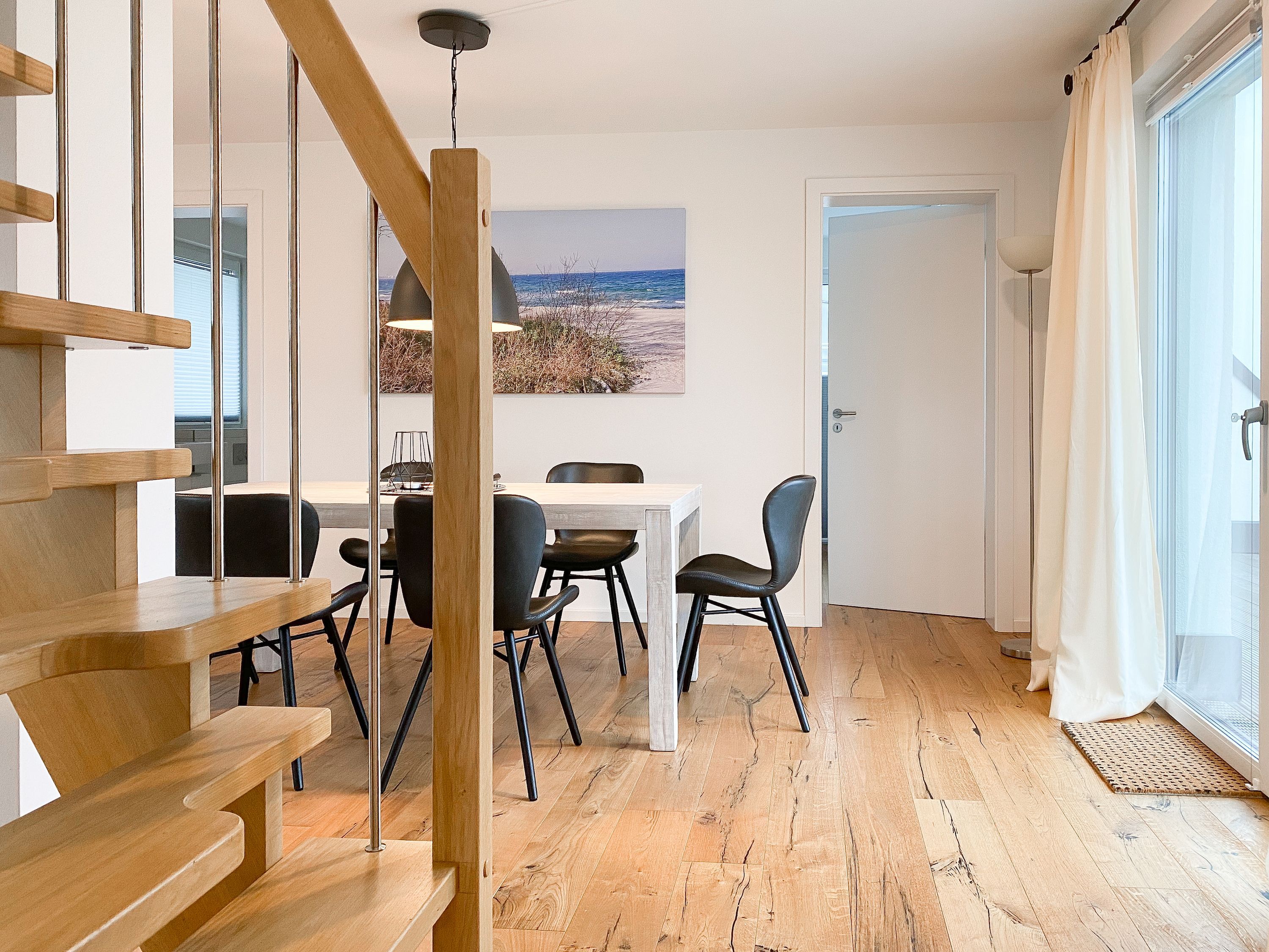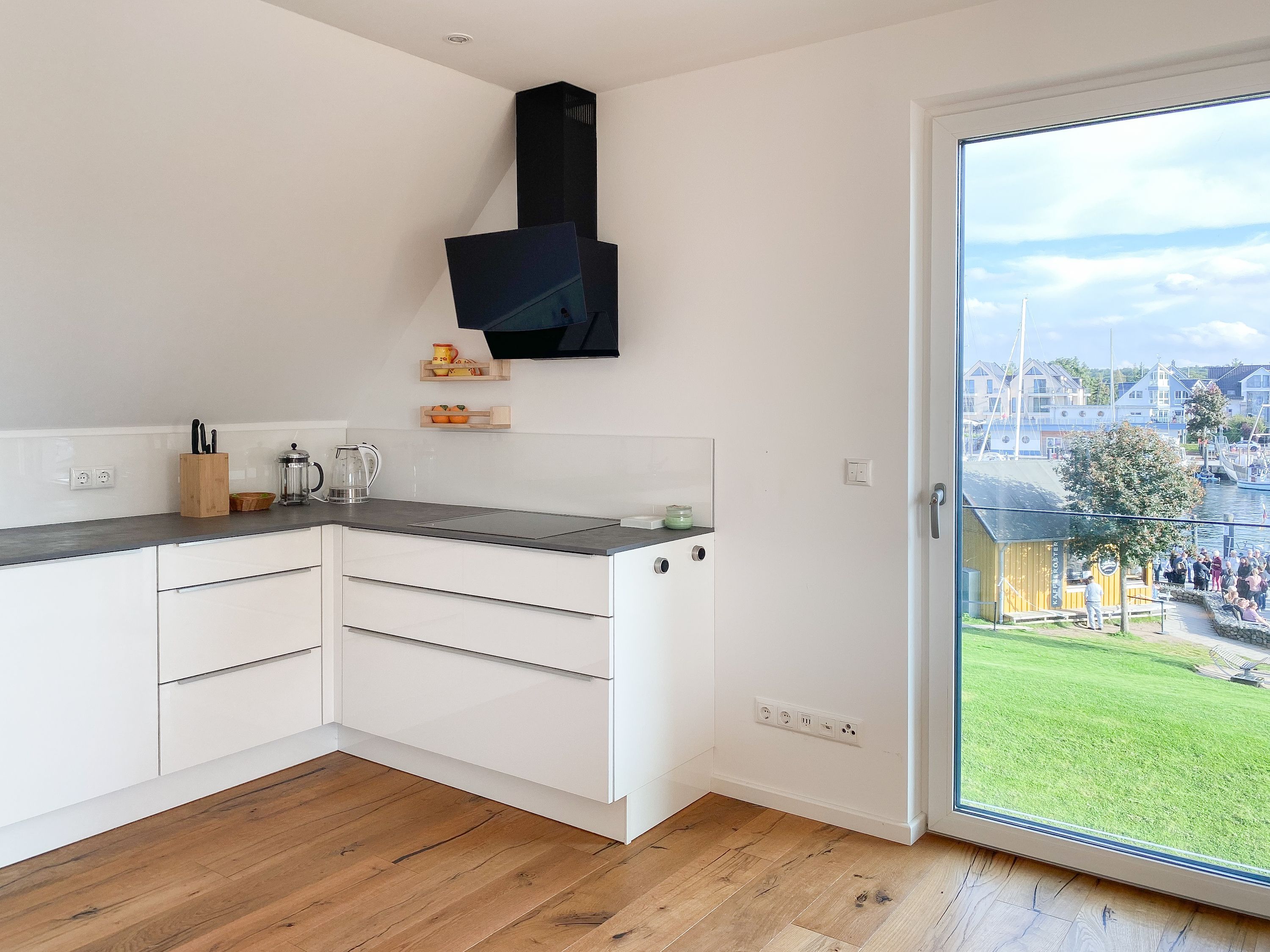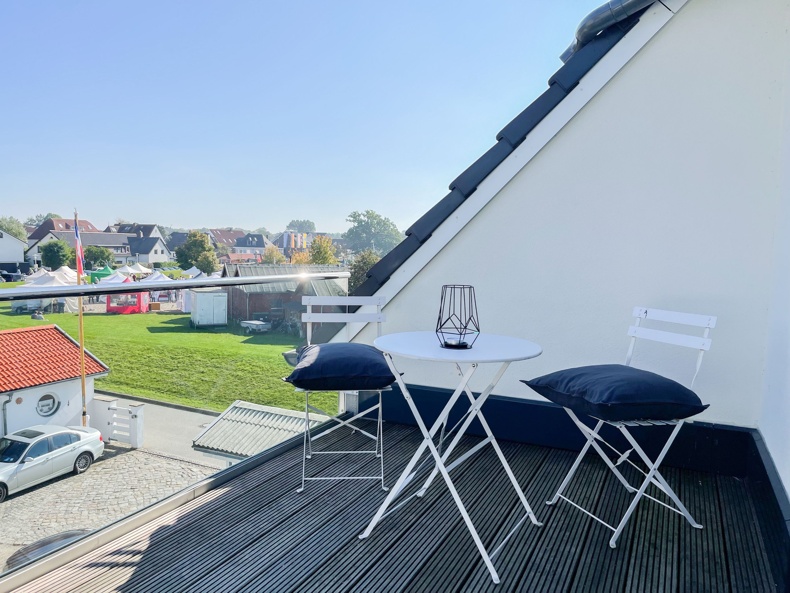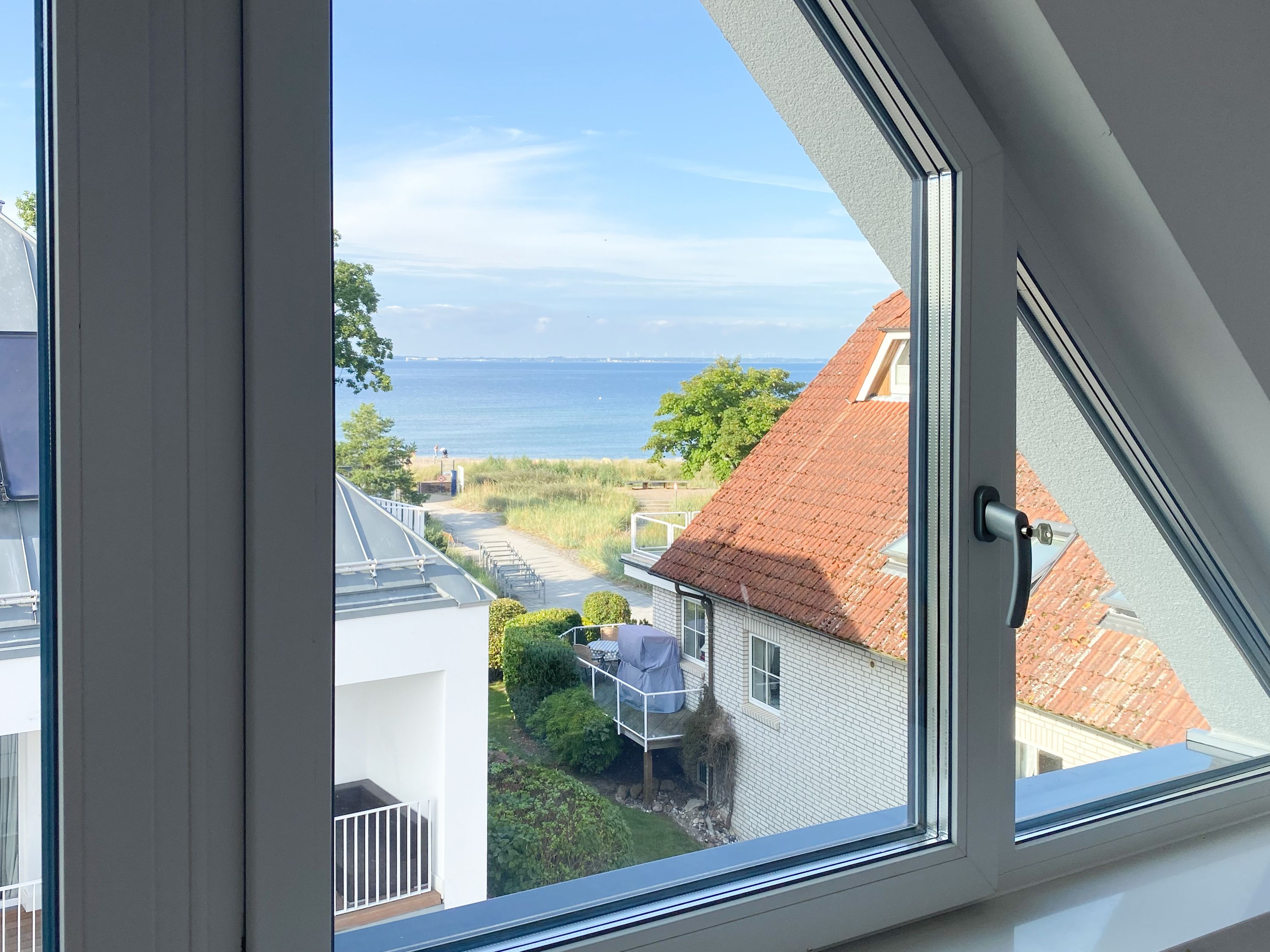 Das einzigartige Penthouse erstreckt sich über 2 Ebenen und liegt im 2. Obergeschoss eines modernen Neubaus mit nur 3 Wohneinheiten. Auf 130 qm Wohnfläche mit 2 Schlafzimmern, 2 separaten Bädern und 2 Wohnbereichen können 4 Personen einen entspannten Urlaub verleben. Auf der unteren Wohnebene erwartet Sie ein Schlafzimmer mit Doppelbett, Verdunkelungsplissees und Ostseeblick, ein Duschbad sowie ein offener Wohn- Essbereich, TV und eine integrierte moderne Einbauküche. Bodentiefe Fensterelemente bieten einem phantastischen Ausblick auf die Ostsee und die ein- und ausfahrenden Schiffe vom Fischkutter bis zur Motoryacht. Echtholzböden und Fußbodenheizung sorgen für ein angenehmes Raumklima. Die sehr großzügig angelegte Dachterrasse vor dem Wohnbereich ist mit einer Gartenlounge und einem Essbereich ausgestattet. Genießen Sie viele Sonnenstunden, die einzigartige Hafenatmosphäre und beeindruckende Sonnenuntergänge bei einem Glas Wein. Vor dem Essbereich befindet sich eine weitere Dachterrasse mit Bistrotisch und 2 Stühlen, um die ersten Sonnenstrahlen mit Ostseeblick bei einem Morgenkaffee zu genießen. Die zweite Wohnebene ist über eine schmale recht steile Raumspartreppe zu erreichen. Hier erwartet Sie ein weiterer Wohnbereich mit traumhaftem Blick auf den Hafen und das zweite Schlafzimmer mit TV, Ostseeblick und Verdunkelungsplissees, ebenfalls mit Doppelbett (160x200) sowie ein weiteres Duschbad.