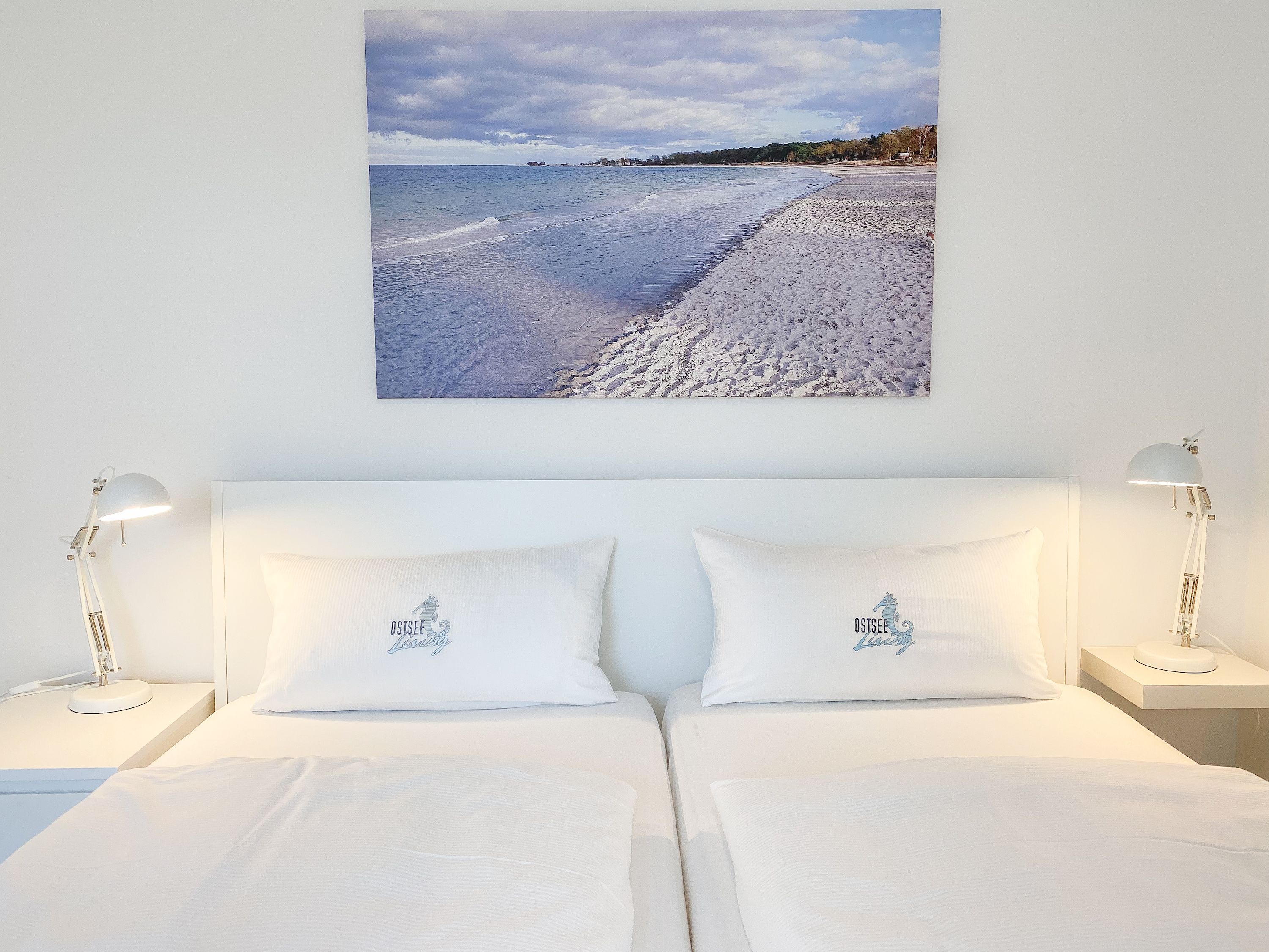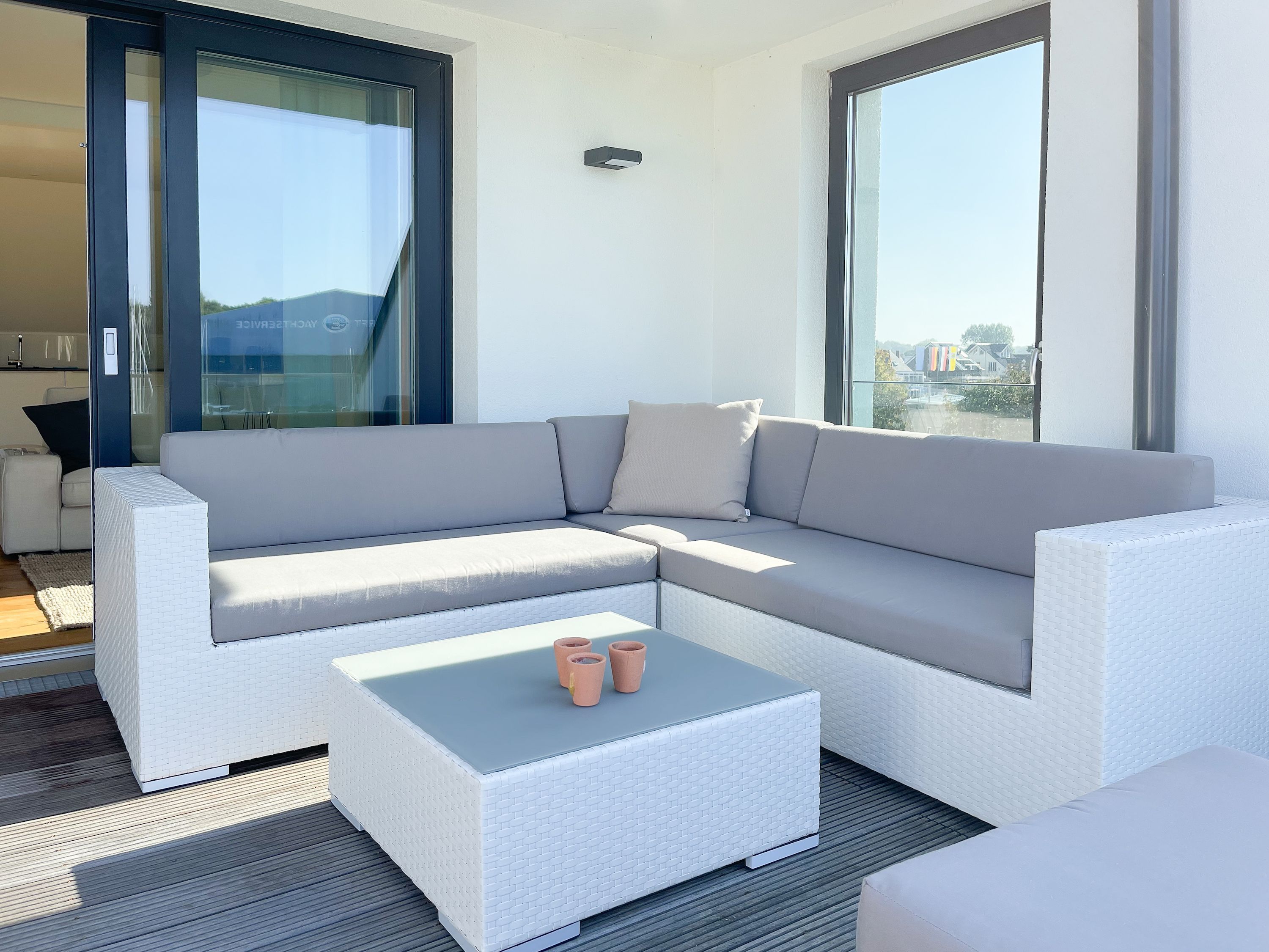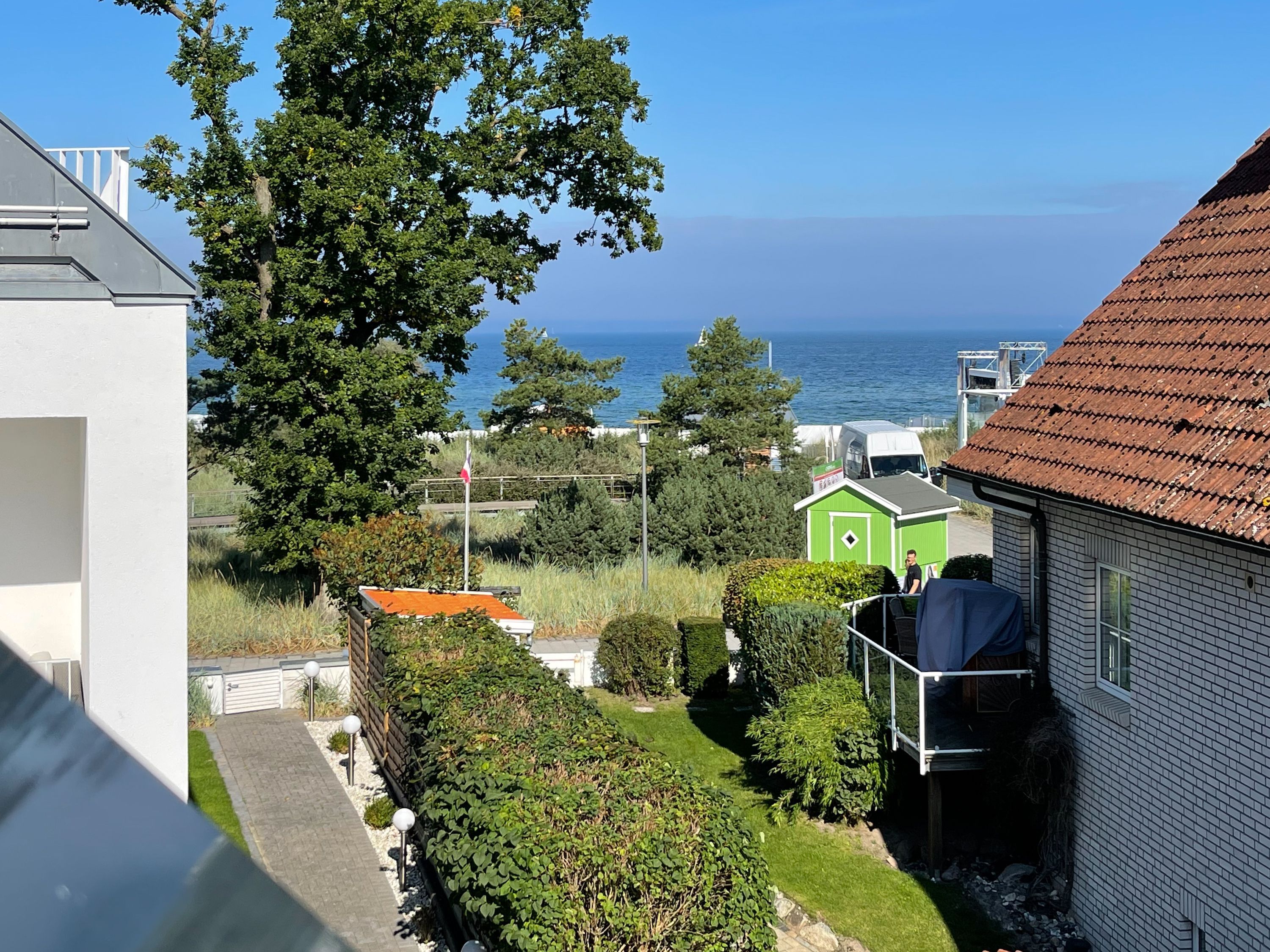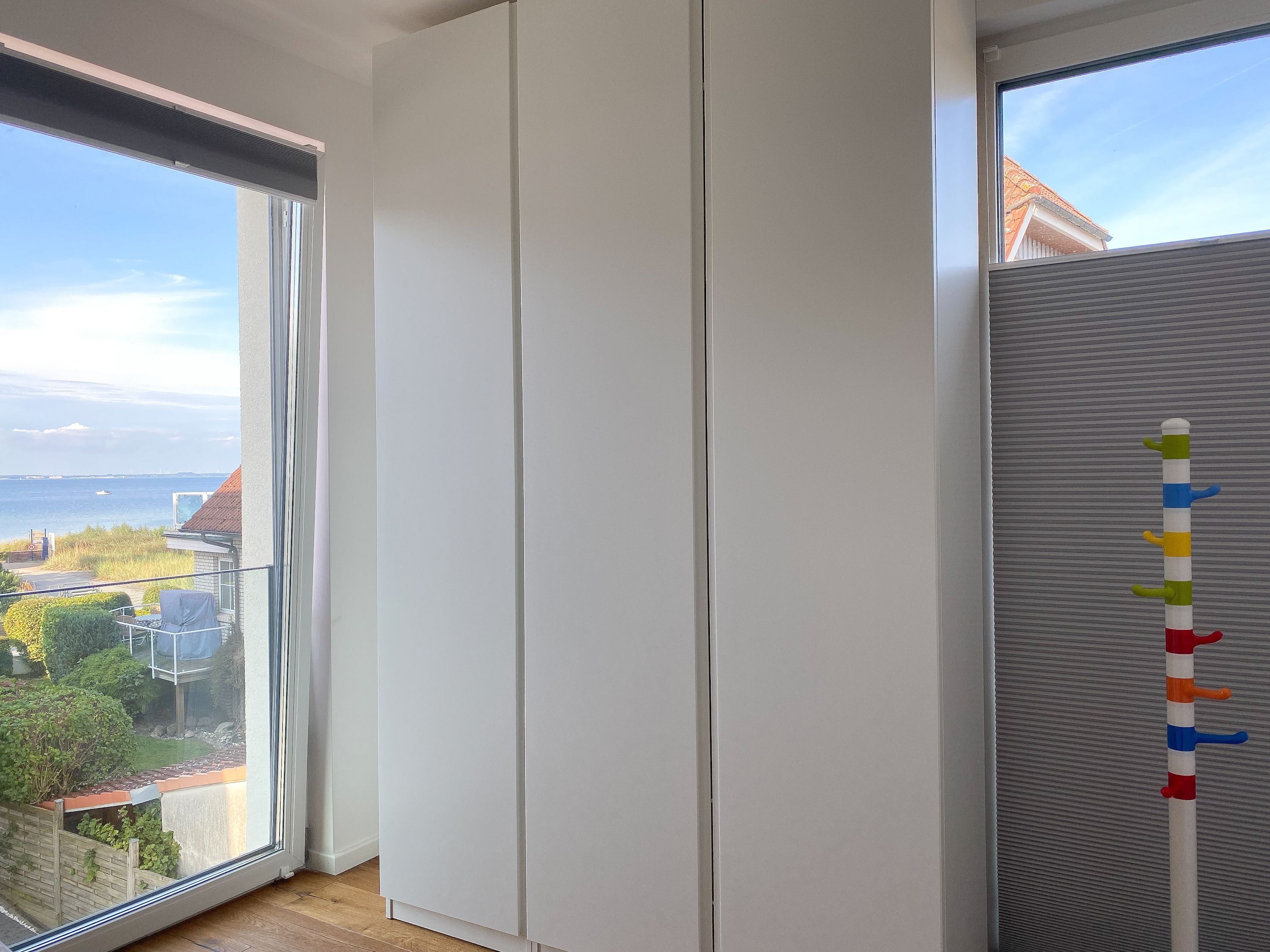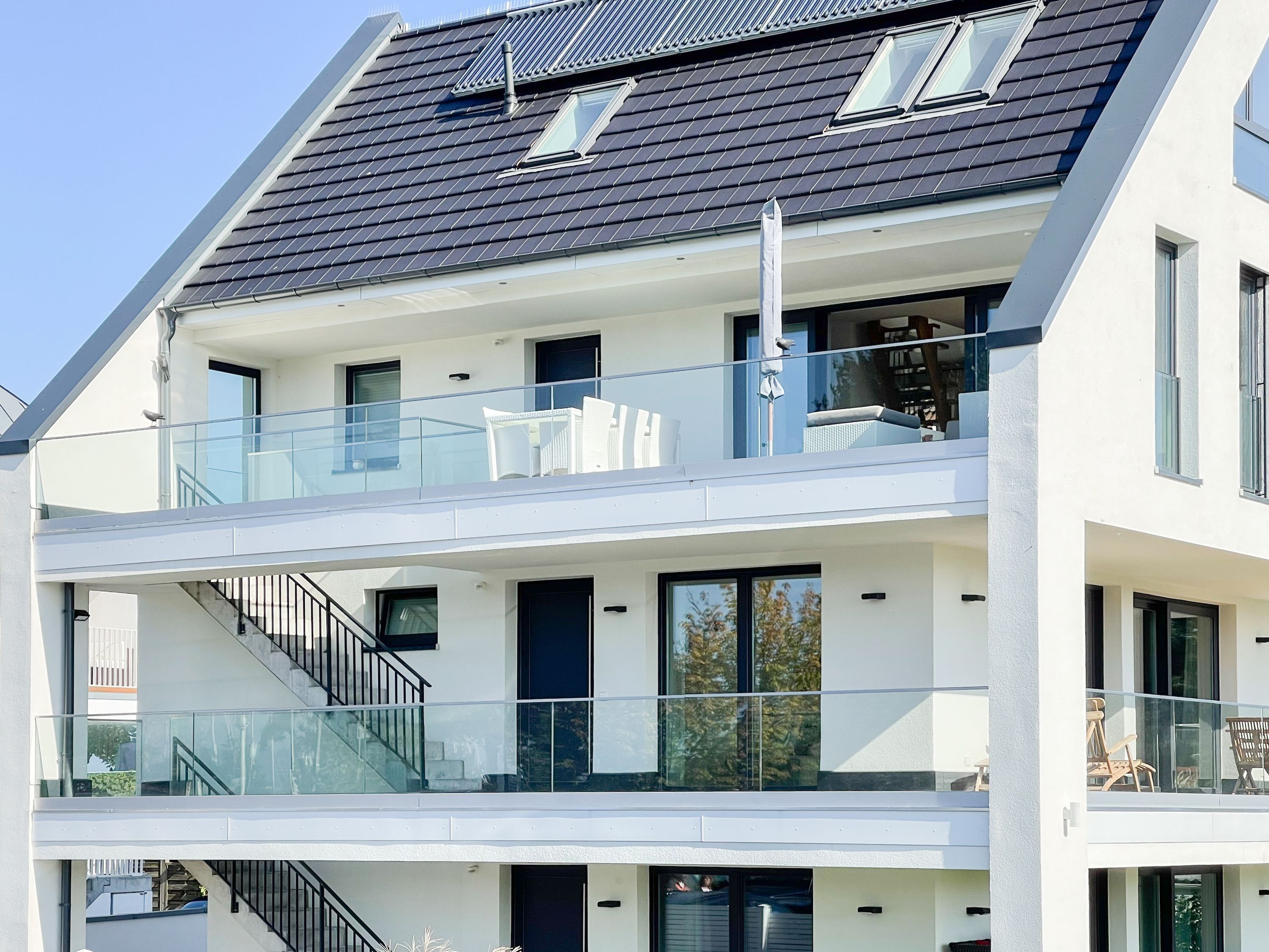 Das einzigartige Penthouse erstreckt sich über 2 Ebenen und liegt im 2. Obergeschoss eines modernen Neubaus mit nur 3 Wohneinheiten. Auf 130 qm Wohnfläche mit 2 Schlafzimmern, 2 separaten Bädern und 2 Wohnbereichen können 4 Personen einen entspannten Urlaub verleben. Auf der unteren Wohnebene erwartet Sie ein Schlafzimmer mit Doppelbett, Verdunkelungsplissees und Ostseeblick, ein Duschbad sowie ein offener Wohn- Essbereich, TV und eine integrierte moderne Einbauküche. Bodentiefe Fensterelemente bieten einem phantastischen Ausblick auf die Ostsee und die ein- und ausfahrenden Schiffe vom Fischkutter bis zur Motoryacht. Echtholzböden und Fußbodenheizung sorgen für ein angenehmes Raumklima. Die sehr großzügig angelegte Dachterrasse vor dem Wohnbereich ist mit einer Gartenlounge und einem Essbereich ausgestattet. Genießen Sie viele Sonnenstunden, die einzigartige Hafenatmosphäre und beeindruckende Sonnenuntergänge bei einem Glas Wein. Vor dem Essbereich befindet sich eine weitere Dachterrasse mit Bistrotisch und 2 Stühlen, um die ersten Sonnenstrahlen mit Ostseeblick bei einem Morgenkaffee zu genießen. Die zweite Wohnebene ist über eine schmale recht steile Raumspartreppe zu erreichen. Hier erwartet Sie ein weiterer Wohnbereich mit traumhaftem Blick auf den Hafen und das zweite Schlafzimmer mit TV, Ostseeblick und Verdunkelungsplissees, ebenfalls mit Doppelbett (160x200) sowie ein weiteres Duschbad.