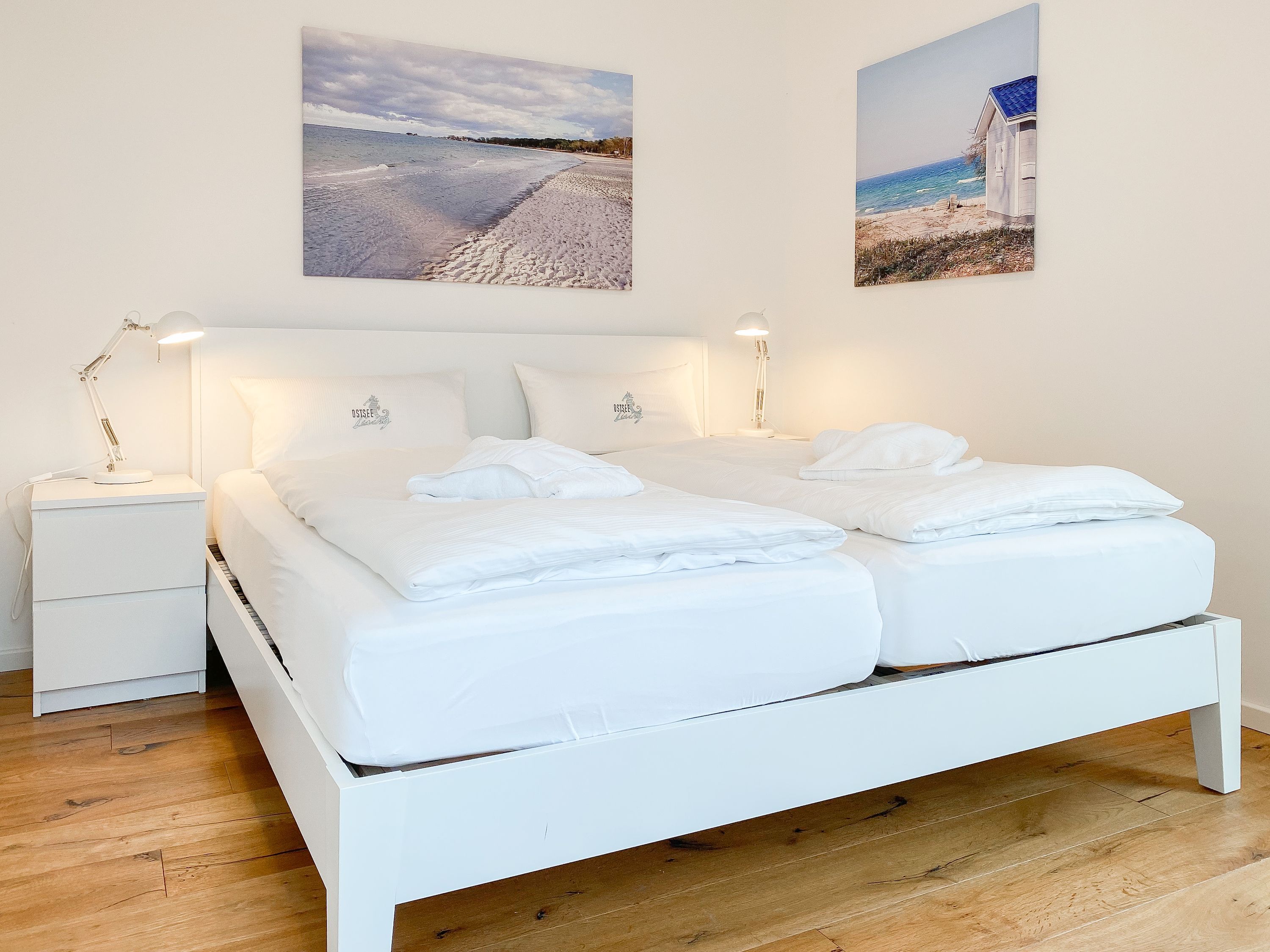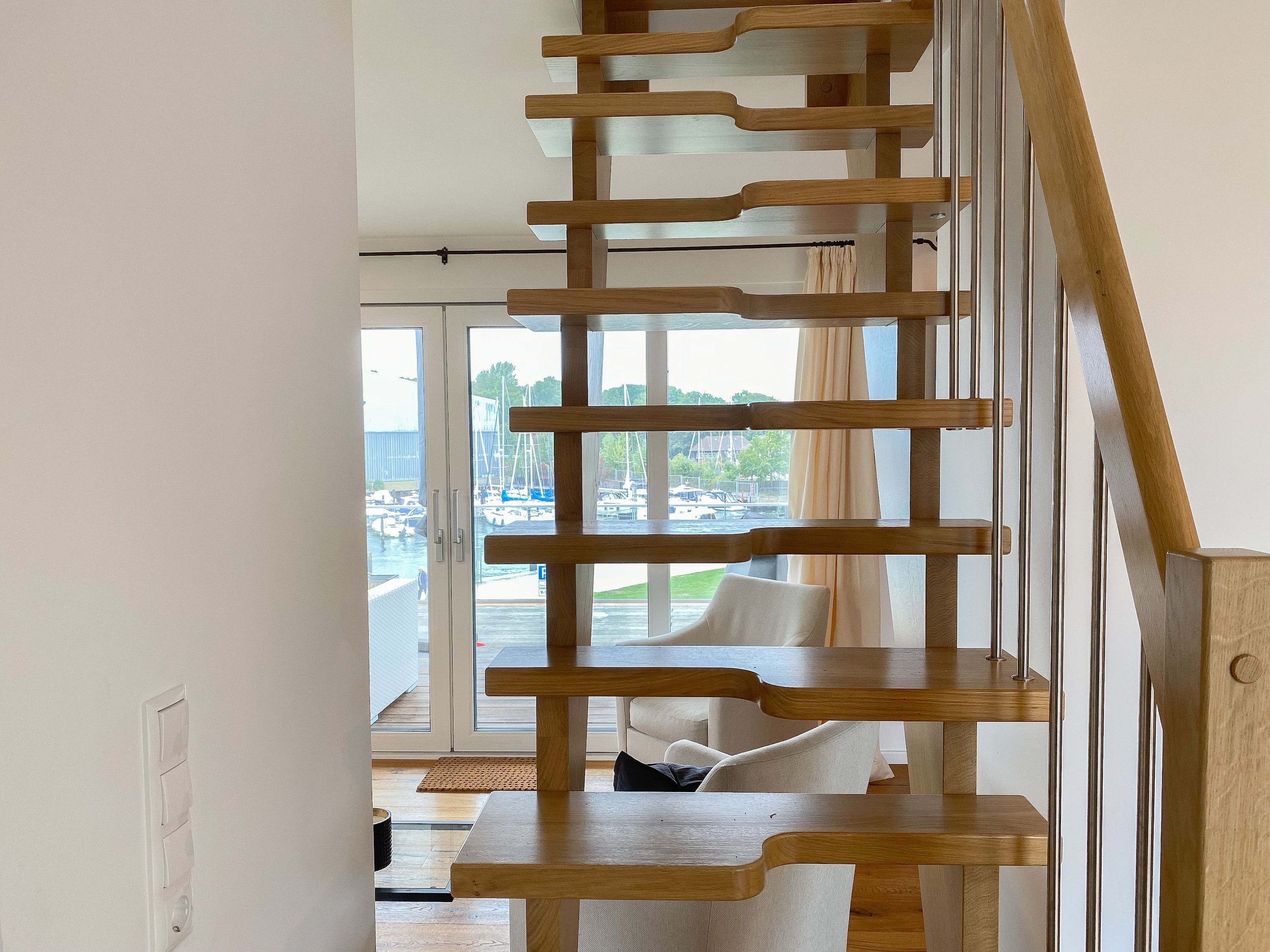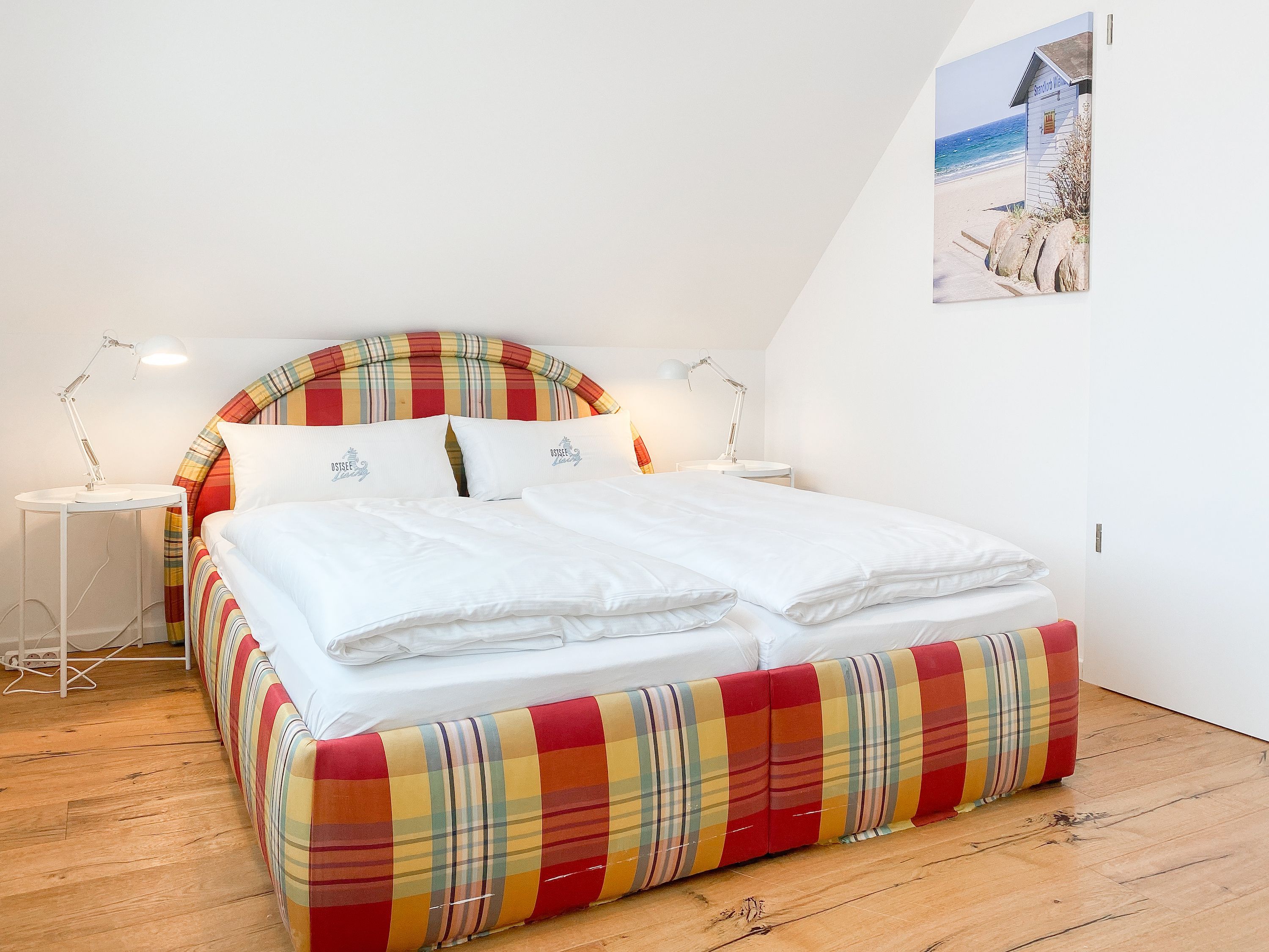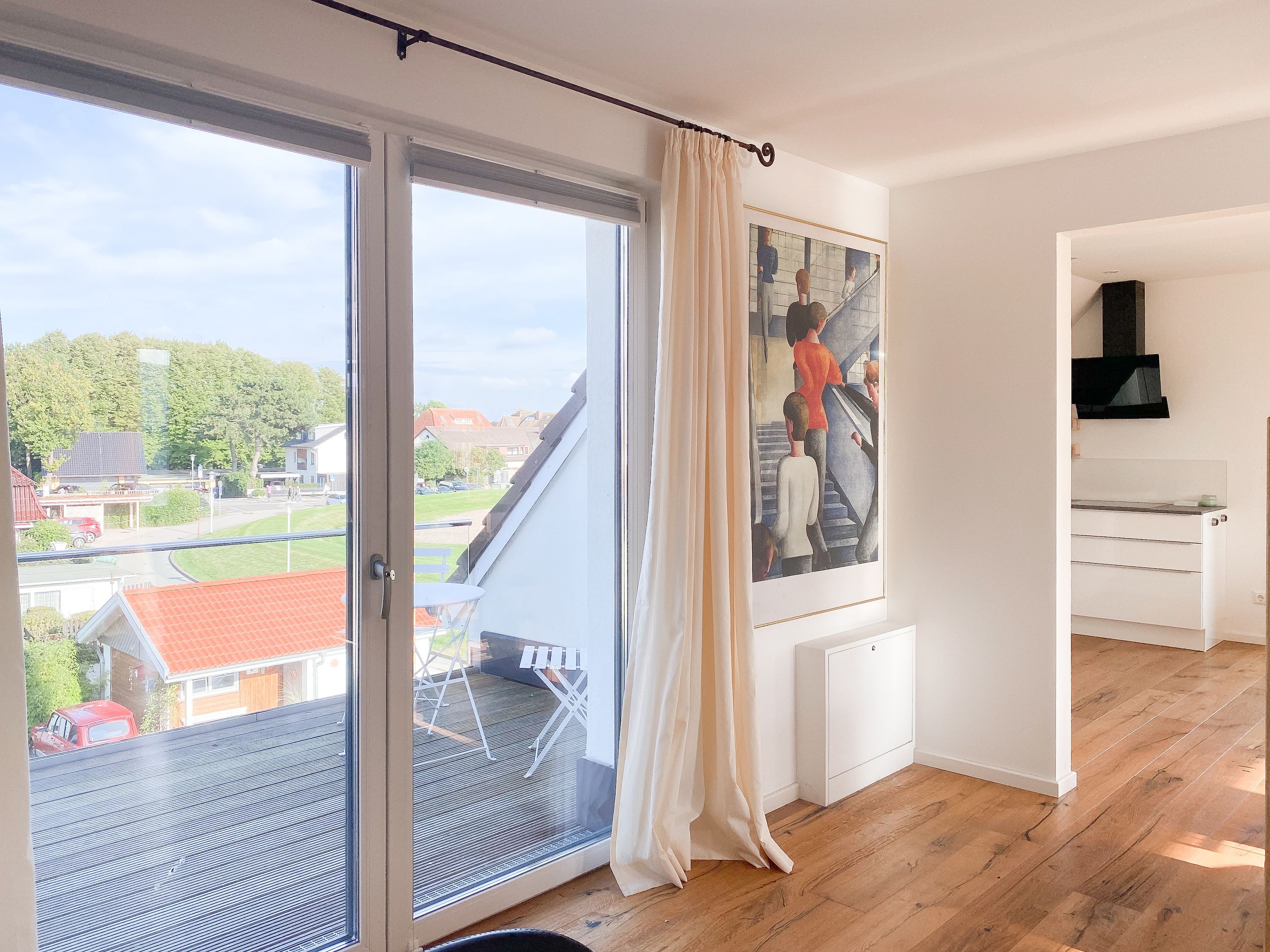 Das einzigartige Penthouse erstreckt sich über 2 Ebenen und liegt im 2. Obergeschoss eines modernen Neubaus mit nur 3 Wohneinheiten. Auf 130 qm Wohnfläche mit 2 Schlafzimmern, 2 separaten Bädern und 2 Wohnbereichen können 4 Personen einen entspannten Urlaub verleben. Auf der unteren Wohnebene erwartet Sie ein Schlafzimmer mit Doppelbett, Verdunkelungsplissees und Ostseeblick, ein Duschbad sowie ein offener Wohn- Essbereich, TV und eine integrierte moderne Einbauküche. Bodentiefe Fensterelemente bieten einem phantastischen Ausblick auf die Ostsee und die ein- und ausfahrenden Schiffe vom Fischkutter bis zur Motoryacht. Echtholzböden und Fußbodenheizung sorgen für ein angenehmes Raumklima. Die sehr großzügig angelegte Dachterrasse vor dem Wohnbereich ist mit einer Gartenlounge und einem Essbereich ausgestattet. Genießen Sie viele Sonnenstunden, die einzigartige Hafenatmosphäre und beeindruckende Sonnenuntergänge bei einem Glas Wein. Vor dem Essbereich befindet sich eine weitere Dachterrasse mit Bistrotisch und 2 Stühlen, um die ersten Sonnenstrahlen mit Ostseeblick bei einem Morgenkaffee zu genießen. Die zweite Wohnebene ist über eine schmale recht steile Raumspartreppe zu erreichen. Hier erwartet Sie ein weiterer Wohnbereich mit traumhaftem Blick auf den Hafen und das zweite Schlafzimmer mit TV, Ostseeblick und Verdunkelungsplissees, ebenfalls mit Doppelbett (160x200) sowie ein weiteres Duschbad.