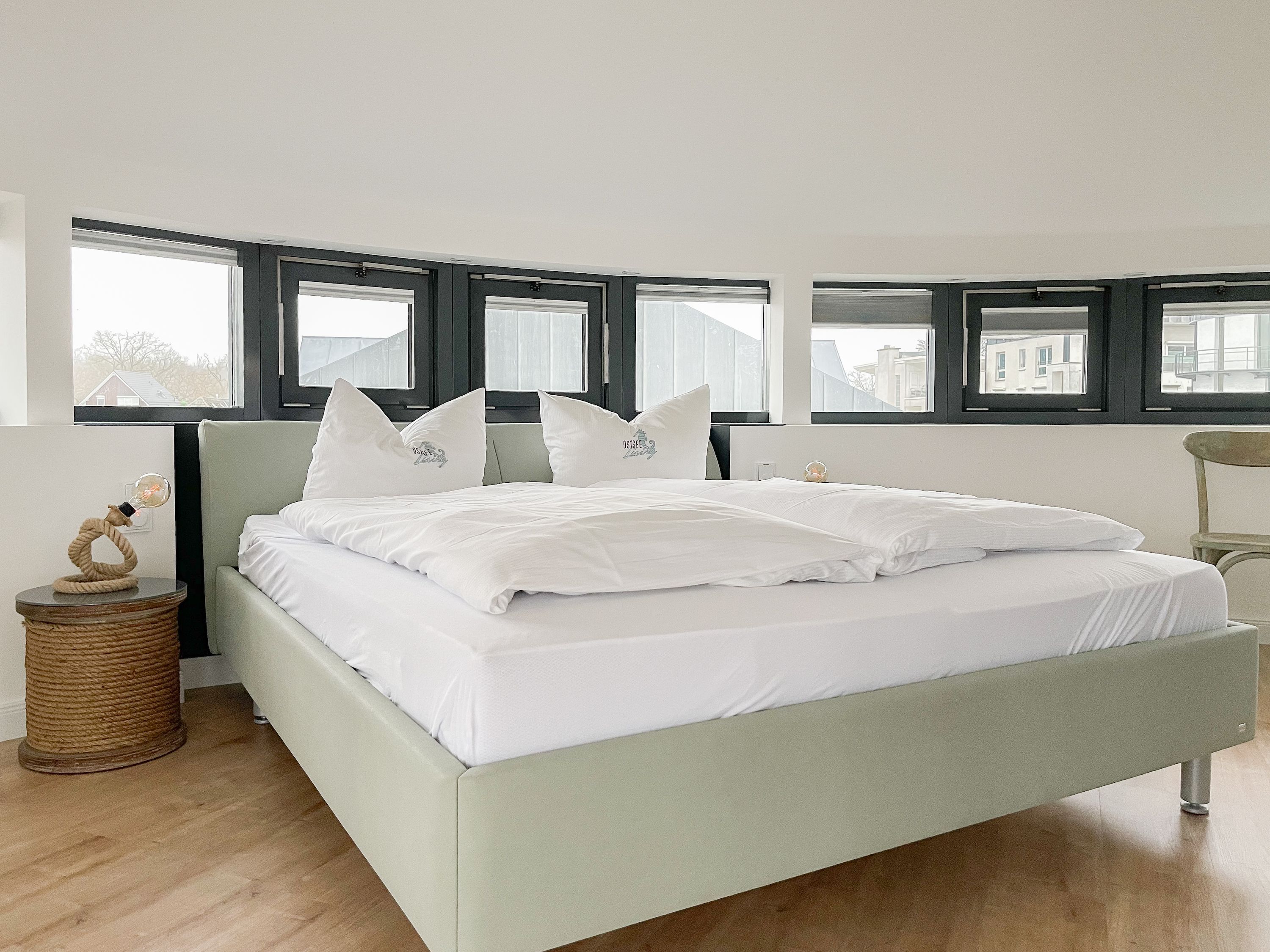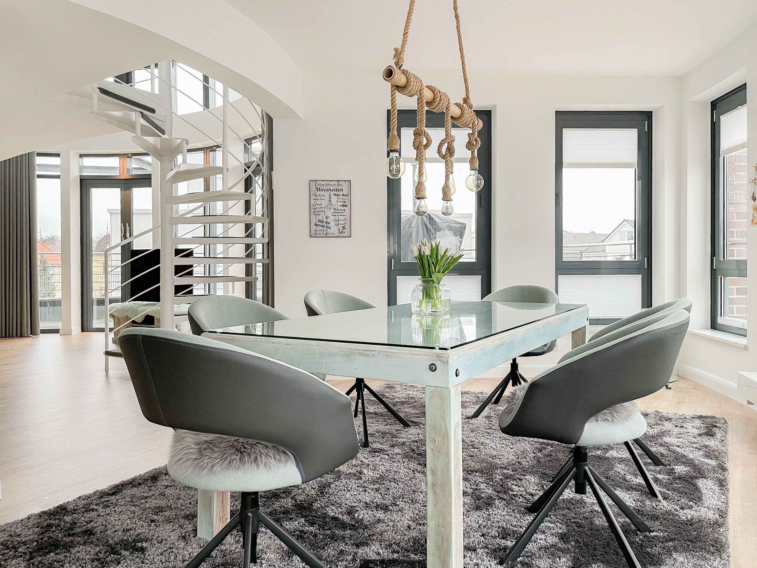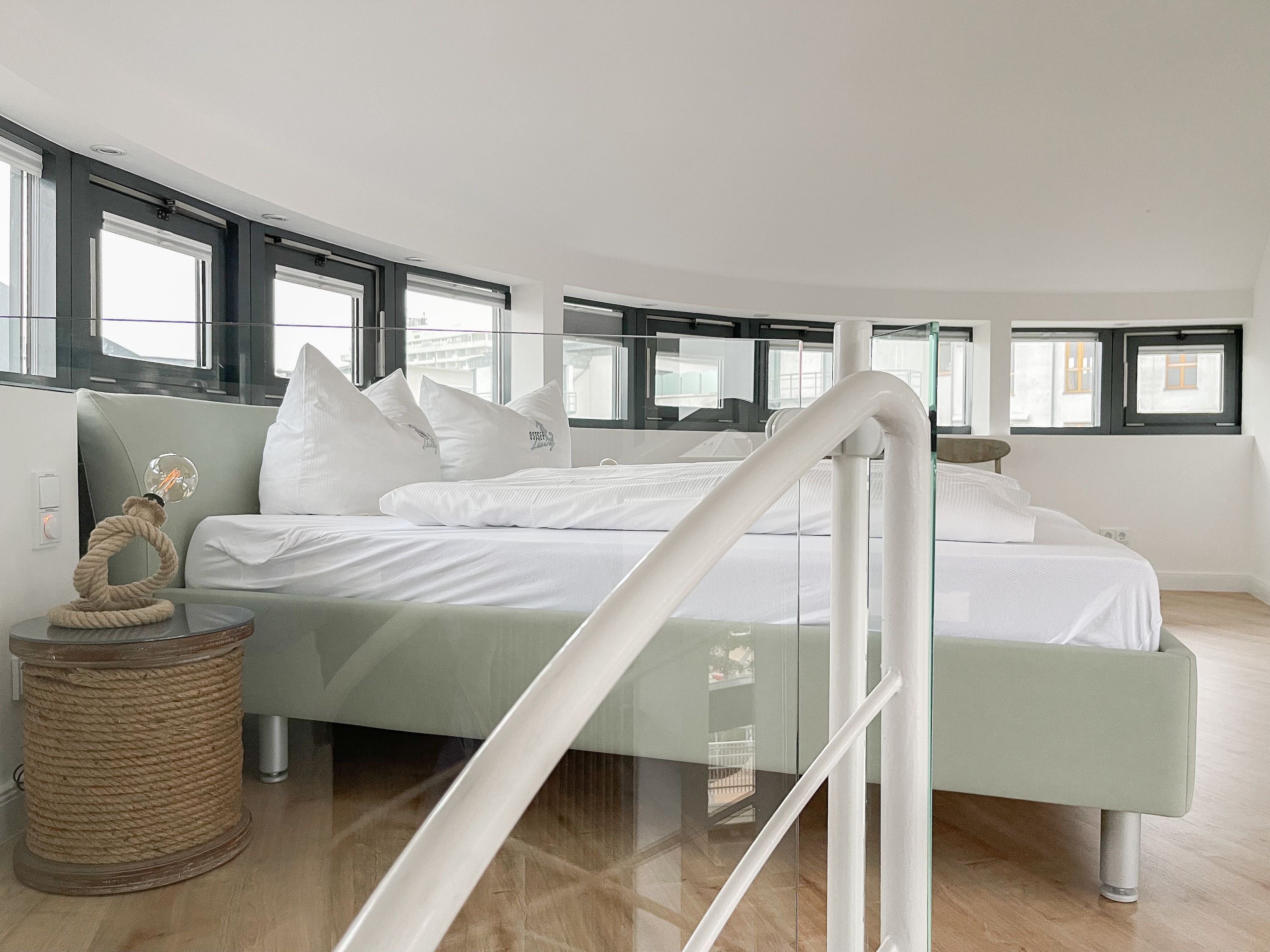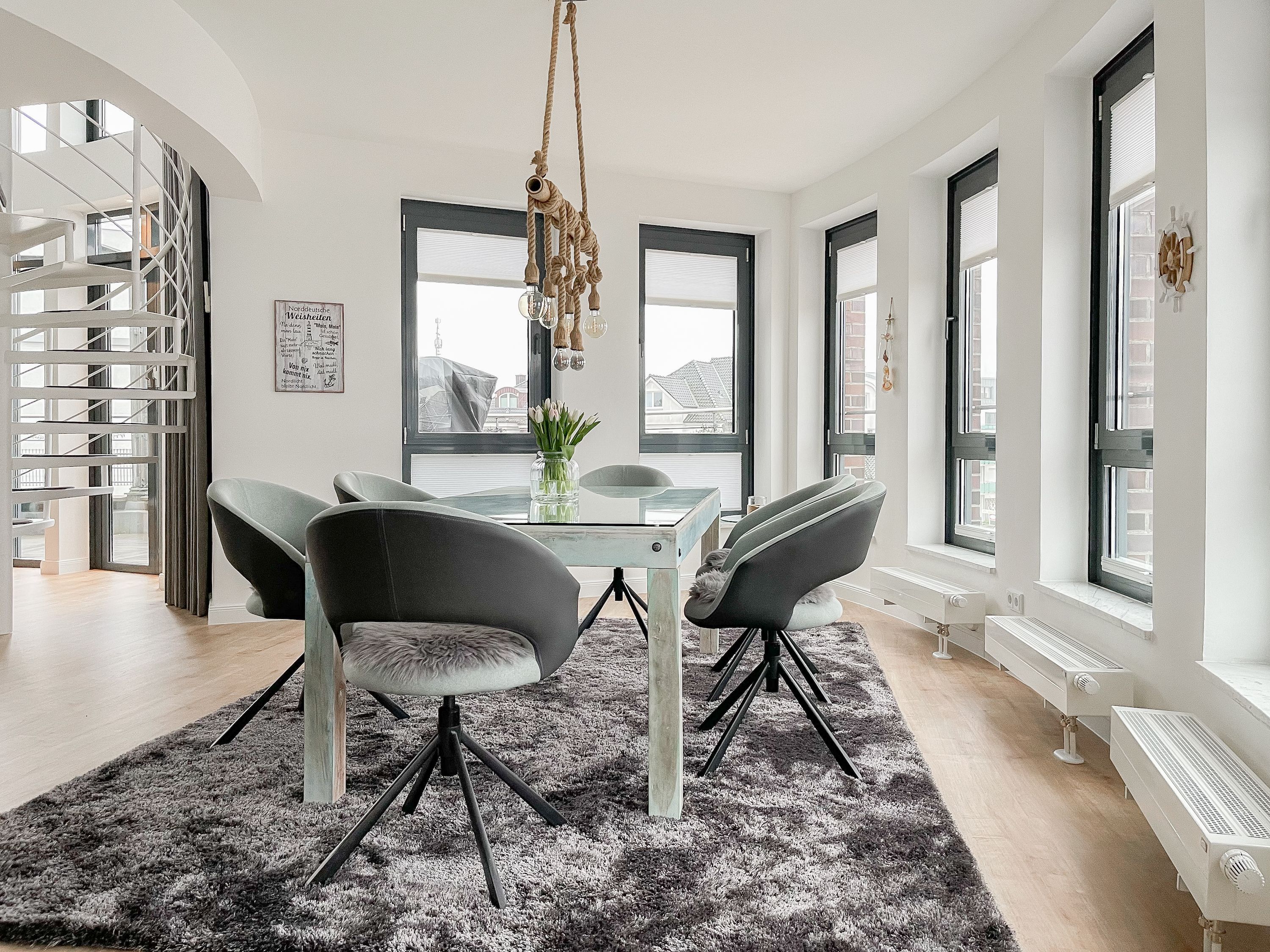 Das Penthouse Leuchtturm Lounge präsentiert sich als lichtdurchflutetes Loft mit unglaublich großzügigen Räumlichkeiten und einer faszinierenden Deckenhöhe über 2 Ebenen im Wohnbereich. Eine Wendeltreppe führt auf die riesige Empore, ein echtes architektonisches Highlight, eingerichtet mit einem traumhaften Schlafzimmer mit Klimaanlage und TV, einem Büro und kleinem exklusiven Duschbad ensuite. Ein weiteres Highlight ist definitiv die riesige Dachterrasse in Südausrichtung für viele gemeinsame Sonnenstunden, die mit einer Essgruppe und XXL Strandkorb ausgestattet ist. Im überaus weitläufigen Wohn- Essbereich mit anschließender Wohnküche in top Ausstattung, spielt sich das Leben ab. Die gemütliche Sofalandschaft und der großzügige Essbereich bieten viel Raum, um einen entspannten Urlaub zu verleben. Durch die Kombination von anspruchsvollem Design, hochwertigen Materialien und warmen Farben ist es der Innenarchitektin gelungen, eine wunderbare Wohnatmosphäre zu schaffen. Es gibt 2 weitere großzügige Schlafzimmer, die wie auch das Emporenschlafzimmer über hochwertige Ruf Boxspringbetten (180x200), Einbauschränke, TV und Verdunkelungsplissees verfügen sowie ein weiteres exklusives Duschbad. Beide Bäder sind mit einem Radio ausgestattet. Eine Waschmaschine ist in die Küche integriert. Zum Penthouse (2. Etage) gehört ein reservierter Stellplatz in der Tiefgarage ( Einfahrtshöhe 1,90 m ). Ein Fahrstuhl ist nicht vorhanden. Das Penthouse ist aufgrund der offenen Treppe und Empore nicht unbedingt für Kleinkinder geeignet.