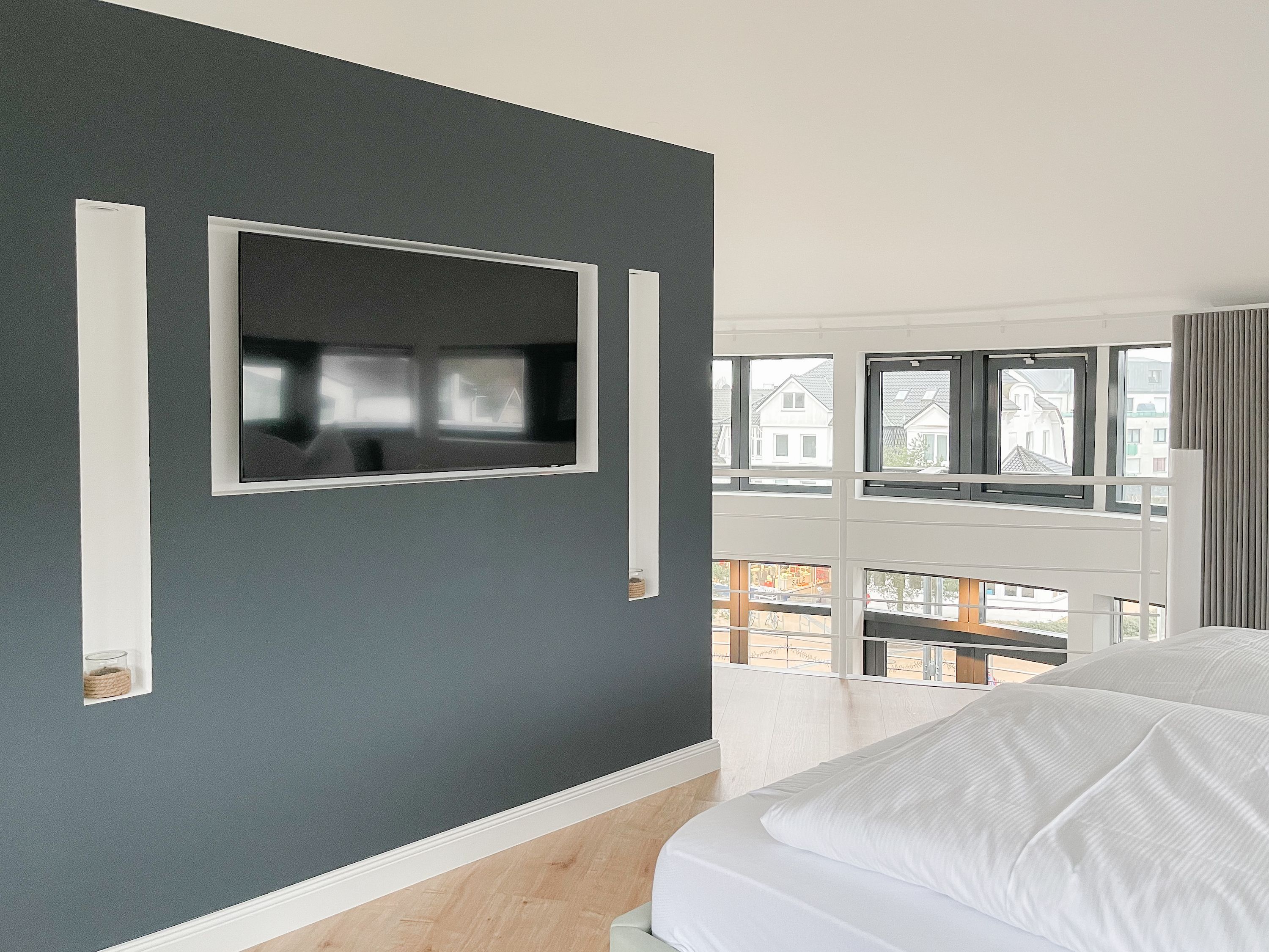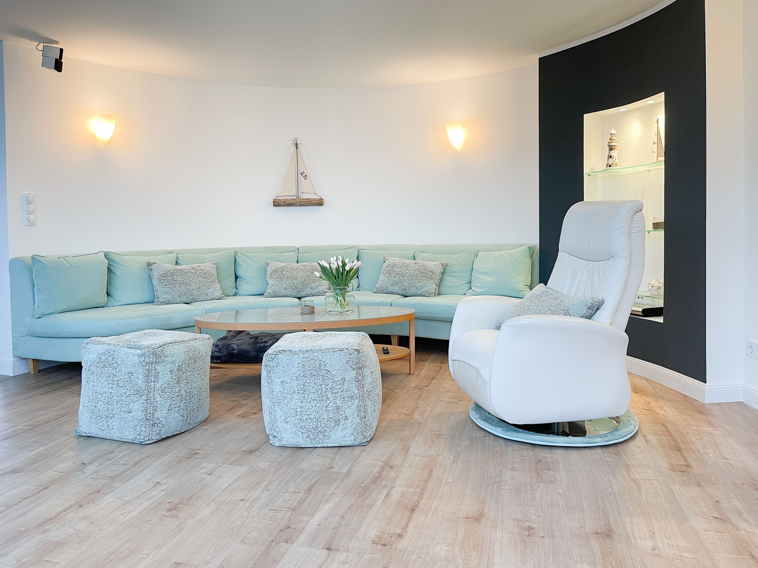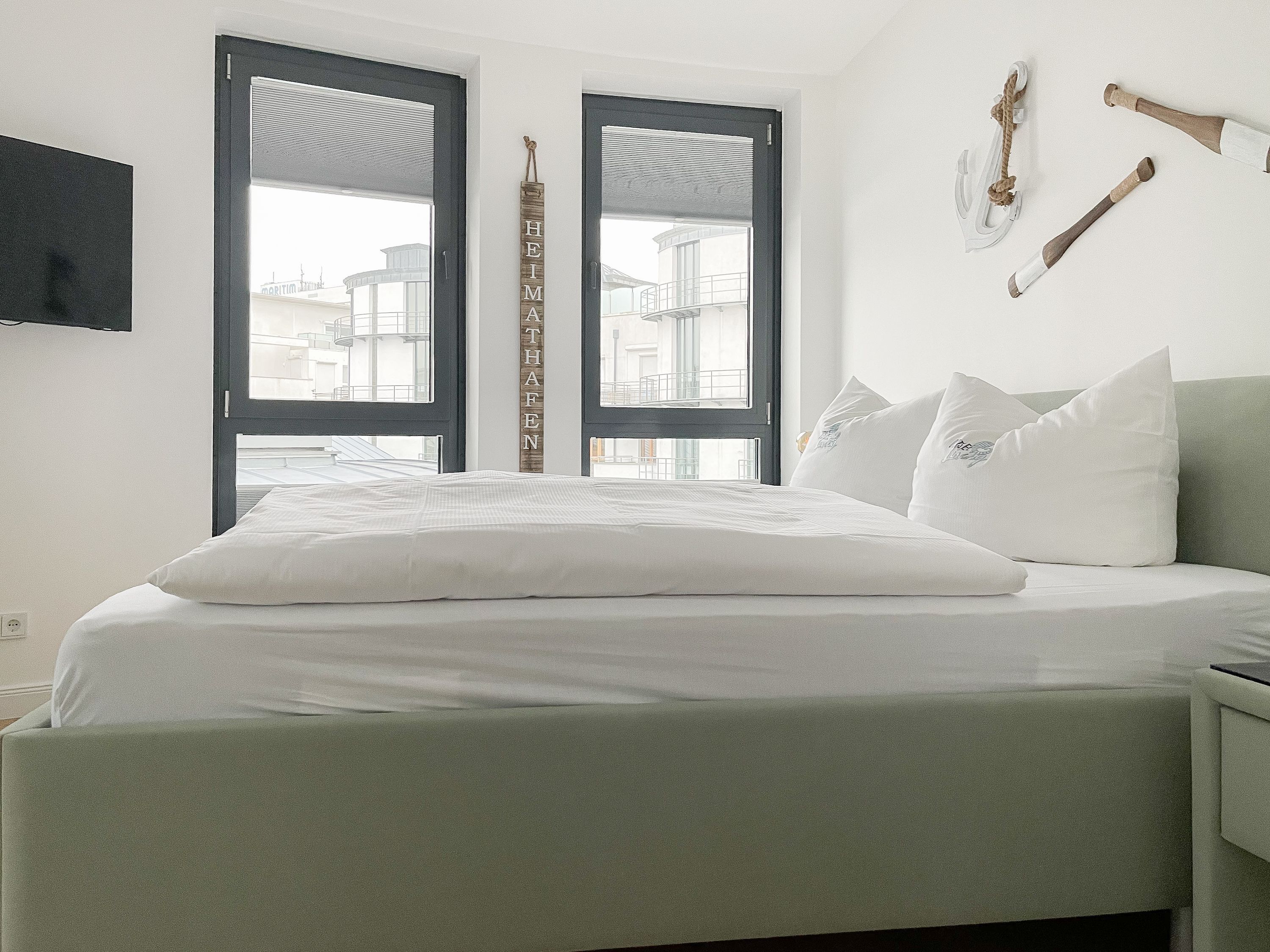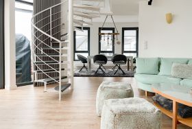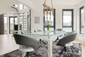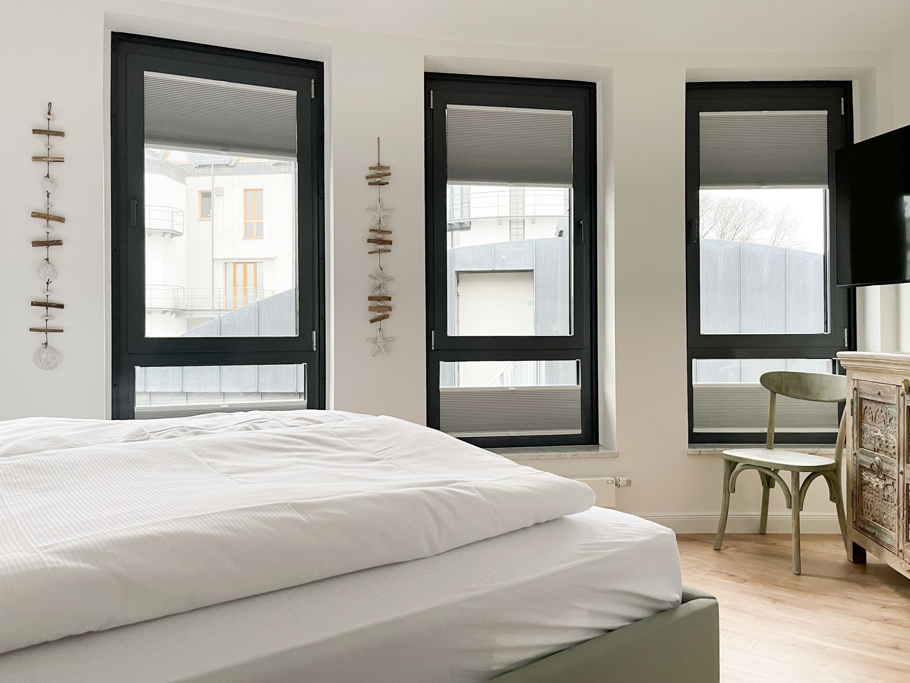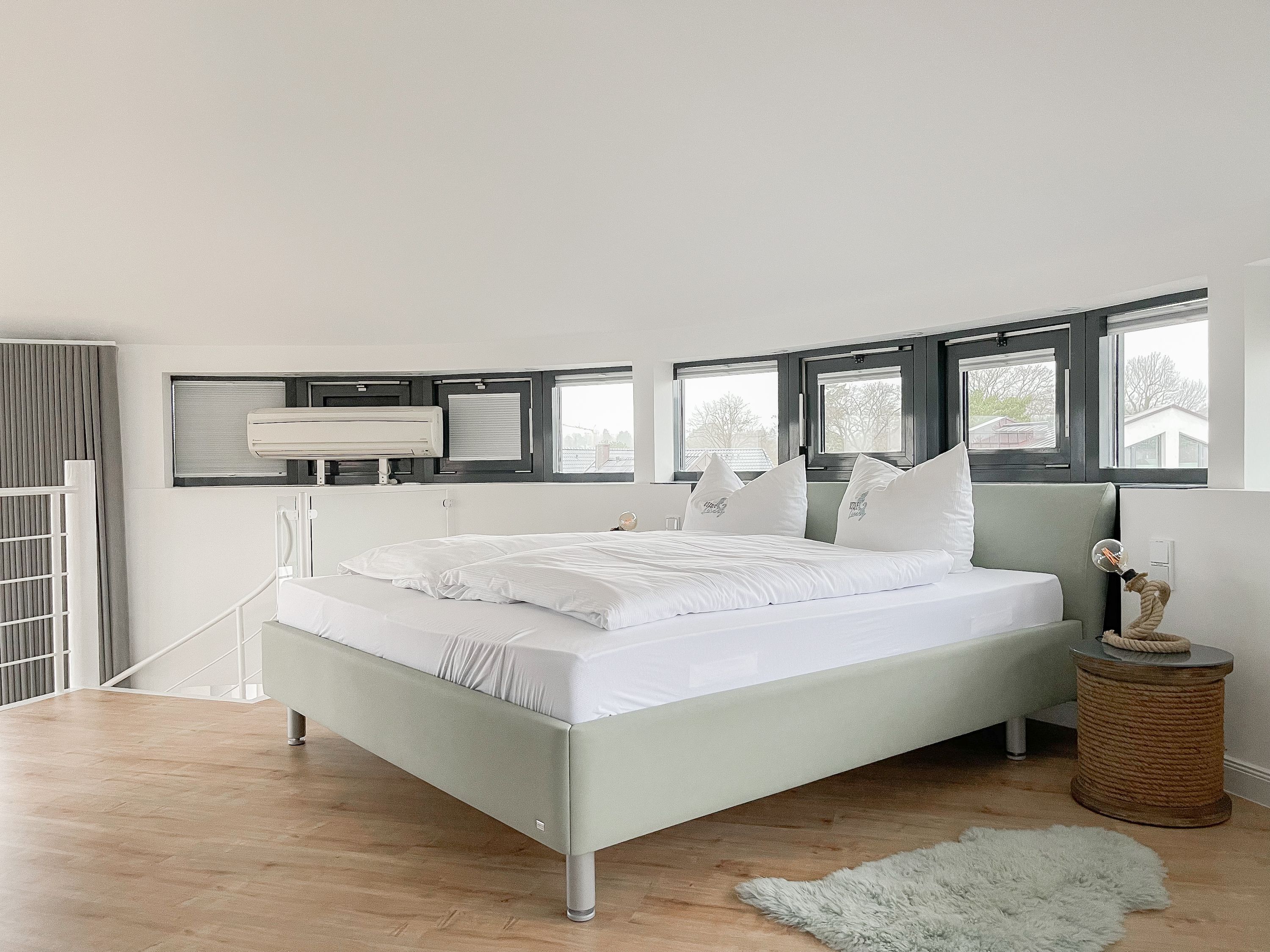Das Penthouse Leuchtturm Lounge präsentiert sich als lichtdurchflutetes Loft mit unglaublich großzügigen Räumlichkeiten und einer faszinierenden Deckenhöhe über 2 Ebenen im Wohnbereich. Eine Wendeltreppe führt auf die riesige Empore, ein echtes architektonisches Highlight, eingerichtet mit einem traumhaften Schlafzimmer mit Klimaanlage und TV, einem Büro und kleinem exklusiven Duschbad ensuite. Ein weiteres Highlight ist definitiv die riesige Dachterrasse in Südausrichtung für viele gemeinsame Sonnenstunden, die mit einer Essgruppe und XXL Strandkorb ausgestattet ist. Im überaus weitläufigen Wohn- Essbereich mit anschließender Wohnküche in top Ausstattung, spielt sich das Leben ab. Die gemütliche Sofalandschaft und der großzügige Essbereich bieten viel Raum, um einen entspannten Urlaub zu verleben. Durch die Kombination von anspruchsvollem Design, hochwertigen Materialien und warmen Farben ist es der Innenarchitektin gelungen, eine wunderbare Wohnatmosphäre zu schaffen. Es gibt 2 weitere großzügige Schlafzimmer, die wie auch das Emporenschlafzimmer über hochwertige Ruf Boxspringbetten (180x200), Einbauschränke, TV und Verdunkelungsplissees verfügen sowie ein weiteres exklusives Duschbad. Beide Bäder sind mit einem Radio ausgestattet. Eine Waschmaschine ist in die Küche integriert. Zum Penthouse (2. Etage) gehört ein reservierter Stellplatz in der Tiefgarage ( Einfahrtshöhe 1,90 m ). Ein Fahrstuhl ist nicht vorhanden. Das Penthouse ist aufgrund der offenen Treppe und Empore nicht unbedingt für Kleinkinder geeignet.