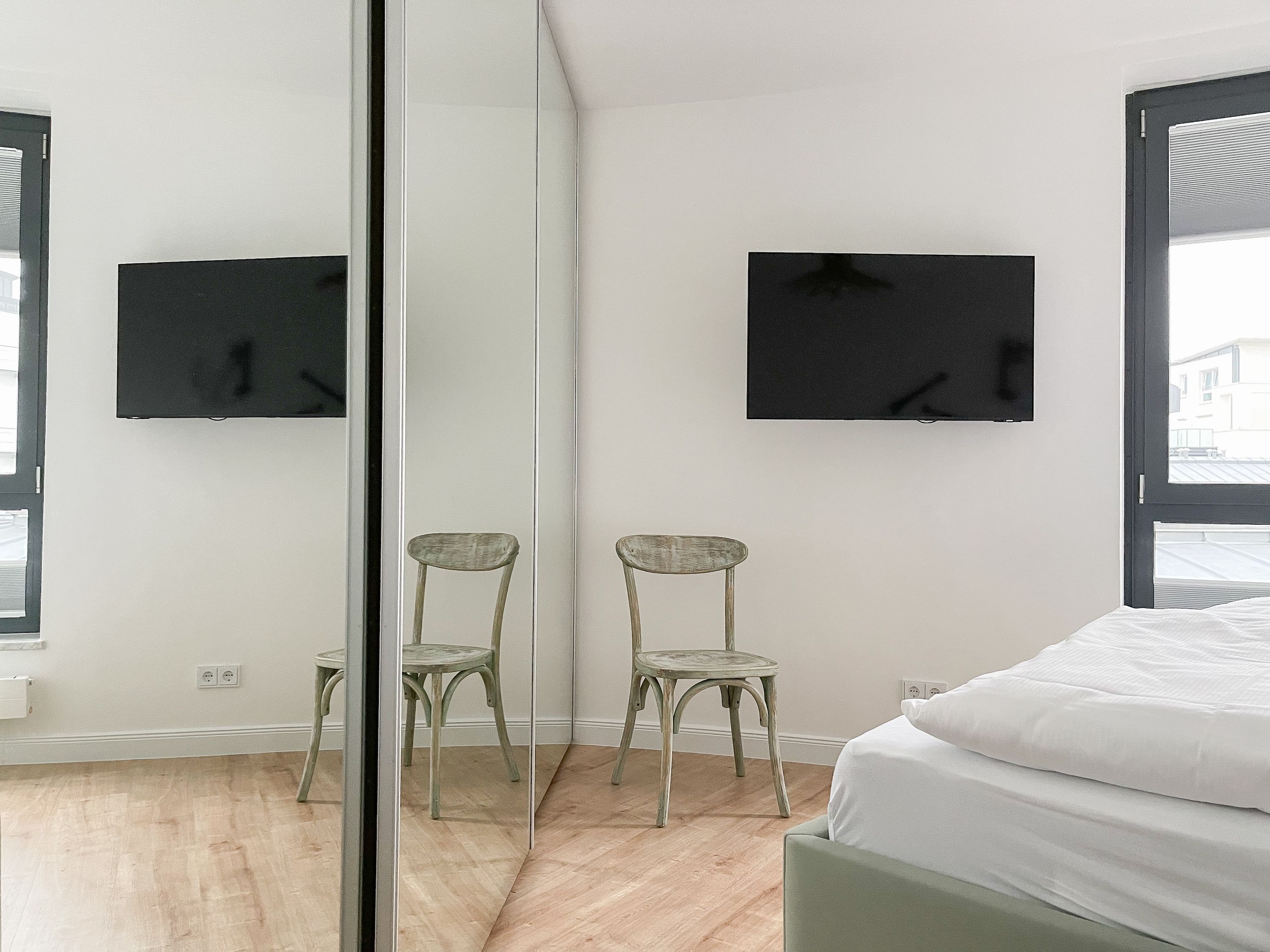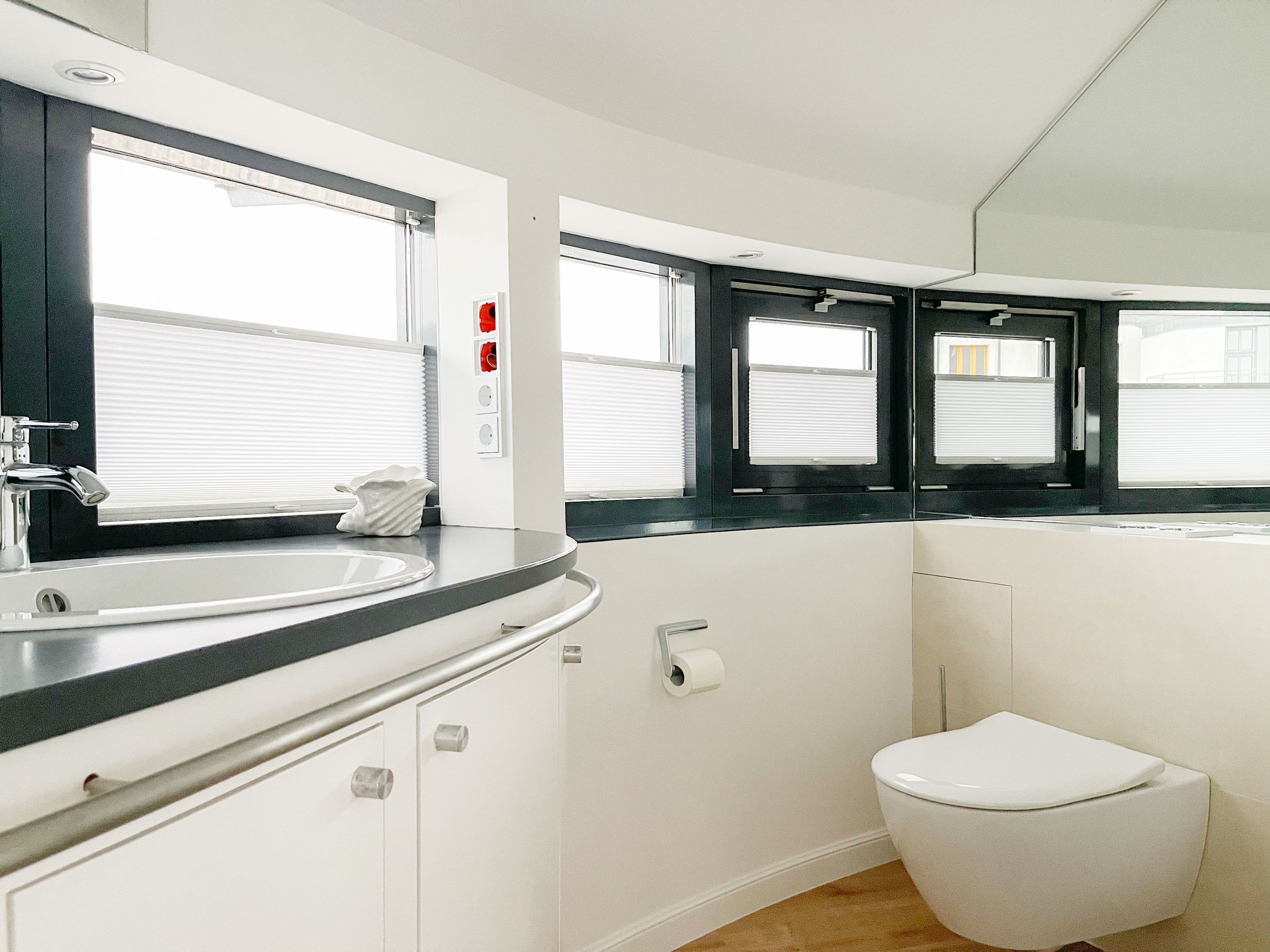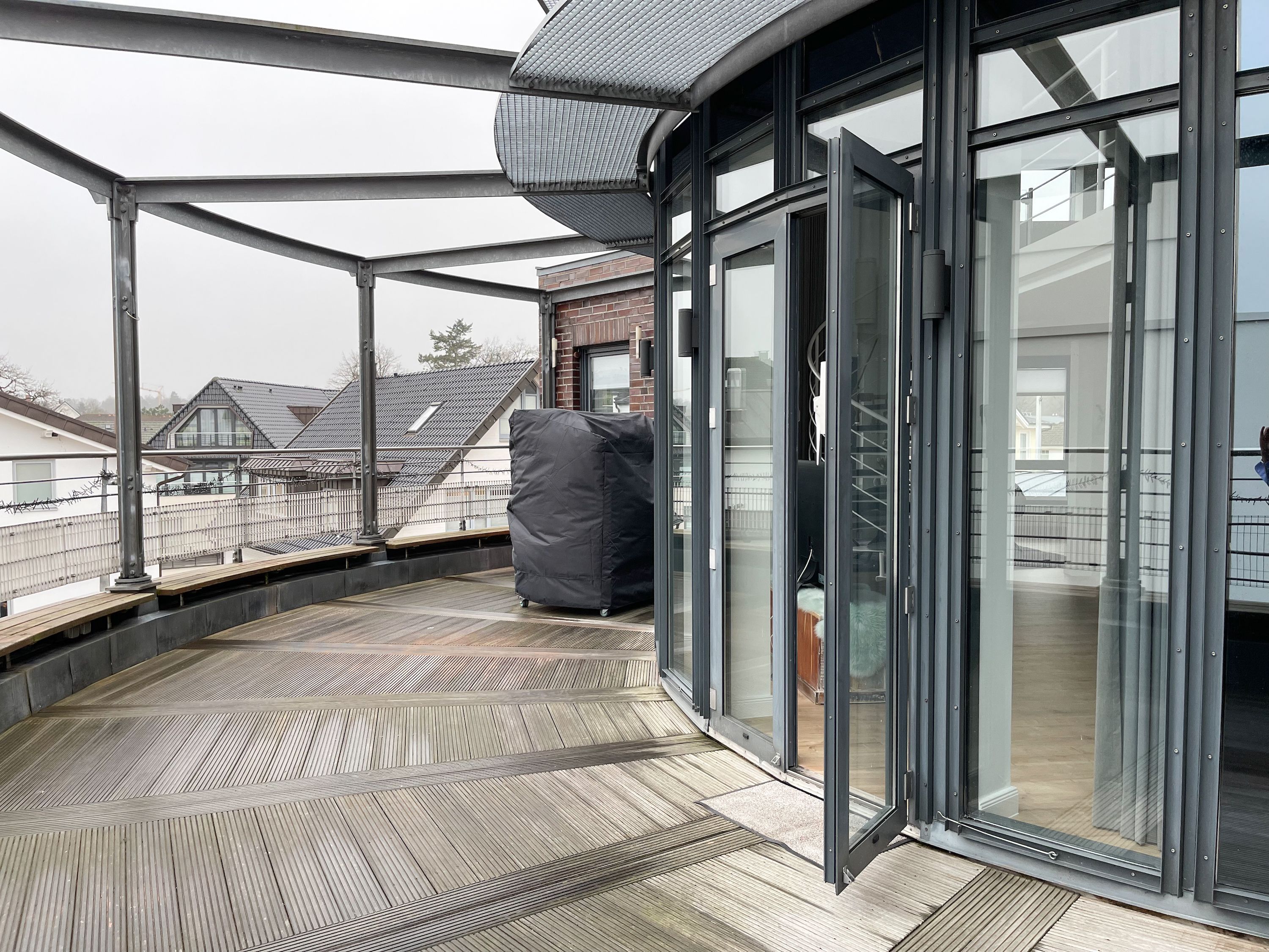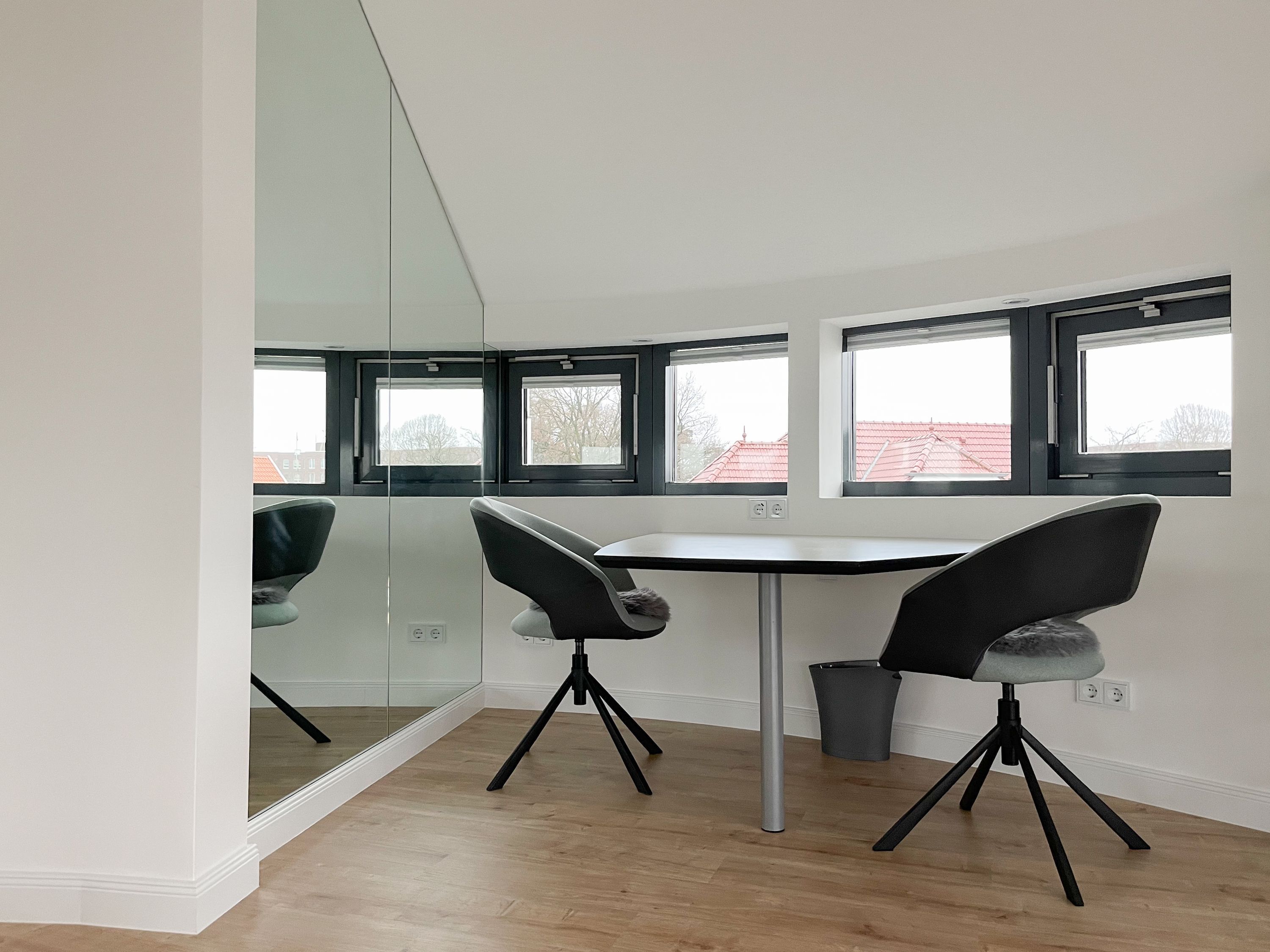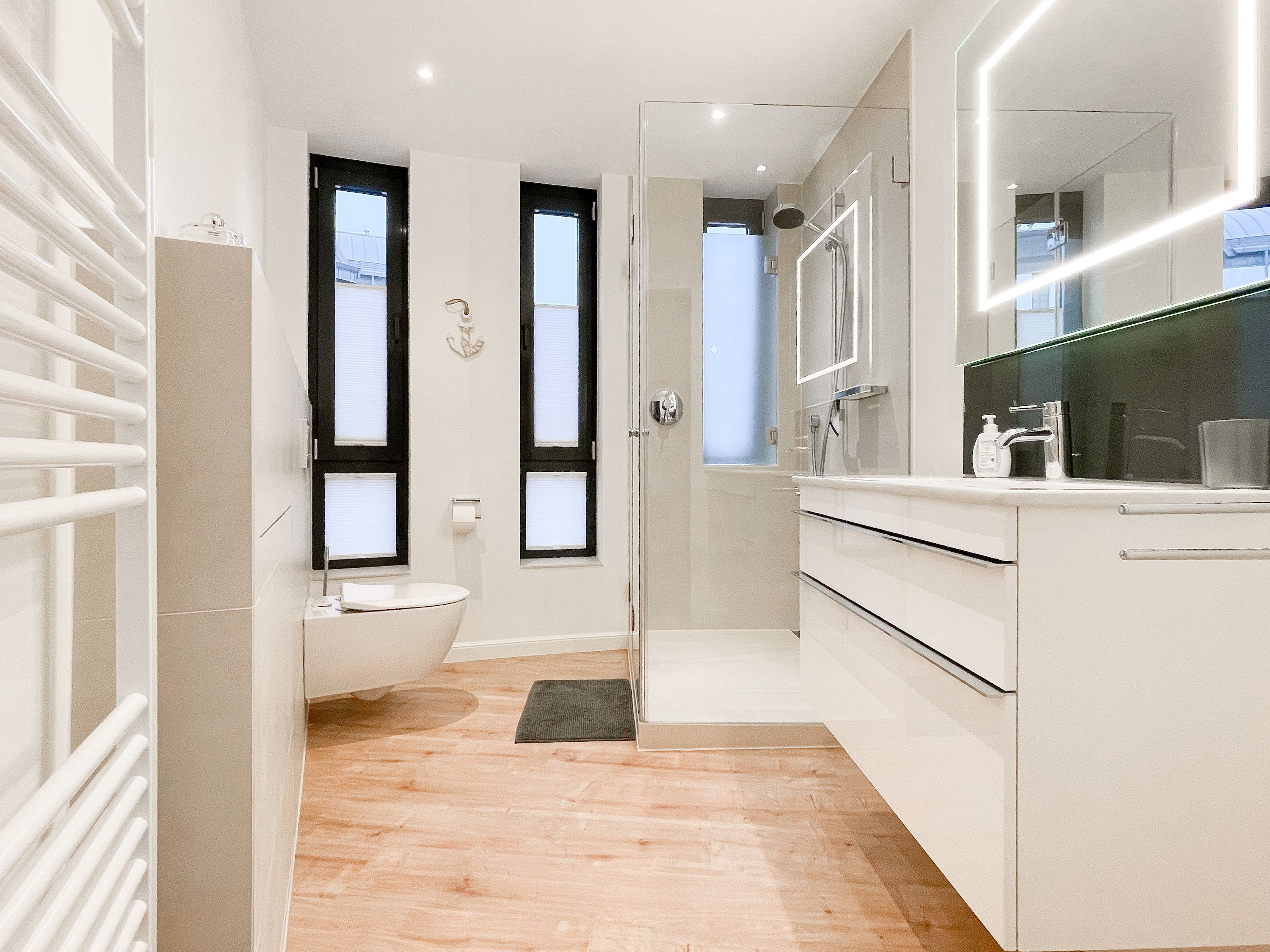 Das Penthouse Leuchtturm Lounge präsentiert sich als lichtdurchflutetes Loft mit unglaublich großzügigen Räumlichkeiten und einer faszinierenden Deckenhöhe über 2 Ebenen im Wohnbereich. Eine Wendeltreppe führt auf die riesige Empore, ein echtes architektonisches Highlight, eingerichtet mit einem traumhaften Schlafzimmer mit Klimaanlage und TV, einem Büro und kleinem exklusiven Duschbad ensuite. Ein weiteres Highlight ist definitiv die riesige Dachterrasse in Südausrichtung für viele gemeinsame Sonnenstunden, die mit einer Essgruppe und XXL Strandkorb ausgestattet ist. Im überaus weitläufigen Wohn- Essbereich mit anschließender Wohnküche in top Ausstattung, spielt sich das Leben ab. Die gemütliche Sofalandschaft und der großzügige Essbereich bieten viel Raum, um einen entspannten Urlaub zu verleben. Durch die Kombination von anspruchsvollem Design, hochwertigen Materialien und warmen Farben ist es der Innenarchitektin gelungen, eine wunderbare Wohnatmosphäre zu schaffen. Es gibt 2 weitere großzügige Schlafzimmer, die wie auch das Emporenschlafzimmer über hochwertige Ruf Boxspringbetten (180x200), Einbauschränke, TV und Verdunkelungsplissees verfügen sowie ein weiteres exklusives Duschbad. Beide Bäder sind mit einem Radio ausgestattet. Eine Waschmaschine ist in die Küche integriert. Zum Penthouse (2. Etage) gehört ein reservierter Stellplatz in der Tiefgarage ( Einfahrtshöhe 1,90 m ). Ein Fahrstuhl ist nicht vorhanden. Das Penthouse ist aufgrund der offenen Treppe und Empore nicht unbedingt für Kleinkinder geeignet.