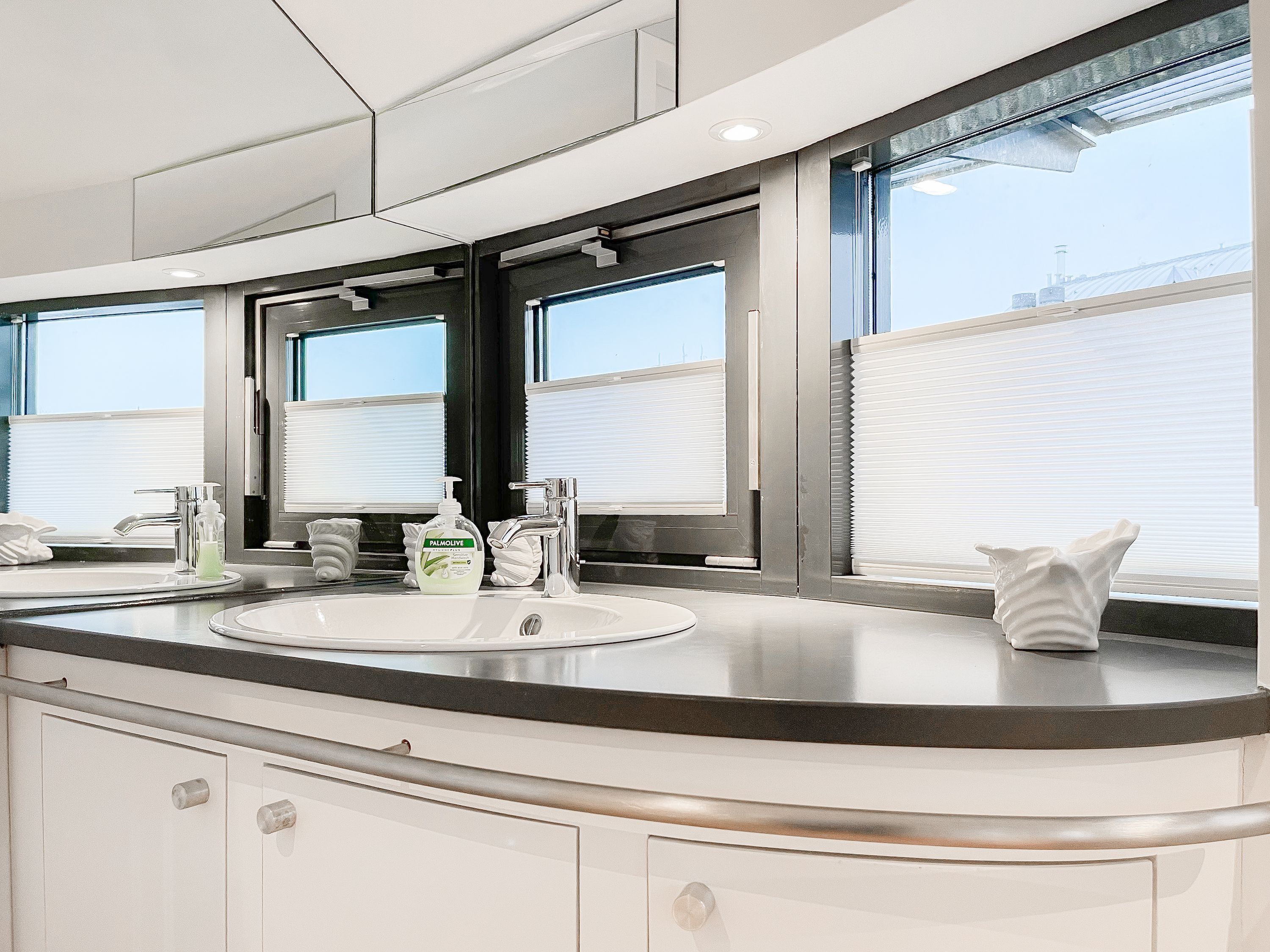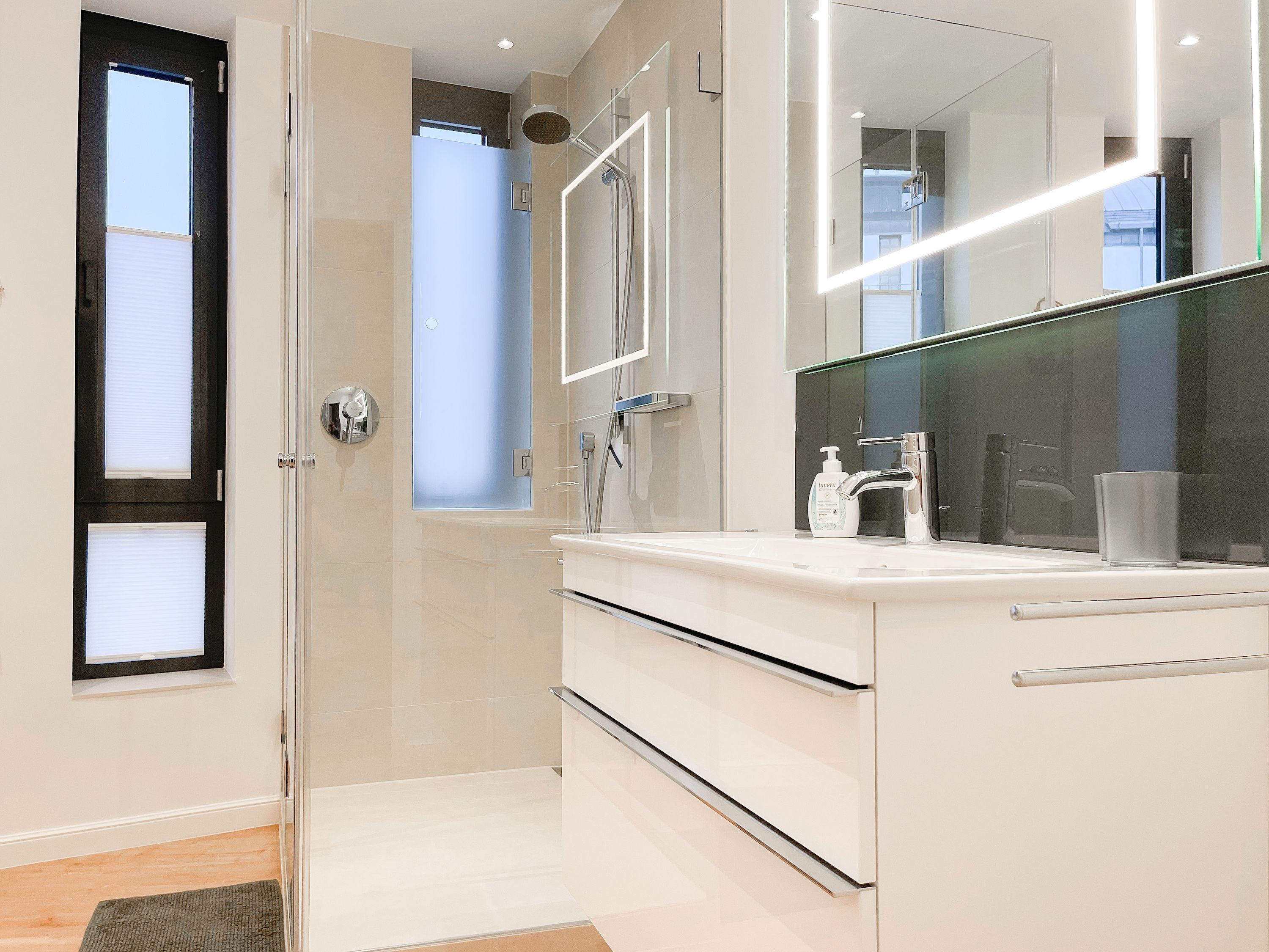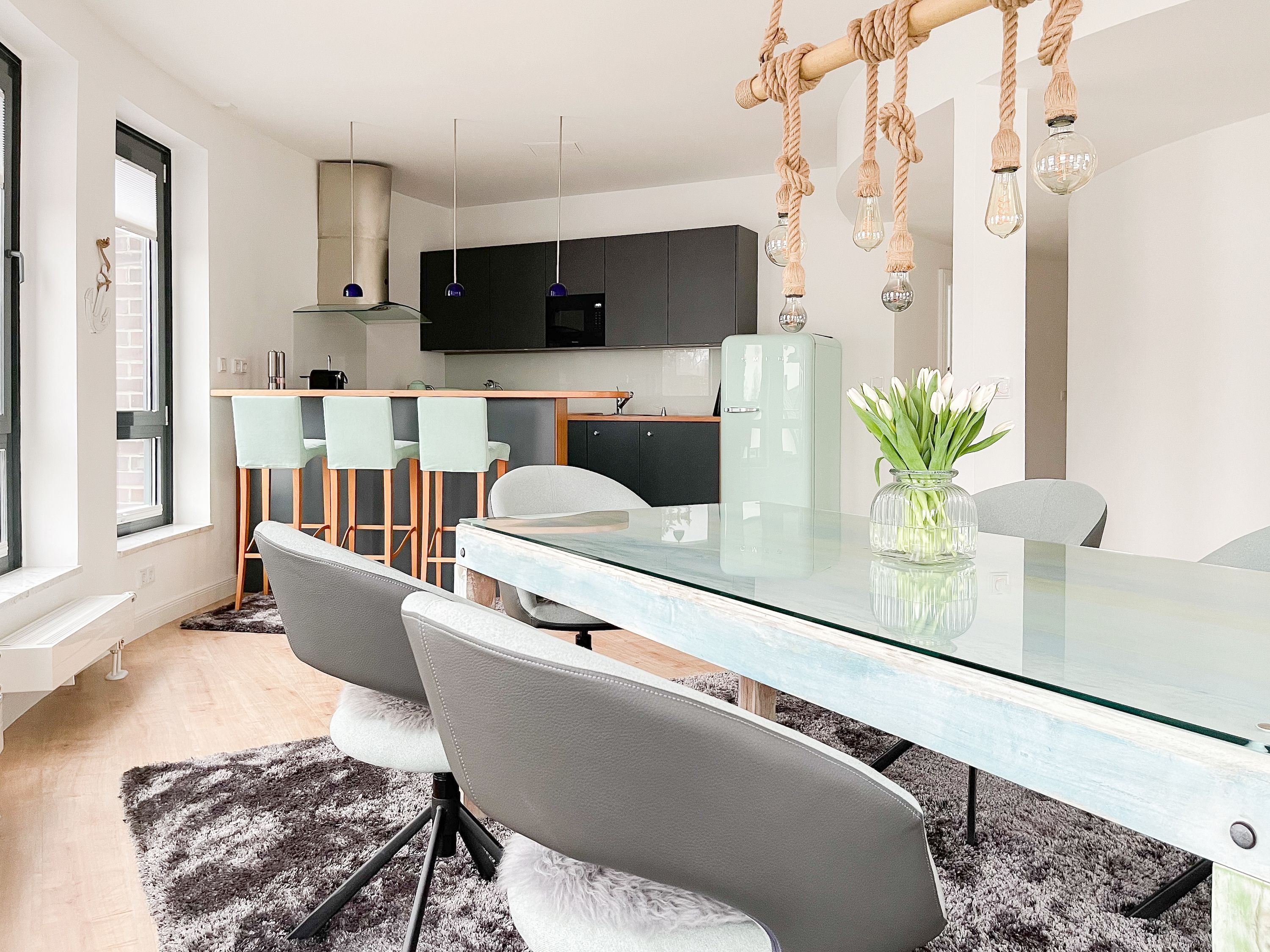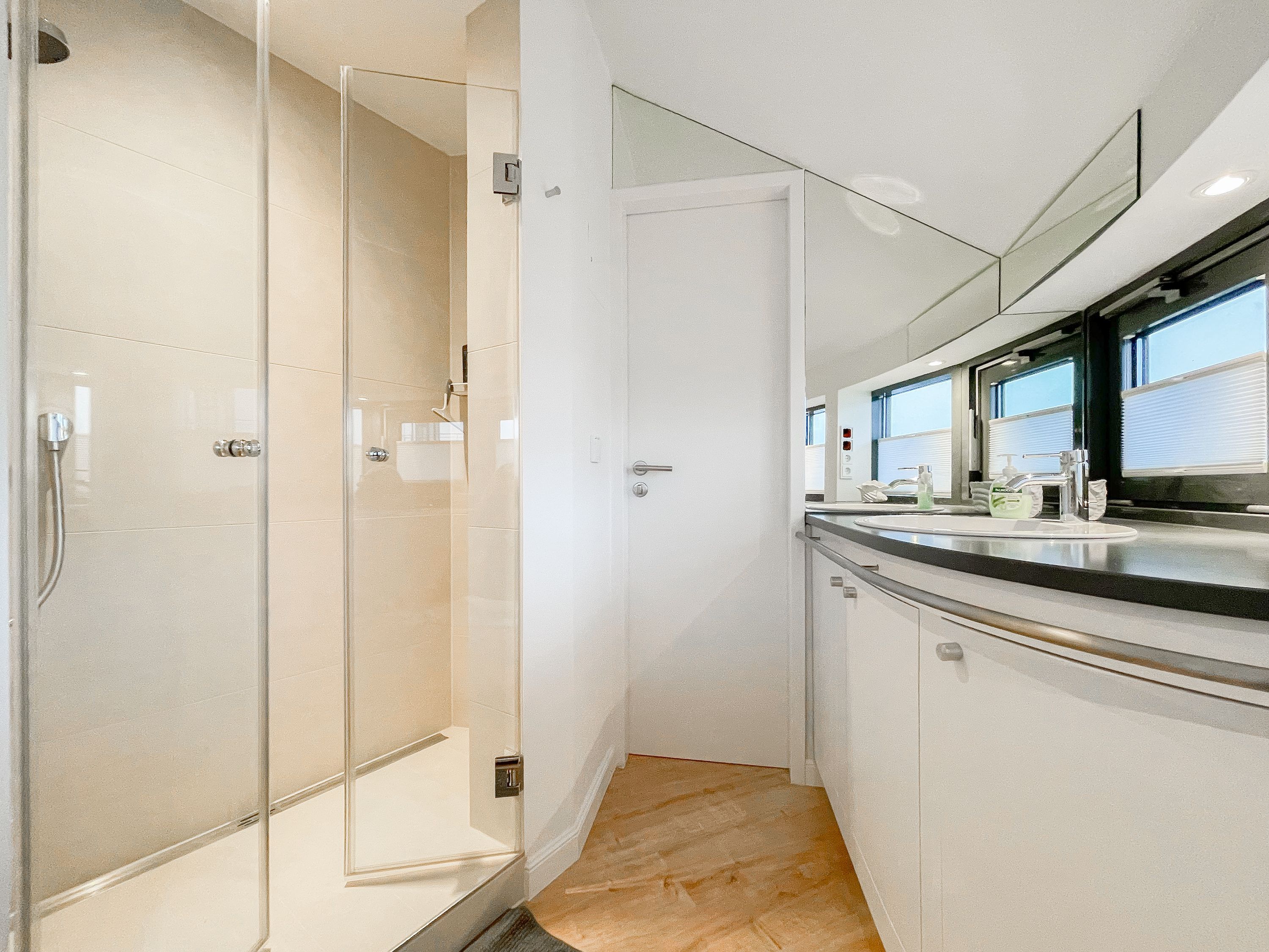 Das Penthouse Leuchtturm Lounge präsentiert sich als lichtdurchflutetes Loft mit unglaublich großzügigen Räumlichkeiten und einer faszinierenden Deckenhöhe über 2 Ebenen im Wohnbereich. Eine Wendeltreppe führt auf die riesige Empore, ein echtes architektonisches Highlight, eingerichtet mit einem traumhaften Schlafzimmer mit Klimaanlage und TV, einem Büro und kleinem exklusiven Duschbad ensuite. Ein weiteres Highlight ist definitiv die riesige Dachterrasse in Südausrichtung für viele gemeinsame Sonnenstunden, die mit einer Essgruppe und XXL Strandkorb ausgestattet ist. Im überaus weitläufigen Wohn- Essbereich mit anschließender Wohnküche in top Ausstattung, spielt sich das Leben ab. Die gemütliche Sofalandschaft und der großzügige Essbereich bieten viel Raum, um einen entspannten Urlaub zu verleben. Durch die Kombination von anspruchsvollem Design, hochwertigen Materialien und warmen Farben ist es der Innenarchitektin gelungen, eine wunderbare Wohnatmosphäre zu schaffen. Es gibt 2 weitere großzügige Schlafzimmer, die wie auch das Emporenschlafzimmer über hochwertige Ruf Boxspringbetten (180x200), Einbauschränke, TV und Verdunkelungsplissees verfügen sowie ein weiteres exklusives Duschbad. Beide Bäder sind mit einem Radio ausgestattet. Eine Waschmaschine ist in die Küche integriert. Zum Penthouse (2. Etage) gehört ein reservierter Stellplatz in der Tiefgarage ( Einfahrtshöhe 1,90 m ). Ein Fahrstuhl ist nicht vorhanden. Das Penthouse ist aufgrund der offenen Treppe und Empore nicht unbedingt für Kleinkinder geeignet.