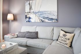 Es erwartet Sie eine wunderschöne Ferienwohnung in warmen Farben im Hampton Style, die Gemütlichkeit und Wohlbefinden vermitteln. Natürliche Materialien und ein durchdachtes Raumkonzept schaffen eine ganz besondere Atmosphäre um wohl verdiente Urlaubstage zu genießen. Herzstück der Wohnung bildet der großzügige Essbereich für 4 Personen mit offener Einbauküche in bester Ausstattung zum geselligen Beisammensein und gemeinsamen Kochen. Von hier aus gelangen Sie auf den möblierten und westlich ausgerichteten Balkon mit einem schönen Blick ins Grüne. Der Wohnbereich verfügt über eine gemütlich Eckcouch, Flat TV und eine Stereoanlage.