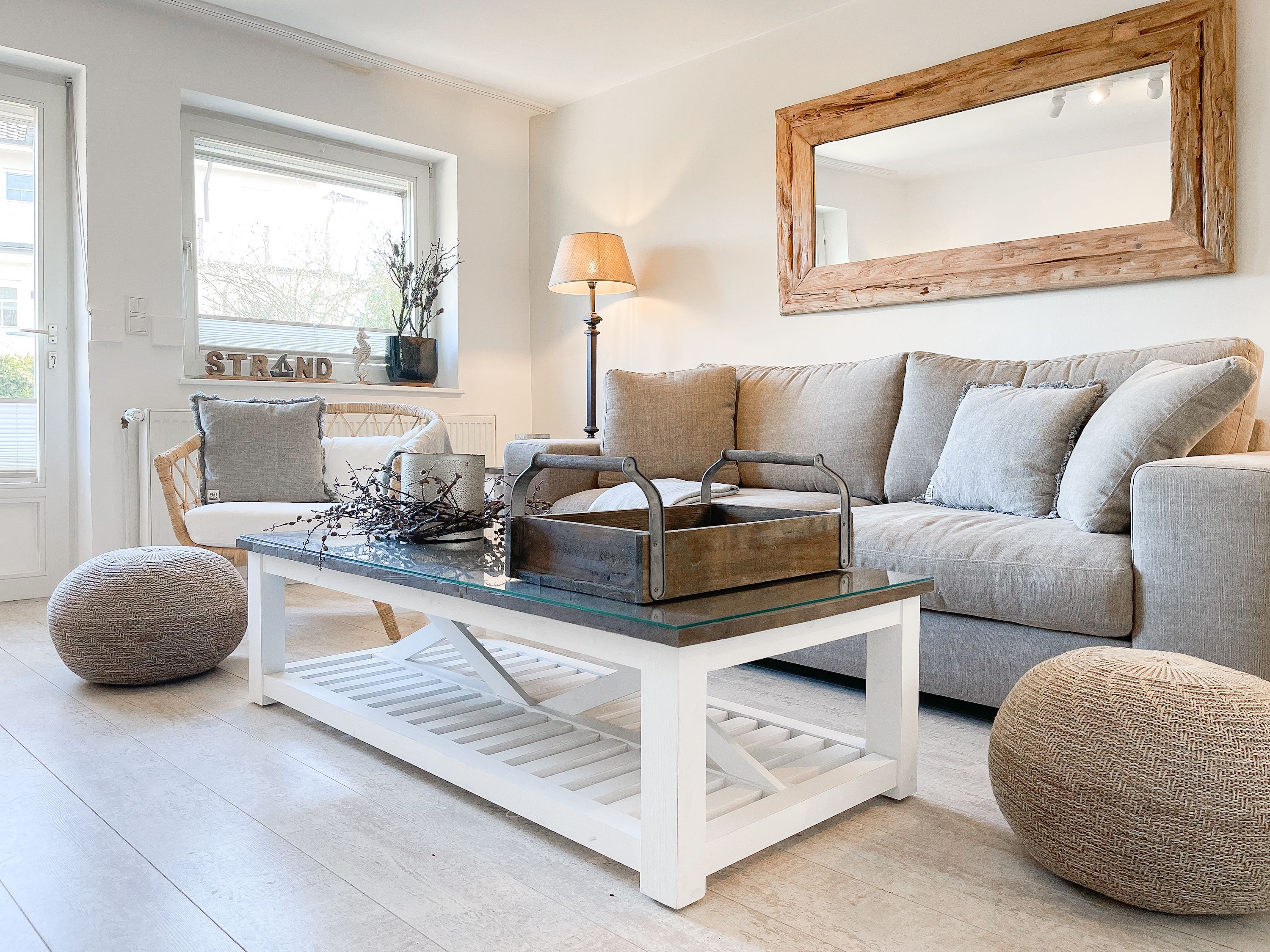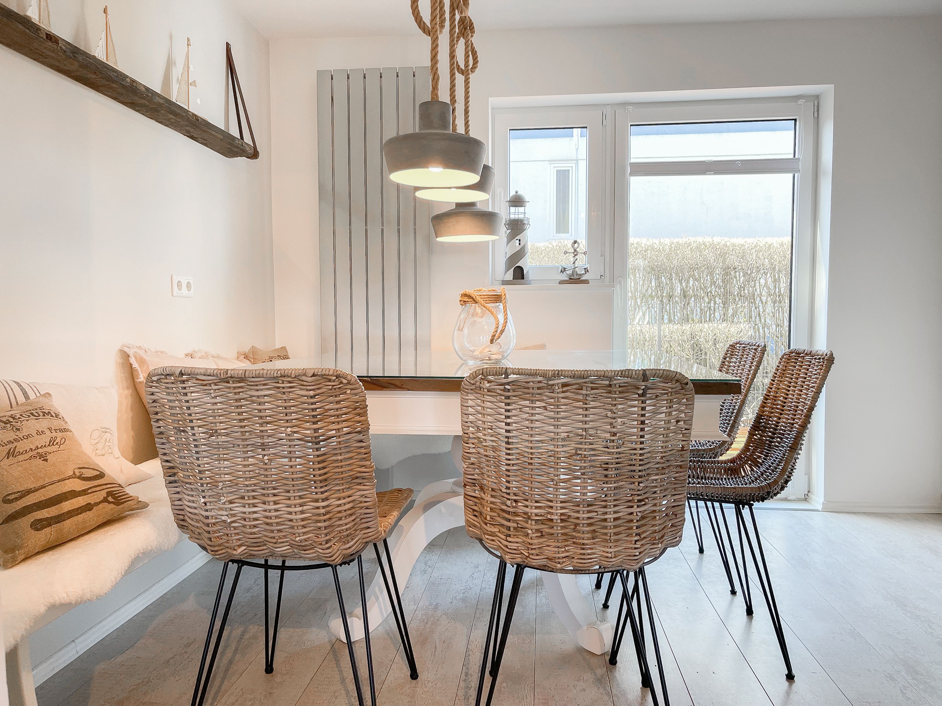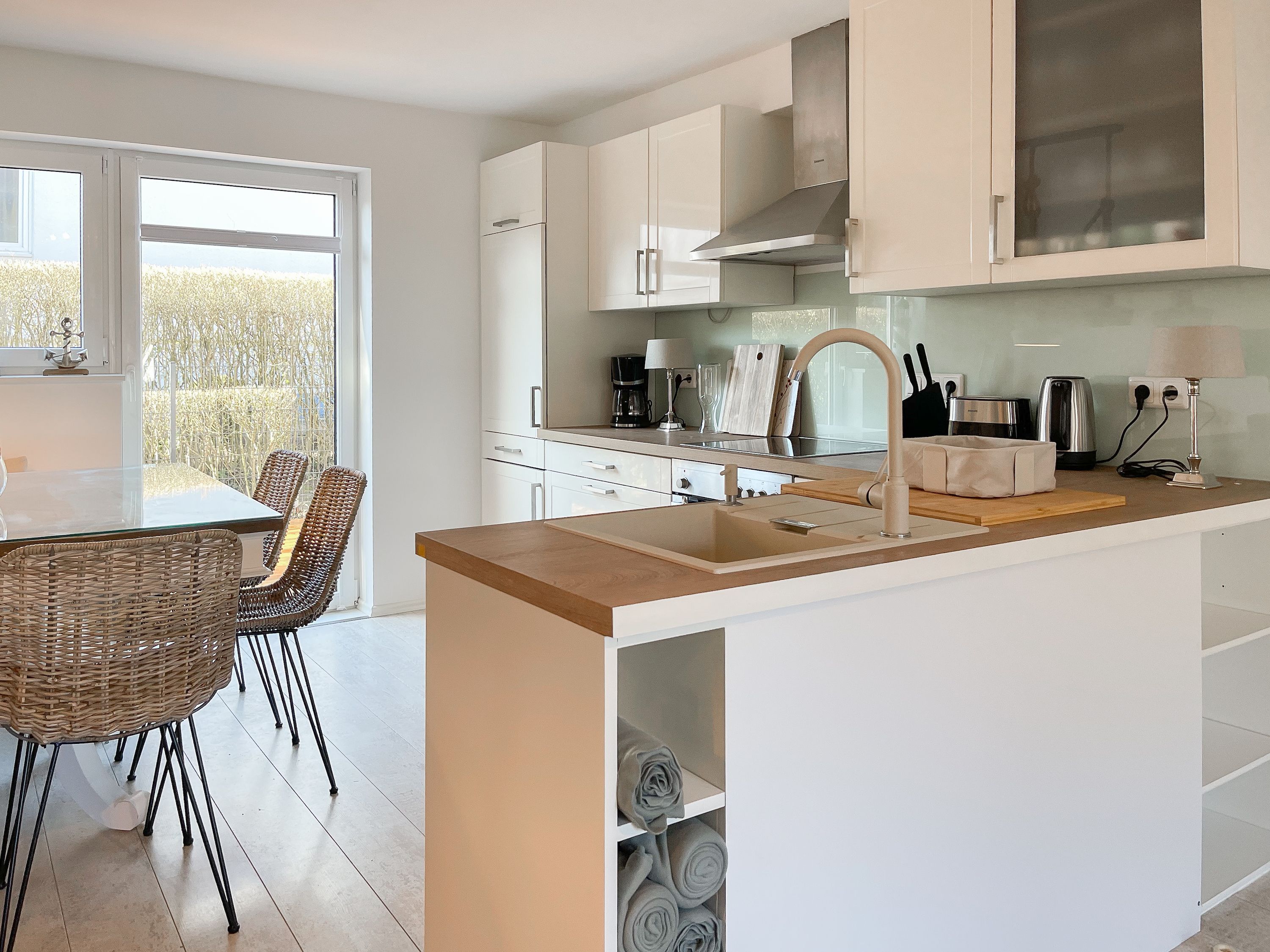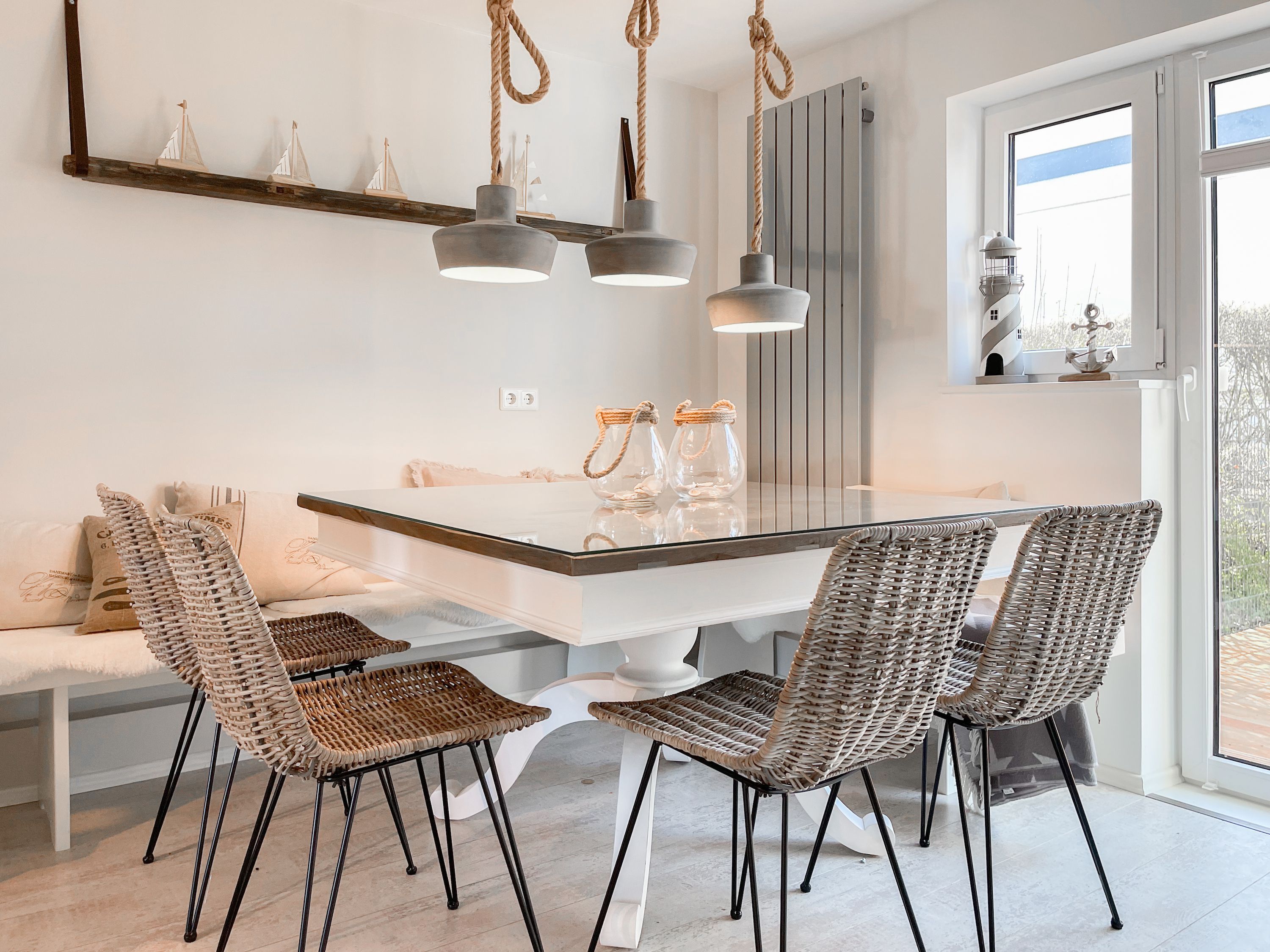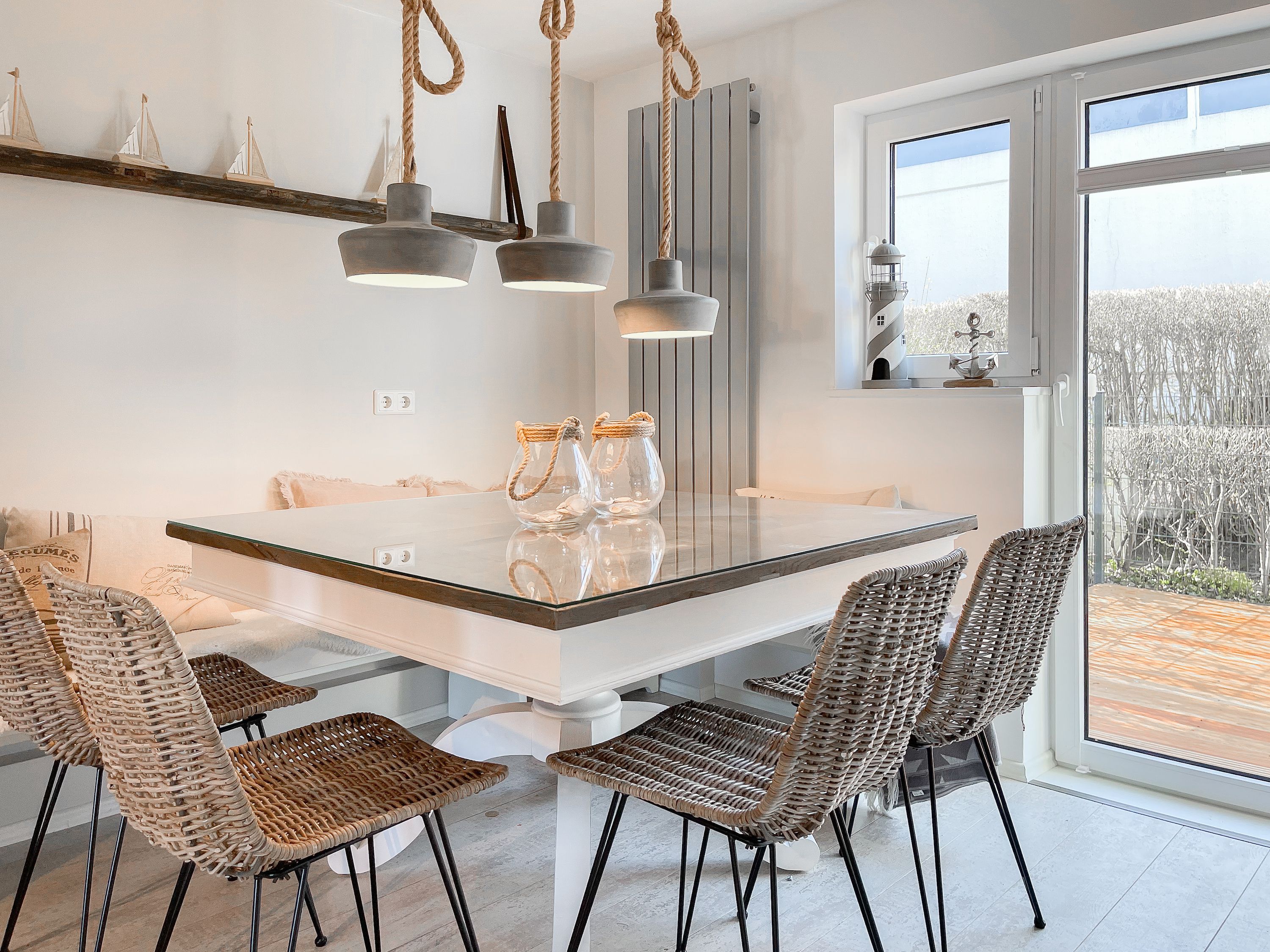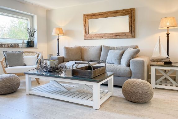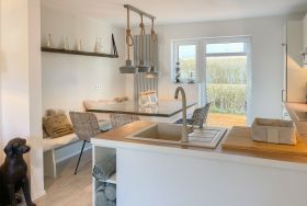 Strandflair pur! Das renovierte und mit viel Liebe zum Detail ausgestattete Ferienhaus Strandbude bietet tolles Strandambiente, um einen entspannten Urlaub in Ostseenähe zu verleben. Natürliche Materialien und die äußerst geschmackvolle Einrichtung des Altbaus sorgen für eine herrliche Wohnatmosphäre im Hampton Style. Es erwartet Sie ein charmanter Wohnbereich mit einem hochwertigen Sofa, Sessel und XL TV. Auf der vorgelagerten Terrasse 1 können sie bereits die ersten Sonnenstrahlen beim Morgenkaffee genießen. Die anschließende Küche ist gut ausgestattet und der geschmackvoll gestaltete Essbereich ist ebenso Treffpunkt für gemütliches Beisammensein wie auch die anschließende Terrasse 2 mit Sonne satt. Die Außenbereiche sind mit Gartenmöbeln und einem Strandkorb ausgestattet. Im Obergeschoss befindet sich ein Schlafzimmer mit einem Boxspringdoppelbett (180x200), Kleiderschrank und TV und ein weiteres Schlafzimmer mit einem Einzelbett, kleinem Kleiderschrank und einem Schreibtisch. Im Spitzboden (Deckenhöhe 1,80 m), der über eine Raumspartreppe zu erreichen ist, befindet sich das 3. Schlafzimmer mit einem Doppelbett (180x200) und eine Kleiderstange auf Rollen. Die Fenster der Schlafräume lassen sich verdunkeln. Ein Bad mit Badewanne befindet sich im Erdgeschoss, das zweite Bad mit Dusche im Obergeschoss. WLAN steht selbstverständlich zur kostenlosen Nutzung zur Verfügung. Eine Waschmaschine und ein Trockner sind im Keller untergebracht. Ein Parkplatz und ein abschließbarer Fahrradschuppen befinden sich direkt am Haus.