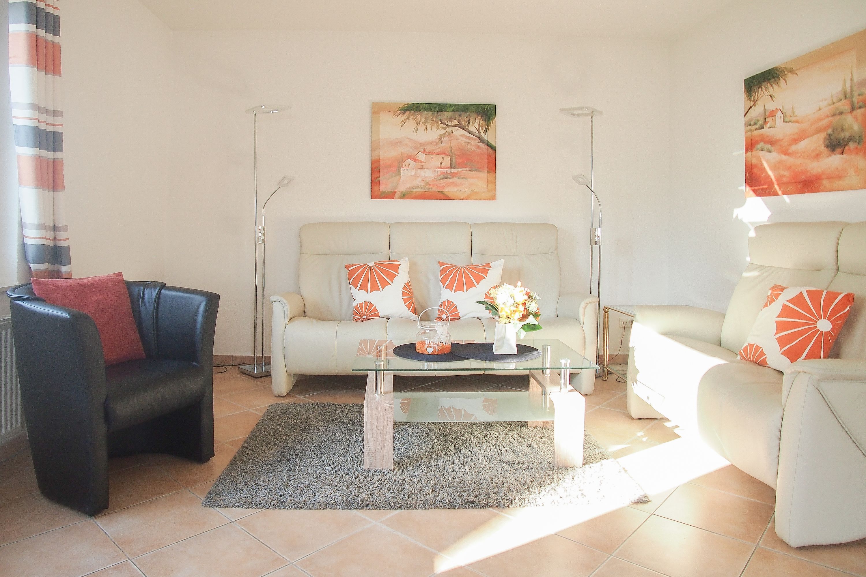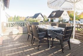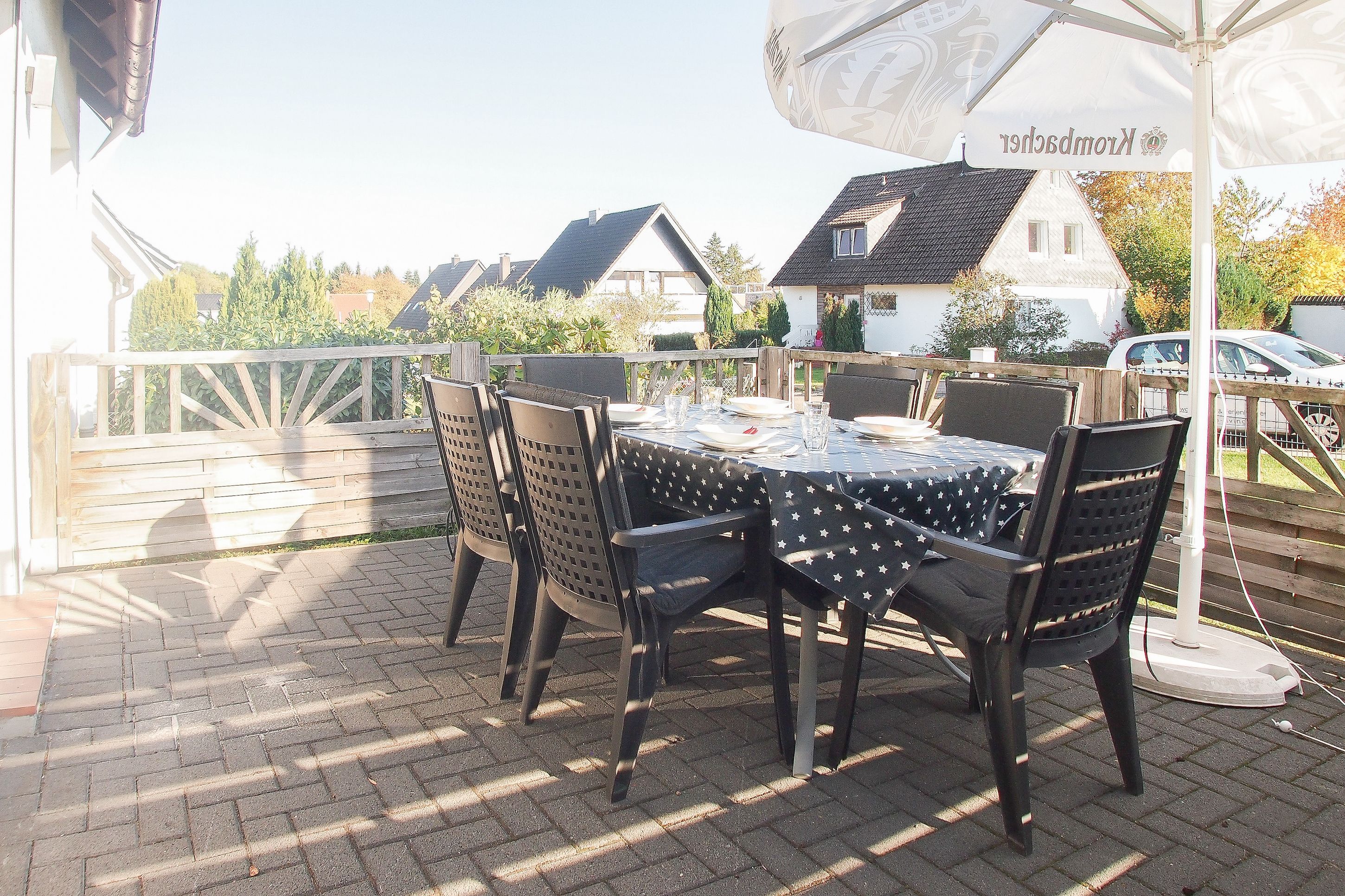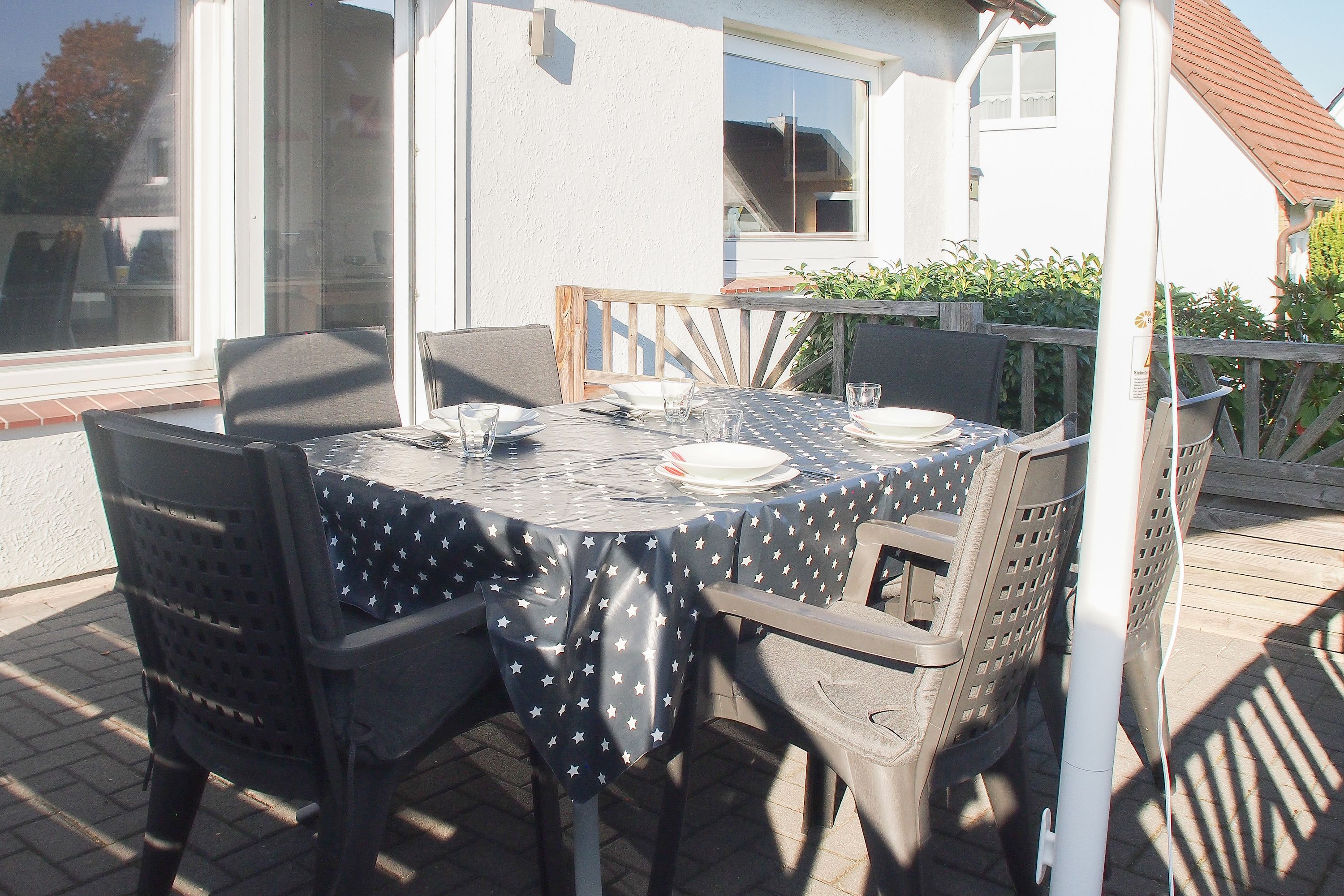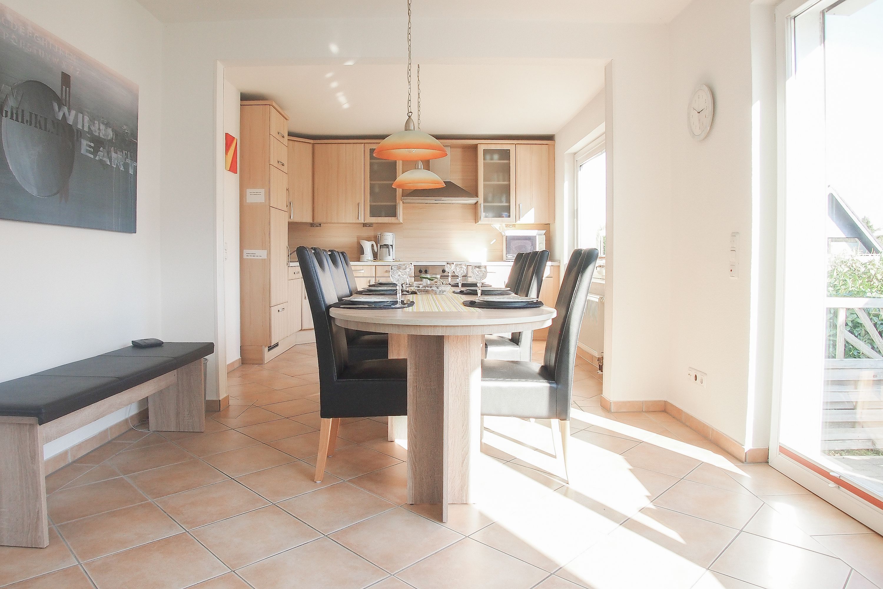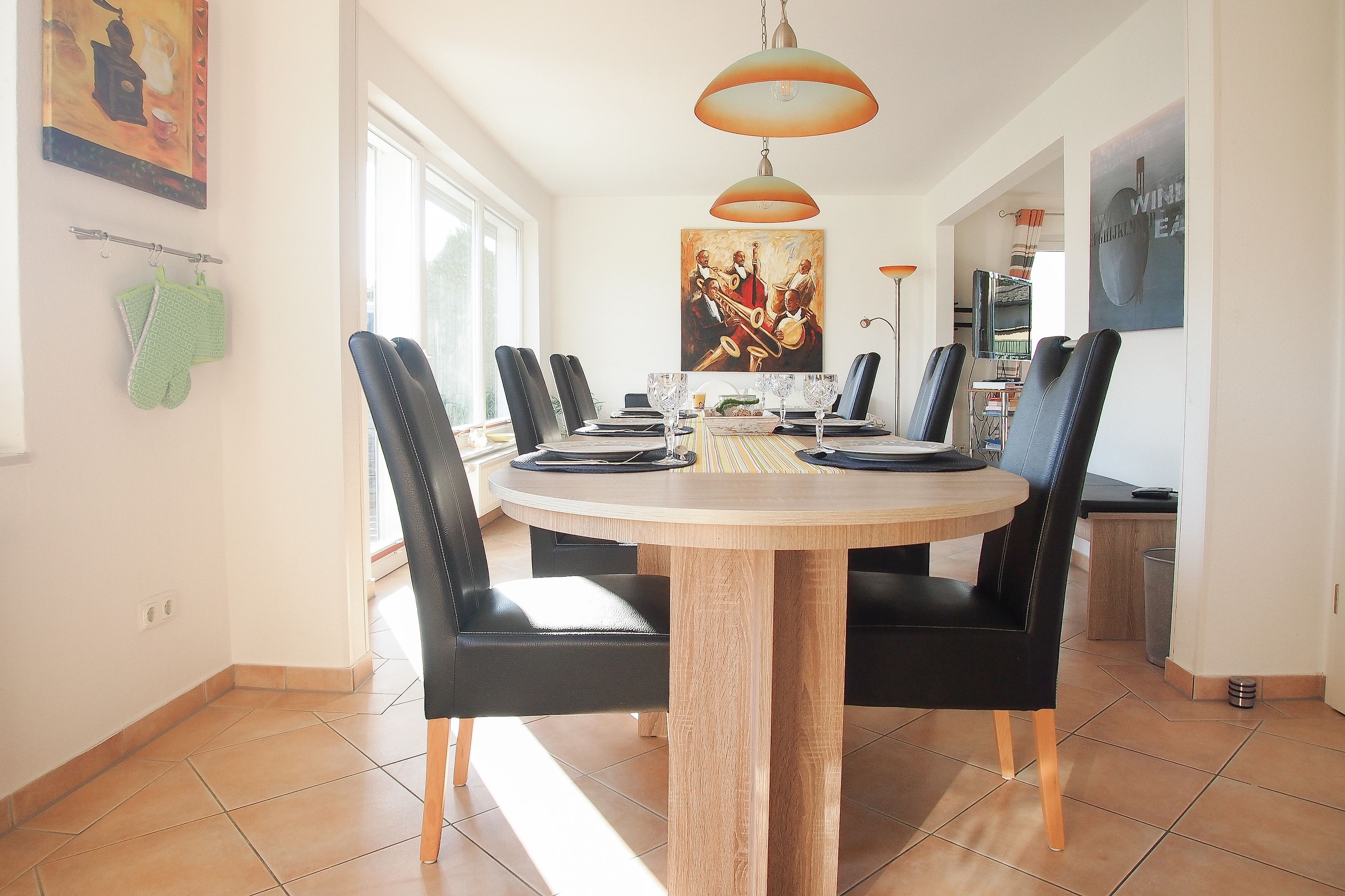 Das Ferienhaus Melanie bietet auf über 100 qm Wohnfläche mit 3 Schlafzimmern ausreichend Platz für 6 Personen plus Kleinkind, um einen entspannten Urlaub zu verleben. Im Erdgeschoss befindet sich ein gemütlicher Wohnbereich, hell und freundlich, mit TV, DVD Player, WLAN und Musikanlage. Angrenzend gibt es einen weiteren Sitz- oder Lesebereich mit einem Sofa mit Schlaffunktion und Zugang zur möblierten Süd Terrasse. Die zweite möblierte Terrasse mit Gasgrill ist zum Westen ausgerichtet und befindet sich im hinteren Teil des Gartens vor dem Garagenhaus. Das Herzstück bildet die offene Wohnküche in bester Ausstattung mit allen technischen Geräten und der großzügig angelegte Essbereich, sonnig und hell dank viel Fensterfläche. Ein großes Gäste WC mit Waschmaschine und Trockner zur kostenlosen Nutzung, ist ebenfalls im Erdgeschoss untergebracht.
