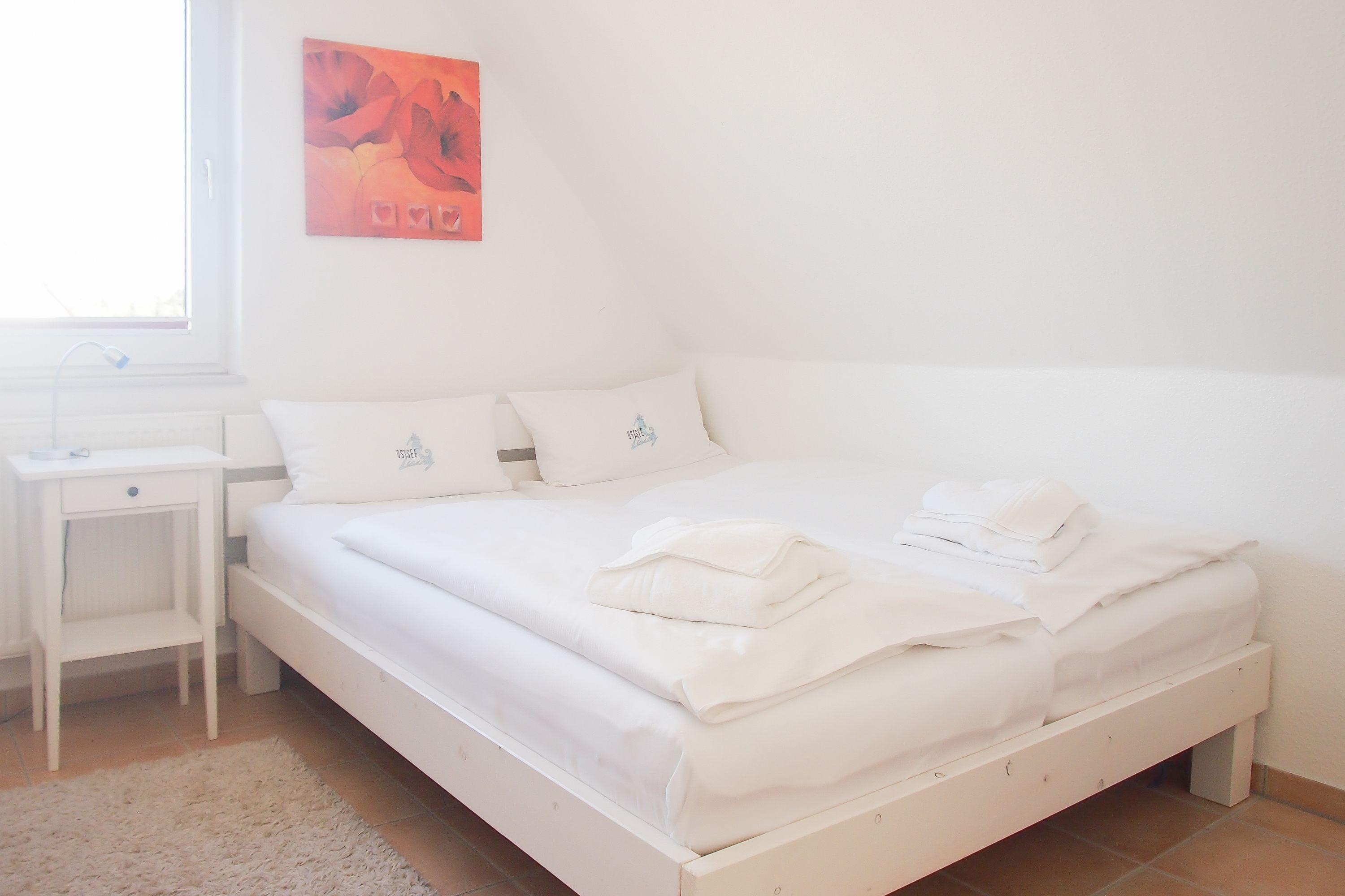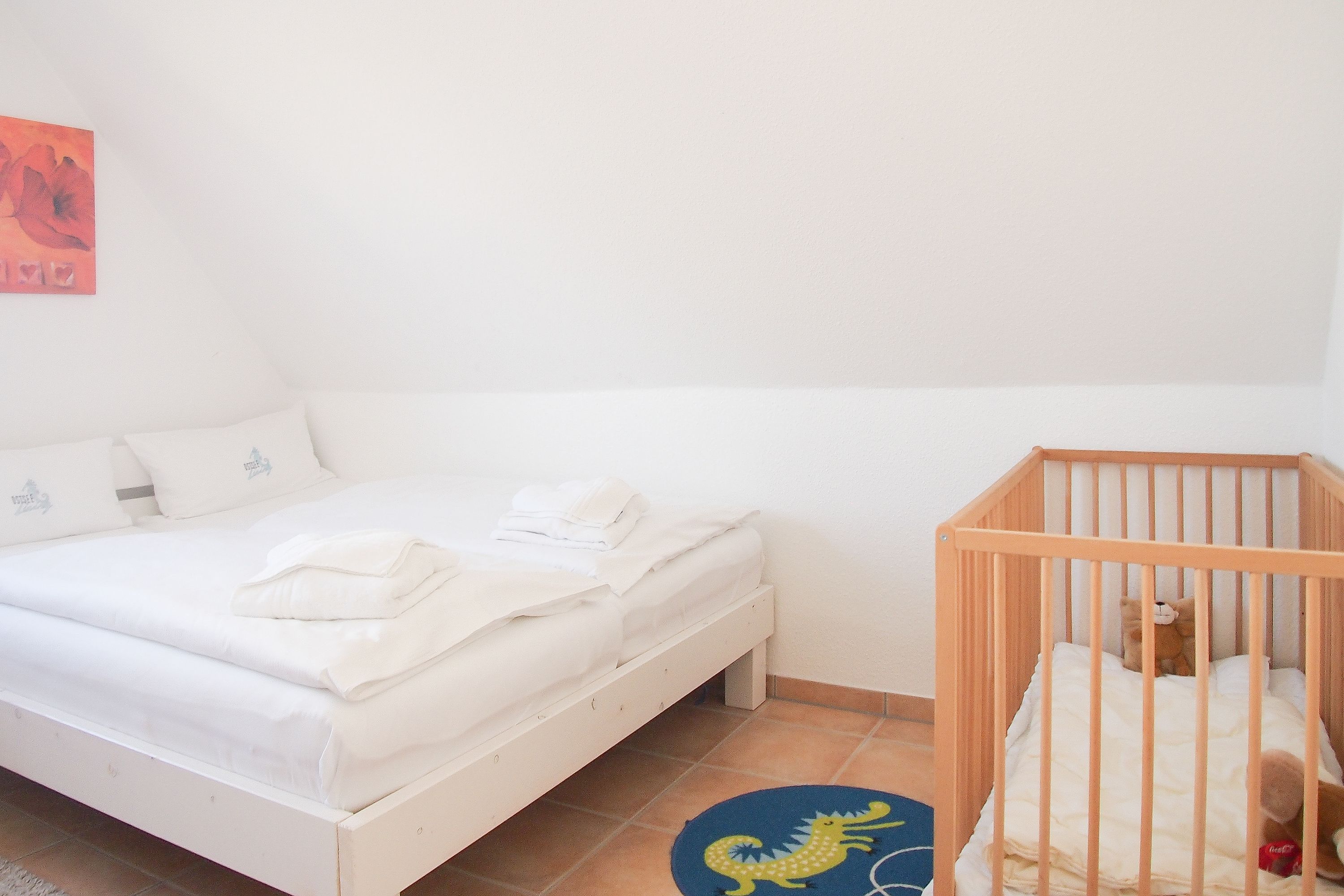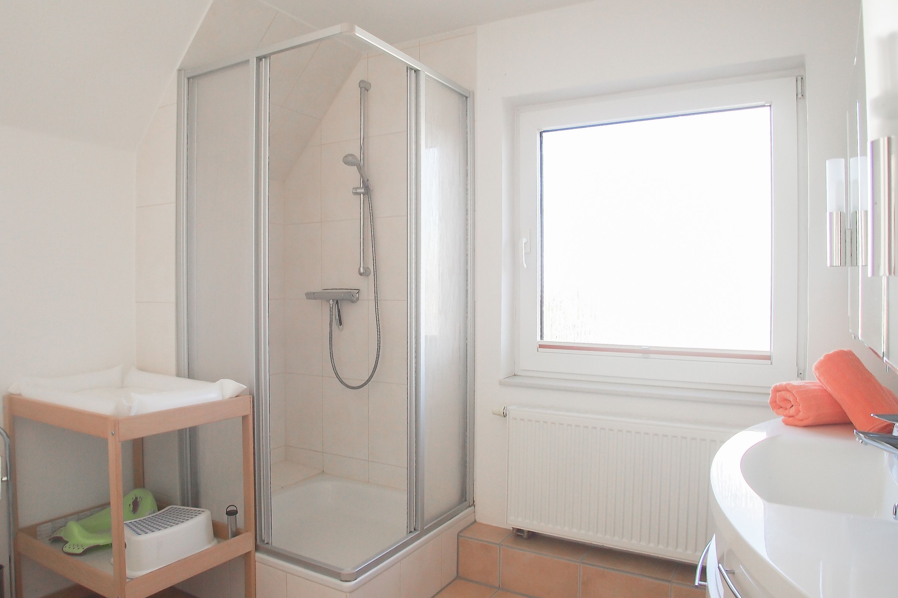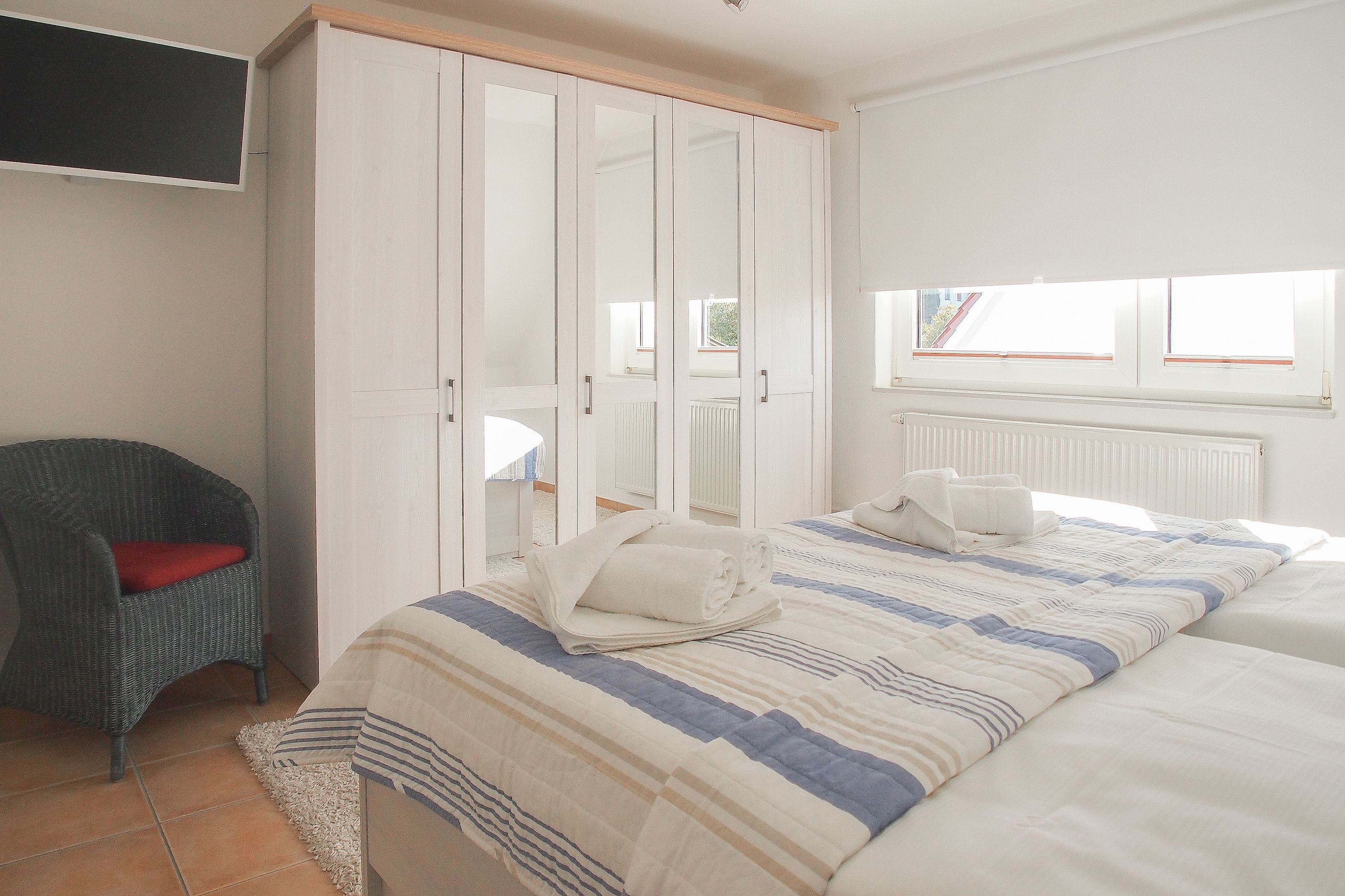 In Obergeschoss befinden sich 3 separate Schlafzimmer und ein geräumiges Duschbad. Zwei der Schlafräume sind mit einem Doppelbett (180x200) und einem TV ausgestattet, das dritte mit einem Doppelbett (160x200) und einem zusätzlichen Kinderbett. Die Fenster sind mit Verdunkelungsrollos versehen. Zwei PKW Stellplätze befinden sich auf dem Grundstück. In der abschließbaren Garage können mitgebrachte Fahrräder trocken und sicher untergestellt werden. Ein Bollerwagen steht unseres Gästen zur freien Verfügung.