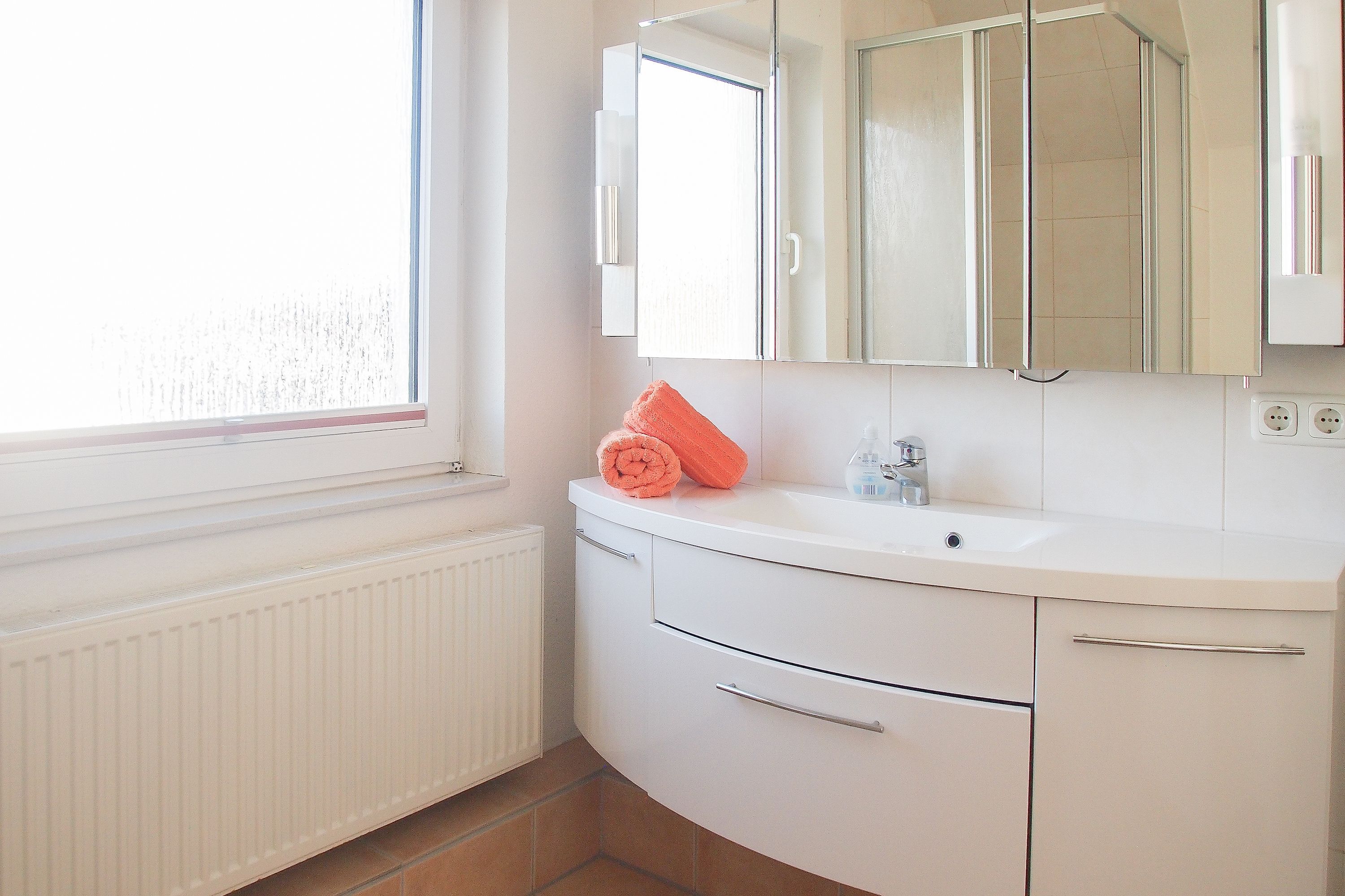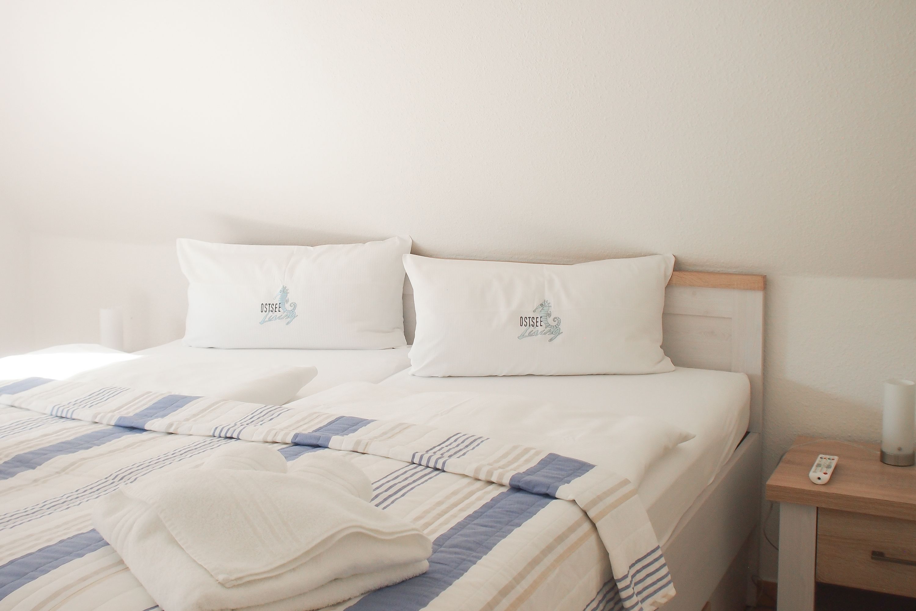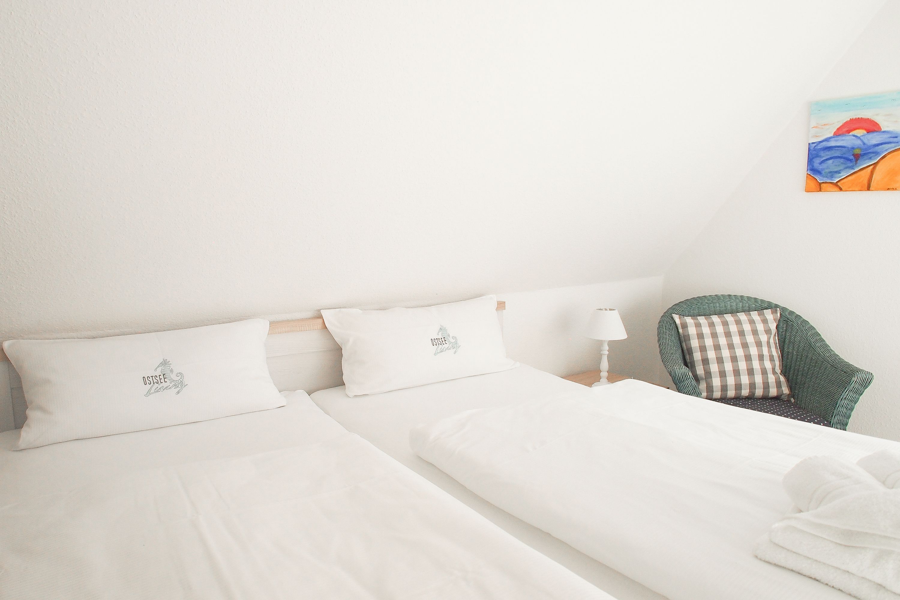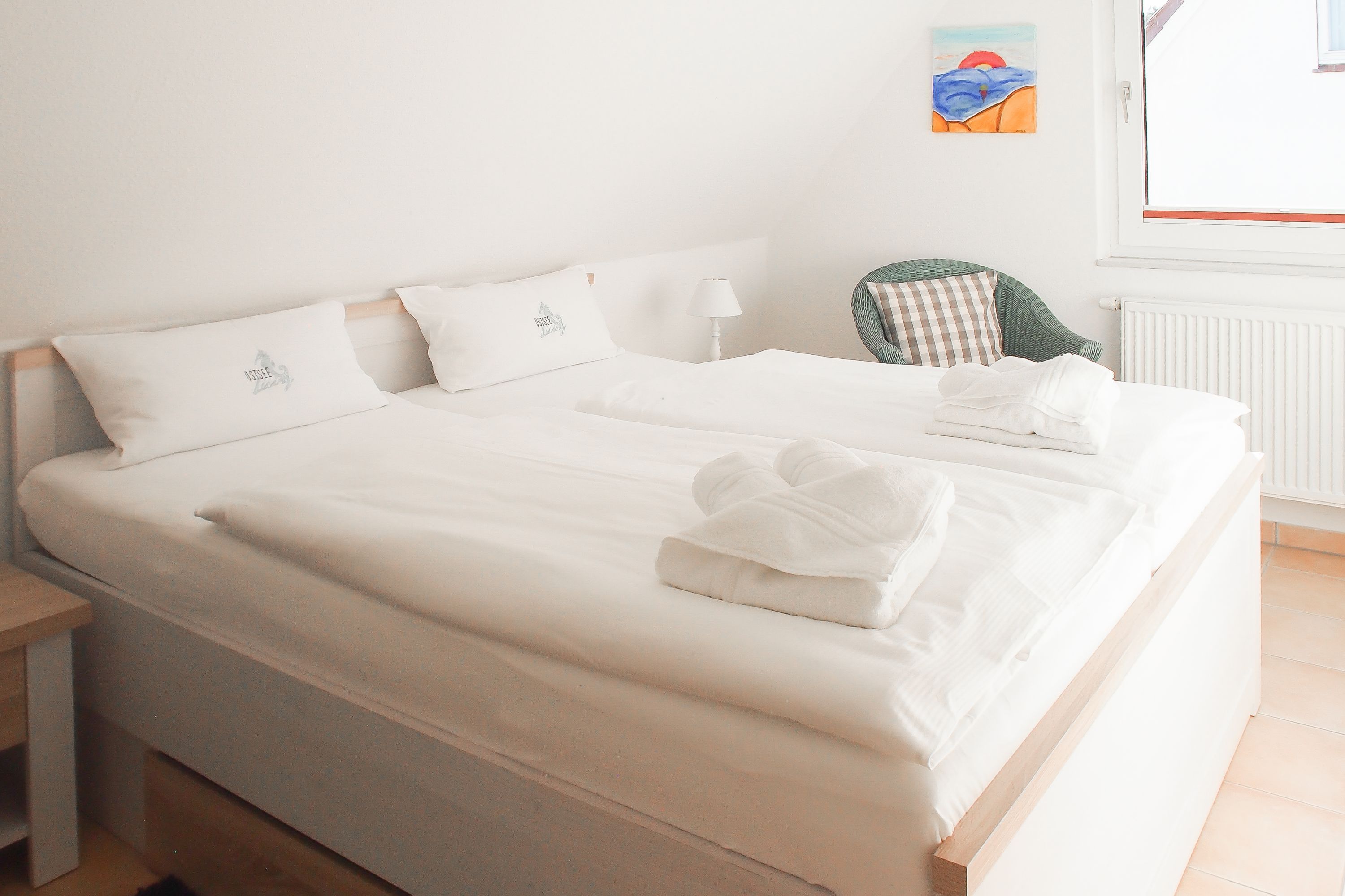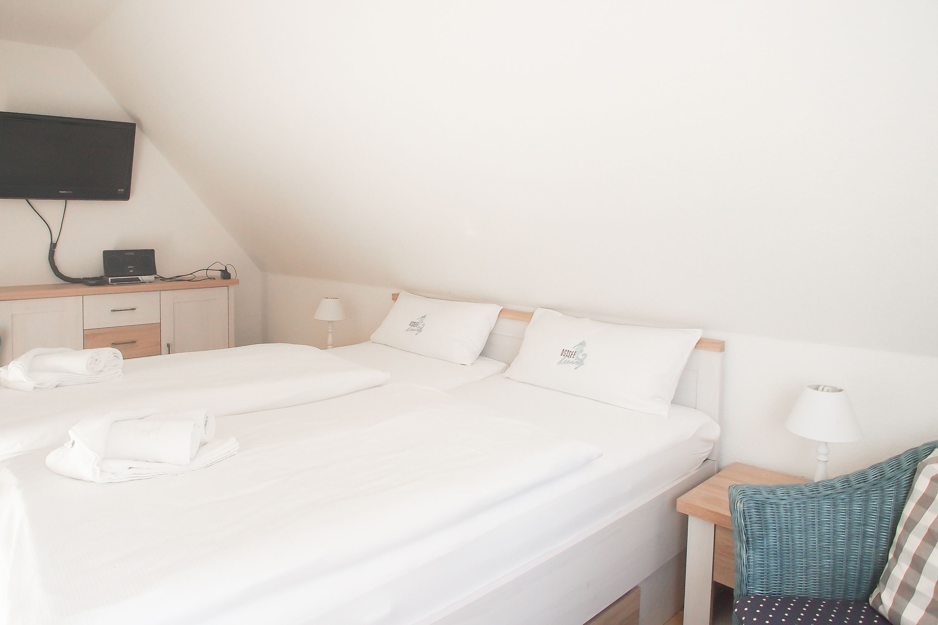 In Obergeschoss befinden sich 3 separate Schlafzimmer und ein geräumiges Duschbad. Zwei der Schlafräume sind mit einem Doppelbett (180x200) und einem TV ausgestattet, das dritte mit einem Doppelbett (160x200) und einem zusätzlichen Kinderbett. Die Fenster sind mit Verdunkelungsrollos versehen. Zwei PKW Stellplätze befinden sich auf dem Grundstück. In der abschließbaren Garage können mitgebrachte Fahrräder trocken und sicher untergestellt werden. Ein Bollerwagen steht unseres Gästen zur freien Verfügung.