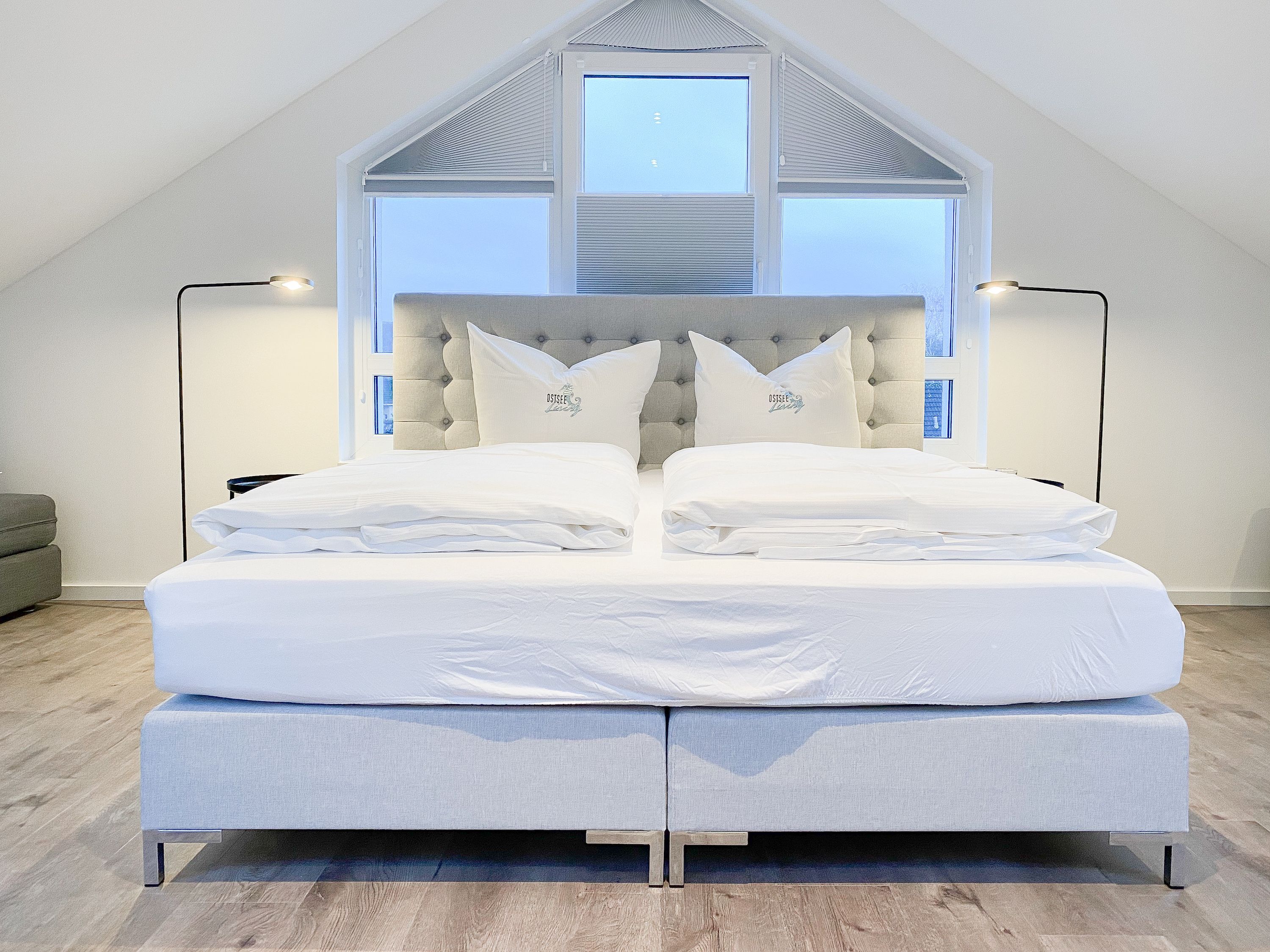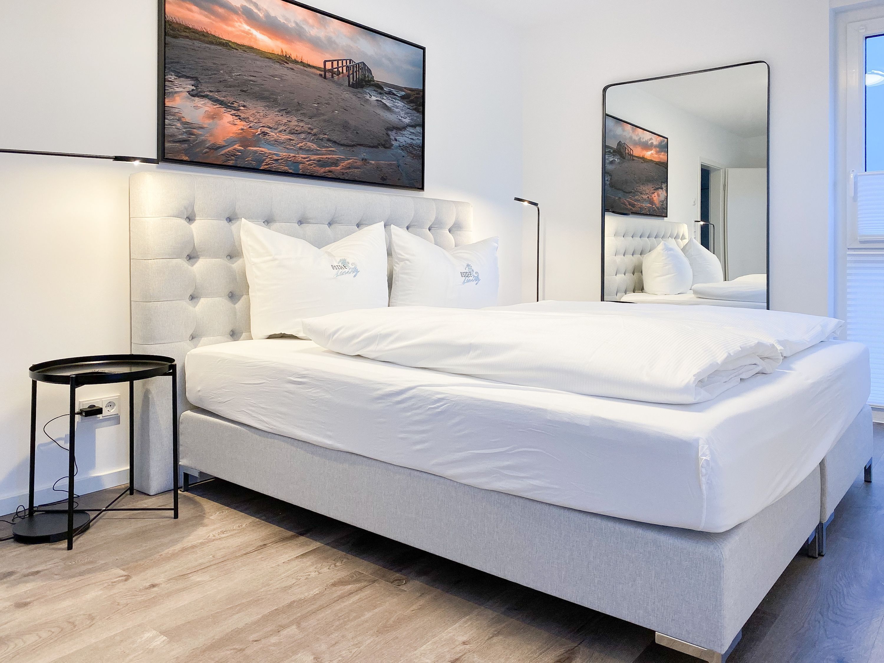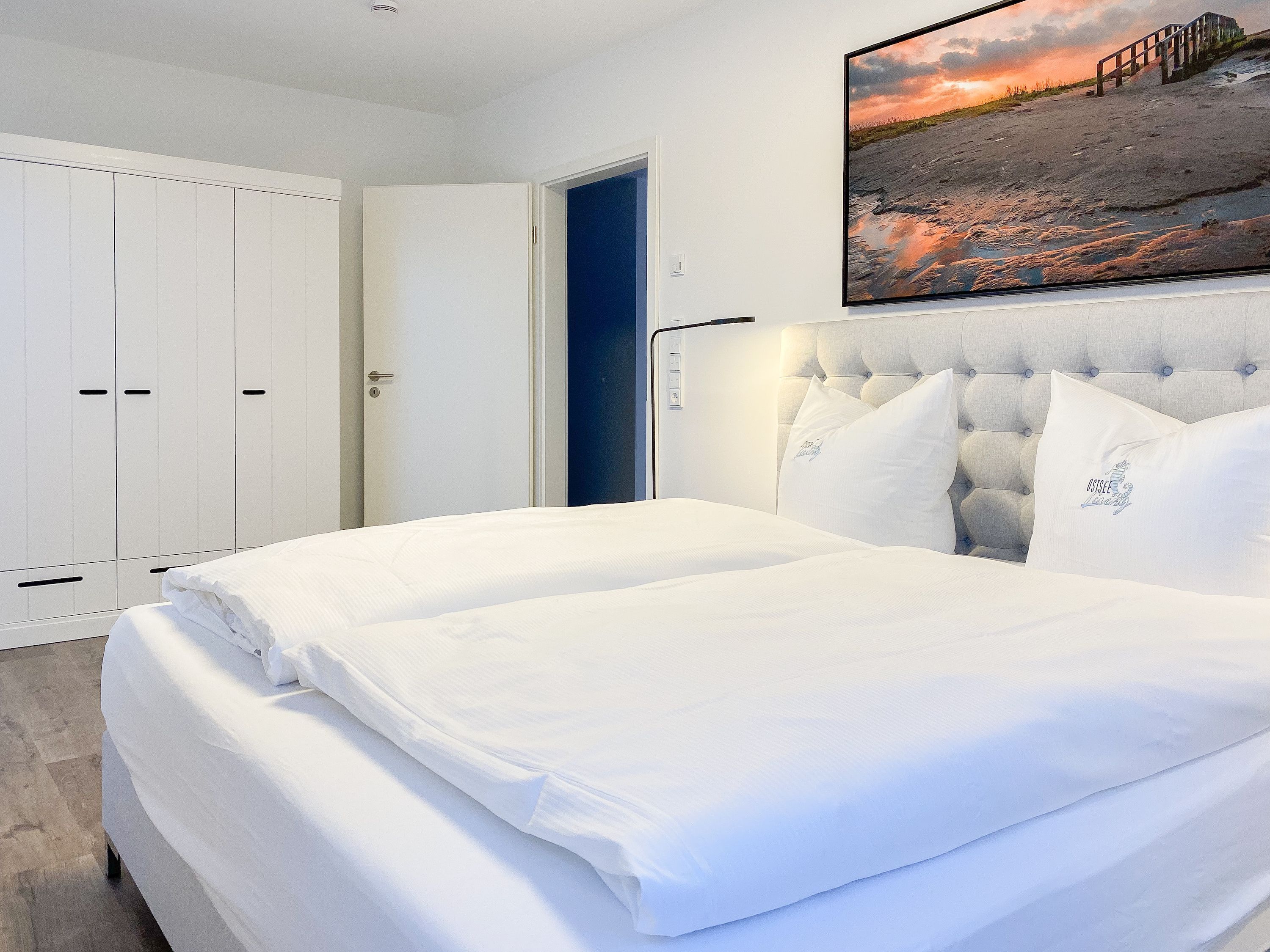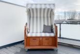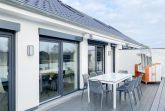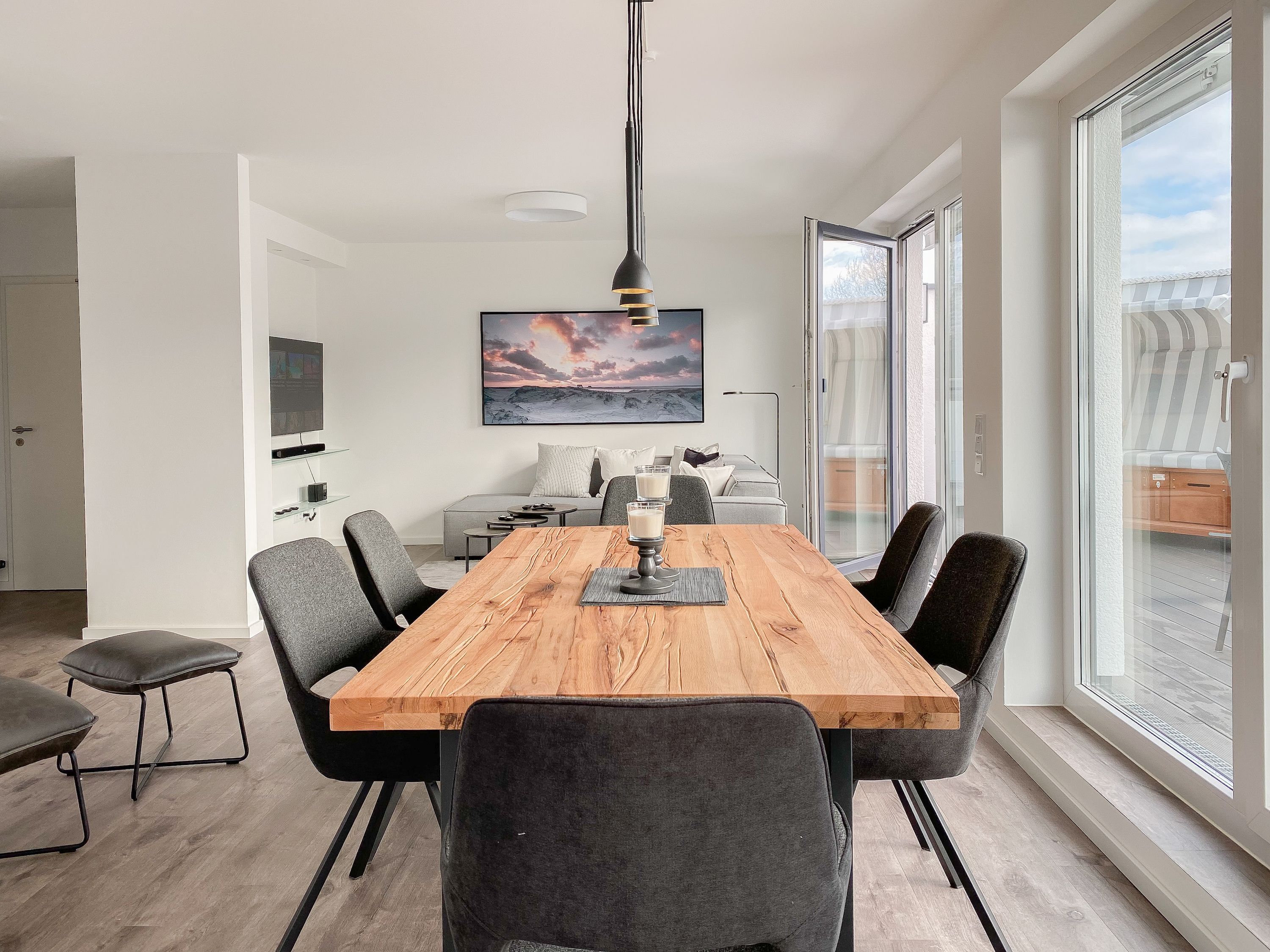 Das Penthouse erstreckt sich über 2 Wohnebenen und bietet auf über 100 qm Wohnfläche ausreichend Raum für 4-6 Personen, um einen entspannten Urlaub zu verleben. Mittelpunkt der unteren Ebene ist der großzügig kombinierte Wohn- Essbereich mit Smart TV und Soundbar. Die anschließende Einbauküche, die dank bester Ausstattung keine Wünsche offen lässt, lädt zum gemeinsamen Kochen ein. Bodentiefe Fensterelemente sorgen für lichtdurchflutete Räumlichkeiten und bieten einen direkten Zugang auf die großzügig angelegte Dachterrasse, auf der Sie im Strandkorb sitzend die Sonne genießen und die Seele baumeln lassen können. Für Schatten sorgt die elektrische Markise und für gemeinsame Mahlzeiten steht eine Essgruppe mit ausreichend Platz für 8 Personen zur Verfügung. Über den Flur erreichen Sie das erste Schlafzimmer, ausgestattet mit einem Boxspringbett (180x200) und TV sowie ein geräumiges Bad mit Walk In Dusche, Fenster und integriertem Waschtrockner. Alle Fenster der unteren Ebene sind mit elektrischen Außenjalousien versehen. Auf der zweiten Wohnebene erwartet Sie ein weiteres Tageslichtbad mit Walk In Dusche und ein äußerst großes Schlafzimmer, ausgestattet mit einem Boxspringbett (180x200) und zwei Hockern, die zum Gästebett ausgezogen werden können. Die Fenster sind mit Black Out Plissees versehen und ein TV ist ebenfalls vorhanden.