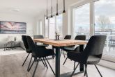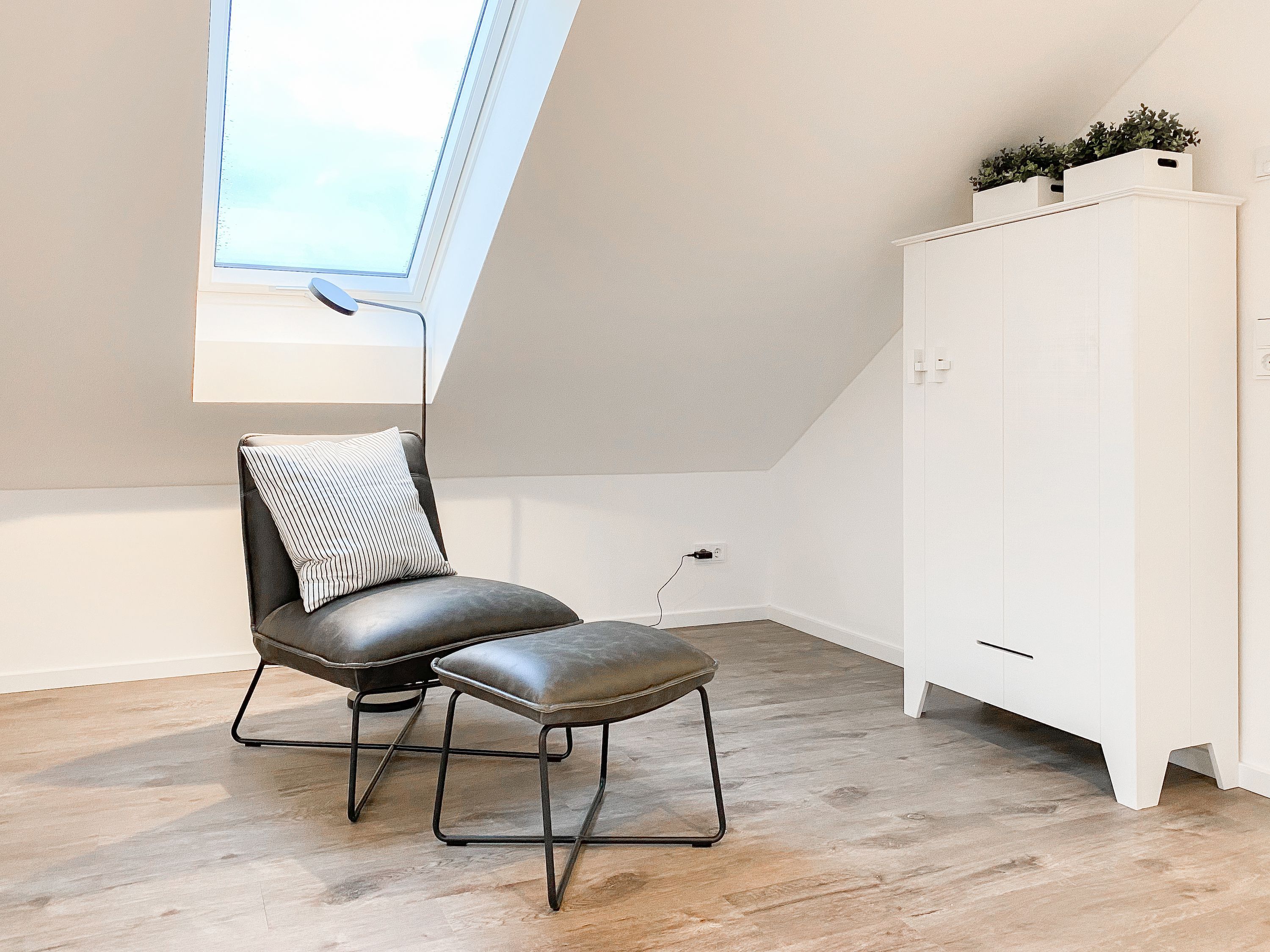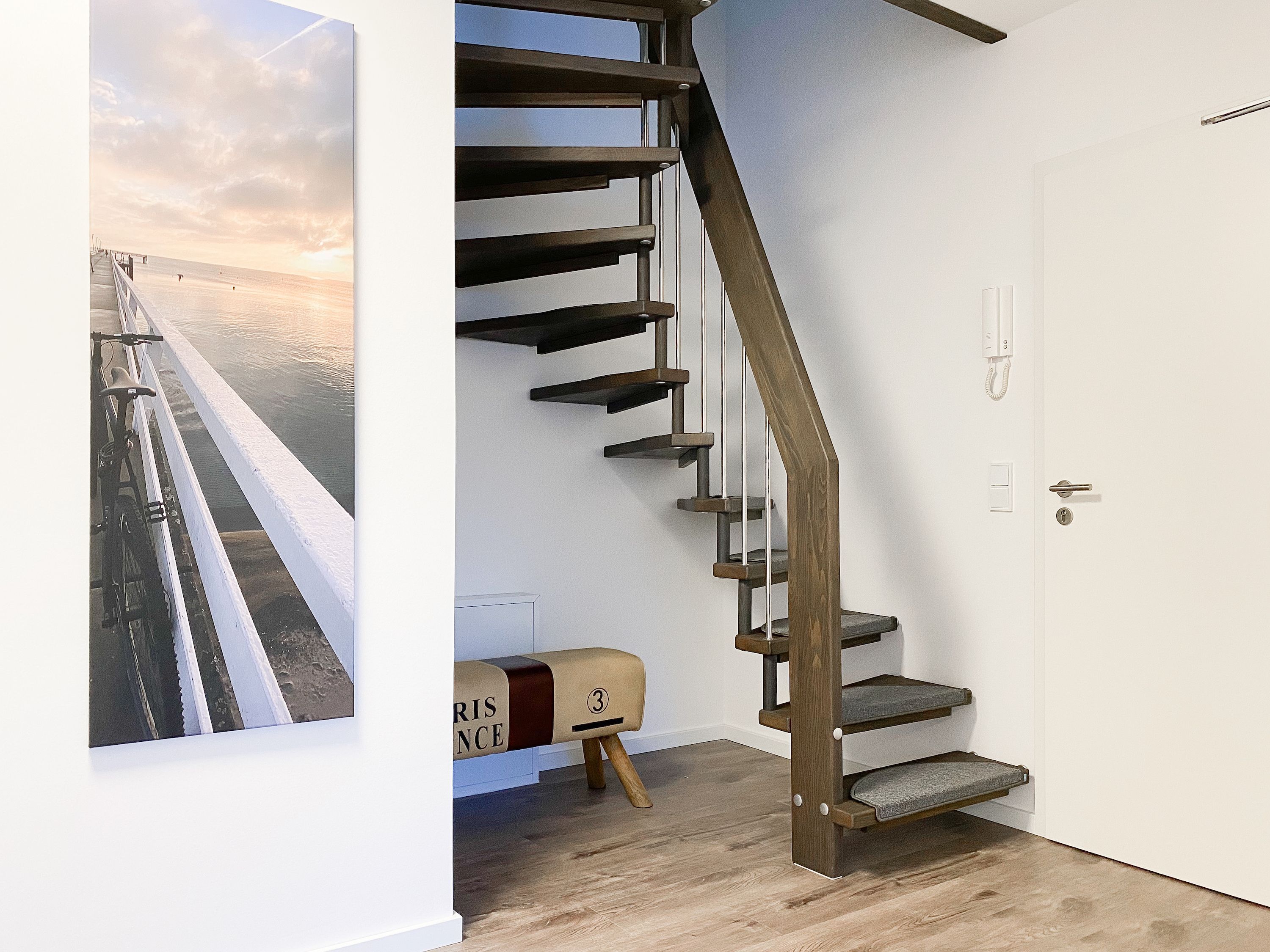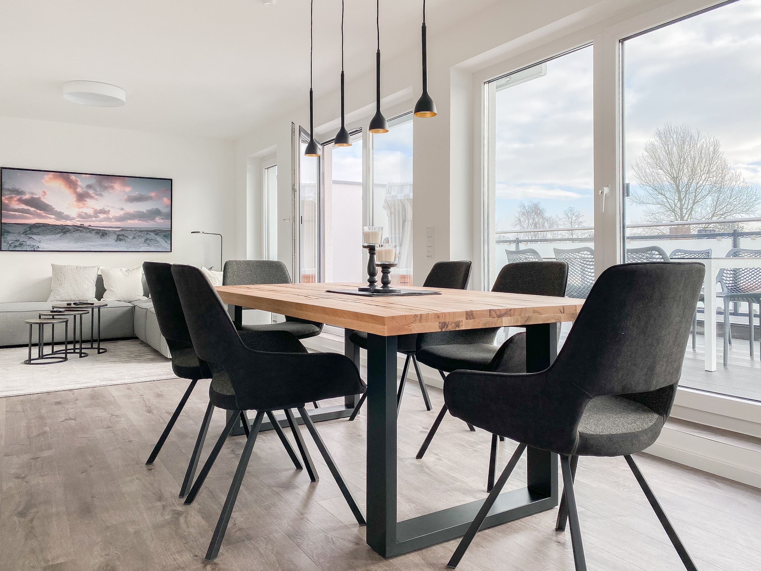 Das Penthouse erstreckt sich über 2 Wohnebenen und bietet auf über 100 qm Wohnfläche ausreichend Raum für 4-6 Personen, um einen entspannten Urlaub zu verleben. Mittelpunkt der unteren Ebene ist der großzügig kombinierte Wohn- Essbereich mit Smart TV und Soundbar. Die anschließende Einbauküche, die dank bester Ausstattung keine Wünsche offen lässt, lädt zum gemeinsamen Kochen ein. Bodentiefe Fensterelemente sorgen für lichtdurchflutete Räumlichkeiten und bieten einen direkten Zugang auf die großzügig angelegte Dachterrasse, auf der Sie im Strandkorb sitzend die Sonne genießen und die Seele baumeln lassen können. Für Schatten sorgt die elektrische Markise und für gemeinsame Mahlzeiten steht eine Essgruppe mit ausreichend Platz für 8 Personen zur Verfügung. Über den Flur erreichen Sie das erste Schlafzimmer, ausgestattet mit einem Boxspringbett (180x200) und TV sowie ein geräumiges Bad mit Walk In Dusche, Fenster und integriertem Waschtrockner. Alle Fenster der unteren Ebene sind mit elektrischen Außenjalousien versehen. Auf der zweiten Wohnebene erwartet Sie ein weiteres Tageslichtbad mit Walk In Dusche und ein äußerst großes Schlafzimmer, ausgestattet mit einem Boxspringbett (180x200) und zwei Hockern, die zum Gästebett ausgezogen werden können. Die Fenster sind mit Black Out Plissees versehen und ein TV ist ebenfalls vorhanden.