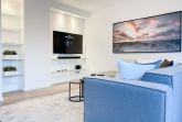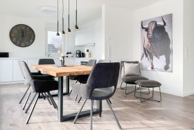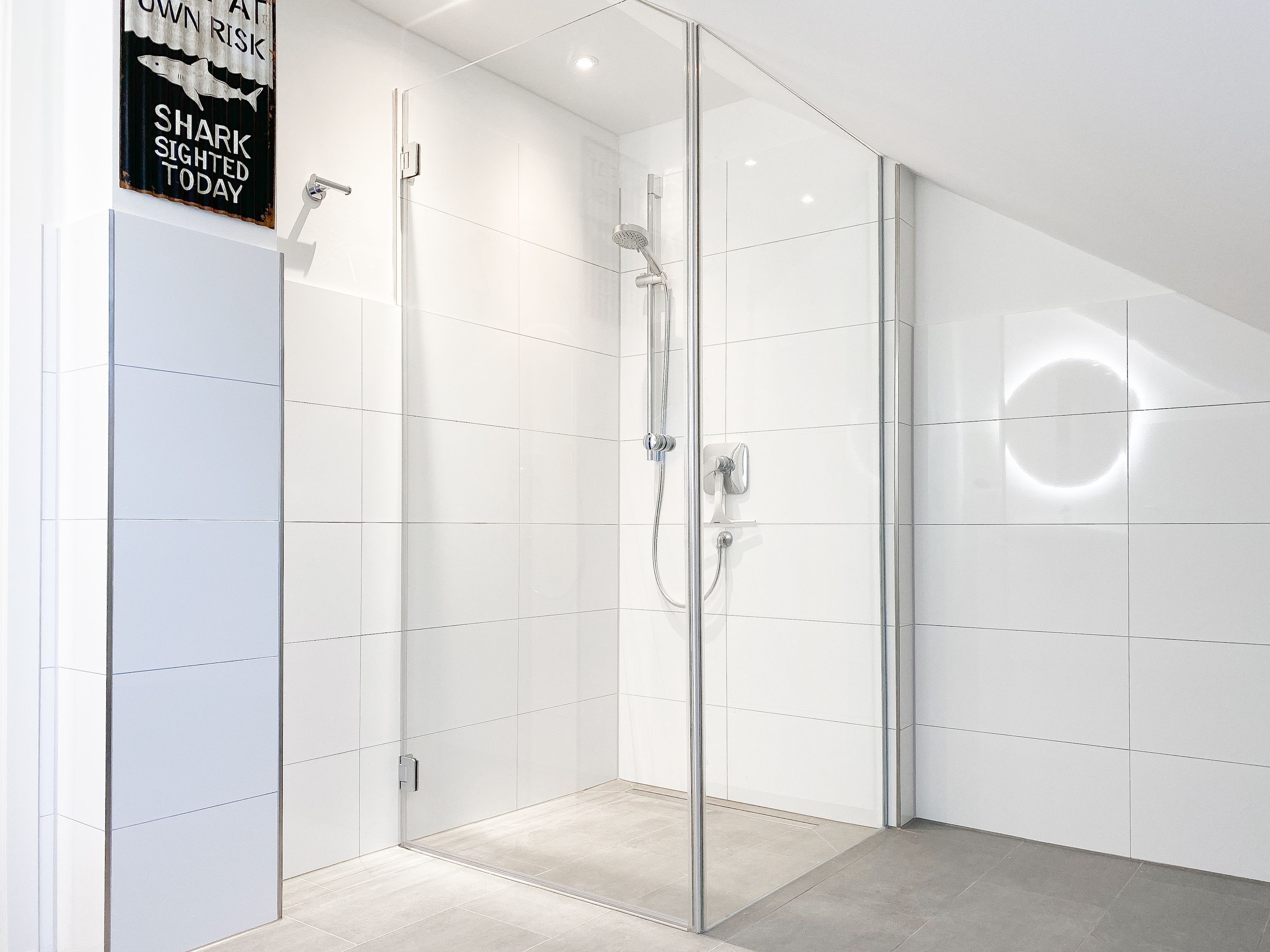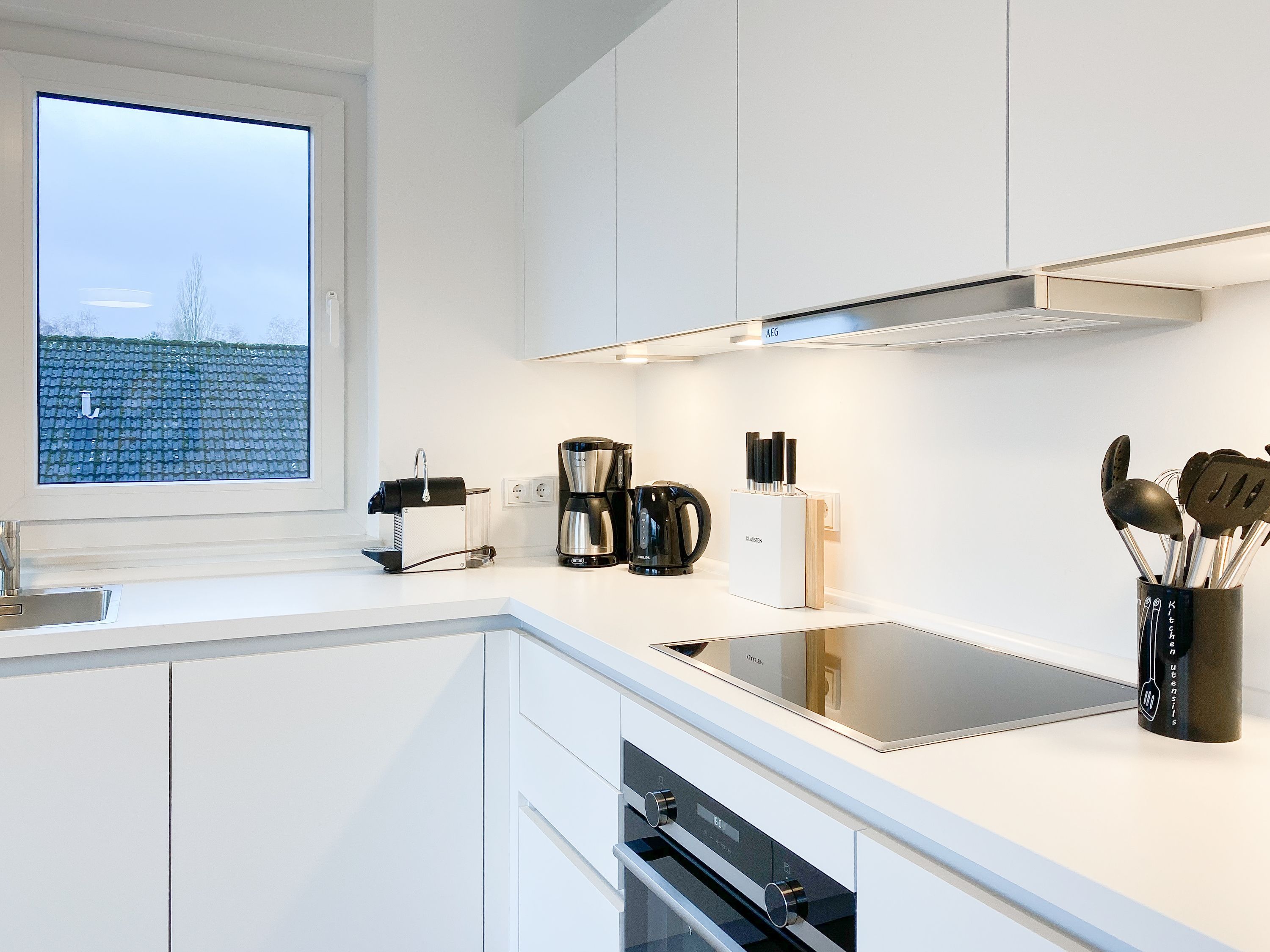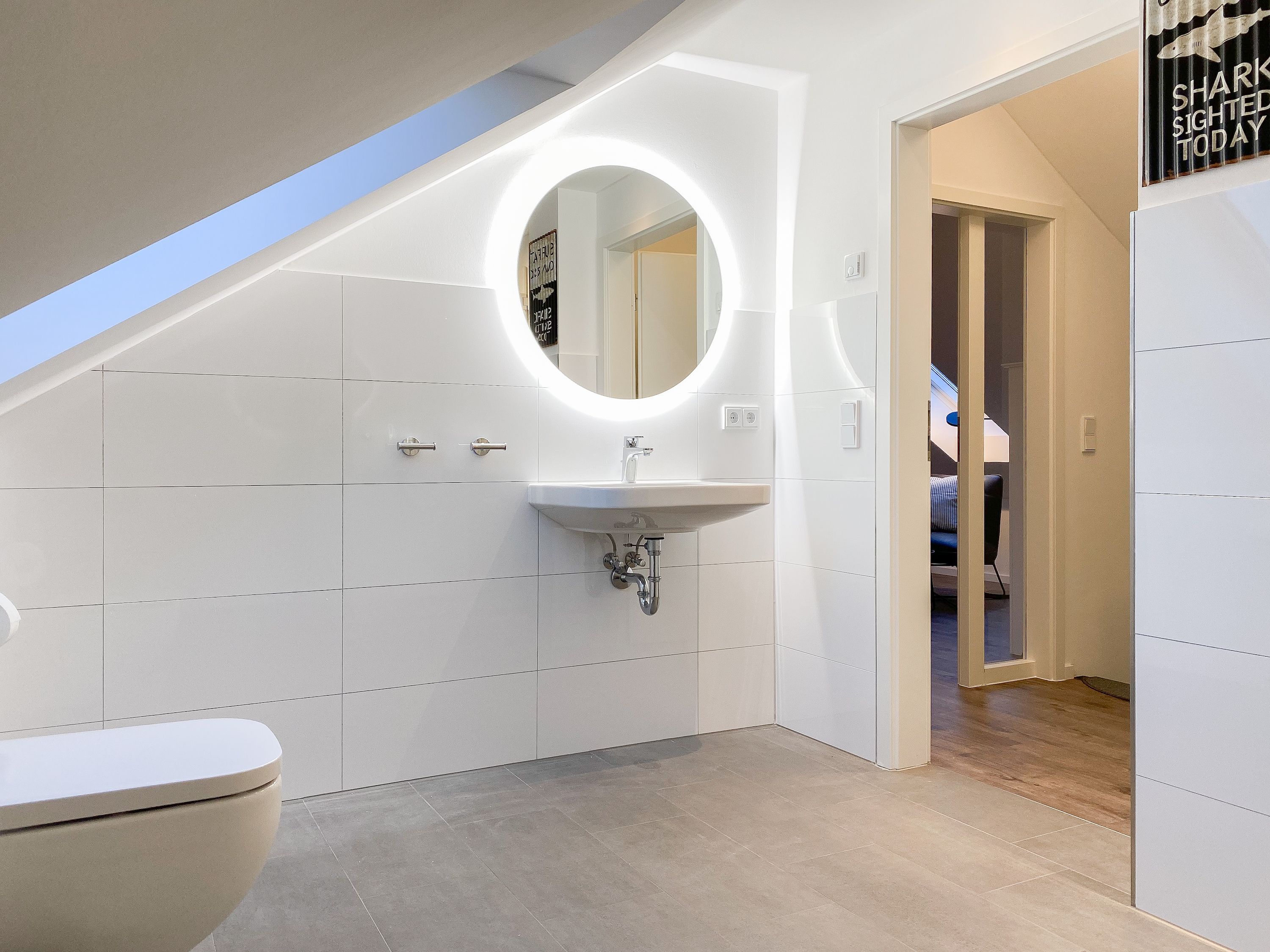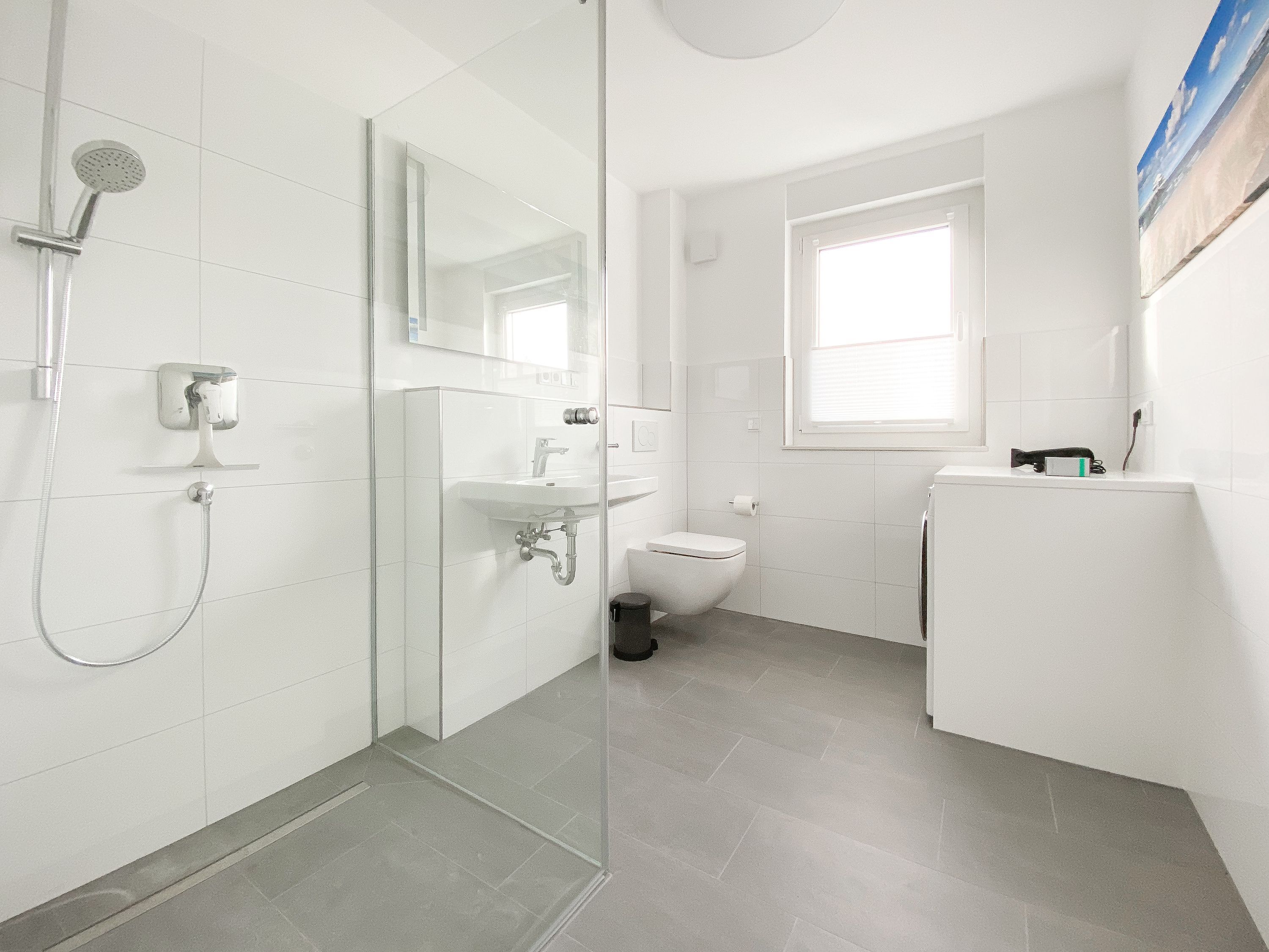 Das Penthouse erstreckt sich über 2 Wohnebenen und bietet auf über 100 qm Wohnfläche ausreichend Raum für 4-6 Personen, um einen entspannten Urlaub zu verleben. Mittelpunkt der unteren Ebene ist der großzügig kombinierte Wohn- Essbereich mit Smart TV und Soundbar. Die anschließende Einbauküche, die dank bester Ausstattung keine Wünsche offen lässt, lädt zum gemeinsamen Kochen ein. Bodentiefe Fensterelemente sorgen für lichtdurchflutete Räumlichkeiten und bieten einen direkten Zugang auf die großzügig angelegte Dachterrasse, auf der Sie im Strandkorb sitzend die Sonne genießen und die Seele baumeln lassen können. Für Schatten sorgt die elektrische Markise und für gemeinsame Mahlzeiten steht eine Essgruppe mit ausreichend Platz für 8 Personen zur Verfügung. Über den Flur erreichen Sie das erste Schlafzimmer, ausgestattet mit einem Boxspringbett (180x200) und TV sowie ein geräumiges Bad mit Walk In Dusche, Fenster und integriertem Waschtrockner. Alle Fenster der unteren Ebene sind mit elektrischen Außenjalousien versehen. Auf der zweiten Wohnebene erwartet Sie ein weiteres Tageslichtbad mit Walk In Dusche und ein äußerst großes Schlafzimmer, ausgestattet mit einem Boxspringbett (180x200) und zwei Hockern, die zum Gästebett ausgezogen werden können. Die Fenster sind mit Black Out Plissees versehen und ein TV ist ebenfalls vorhanden.