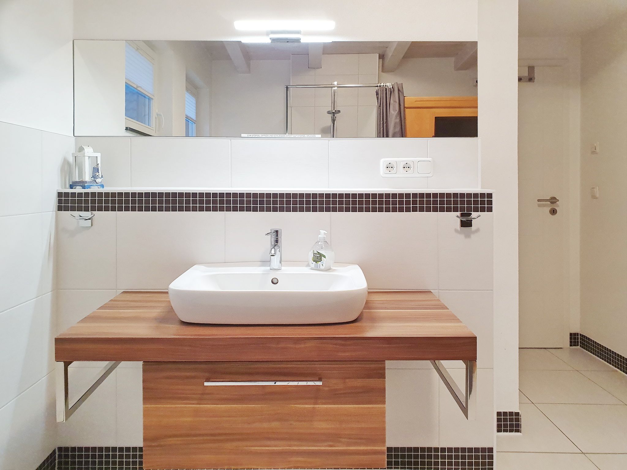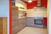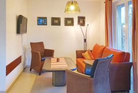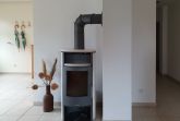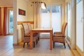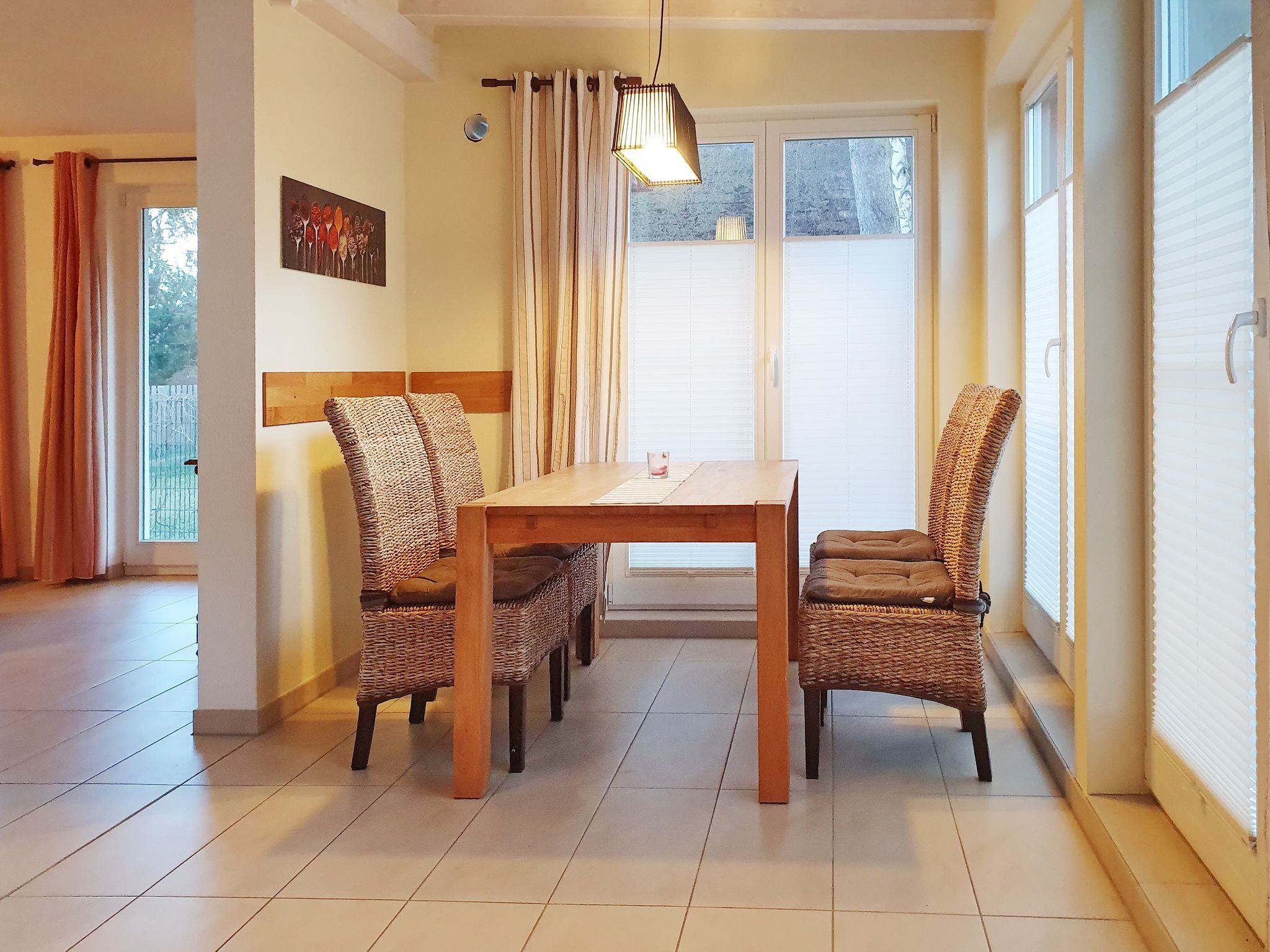 Die westliche Ferienhaushälfte wird hier zur Vermietung angeboten, die andere Haushälfte wird zeitweise vom Eigentümer selbst genutzt. In der ca. 58 qm großen Ferienwohnung können bis zu 3 Personen und 1 Kleinkind einen entspannten Urlaub genießen. Die Ferienwohnung ist modern und stilvoll eingerichtet. Hierzu trägt neben dem gemütlichen Wohnzimmer mit Couch Sat-TV, Musikanlage mit Radio und CD, auch ein Kaminofen und im Bad eine Infrarot-Wärme-Kabine bei. An den Wohnraum schließt sich eine komfortabel ausgestatte Küche mit Backofen, Geschirrspüler, Kühlschrank (ohne Gefrierfach), Mikrowelle, Filterkaffeemaschine, Wasserkocher, Toaster und reichlich Geschirr an. Eine große gemütliche Sitzecke befindet sich direkt neben der Küche.