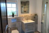 Die bodentiefe Dusche im gefliesten Badezimmer mit Fußbodenheizung erfreut nicht nur Familien. Ein kleines Fenster sorgt für Tageslicht und erleichtert das Lüften nach dem Duschen.