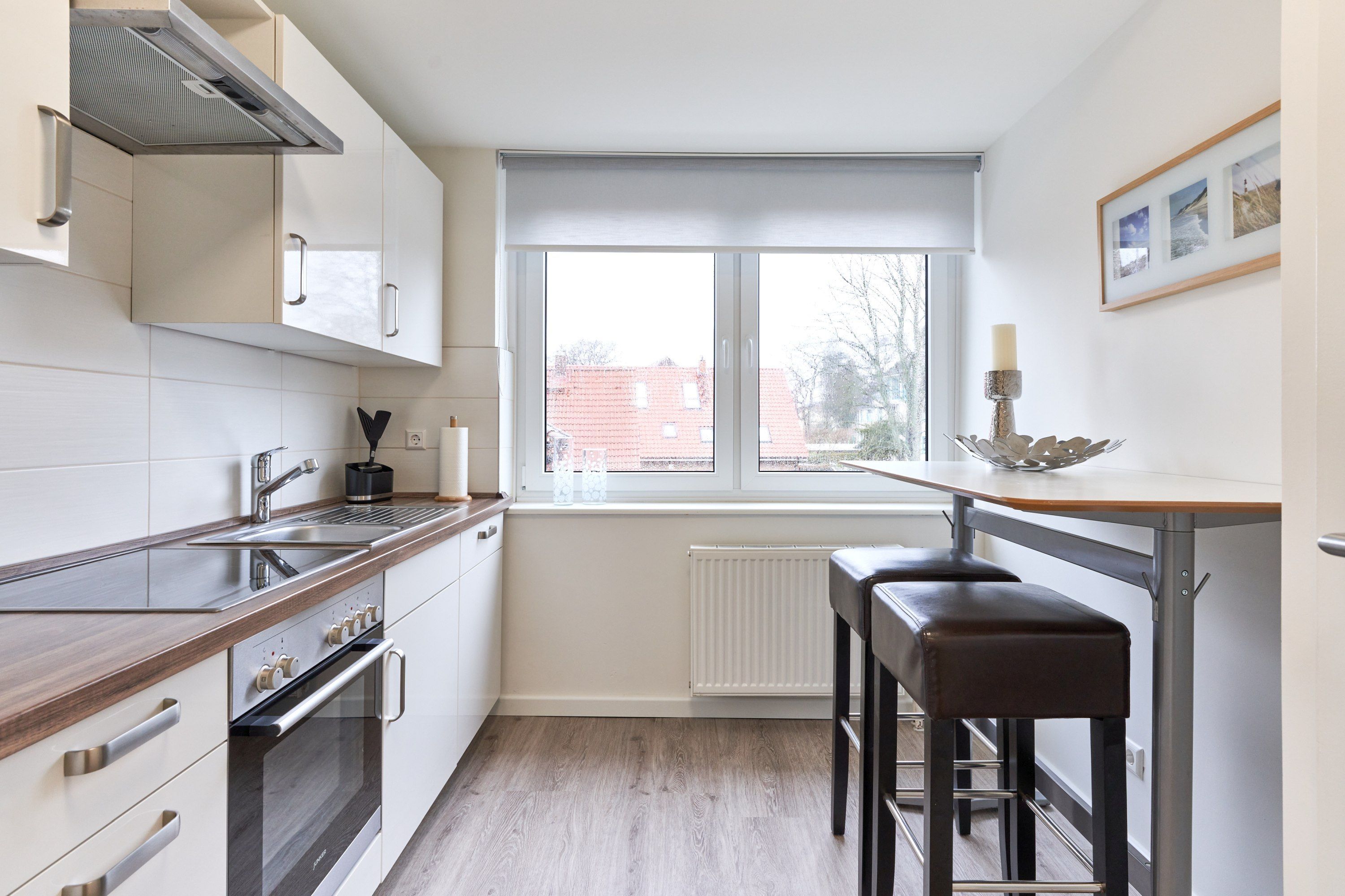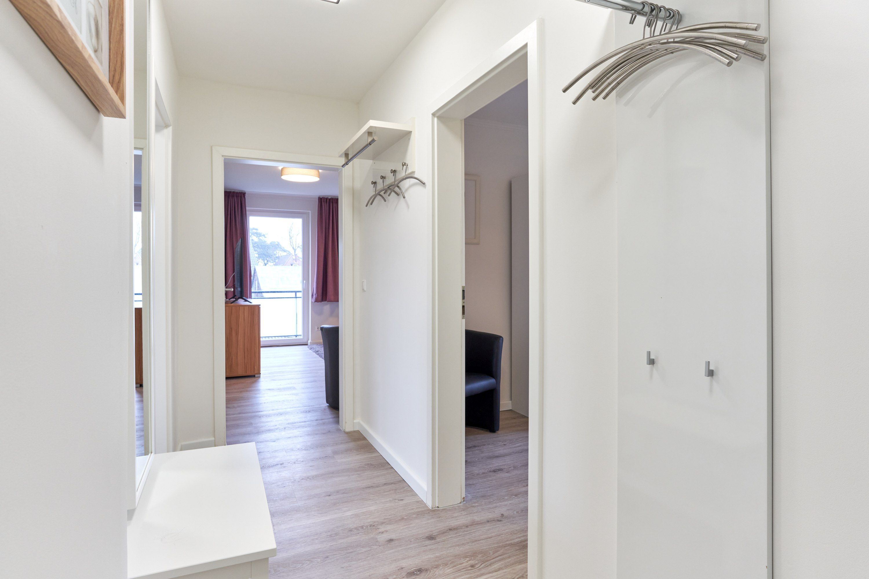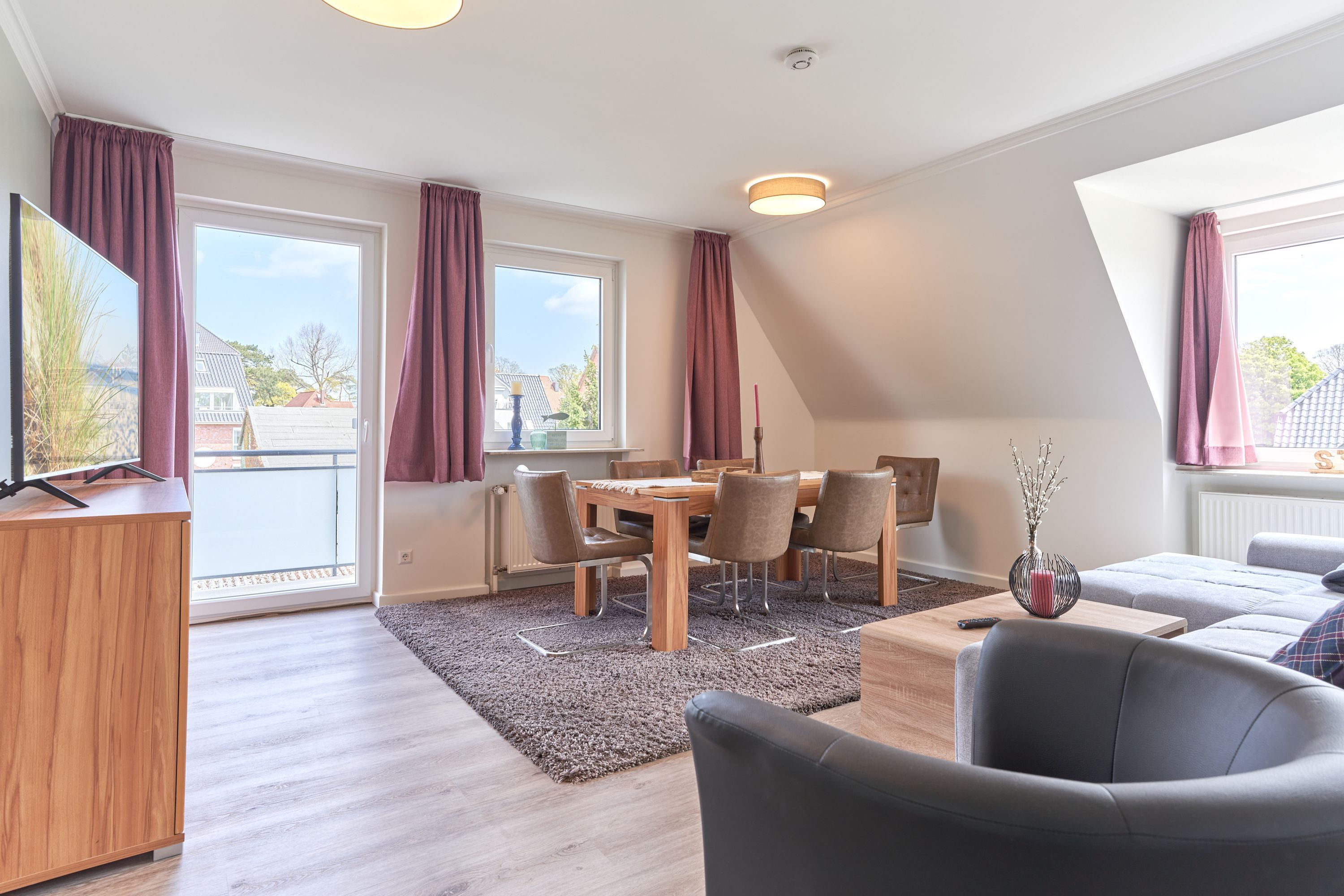 Dieses in 2022 umfassend renovierte und großzügig geschnittene Apartment teilt sich auf in Küche, Tageslichtbad, 2 große Schlafzimmer, Wohnbereich und möblierten Balkon. Die Einbauküche ist komplett ausgestattet, mit einem Kaffeetresen, Geschirrspüler und neuer Filter Kaffeemaschine eingerichtet. Im komplett neu gestalteten Badezimmer finden Sie eine Echtglasdusche, Lichtspiegel, neue Badobjekte mit Unterschrank sowie einen Badheizkörper für Handtücher. Der moderne, helle Wohnbereich ist mit großen Fenstern. gemütlicher Sitzecke (mit Schlafoption für eine fünfte Person), Flachbildschirmfernseher, sowie einem Essplatz ausgestattet. Beide Schlafzimmer sind mit einem Doppelbett eingerichtet, ein Schlafzimmer bietet einen extra Fernseher. Verdunkelungsgardinen sorgen in Wohn- und Schlafzimmern für eine gemütliche Atmosphäre und ungestörten Schlaf.