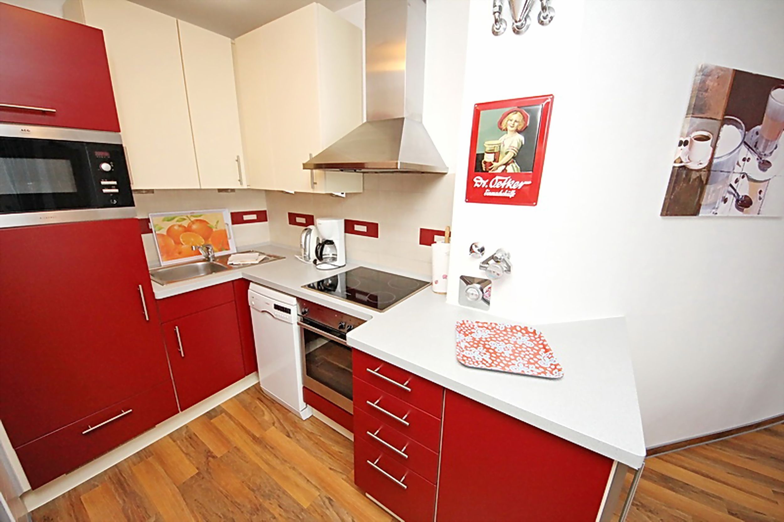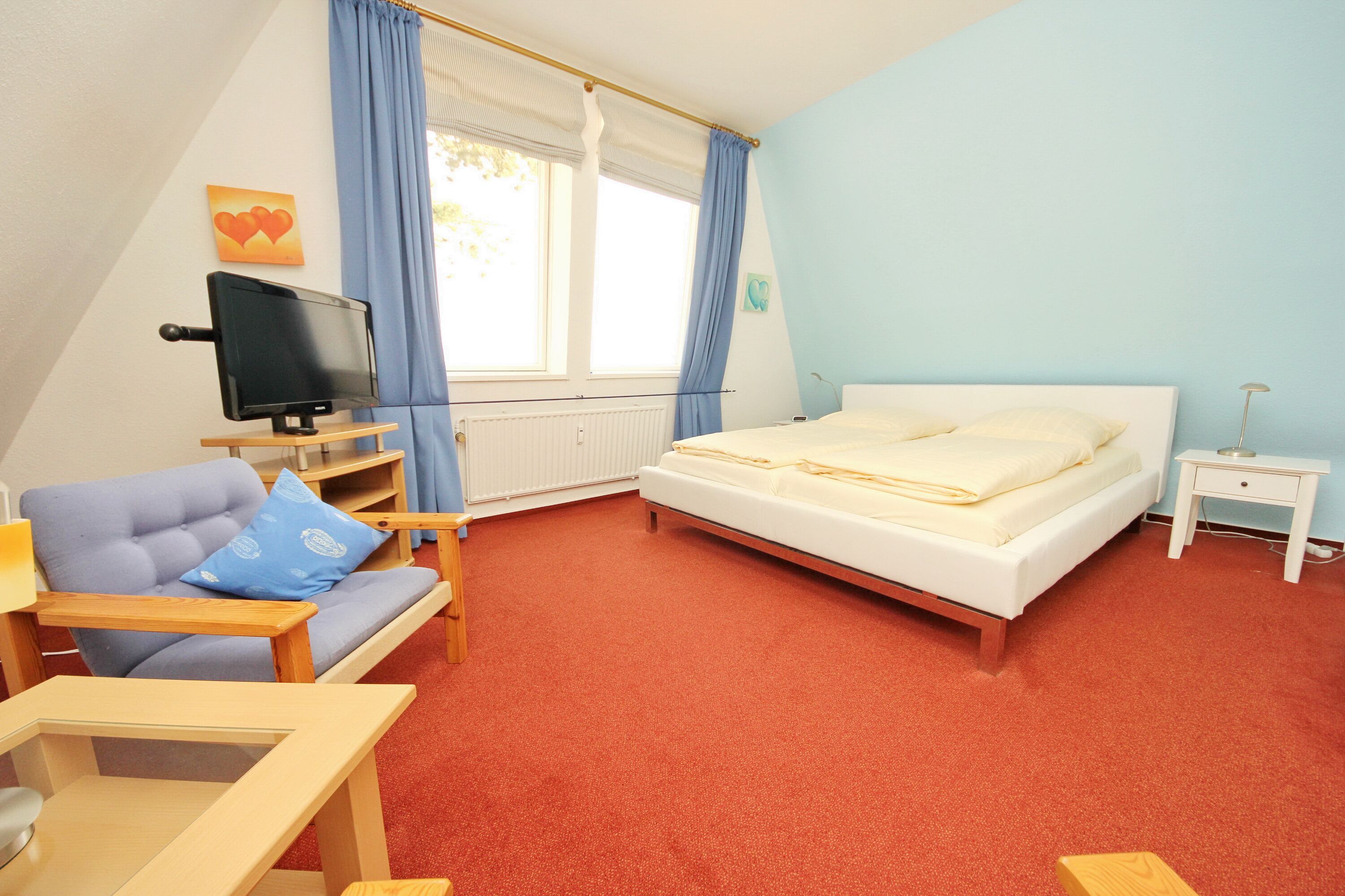 Dieses empfehlenswerte Appartement gehört mit seiner Lage in erster Reihe an der Strandpromenade und Strand mit herrlichem Meerblick zu den absoluten Highlights. Vom Wohnungseingang im Flur kommen Sie in den Wohnraum und zum sonnigen Balkon. Hier erleben Sie den Kaiserblick pur. Auf der linken Seite im Wohnzimmer befindet sich eine Essecke neben der modernen Einbauküche. In der zweiten Wohnraumhälfte, rechts, stehen eine bequeme Couch mit einem Tisch und einem Sessel zum Relaxen. Das Schlafzimmer, ebenfalls mit Meerblick, erreichen Sie durch eine Treppe im Flurbereich. Dort finden Sie ein Doppelbett (2x 90 cm x 200 cm), einen Einbaukleiderschrank und eine kleine Sitzgruppe vor. Das modernisierte Bad befindet sich nur ein paar Stufen höher und lässt keine Wünsche offen. Den Strand erreichen Sie durch einen direkten Zugang am Haus.
