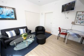 Hier wohnen Sie direkt an der Trave in einer komplett sanierten Ferienwohnung. Sie können von zwei sonnigen Dachterrassen die ein- und ausfahrenden Fährschiffe beobachten und den faszinierenden Blick die Trave hinunter auf die Ostsee genießen. Beim betreten der Wohneinheit empfängt Sie das lichtdurchflutete Wohnzimmer, das mit einer bequemen Couch, einem Sessel mit Hocker und einem Tisch sowie einer schönen Essecke ausgestattet ist. Die offene Küchenzeile ist ebenfalls im Wohnzimmer integriert. Das Schlafzimmer, durch eine Schiebetür zum Wohnbereich abgetrennt, verfügt über ein komfortables Doppelbett (2x 90 cm x 200 cm) und einen Einbaukleiderschrank. Vom Schlafzimmer gelangen Sie in das moderne Duschbad. Aktuelle Livebilder vom Ausblick dieses Feriendomizils sehen Sie auf den Webcams 3 und 4.