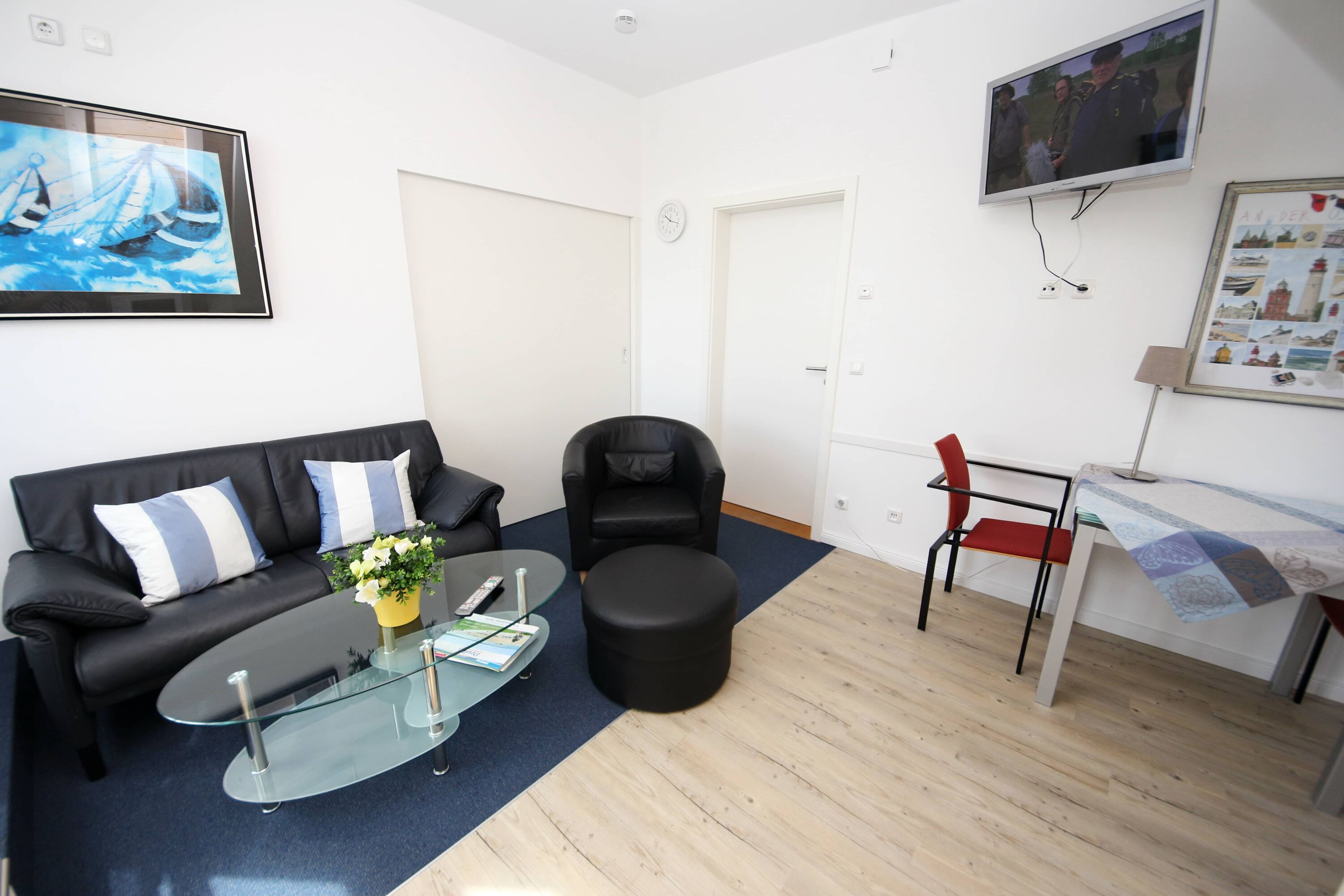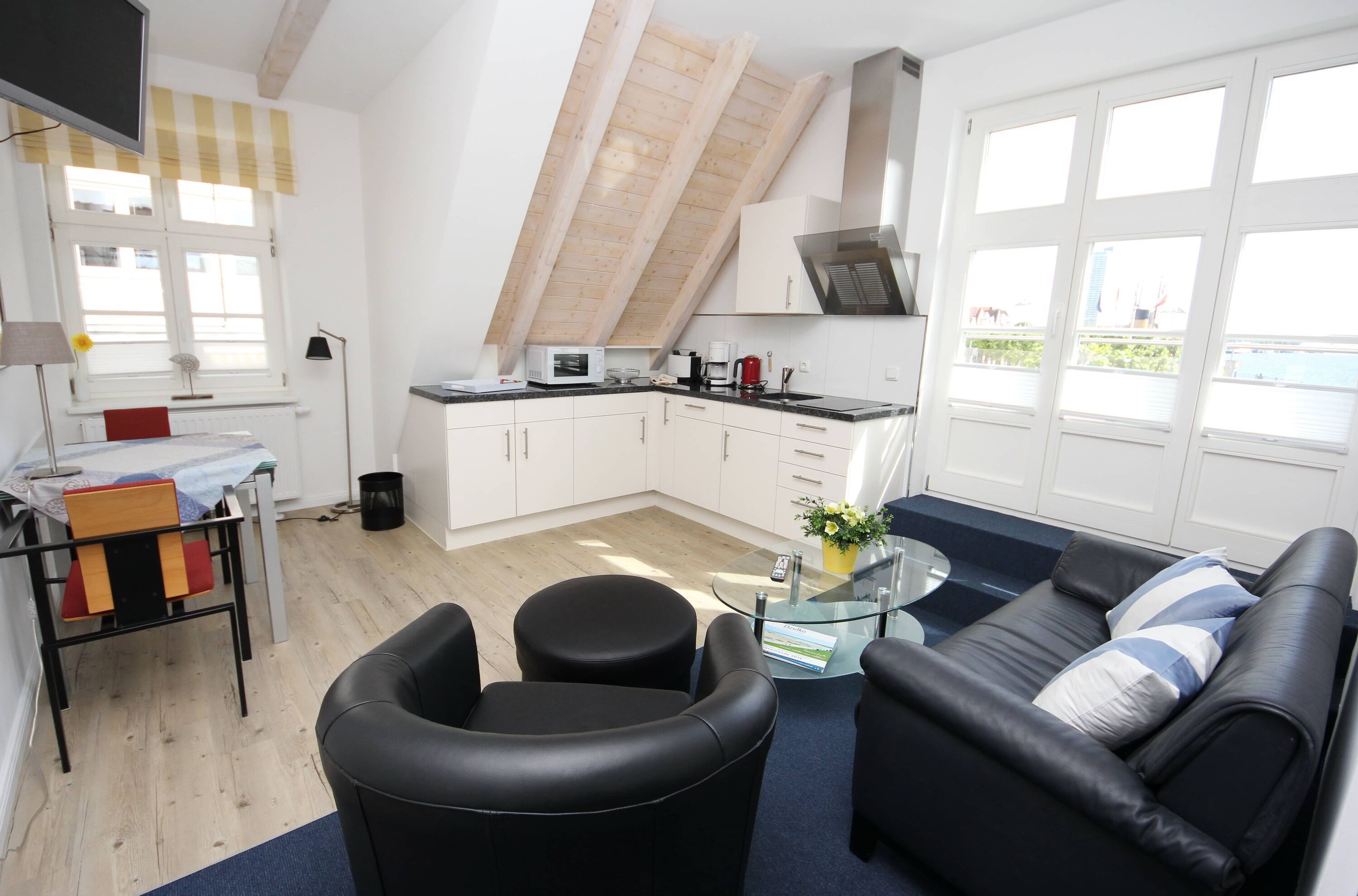 Zwei Dachterrassen (eine davon mit Strandkorb), Küchenzeile, Geschirrspüler, Mikrowelle, Duschbad/WC, Fön, TV, Stereoradio mit CD, kostenl. W-Lan, inkl. Außenstellplatz.