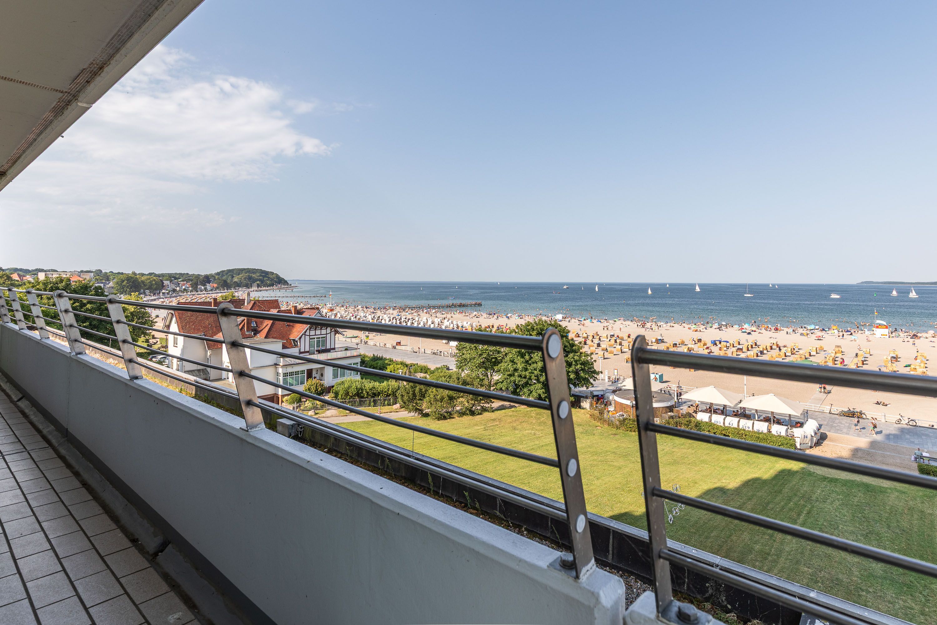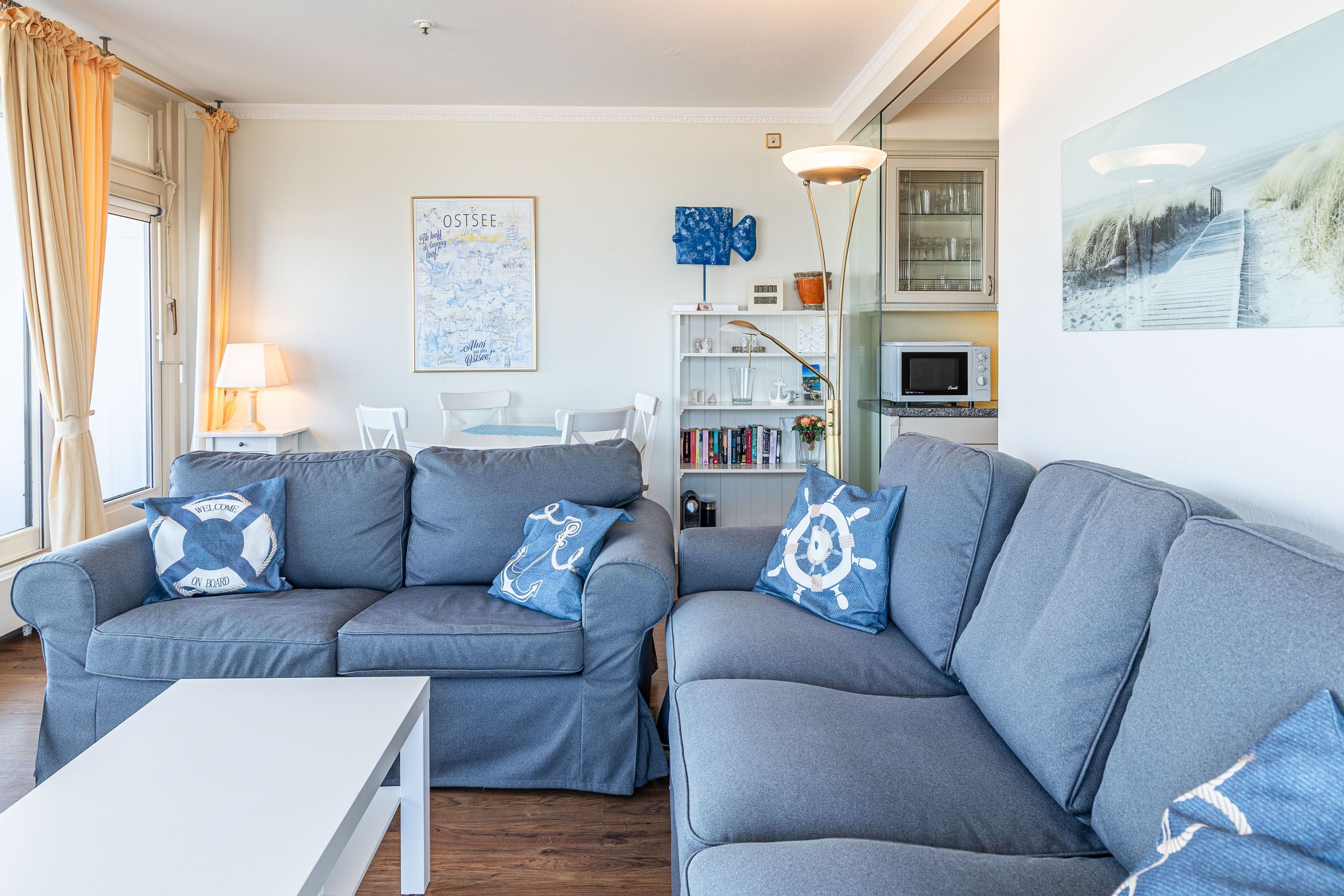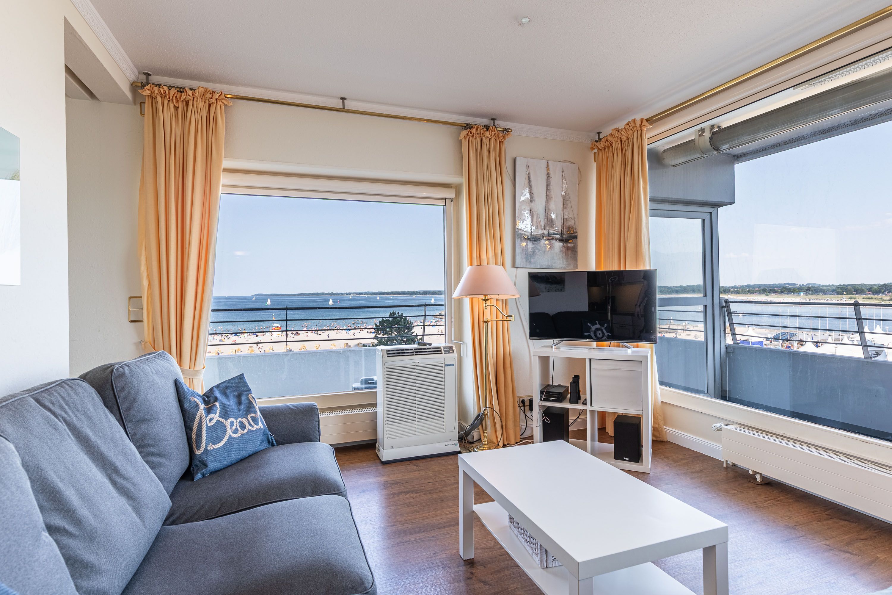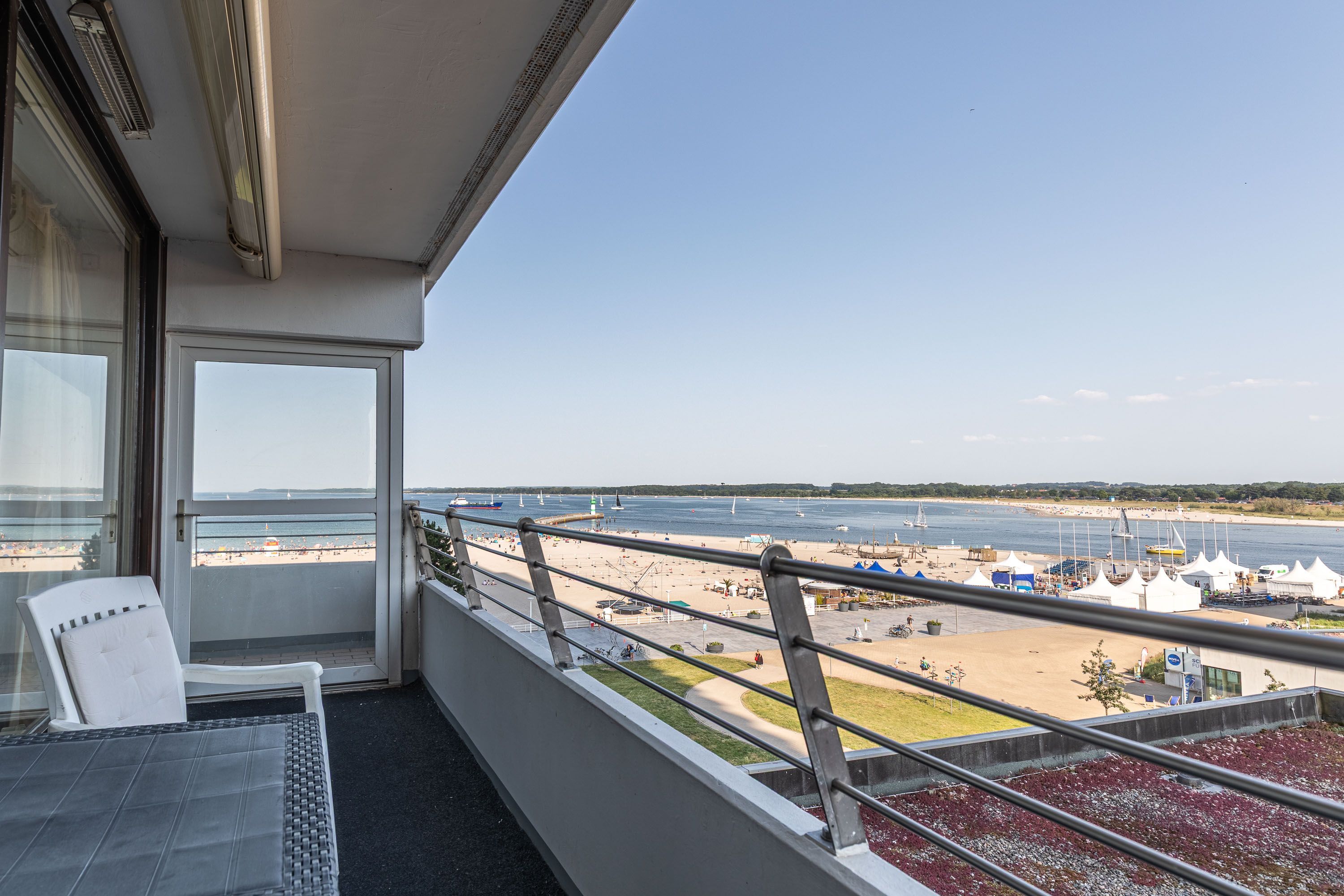 Highlight dieses schönen und komfortablen 2-Zimmer-Eck-Appartements ist die traumhafte Lage mit Blick zum Strand und zur Ostsee sowie mit Teilblick auf die Trave mit ein- und ausfahrendem Schiffsverkehr. Die offene Einbauküche befindet sich im Eingangsbereich und lässt keine Wünsche offen. Im schönen Wohnraum stehen eine gemütliche zweiteilige Couchgarnitur mit Tisch und eine Essecke. Das Schlafzimmer, das Sie vom Wohnbereich erreichen, ist mit einem bequemen Doppelbett (2x 80 cm x 200 cm) ausgestattet. In das Bad gelangen Sie vom Flur, in dem auch ein großzügiger Einbaukleiderschrank integriert ist. Den großen Eckbalkon zur Ostsee und zur Trave erreichen Sie von beiden Wohnräumen, um den tollen Panoramablick zu genießen.
