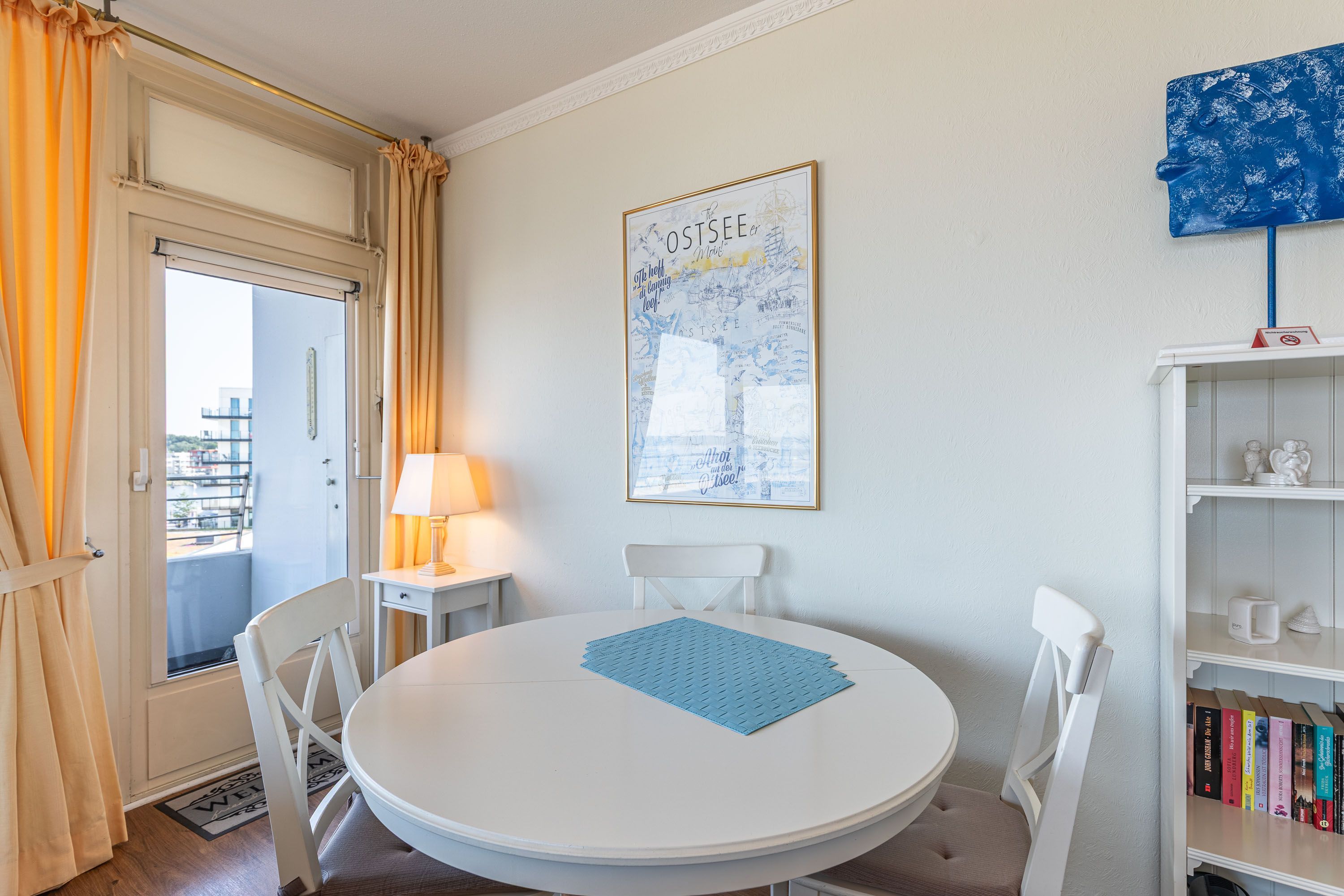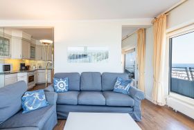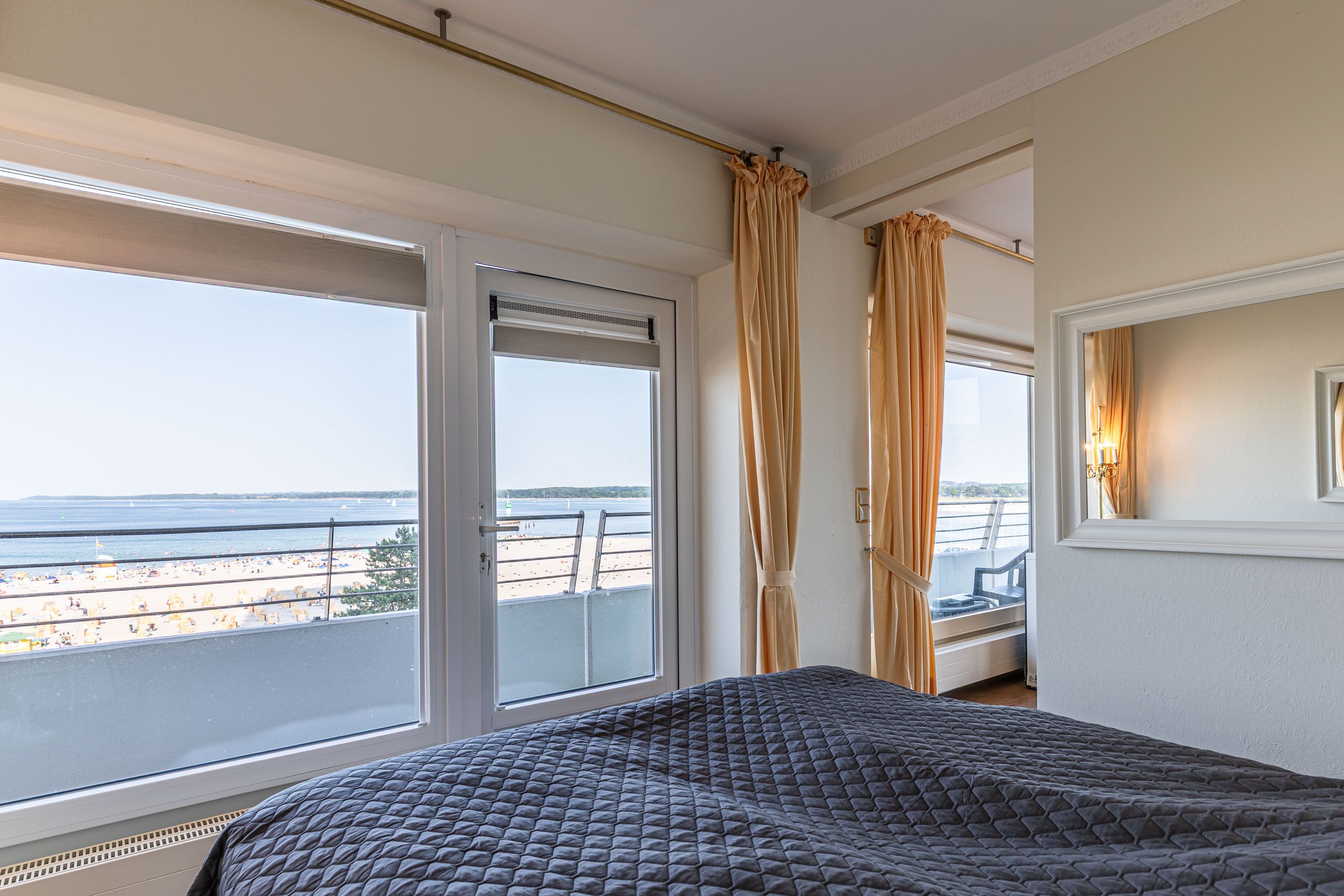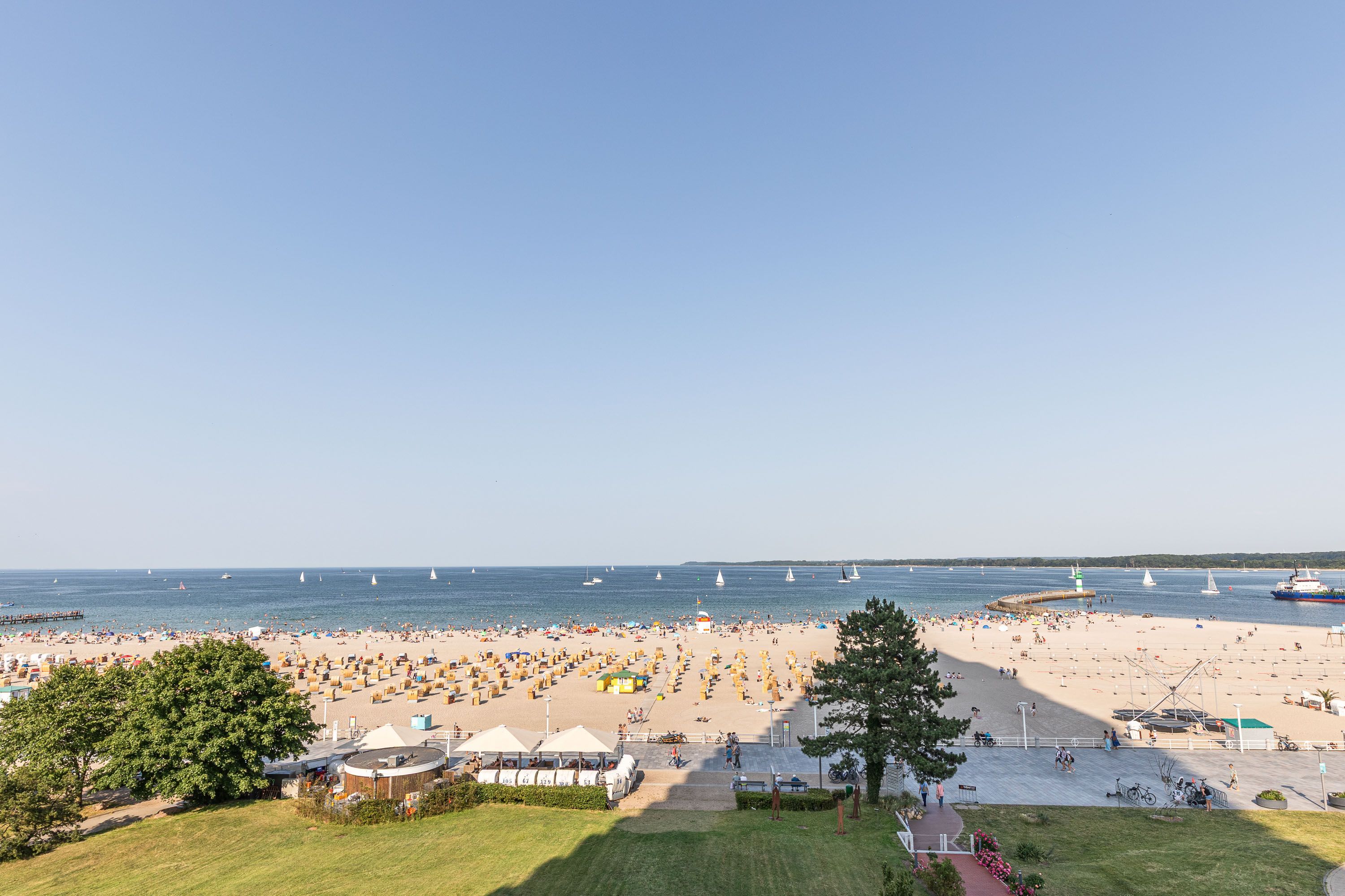 Highlight dieses schönen und komfortablen 2-Zimmer-Eck-Appartements ist die traumhafte Lage mit Blick zum Strand und zur Ostsee sowie mit Teilblick auf die Trave mit ein- und ausfahrendem Schiffsverkehr. Die offene Einbauküche befindet sich im Eingangsbereich und lässt keine Wünsche offen. Im schönen Wohnraum stehen eine gemütliche zweiteilige Couchgarnitur mit Tisch und eine Essecke. Das Schlafzimmer, das Sie vom Wohnbereich erreichen, ist mit einem bequemen Doppelbett (2x 80 cm x 200 cm) ausgestattet. In das Bad gelangen Sie vom Flur, in dem auch ein großzügiger Einbaukleiderschrank integriert ist. Den großen Eckbalkon zur Ostsee und zur Trave erreichen Sie von beiden Wohnräumen, um den tollen Panoramablick zu genießen.