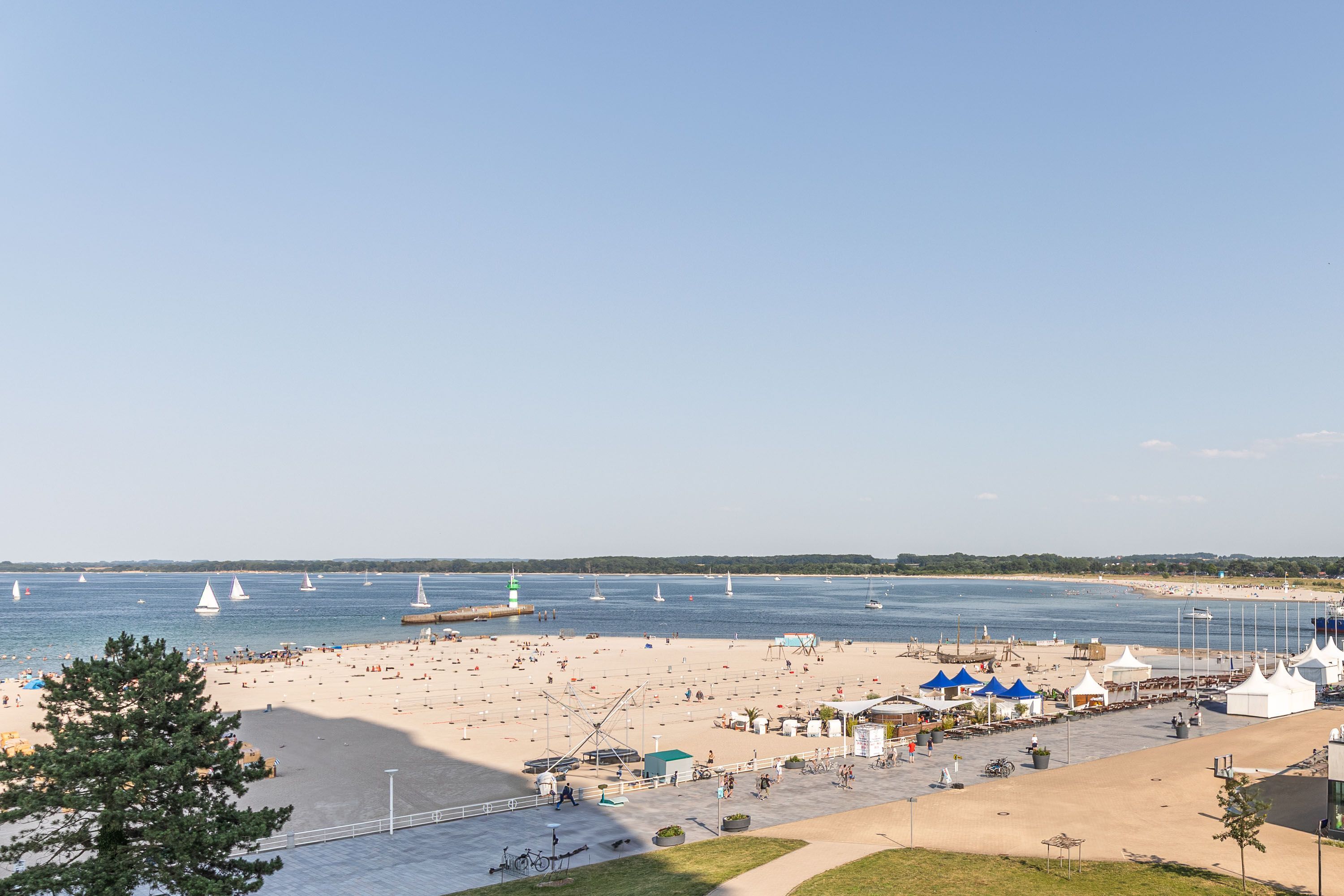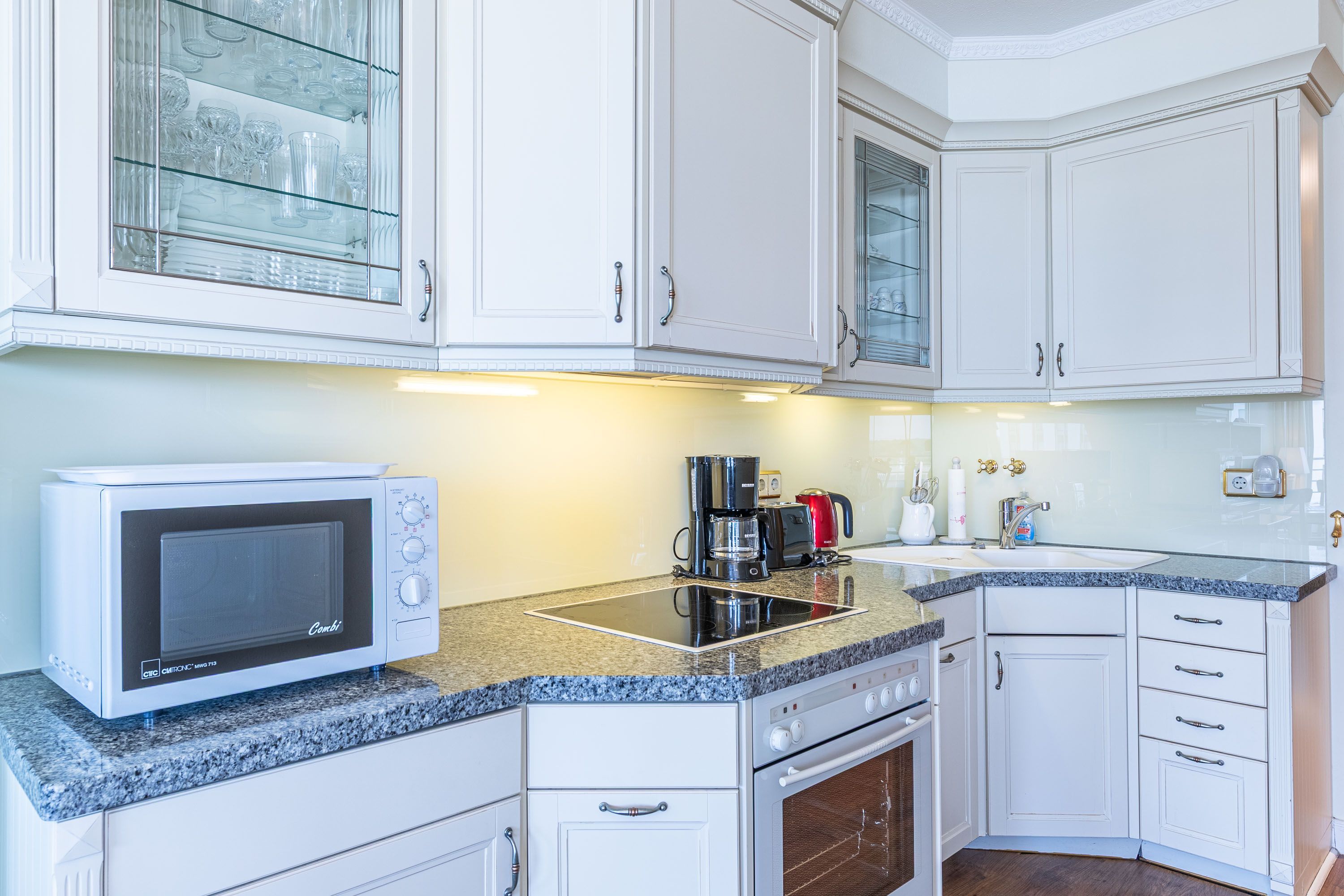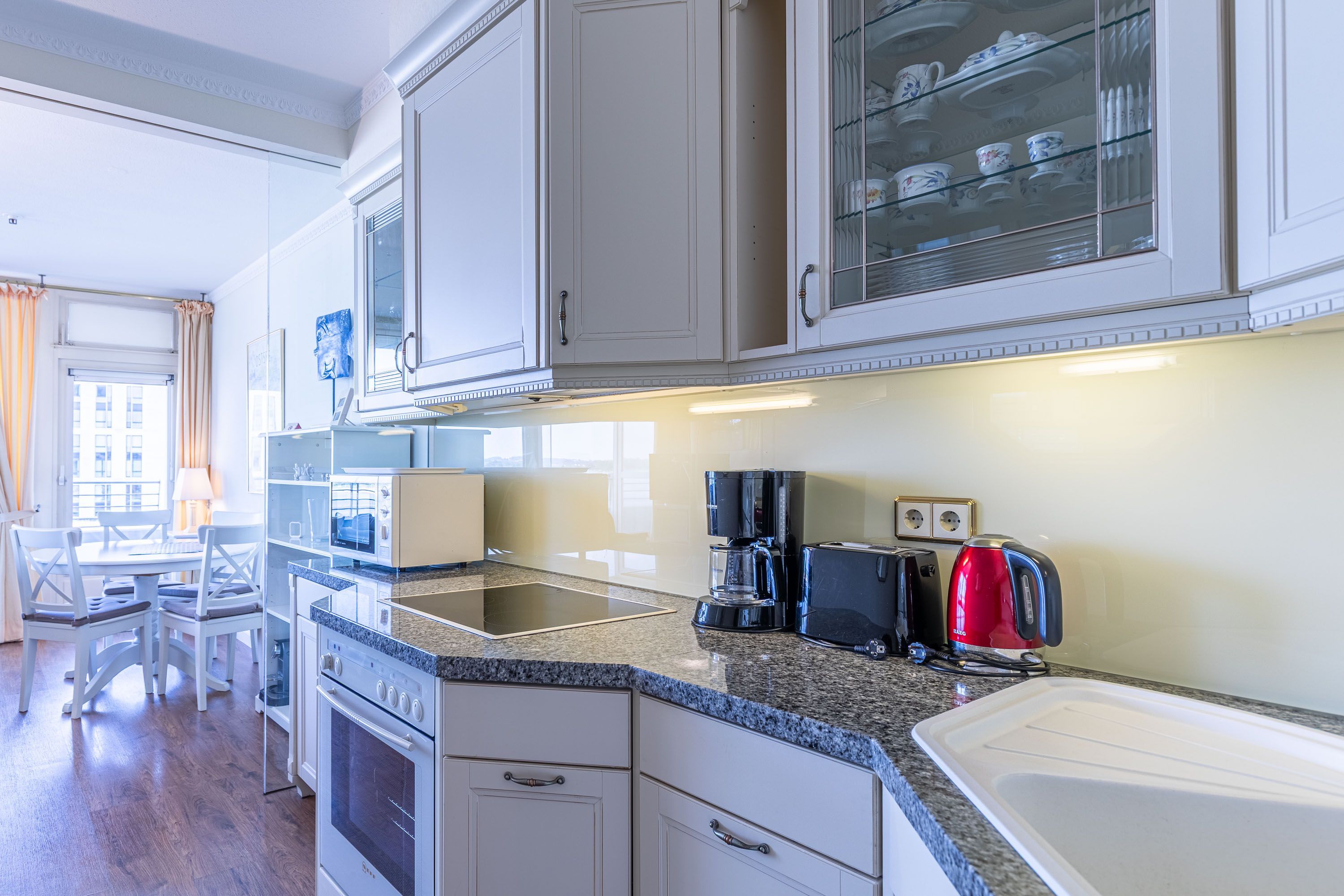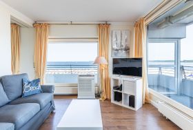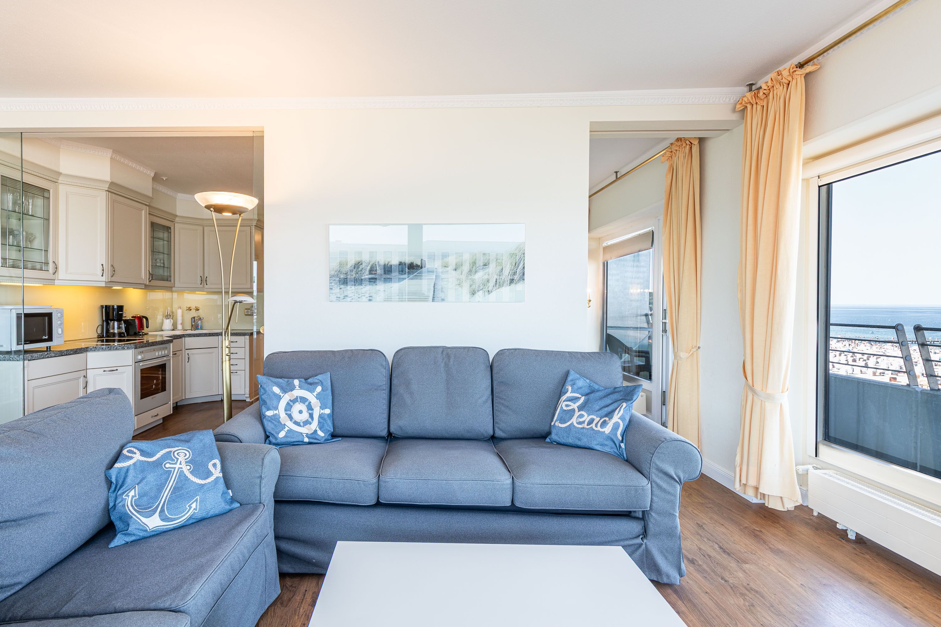 Highlight dieses schönen und komfortablen 2-Zimmer-Eck-Appartements ist die traumhafte Lage mit Blick zum Strand und zur Ostsee sowie mit Teilblick auf die Trave mit ein- und ausfahrendem Schiffsverkehr. Die offene Einbauküche befindet sich im Eingangsbereich und lässt keine Wünsche offen. Im schönen Wohnraum stehen eine gemütliche zweiteilige Couchgarnitur mit Tisch und eine Essecke. Das Schlafzimmer, das Sie vom Wohnbereich erreichen, ist mit einem bequemen Doppelbett (2x 80 cm x 200 cm) ausgestattet. In das Bad gelangen Sie vom Flur, in dem auch ein großzügiger Einbaukleiderschrank integriert ist. Den großen Eckbalkon zur Ostsee und zur Trave erreichen Sie von beiden Wohnräumen, um den tollen Panoramablick zu genießen.
